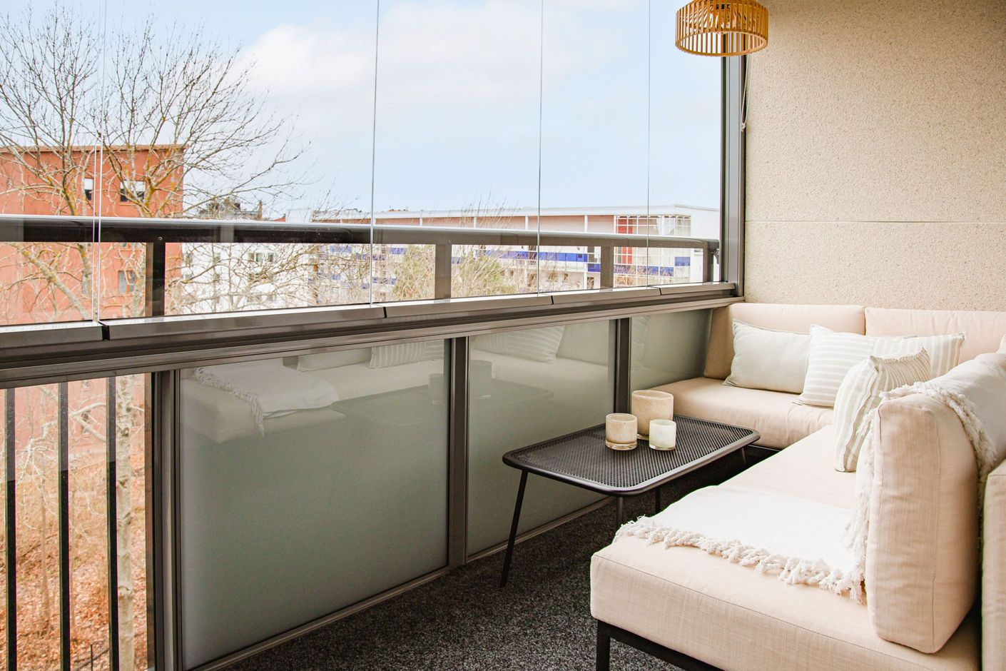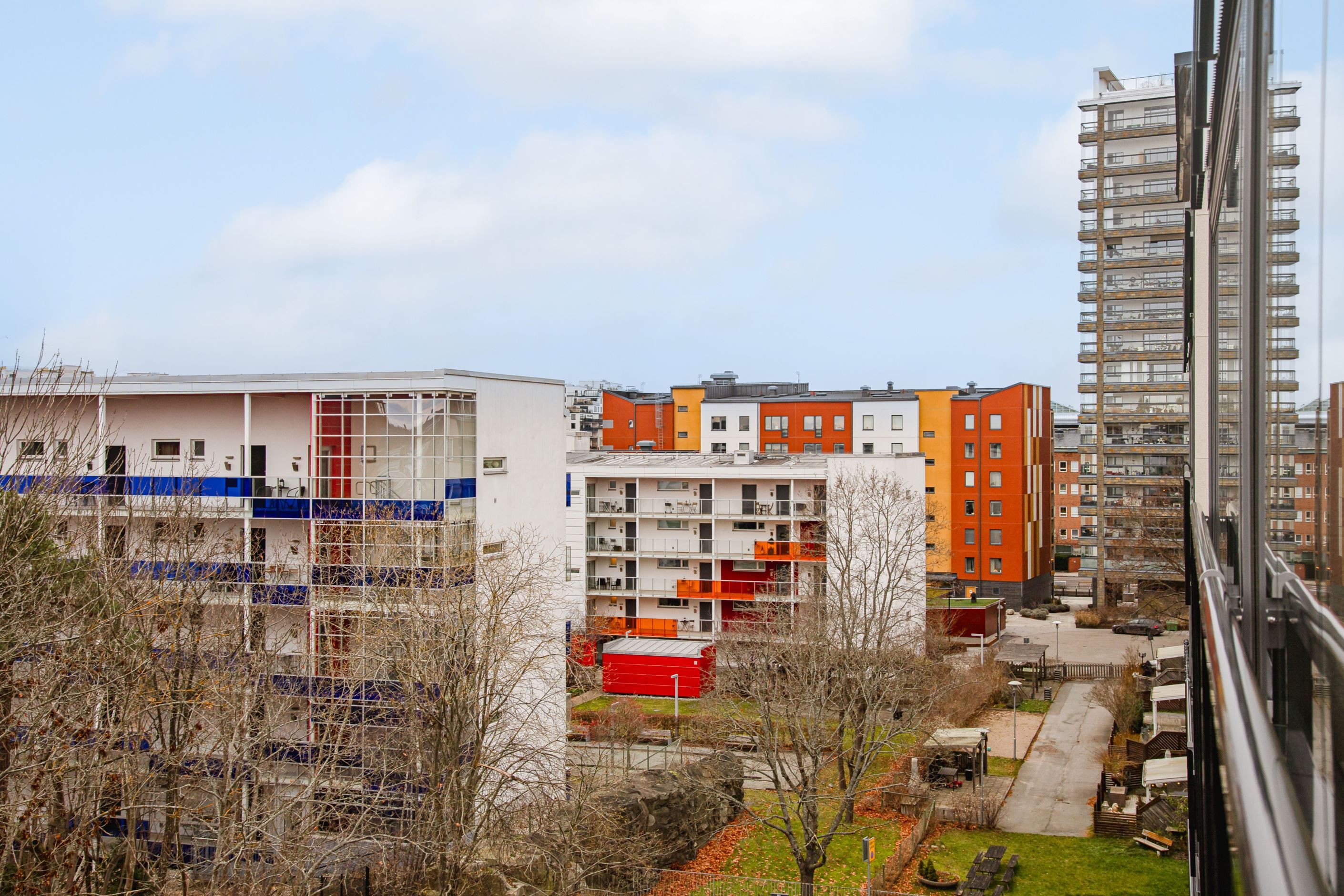- Inglasad och nyligen byggd (2022) balkong i söderläge med utsikt över takåsarna.