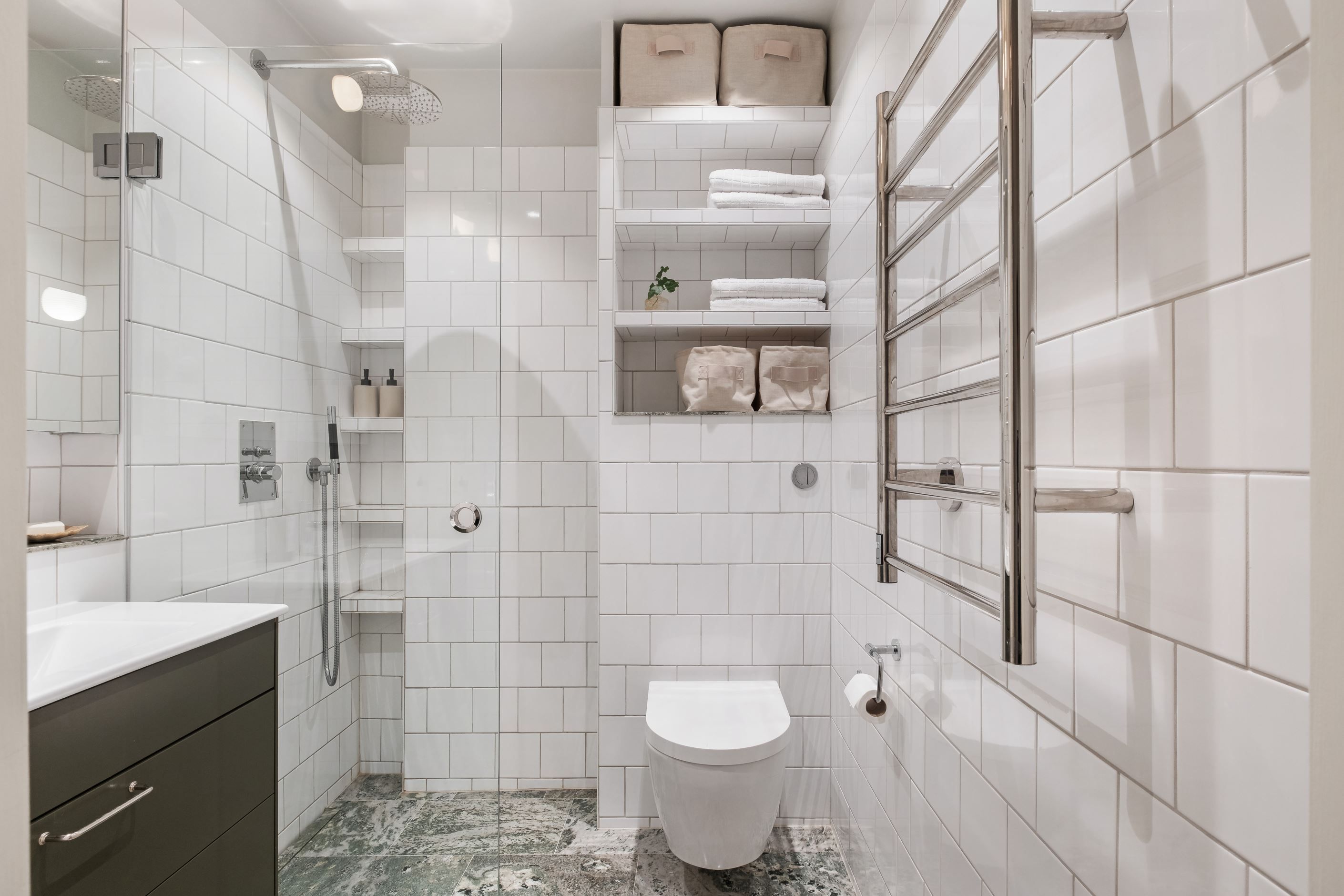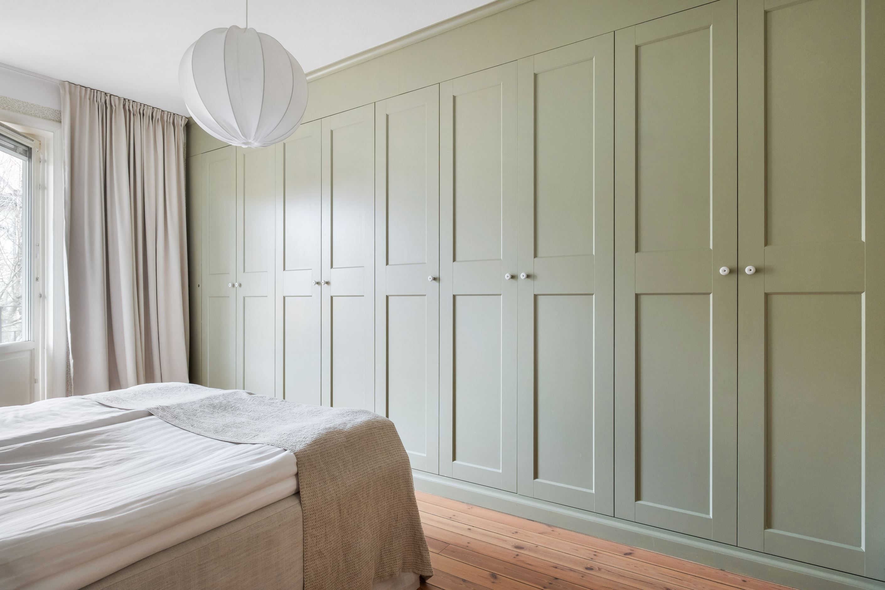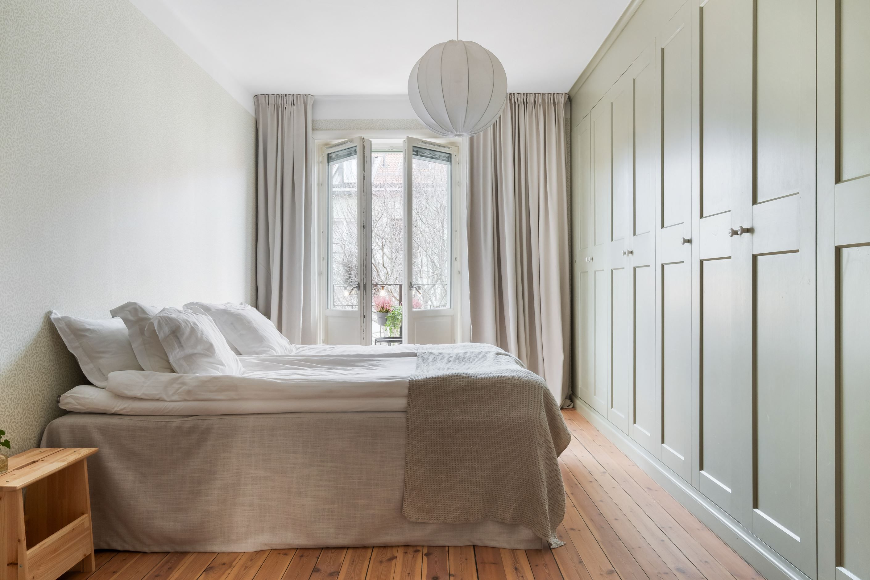 Master bedroom imponerar med en platsbyggd garderobsvägg i sober design samt direkt utgång till den härliga balkongen som vetter mot grönskande omgivningar. Utöver detta finns två välplanerade mindre sovrum. Det stilfullt renoverade badrummet bjuder på helkaklade väggar, marmorgolv med golvvärme. För extra komfort så finns även en separat tvättpelare.