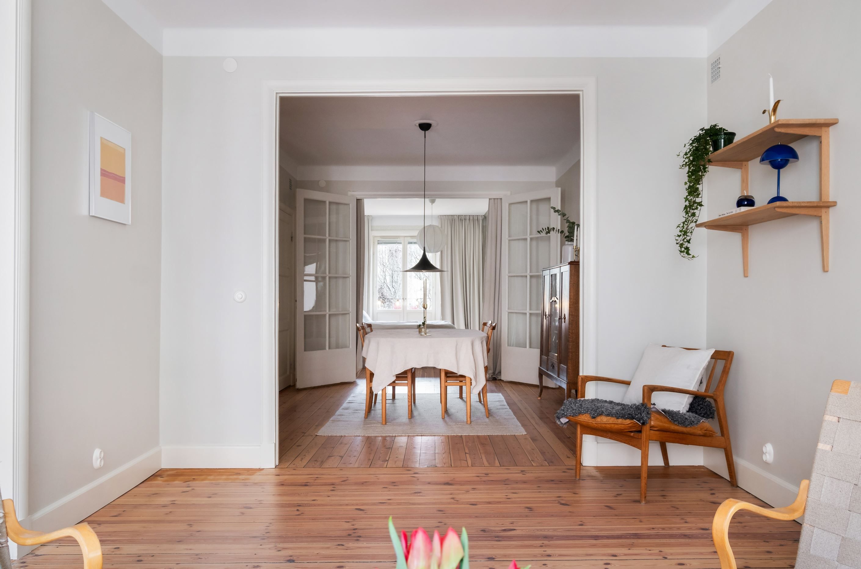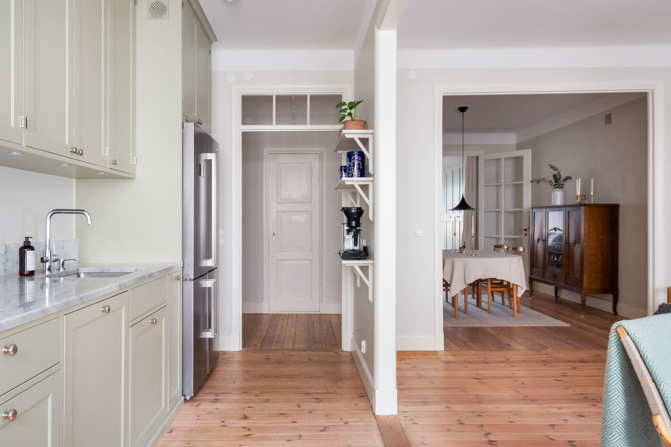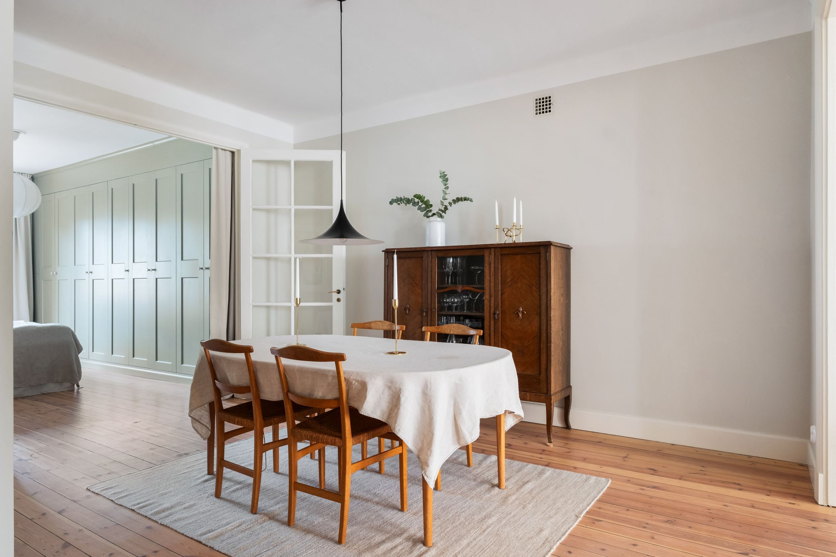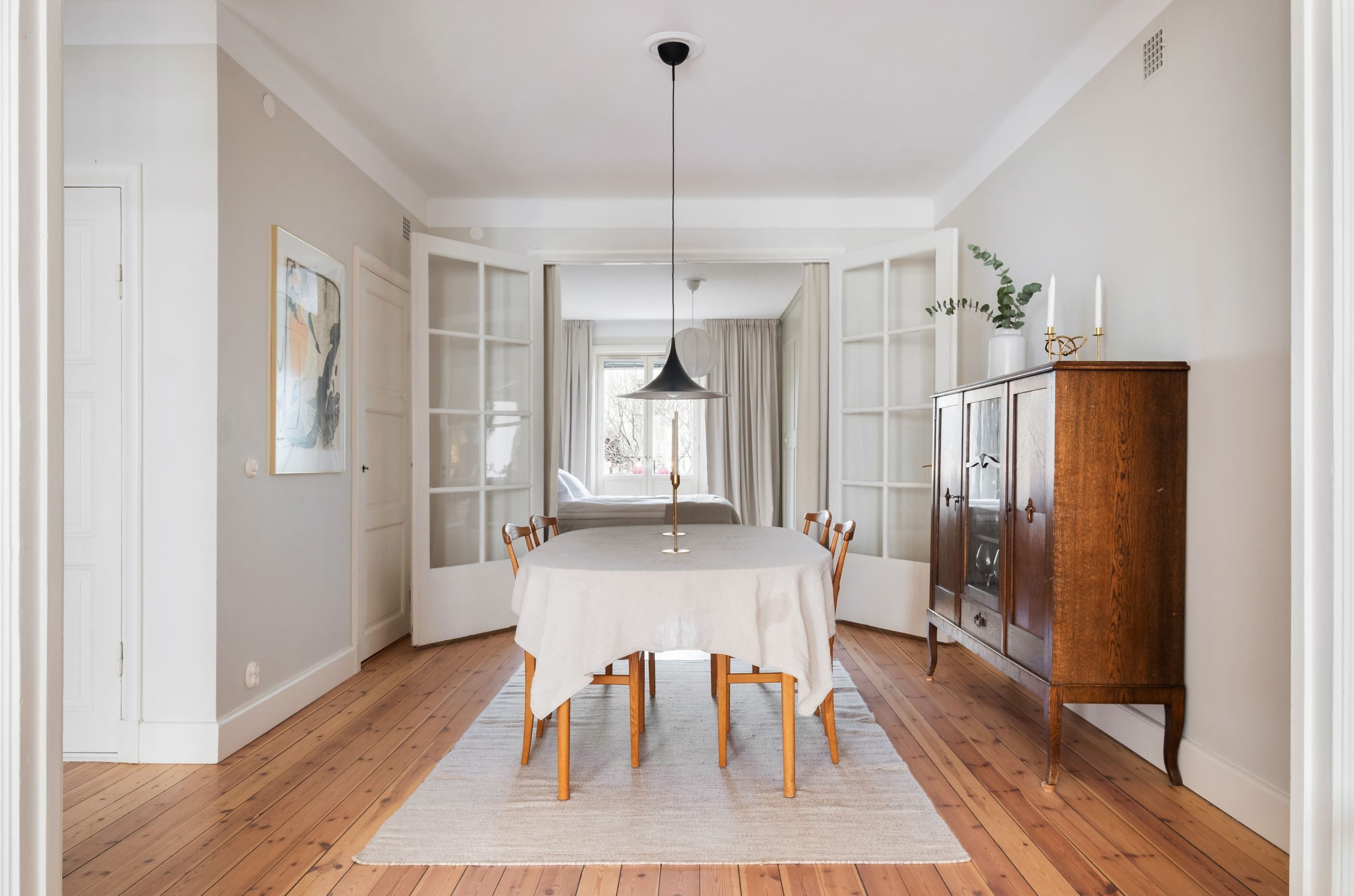 Här möts du av genomgående trägolv, generös takhöjd, speglade dörrar och vackra pardörrar med spröjs som tillsammans sätter tonen för en elegant och tidlös atmosfär. De sociala ytorna är öppna och sammanlänkade mellan kök, matsal och vardagsrum – perfekt för både vardagsliv och umgänge.