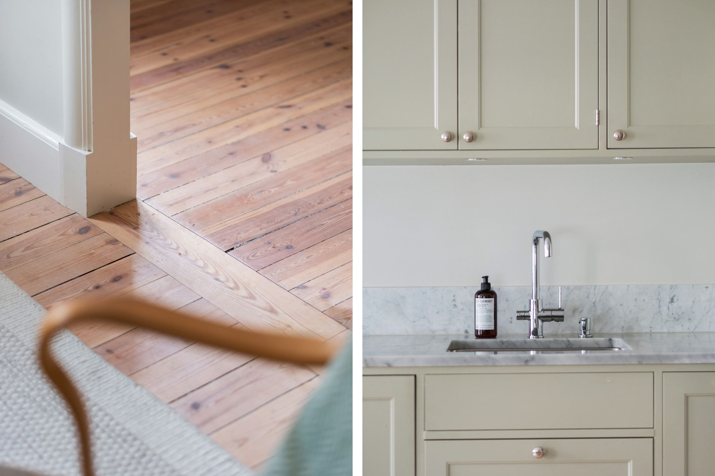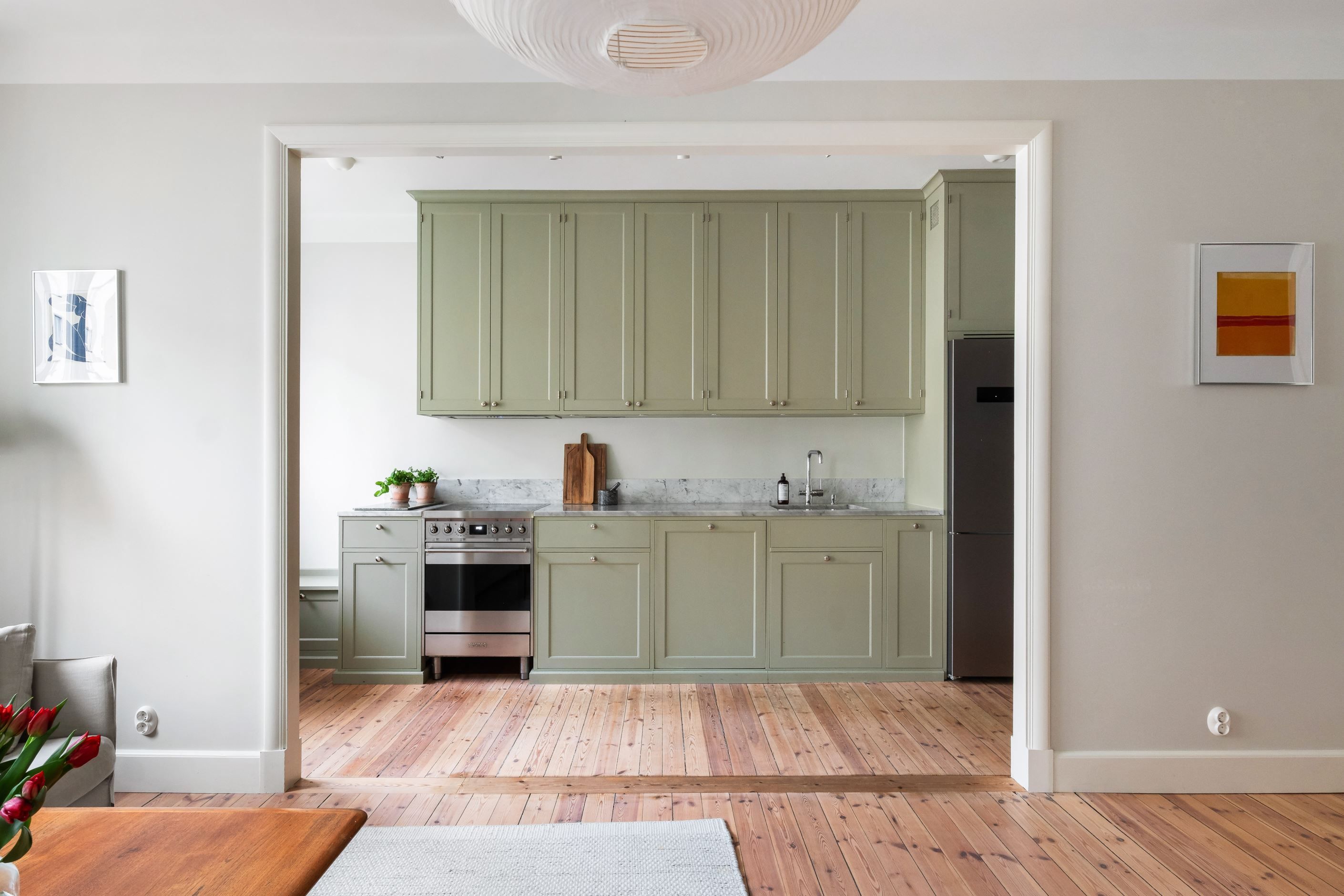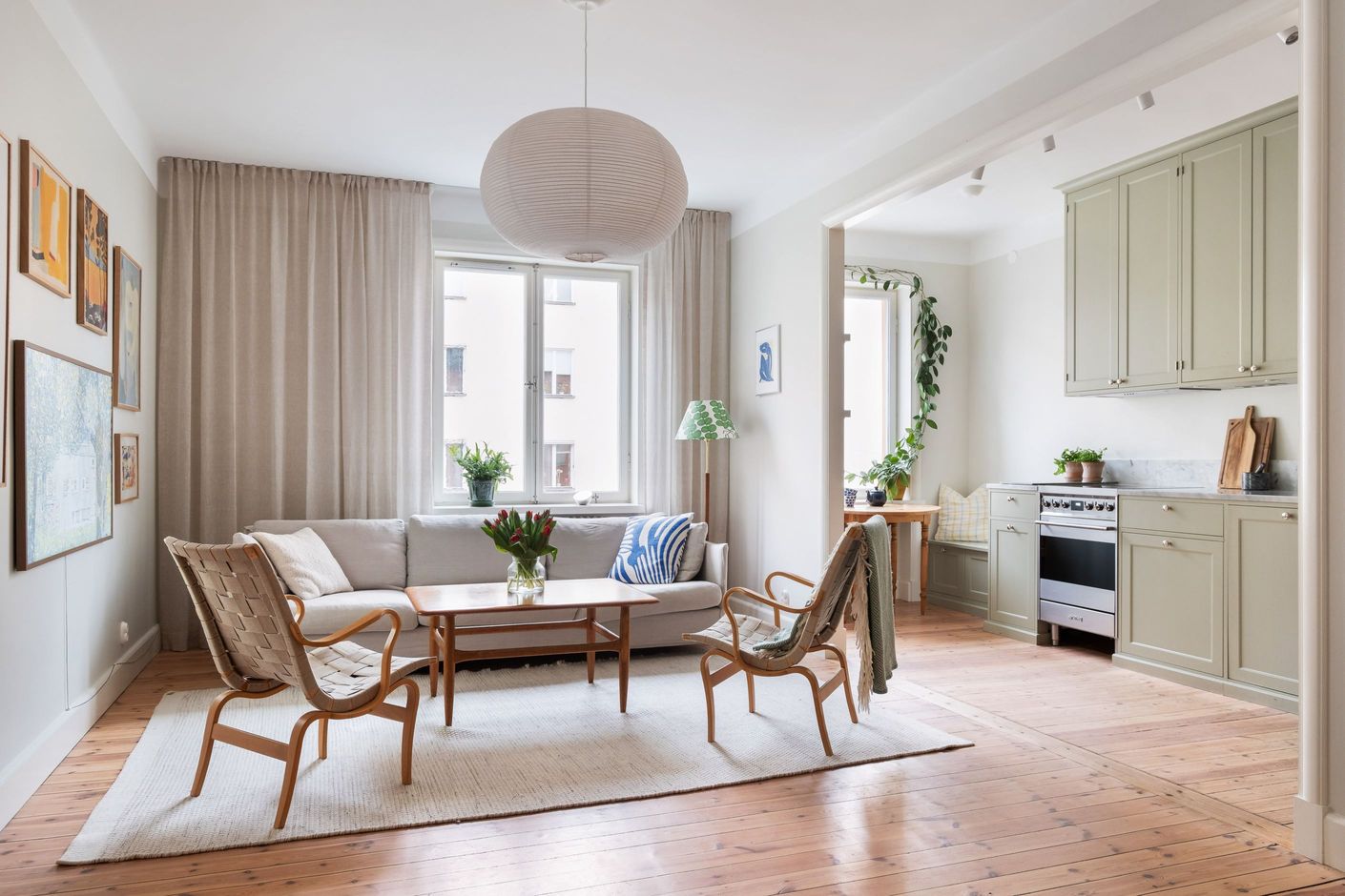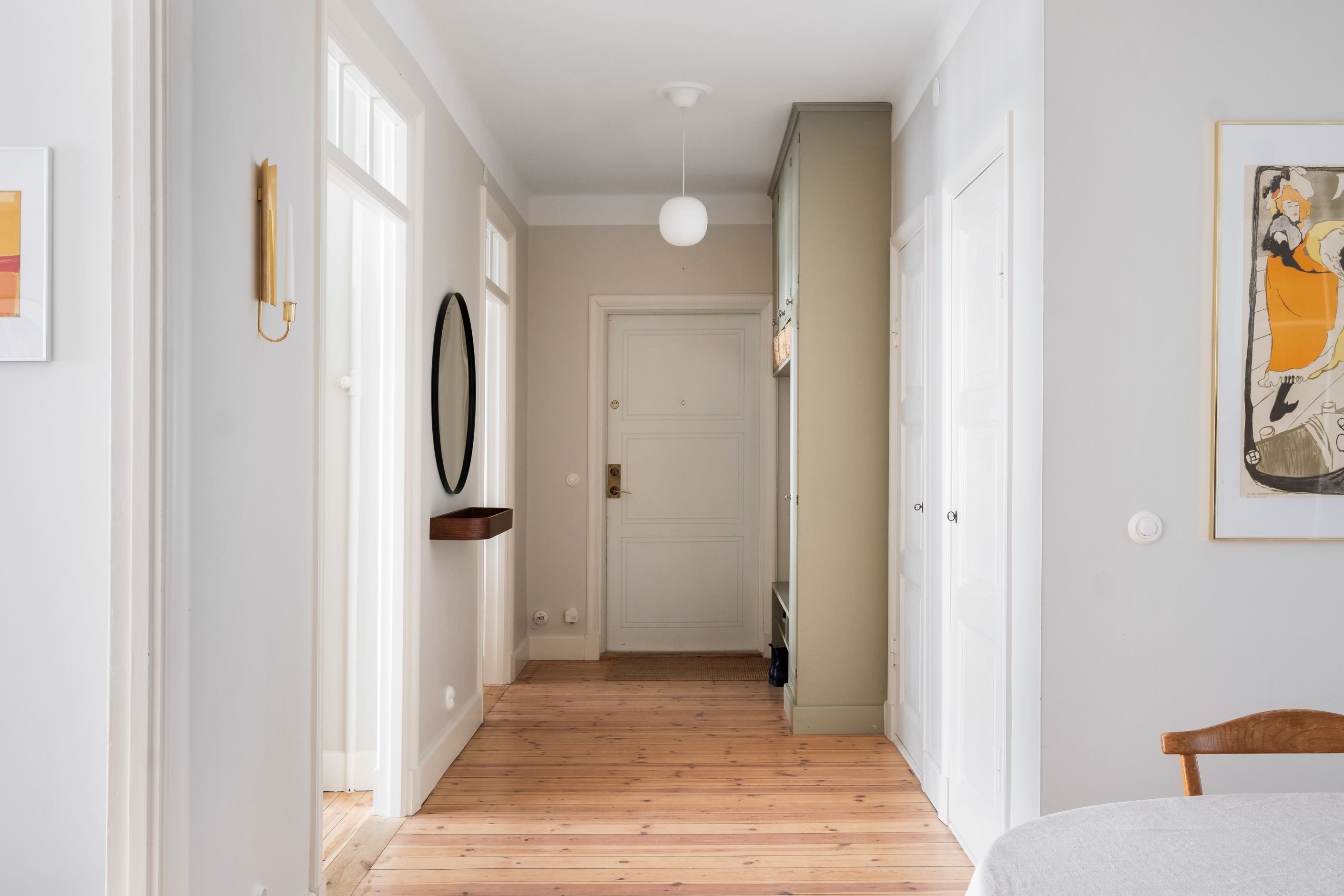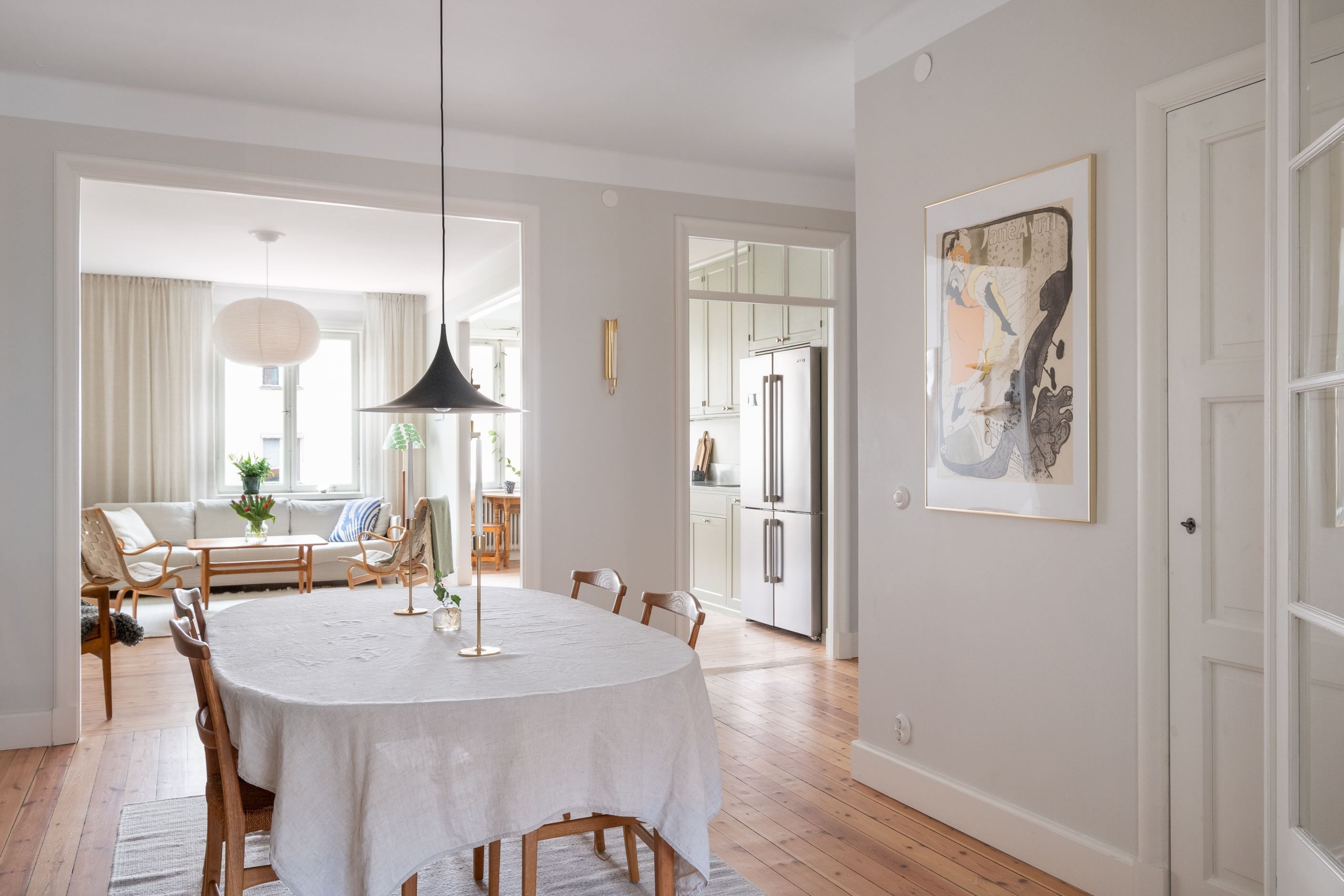 Här möts du av genomgående trägolv, generös takhöjd, speglade dörrar och vackra pardörrar med spröjs som tillsammans sätter tonen för en elegant och tidlös atmosfär. De sociala ytorna är öppna och sammanlänkade mellan kök, matsal och vardagsrum – perfekt för både vardagsliv och umgänge.