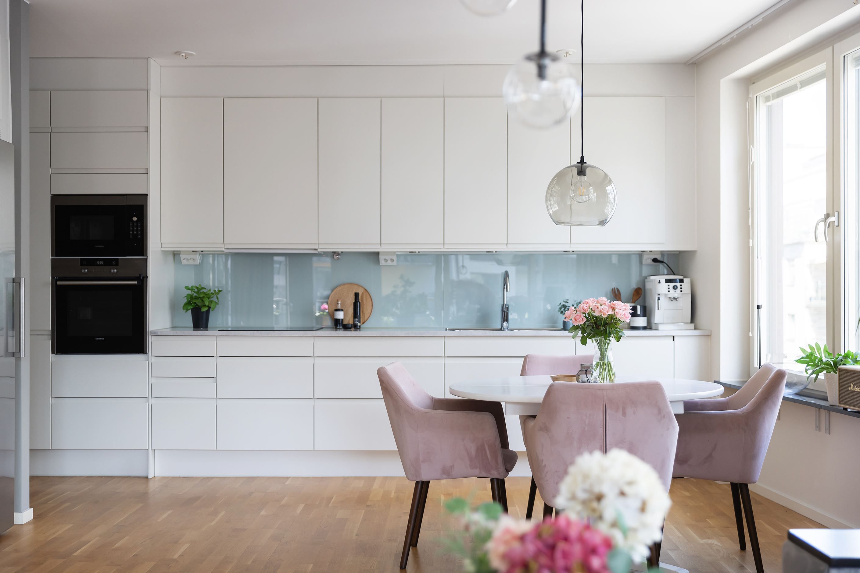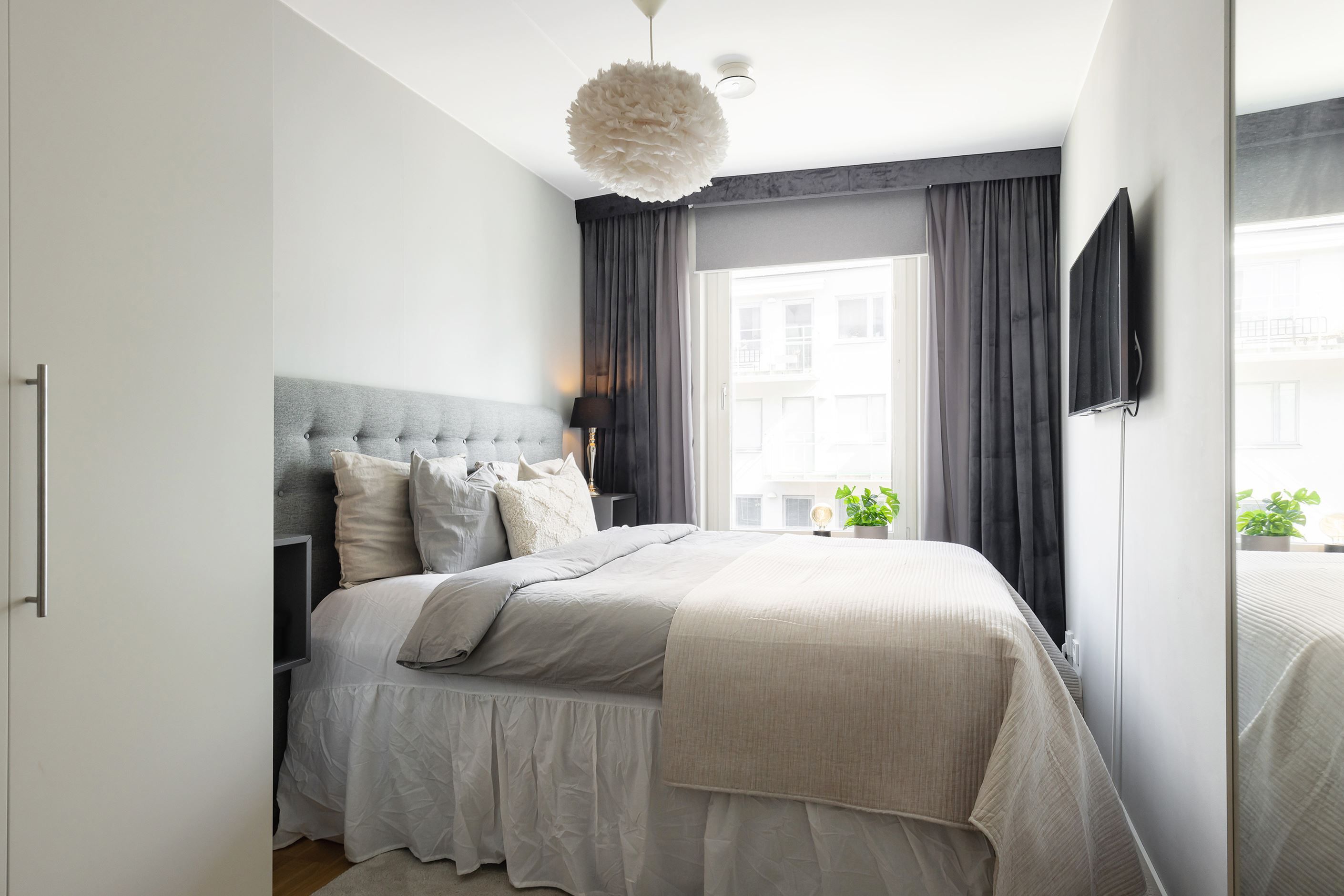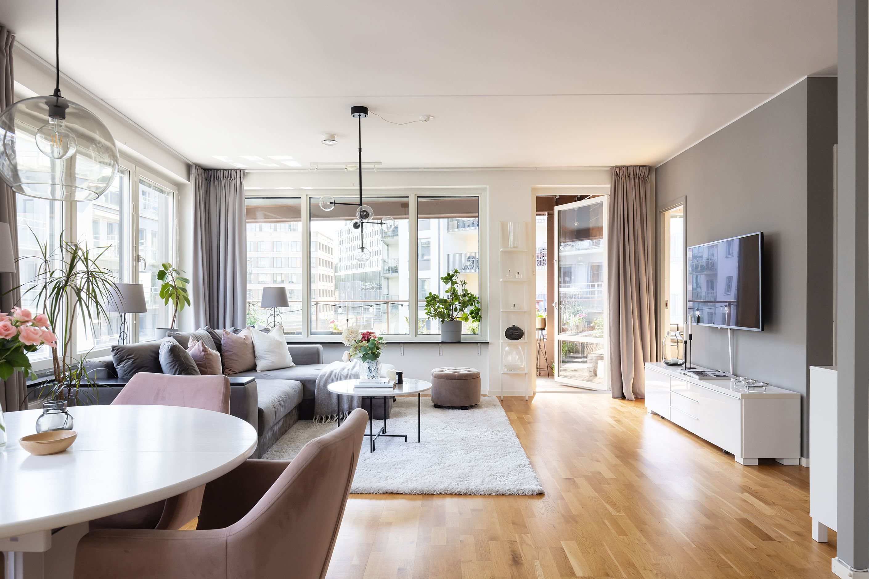 Vardagsrummet är rymligt och lättmöblerat med plats för allt du behöver för sociala sammankomster eller mysiga hemmakvällar. Härifrån når du också bostadens stora och härliga balkong i söderläge, vilket ger härligt med solljus. På golvet ligger parkett som följer med genomgående genom hela lägenheten för ett fint enhetligt uttryck. Köket är stilrent med vita släta luckor, och välutrustat med ugn och mikro i högskåp, häll med diskret utdragbar fläkt över, samt diskmaskin, kyl och frys i rostfritt. Här finns gott om plats för förvaring i över- och underskåp, och på de goda arbetsytorna på ljus bänkskiva lagar du gärna härliga middagar att bjuda familj och vänner på. Utrymme finns för väl tilltagen matplats där alla får plats. Det större, ursprungliga sovrummet är ombyggt till två mindre sovrum med plats för säng och förvaringslösningar. För den som vill går det att med lätthet återställa de två sovrummet till ett större, enligt originalplanlösningen. Det tredje sovrummet har ett avskilt läge direkt in till vänster när man kliver in i hallen. Här finns plats för säng och annat sovrumsmöblemang och förvaring, eller t. ex. skrivbord för den som istället önskar ett hemmakontor. Bostadens badrum är helkaklat med ljus klinker på golvet, duschhörna med glasade dörrar, handfat med kommod i vitt, samt både tvättmaskin och torktumlare under praktisk arbetsbänk.