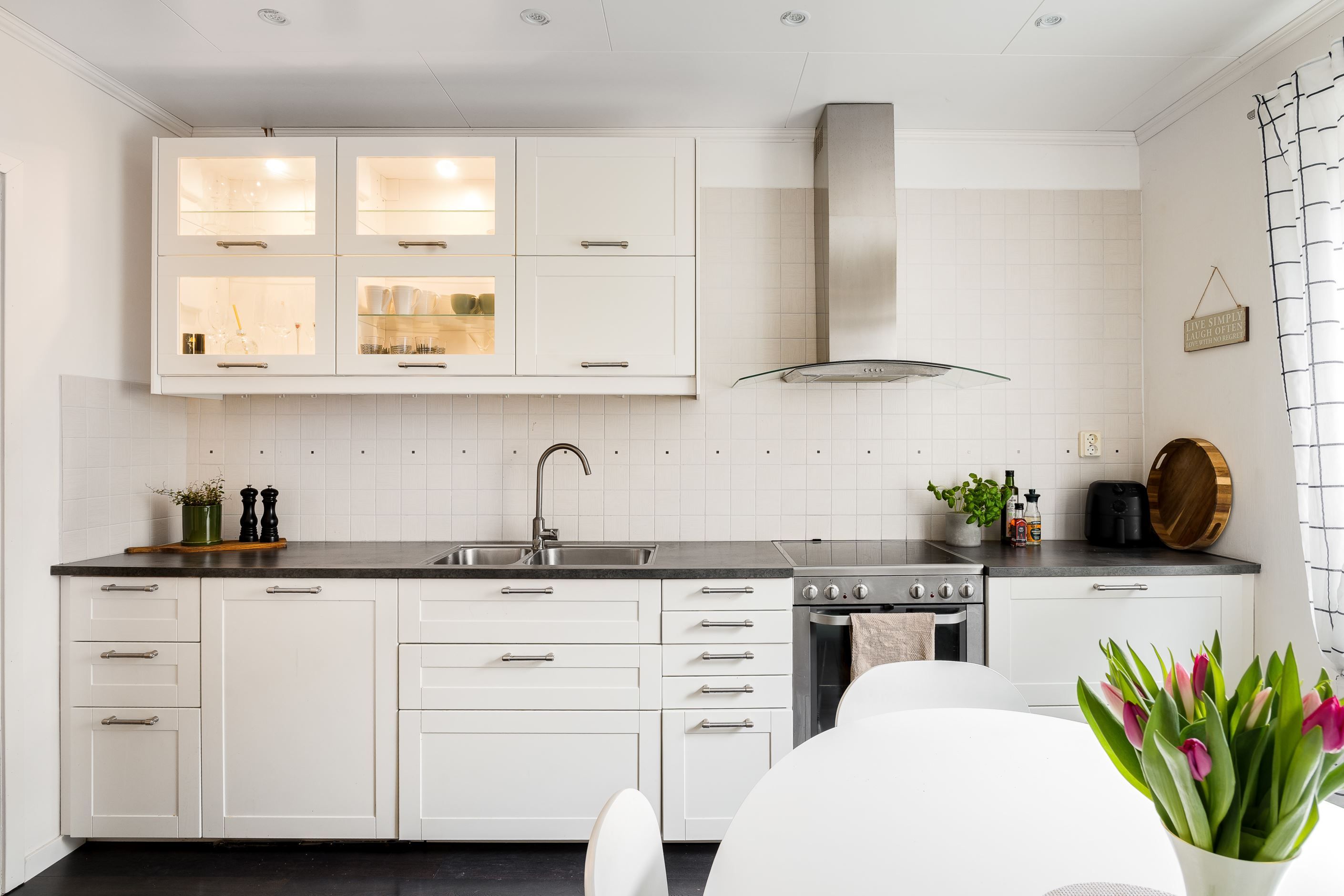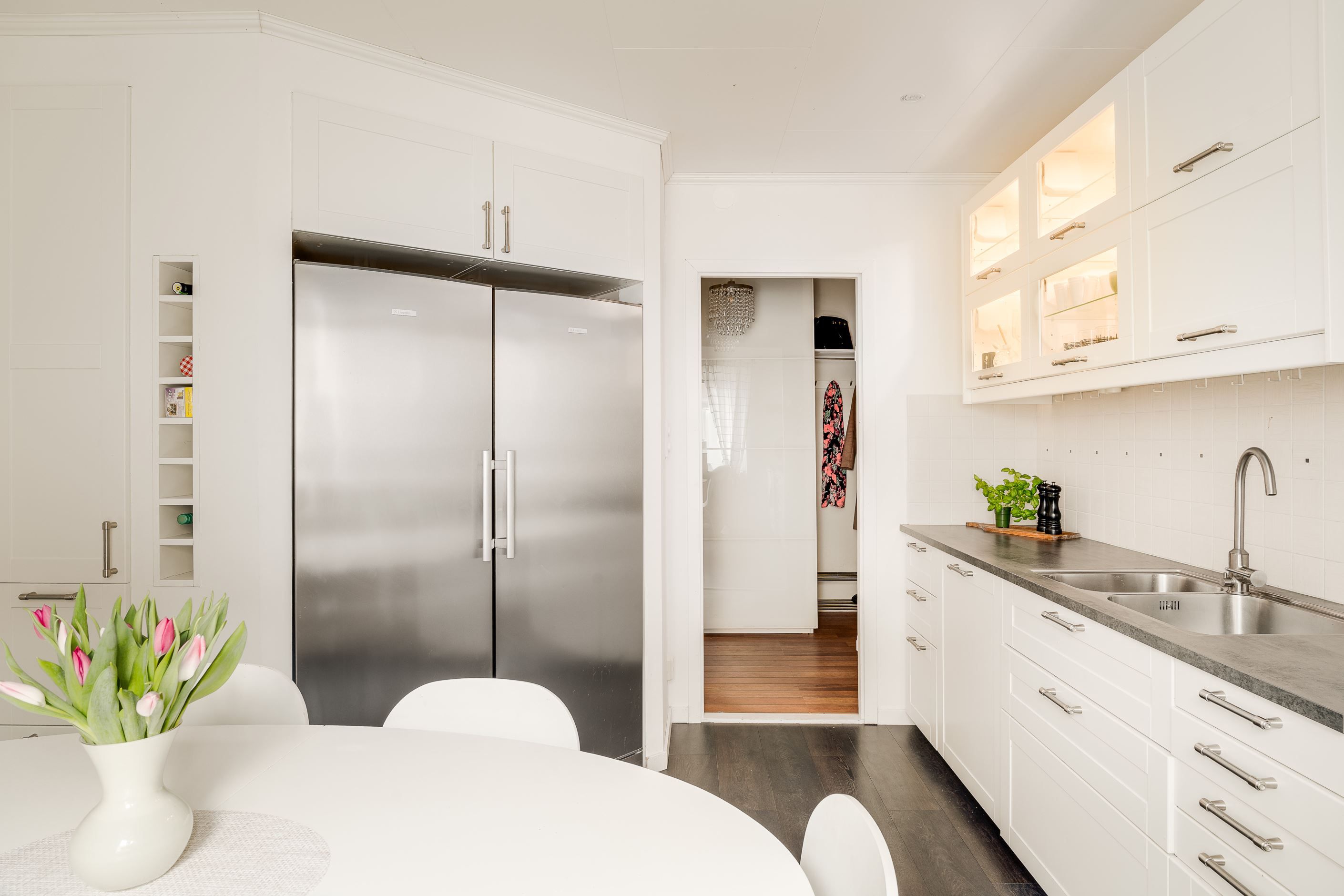 Köket har byggts om för att ge större och mer öppna ytor – perfekt för både vardag och umgänge. Det stilrena köket från IKEA med vita luckor, gott om förvaring samt stor kyl och frys ger både funktion och estetik.