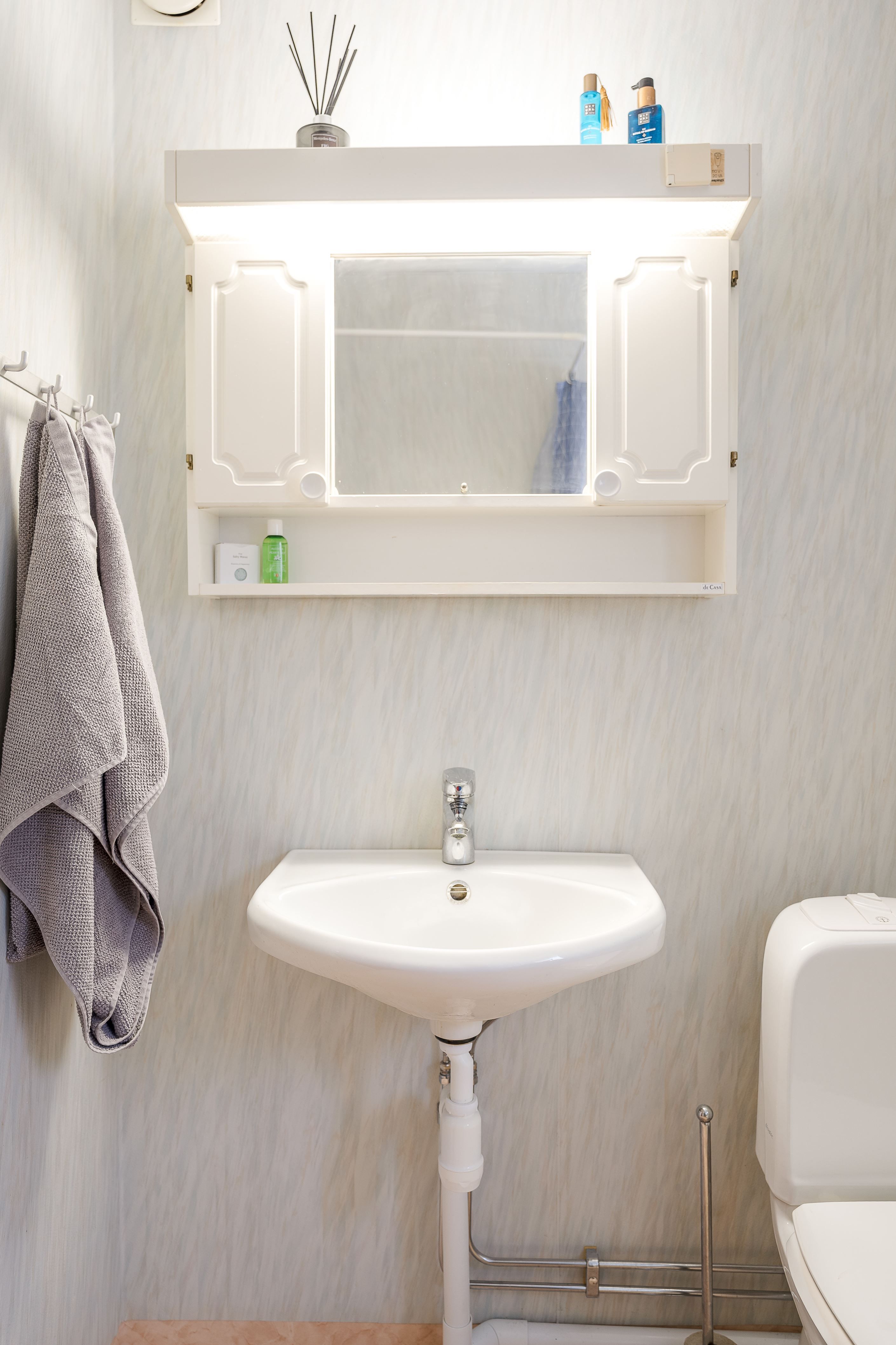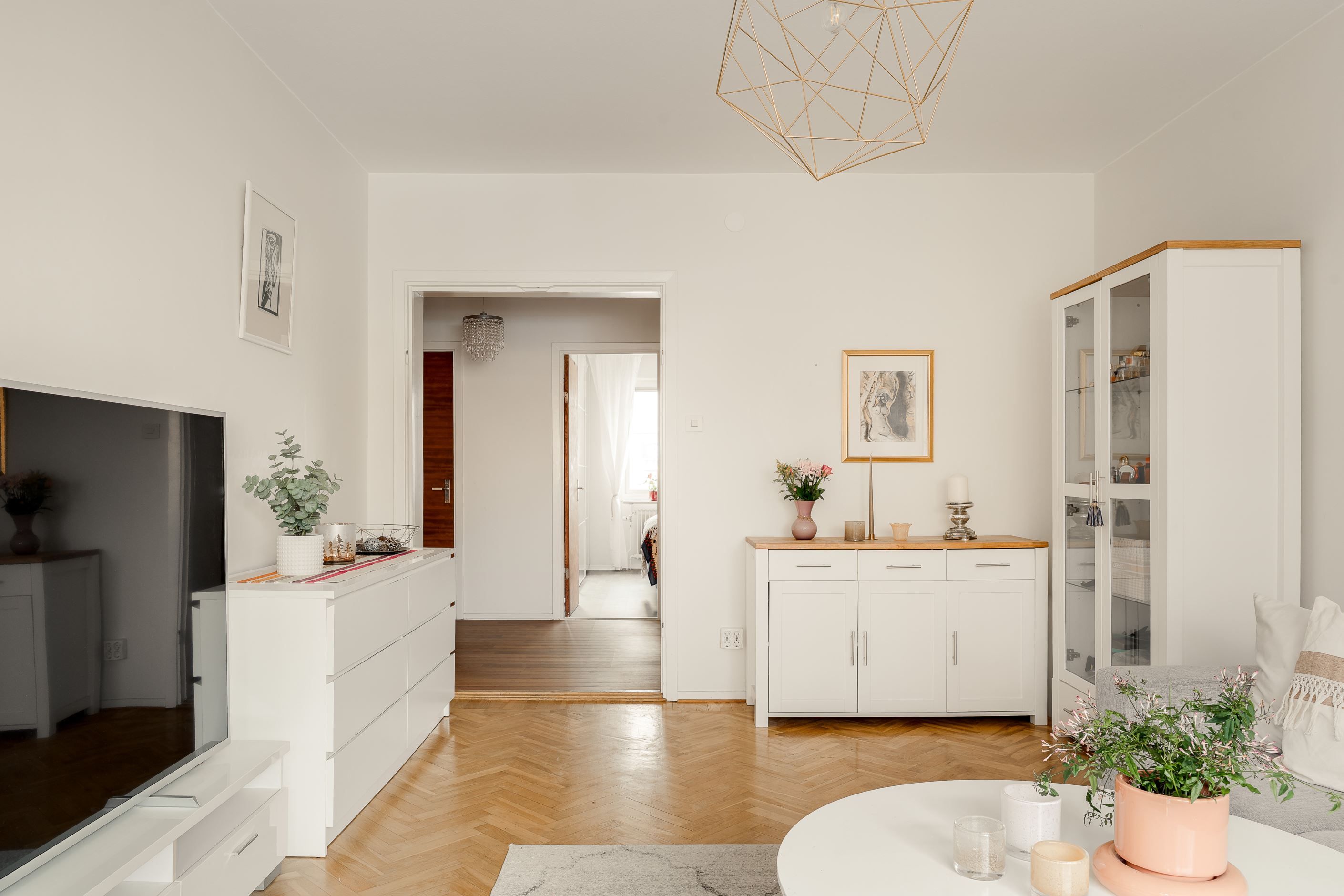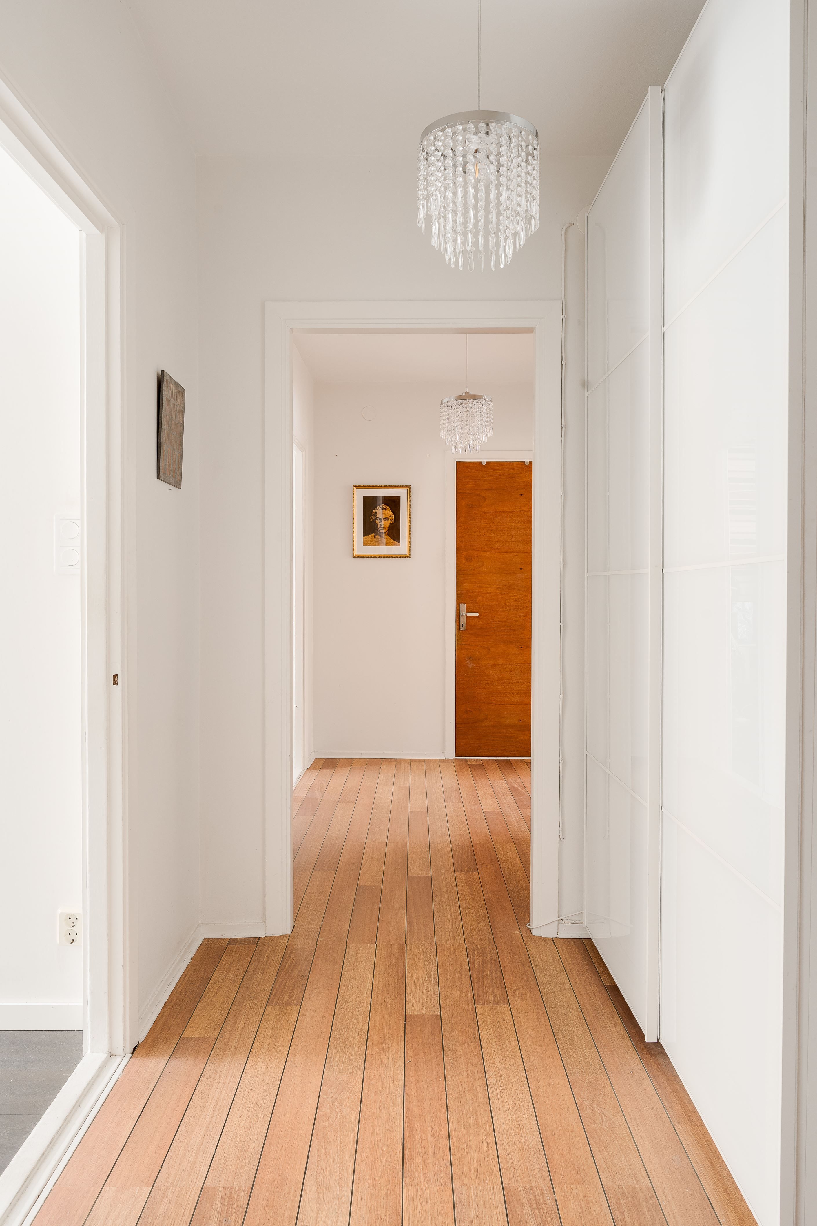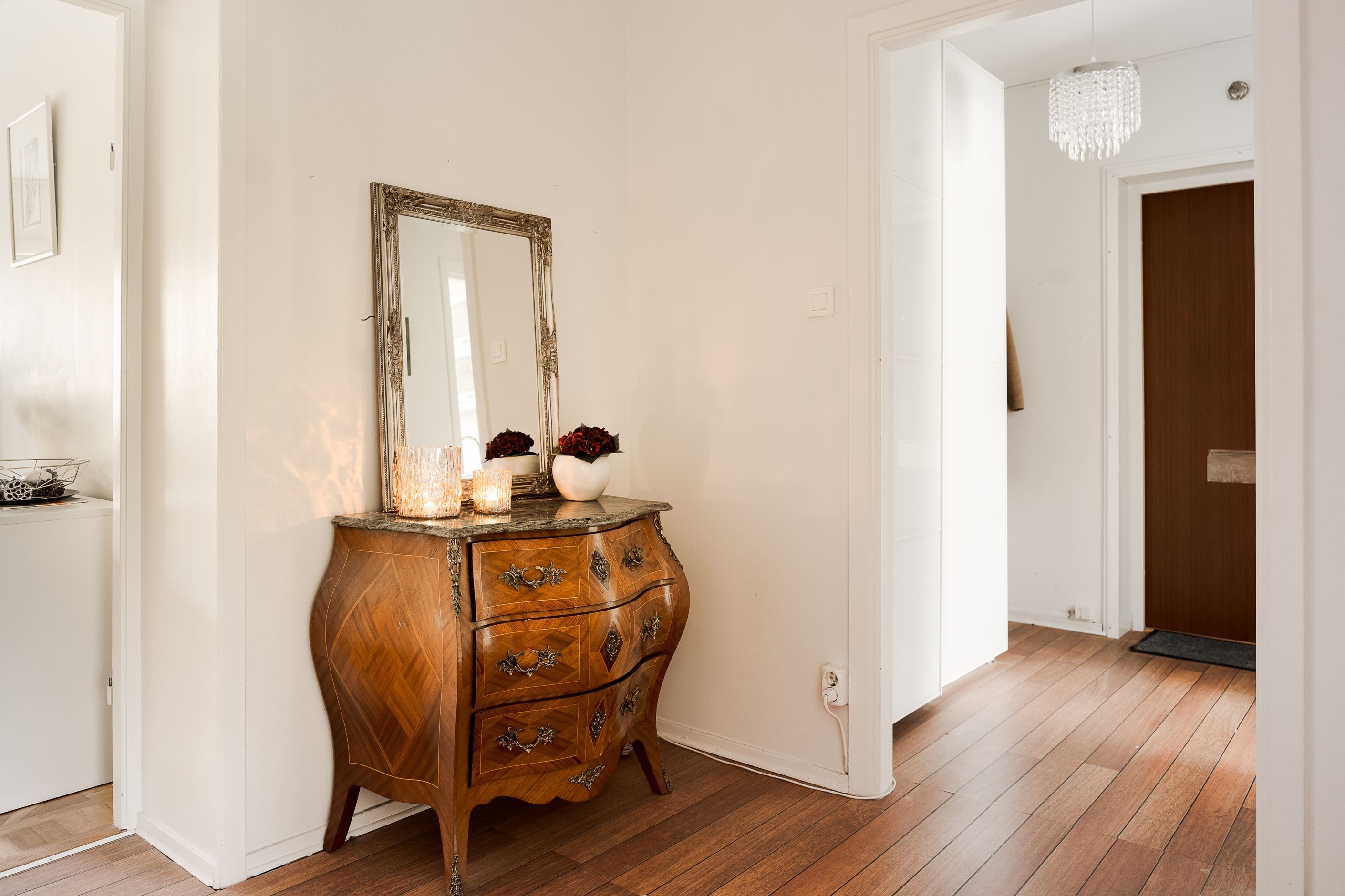 Entrén välkomnar med en rymlig garderob med skjutdörrar som ger ett prydligt första intryck och goda förvaringsmöjligheter. Vidare in i bostaden möts du av en inre hall som på ett naturligt sätt leder vidare till linneskåp, badrum, sovrum och vardagsrum. Lägenheten är belägen en trappa upp i huset och har ett trevligt hörnläge, vilket bidrar till ett fint ljusinsläpp och en luftig känsla genom hela bostaden.