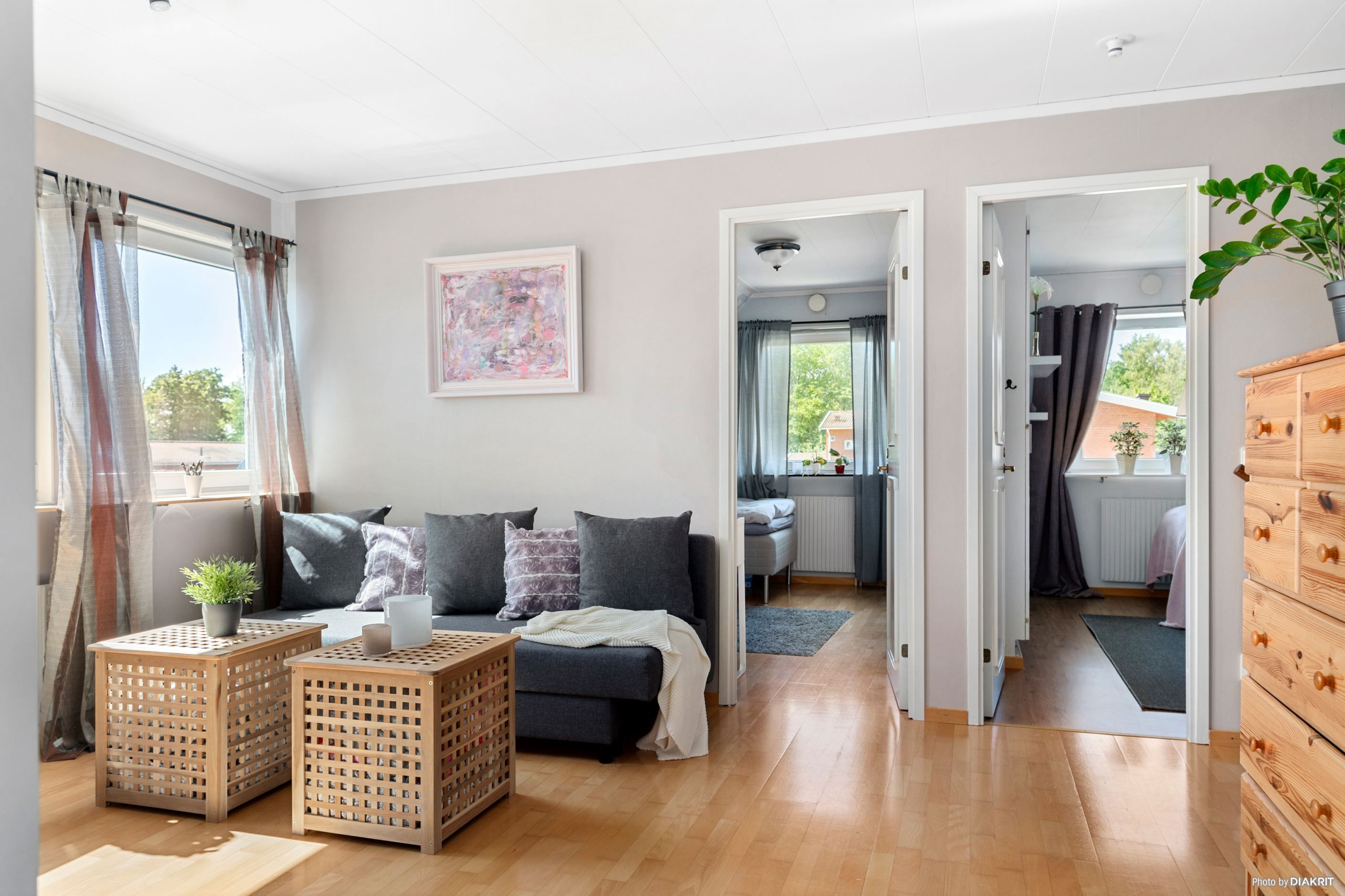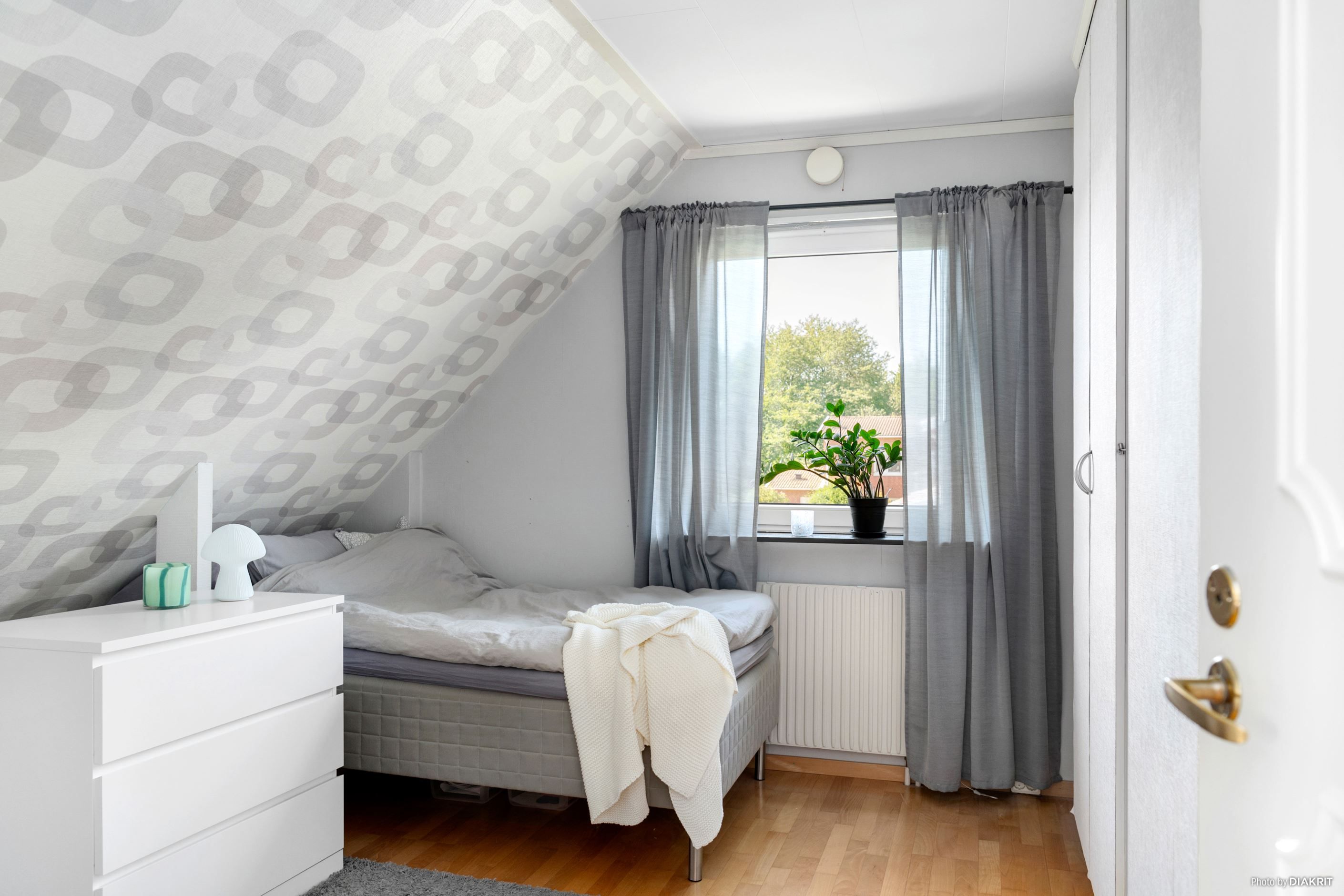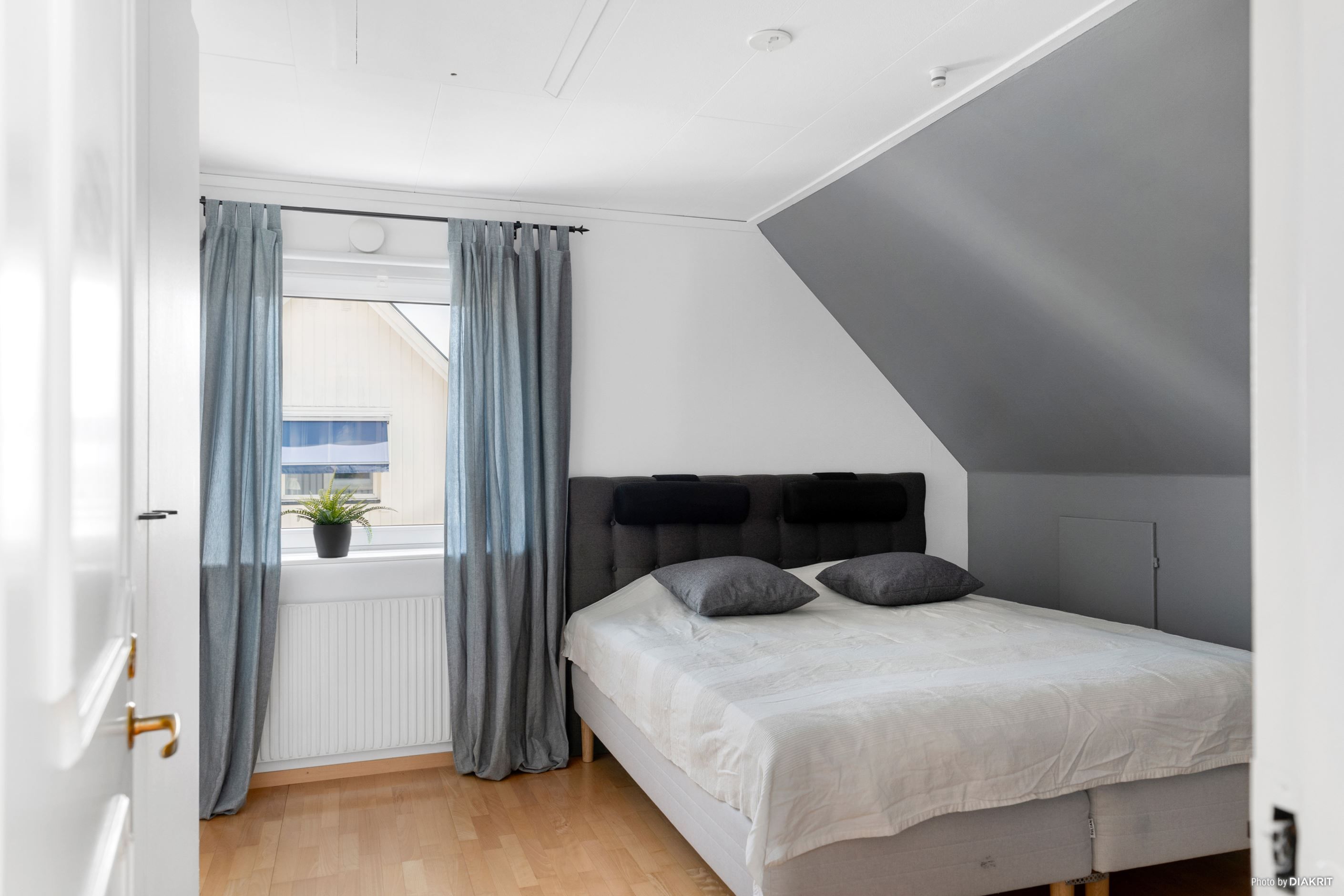Trappan i hallen leder oss till det övre våningsplanet, som naturligt blir den mer privata delen av bostaden. Här möts man av ett allrum som kan användas som ett andra vardagsrum – eller varför inte en yta där de yngre kan härja fritt? Här finns även två mindre sovrum samt ett större sovrum, perfekt för familjen som vill ha alla samlade på samma våningsplan. Från allrummet når man även ytterligare ett komplett badrum, utrustat med badkar.
