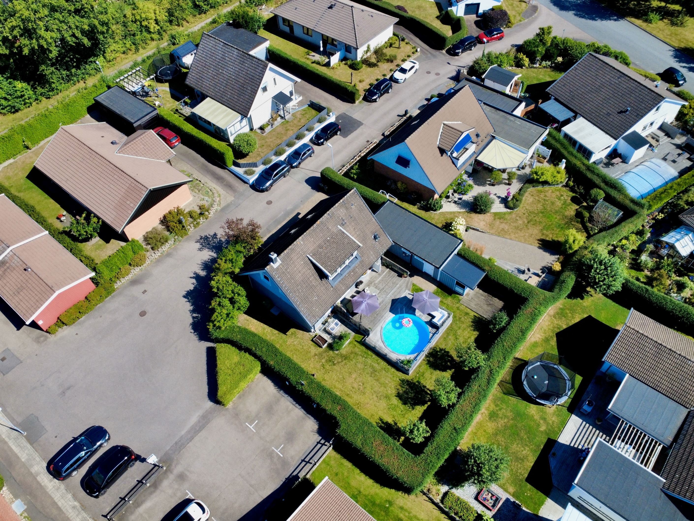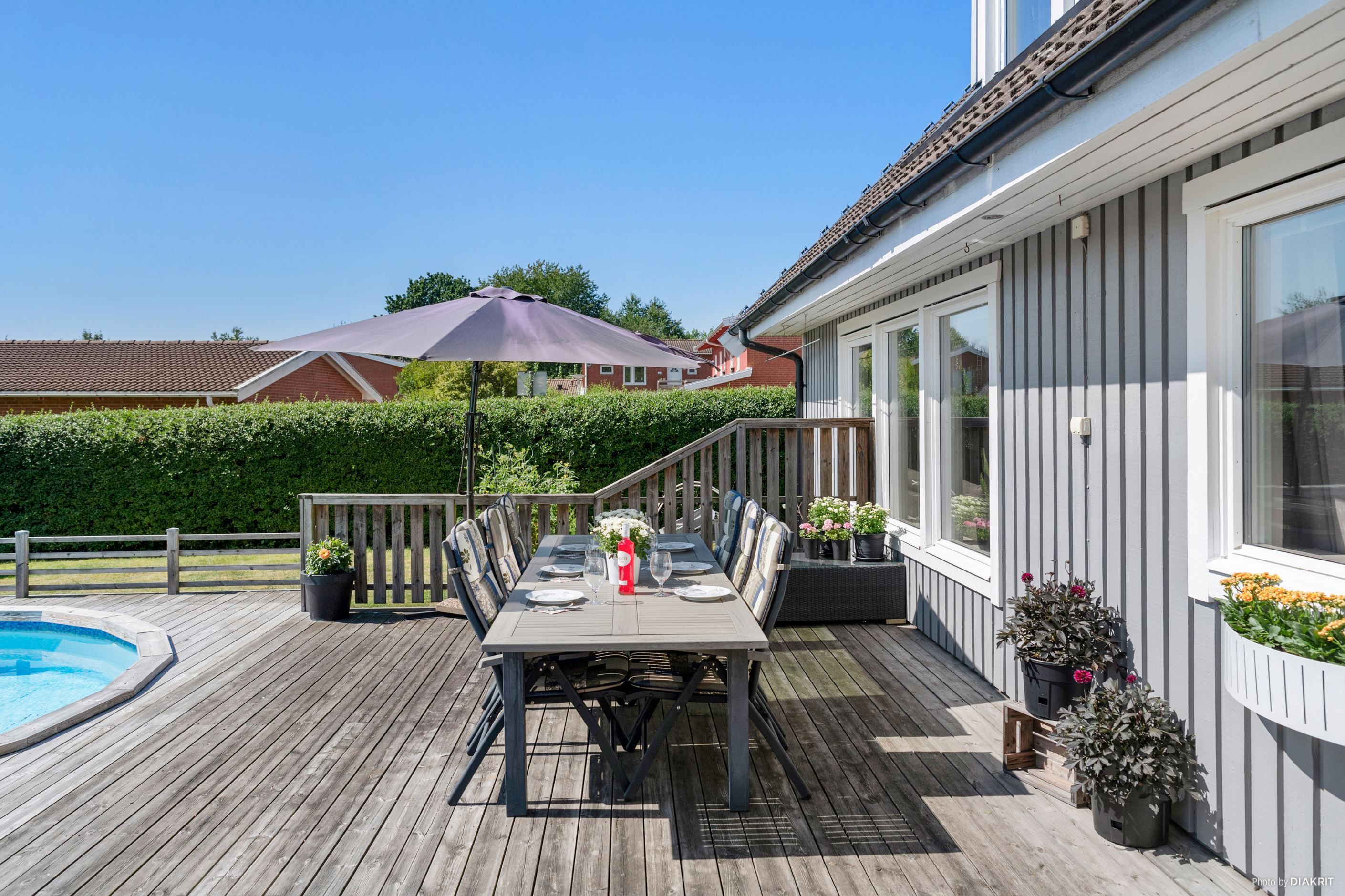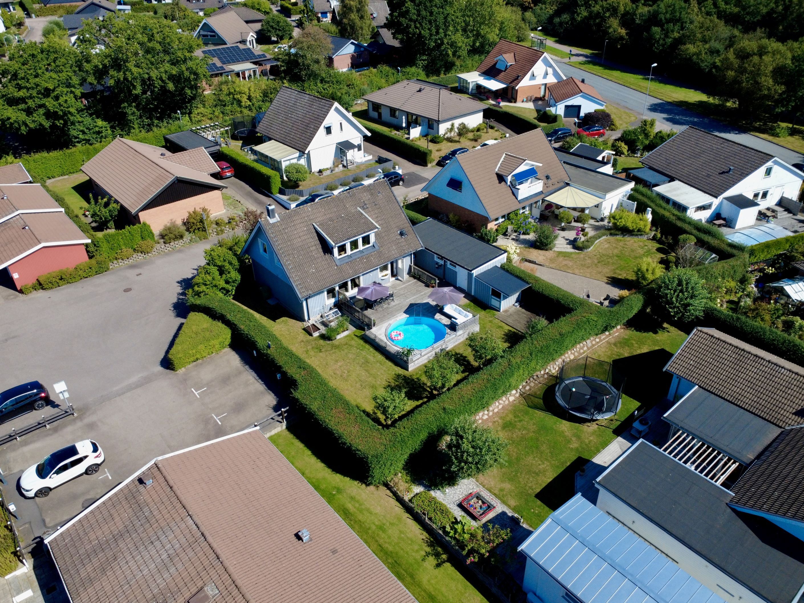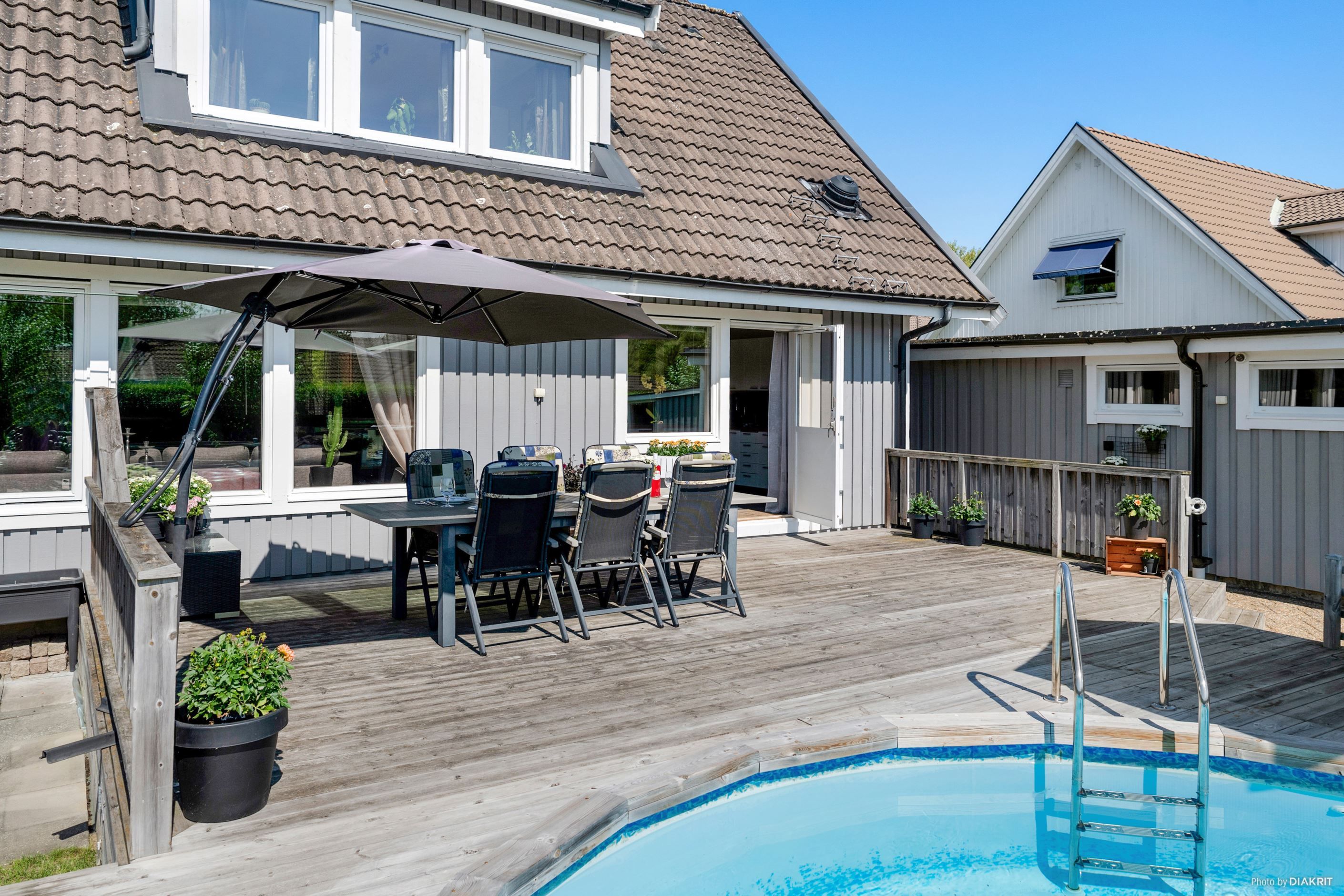 Entrén på husets östra gavel blir naturligt den vardagliga ingången, då den enkelt nås från garageuppfarten samt garaget. Här möts vi av ett grovkök med tvättstuga och goda förvaringsmöjligheter för skor och ytterkläder. Vi leds sedan vidare in i en luftig, möblerbar hall där man har skapat en smart arbetsyta för hemmakontor. Från husets södra sida strålar solen in genom fönstren i kök och vardagsrum, som vetter mot den fantastiska trädgården med poolområde. Här spenderas många härliga sommardagar med vänner och familj, sent in på kvällarna med mysiga grillkvällar.