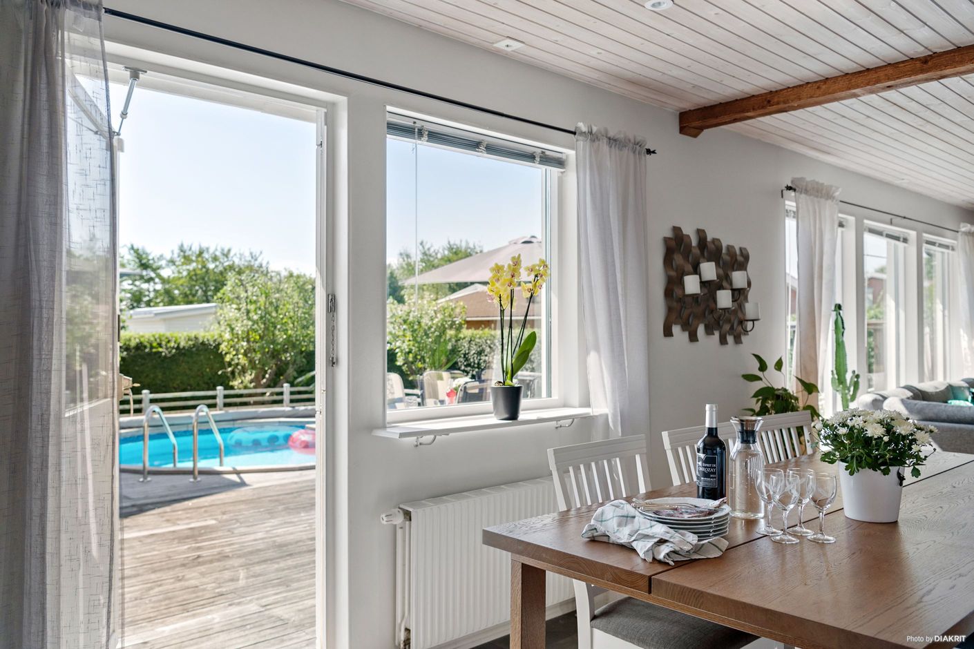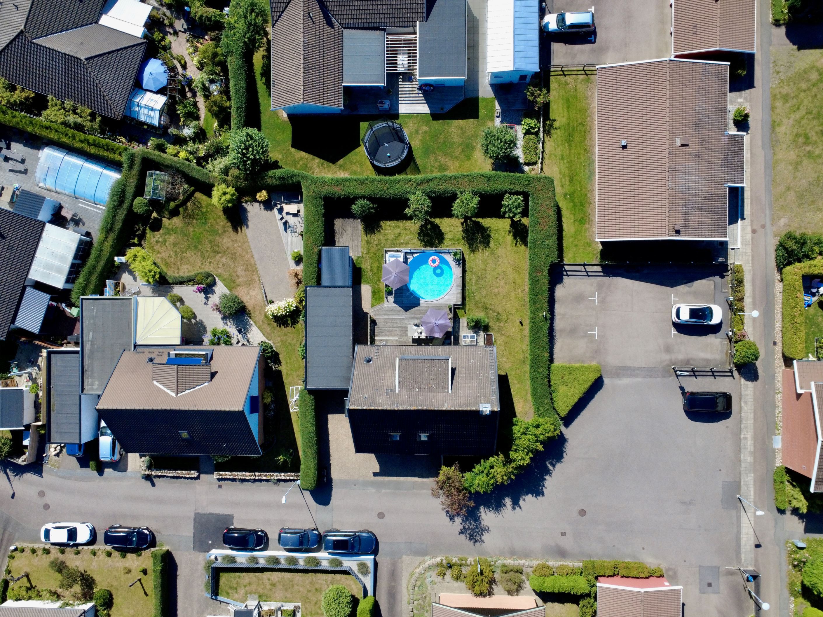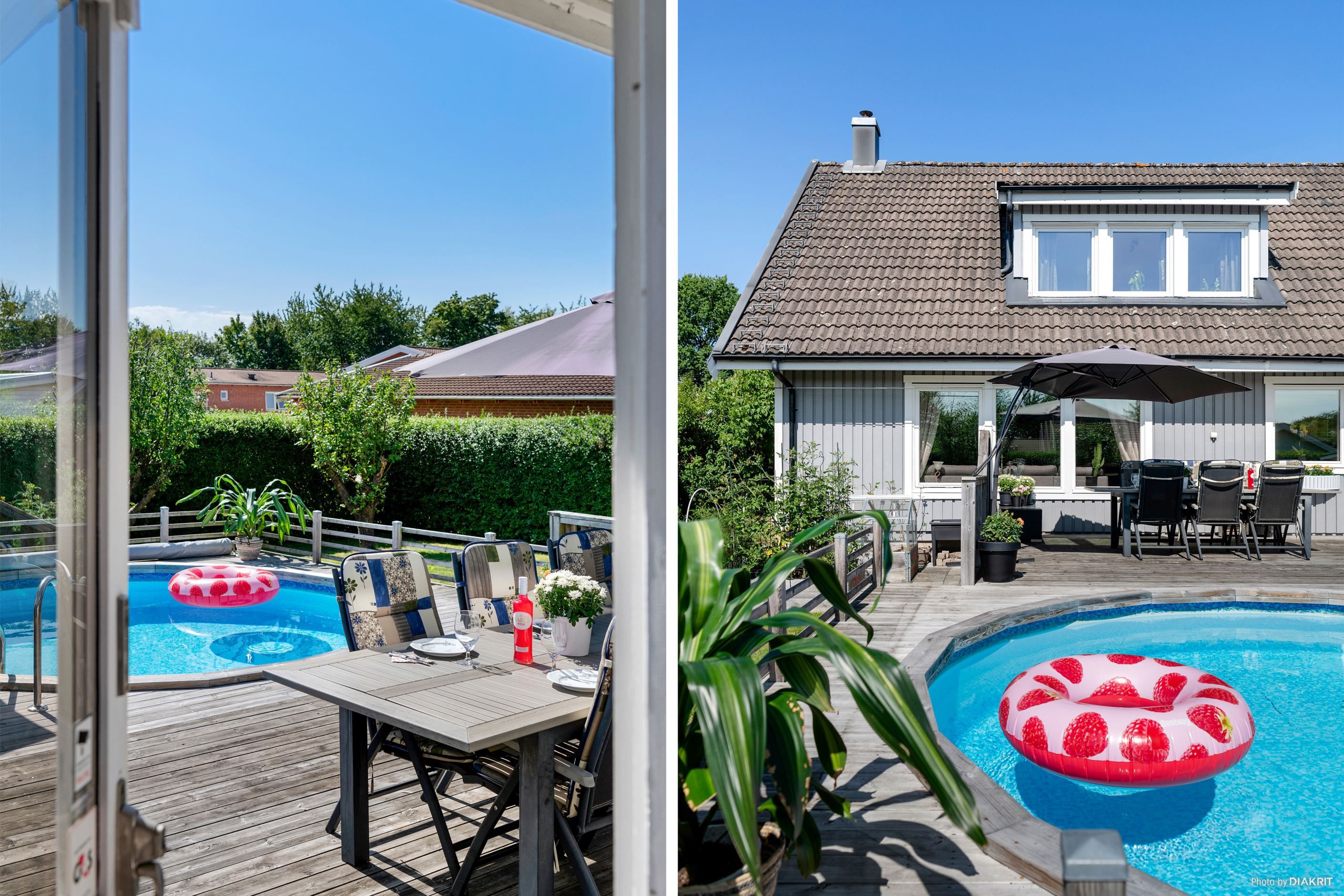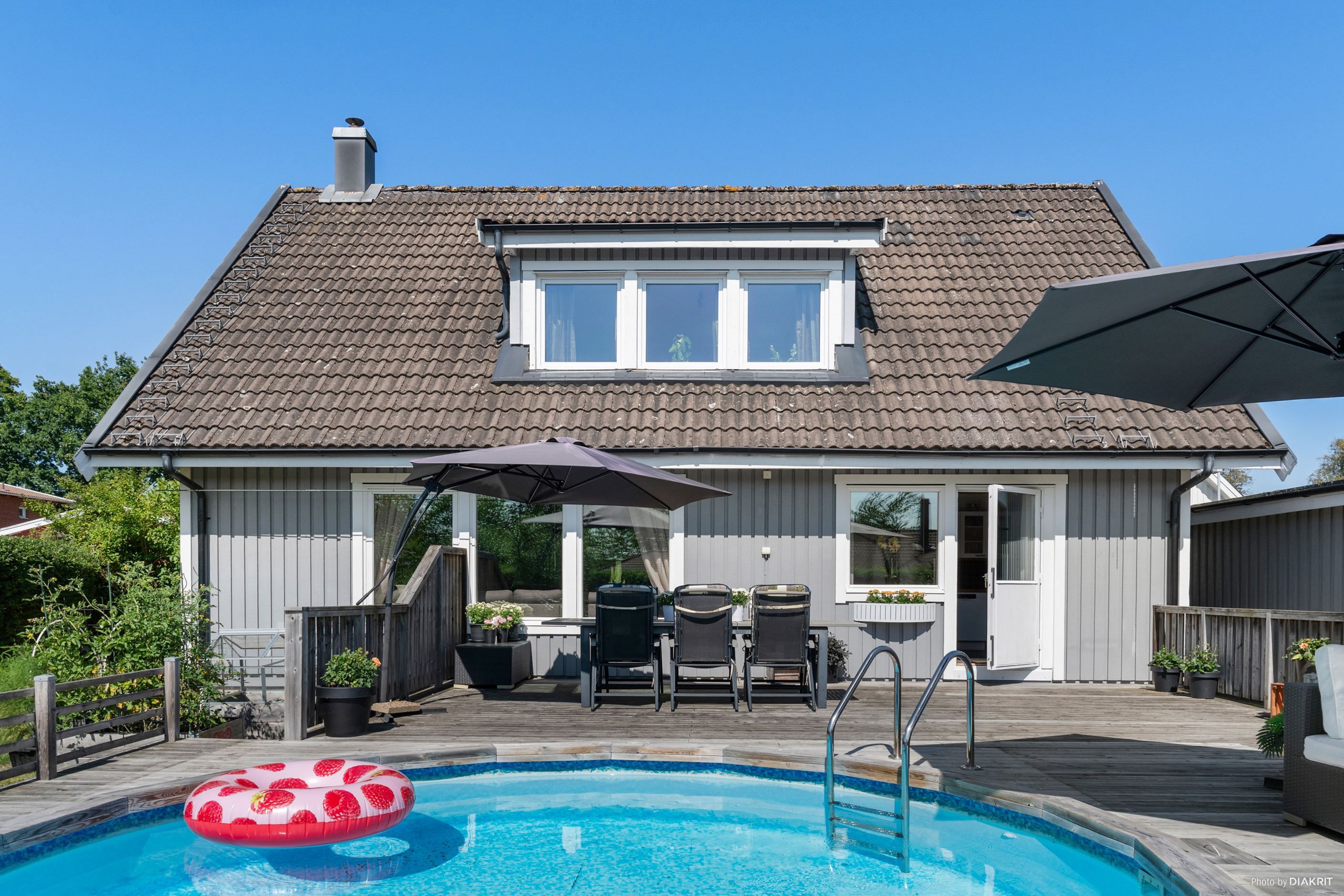 Entrén på husets östra gavel blir naturligt den vardagliga ingången, då den enkelt nås från garageuppfarten samt garaget. Här möts vi av ett grovkök med tvättstuga och goda förvaringsmöjligheter för skor och ytterkläder. Vi leds sedan vidare in i en luftig, möblerbar hall där man har skapat en smart arbetsyta för hemmakontor. Från husets södra sida strålar solen in genom fönstren i kök och vardagsrum, som vetter mot den fantastiska trädgården med poolområde. Här spenderas många härliga sommardagar med vänner och familj, sent in på kvällarna med mysiga grillkvällar.