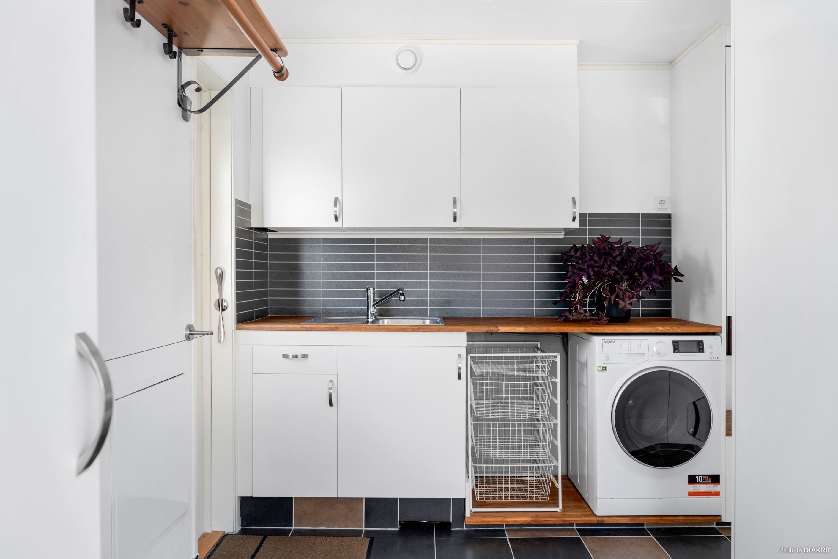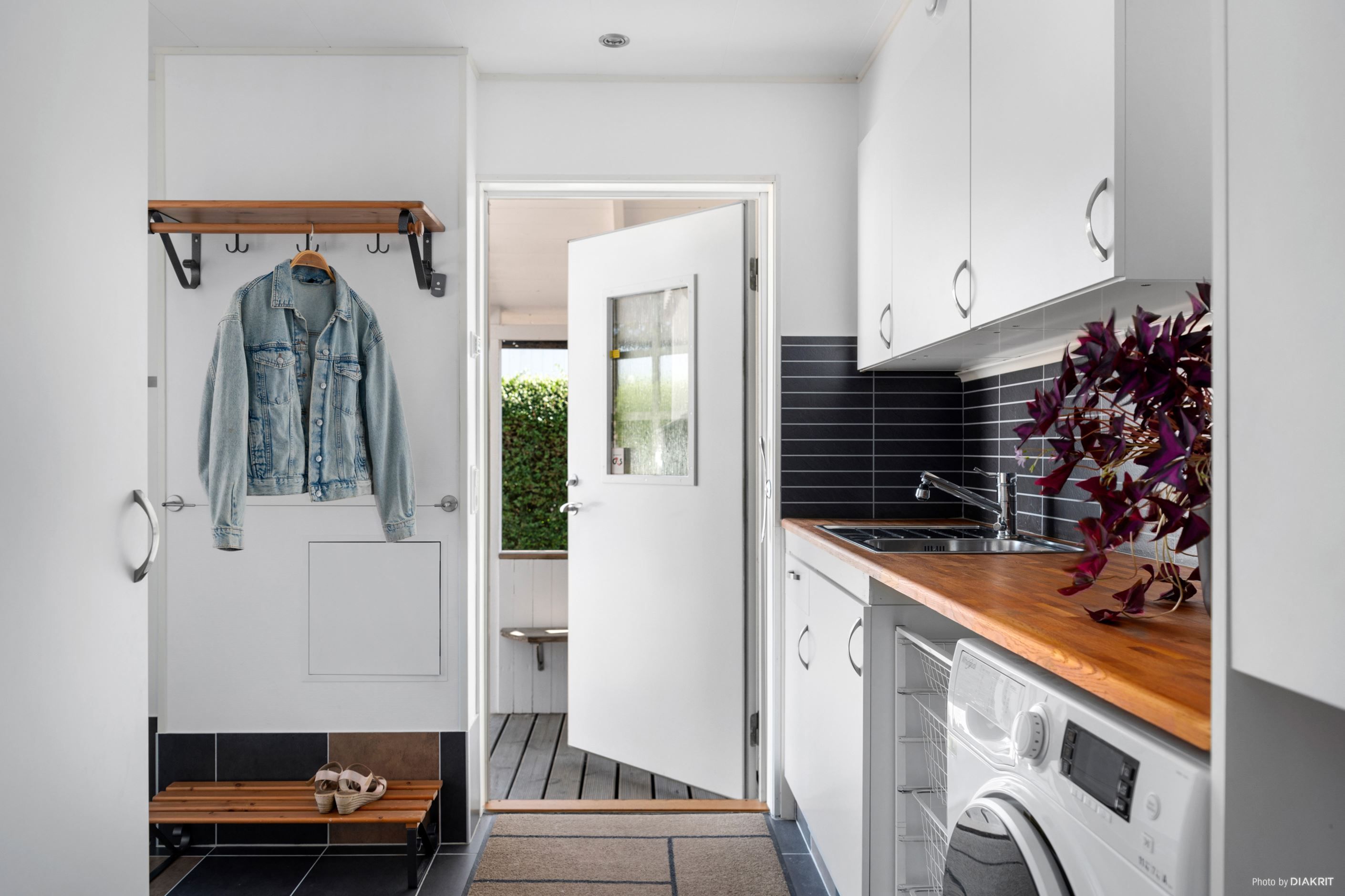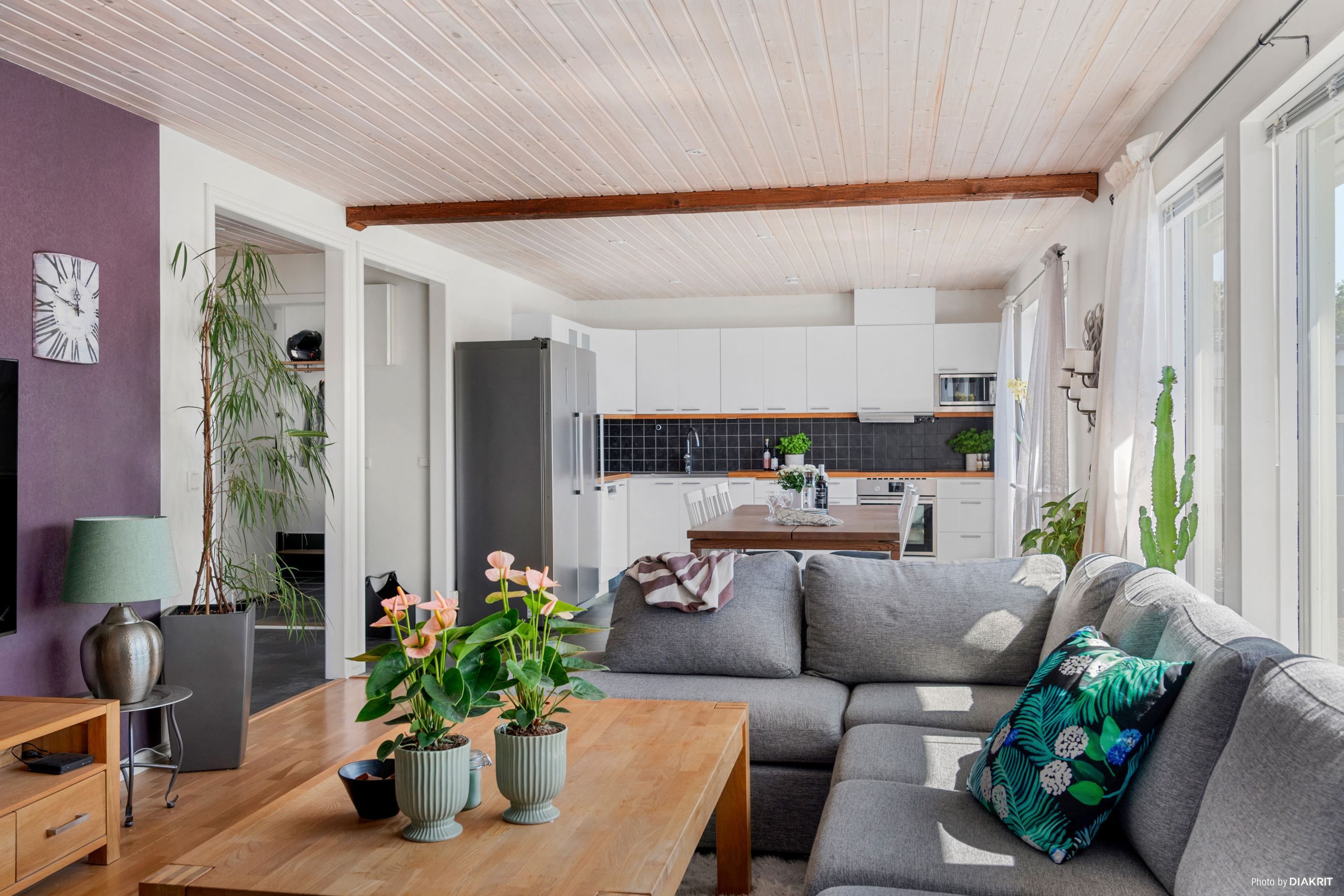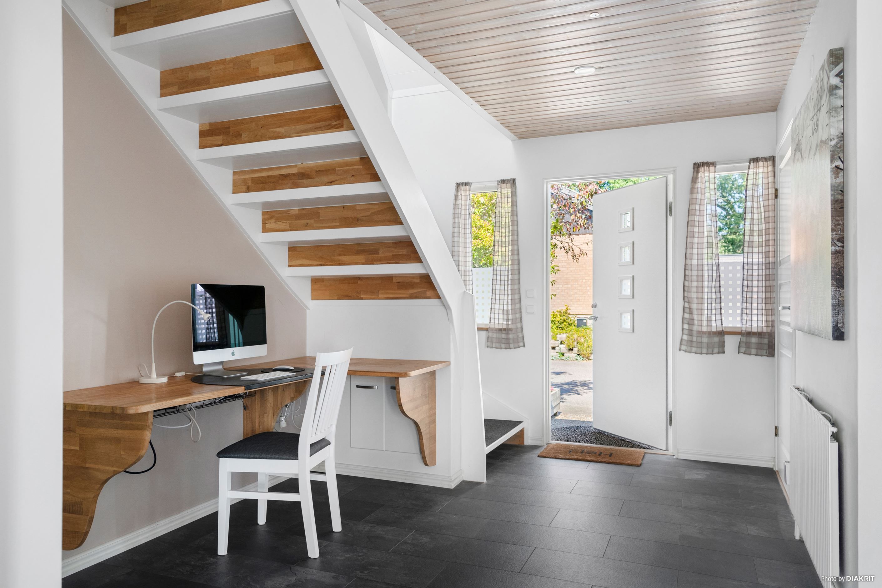 Entrén på husets östra gavel blir naturligt den vardagliga ingången, då den enkelt nås från garageuppfarten samt garaget. Här möts vi av ett grovkök med tvättstuga och goda förvaringsmöjligheter för skor och ytterkläder. Vi leds sedan vidare in i en luftig, möblerbar hall där man har skapat en smart arbetsyta för hemmakontor. Från husets södra sida strålar solen in genom fönstren i kök och vardagsrum, som vetter mot den fantastiska trädgården med poolområde. Här spenderas många härliga sommardagar med vänner och familj, sent in på kvällarna med mysiga grillkvällar.
