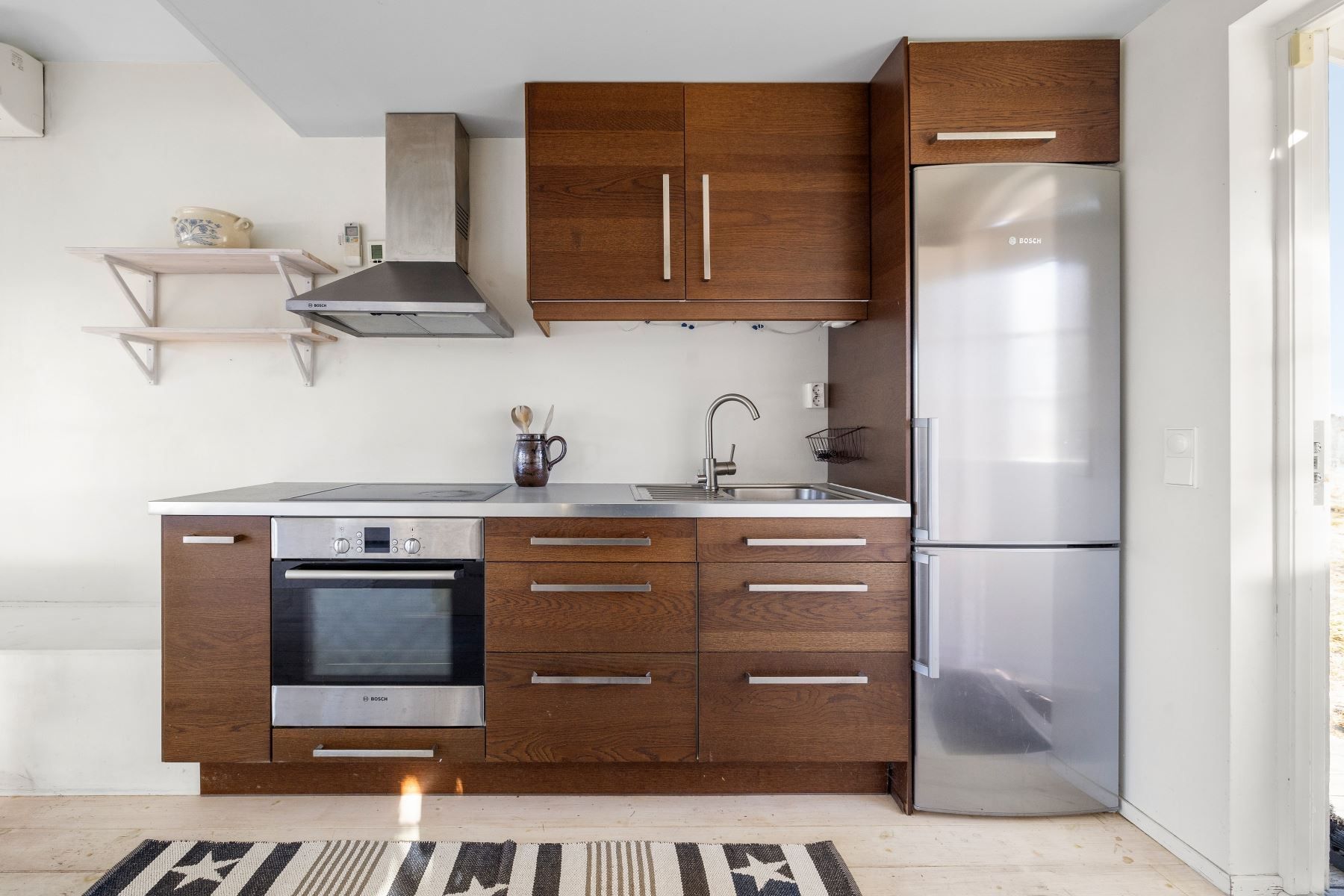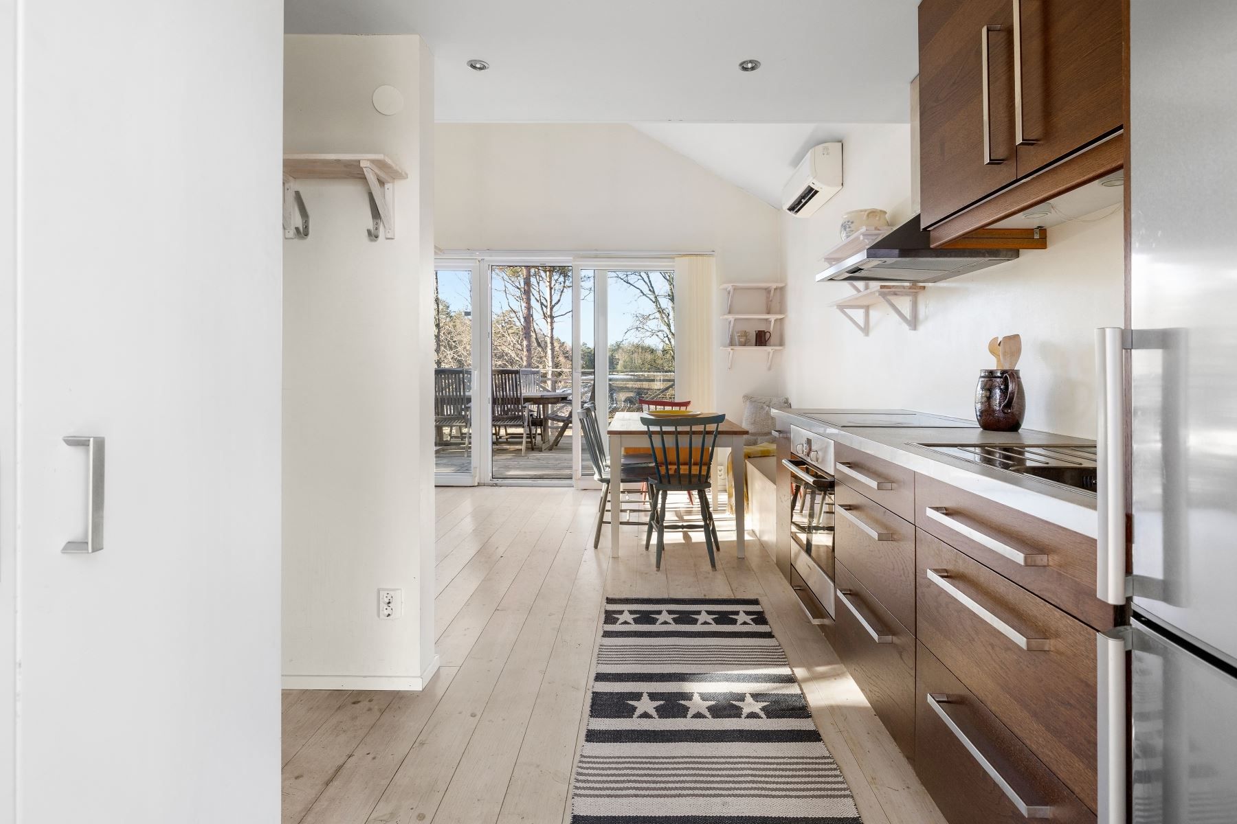 Du välkomnas in i huvudbyggnaden med en ljus och öppen hall med möjlighet för avhängning och ett anslutande förråd för extra förvaring. Vidare in i bostaden har du ett luftigt och öppet vardagsrum med ca 4 meter takhöjd som skapar en fantastisk rymd och atmosfär. Kök och matplats i öppen planlösning med dubbla utgångar till den soldränkta altanen. Tre bra sovrum varav ett med skjutdörrsgarderober och ett helkaklat badrum med dusch och groventré. En trappa upp nås det härliga loftet som kan nyttjas som ett allrum eller stort sovrum. Genomtänkt med det charmiga ovala fönstret mot entréplanet för flödande ljusinsläpp och ett fönster med utsikt mot skogen.