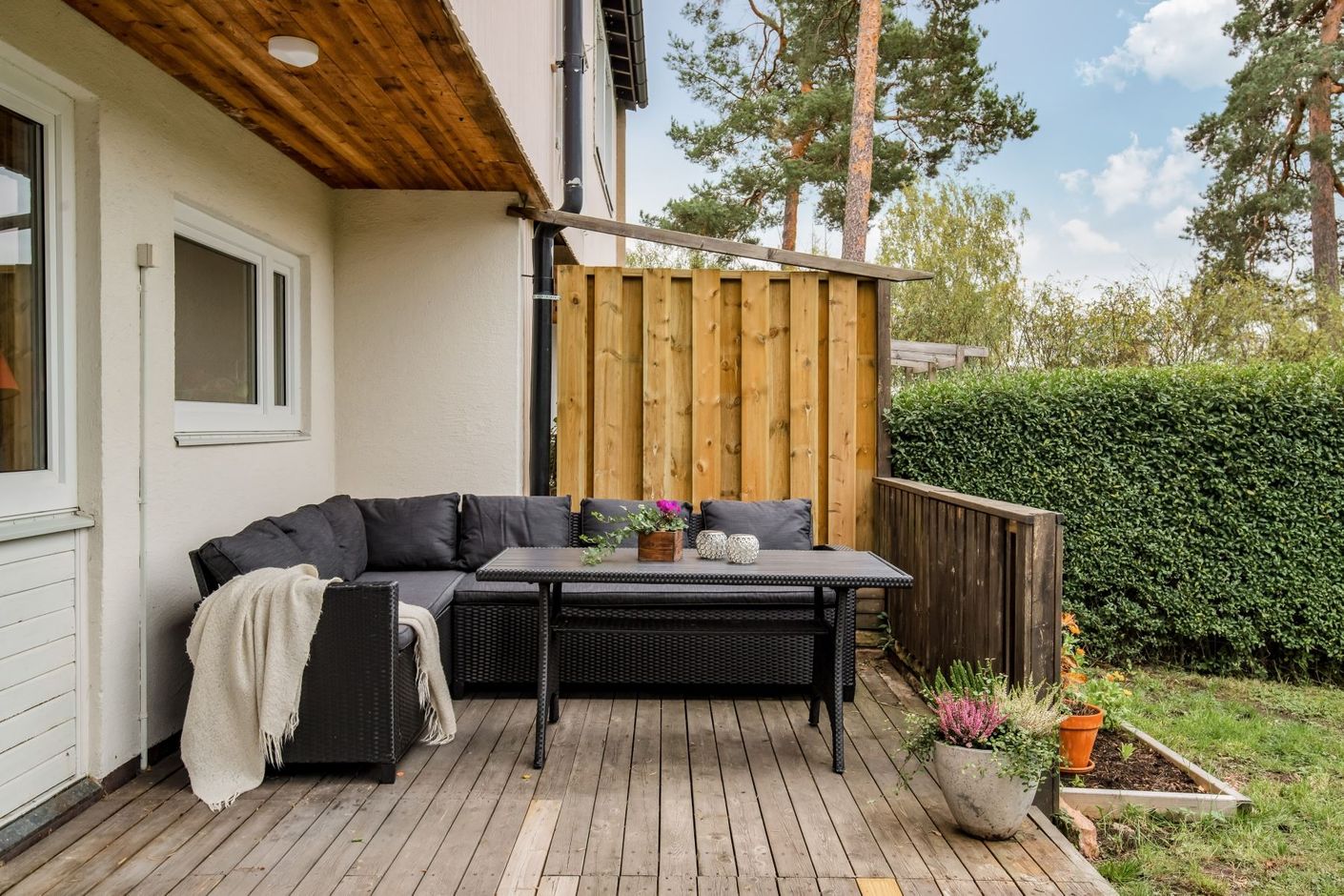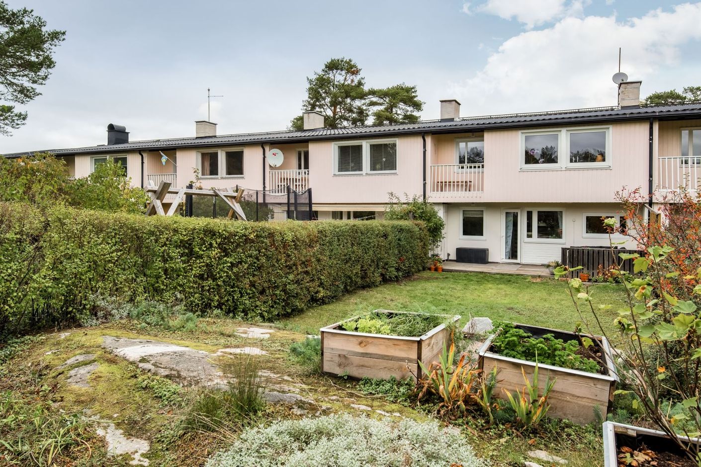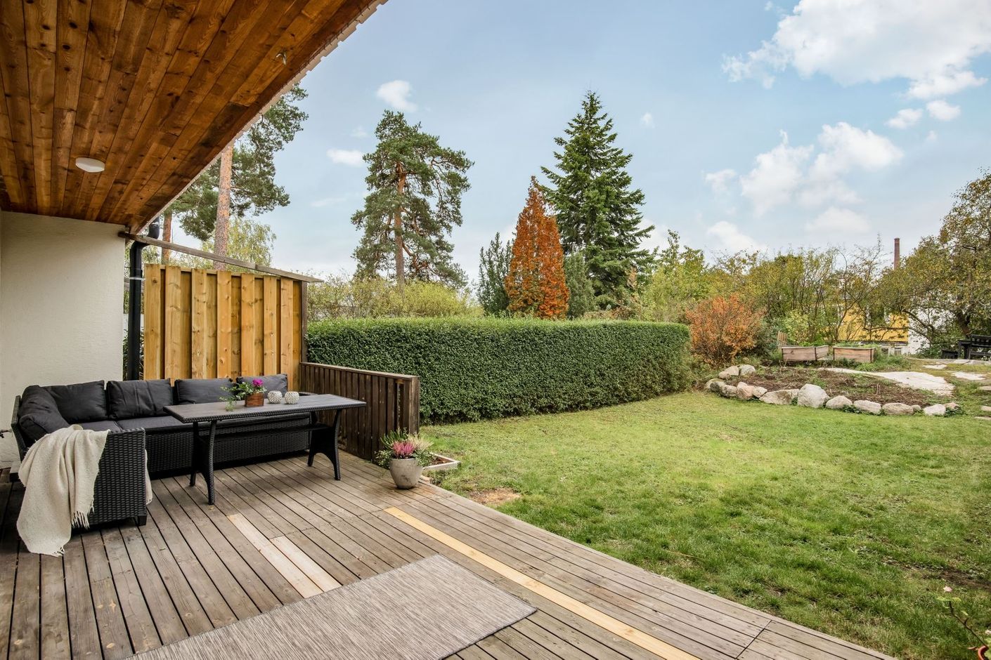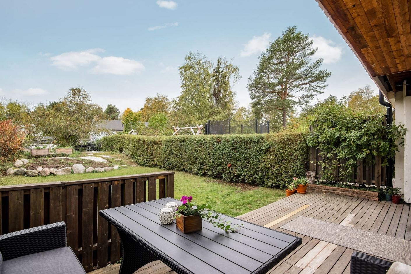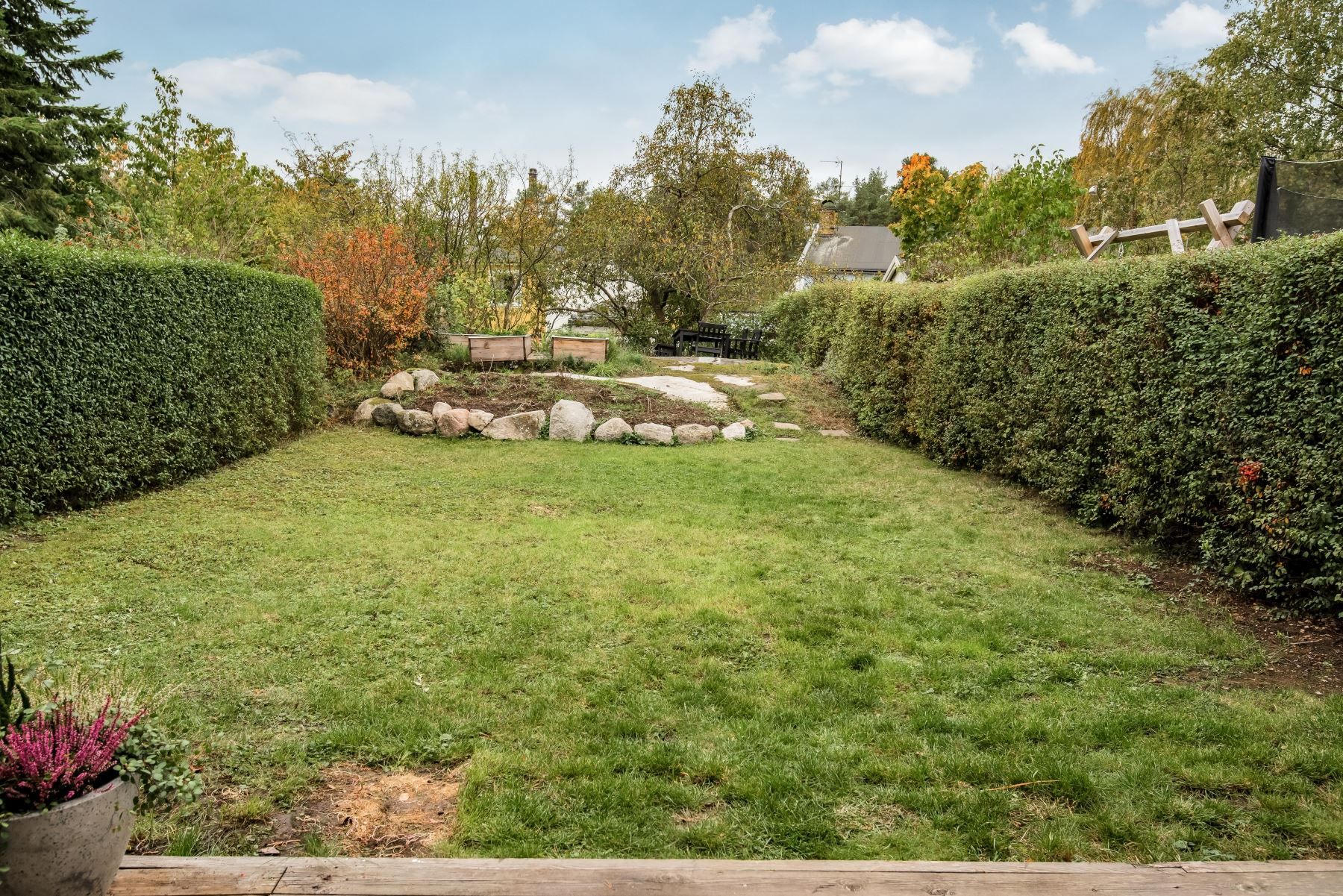 Lättskött och fin trädgårdstomt med planteringar och buskar. Baksidan av tomten badar i solljus.