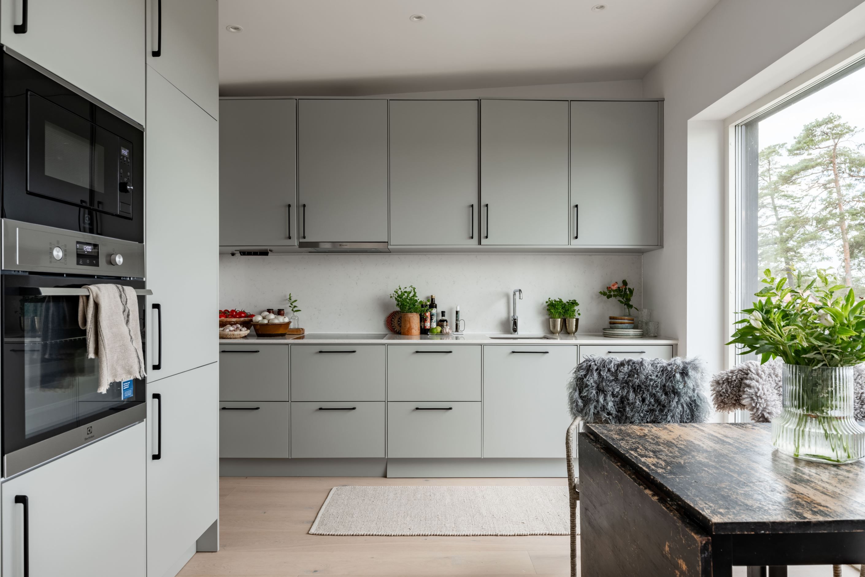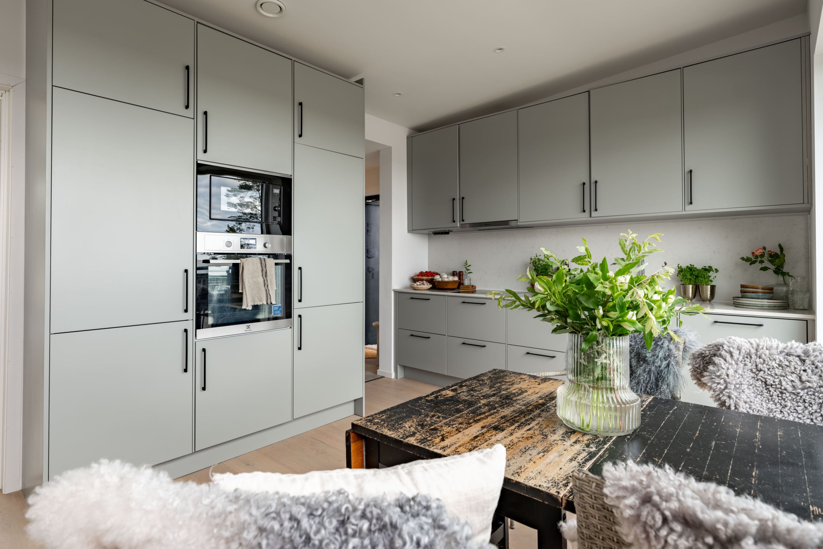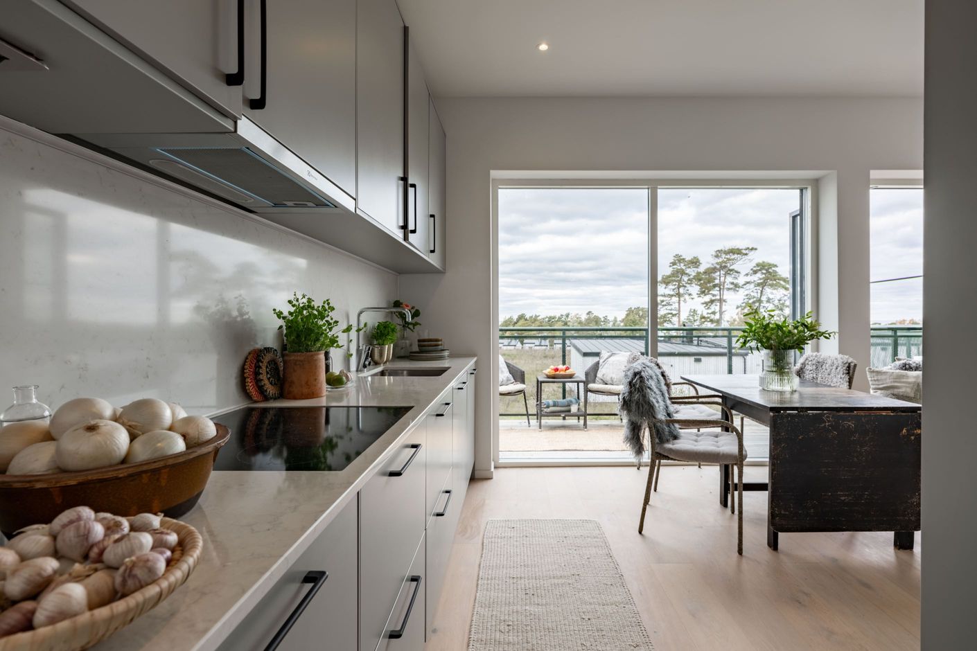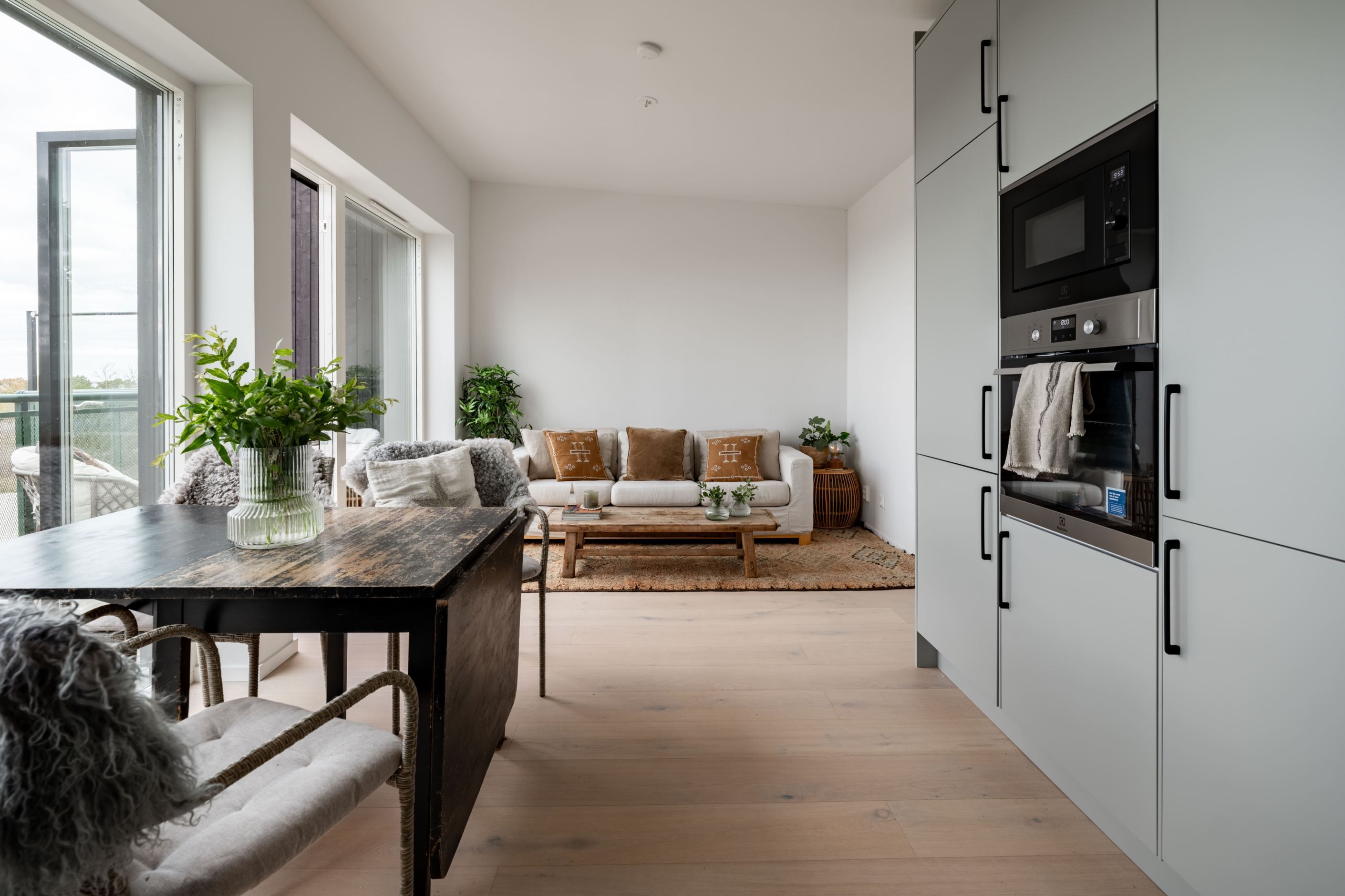 Bostaden om 40,5 kvadratmeter är byggd 2020–2021 och präglas av stilrena, hållbara materialval i en ljus och harmonisk färgskala. Redan i hallen möts du av smarta lösningar med förråd och ett helkaklat badrum med tvättmaskin. Sedan öppnar lägenheten upp sig mot havet, bokstavligen. Vardagsrum och kök samsas i öppen planlösning, med fönsterpartier från vägg till vägg och helglasad altandörr som suddar ut gränsen mellan ute och inne.