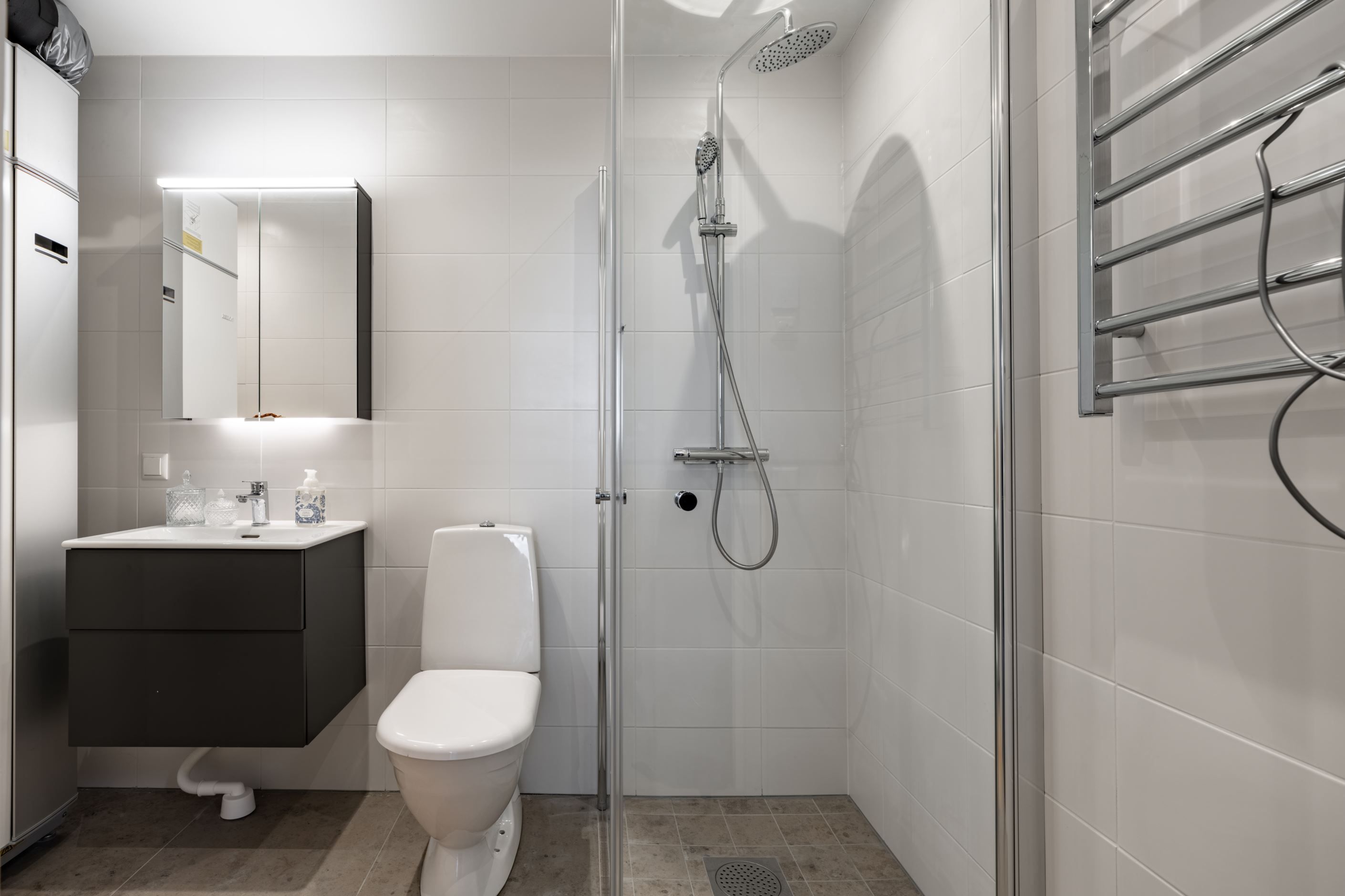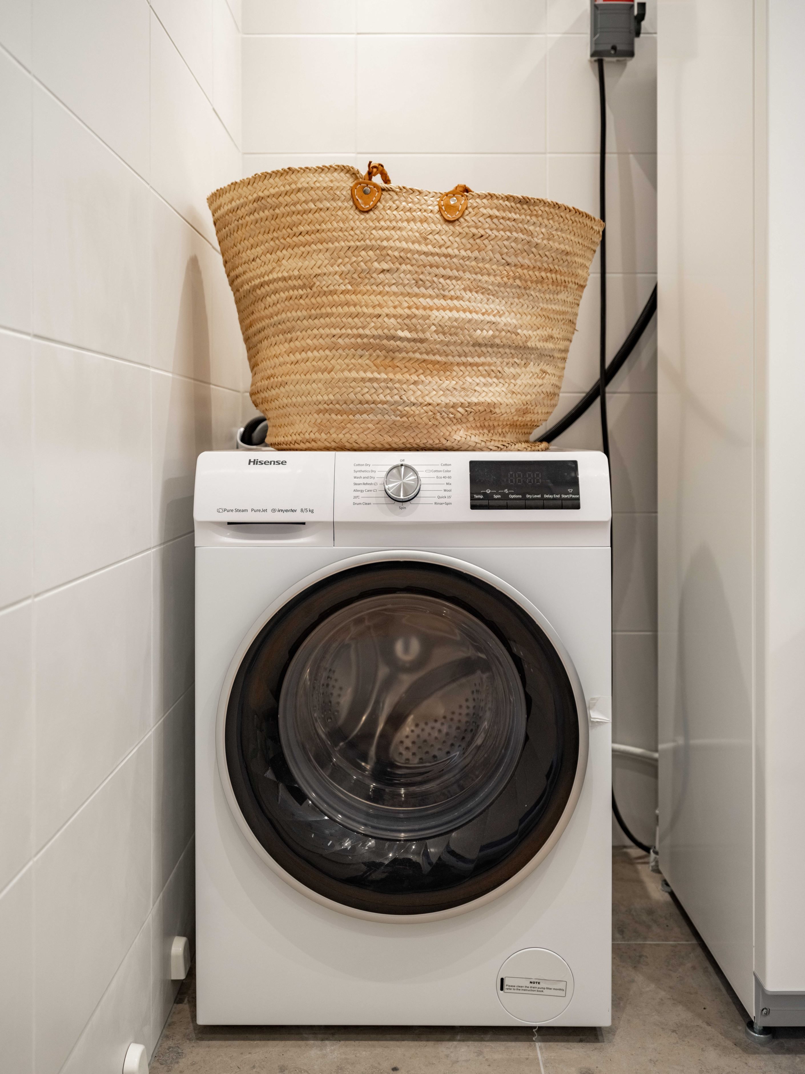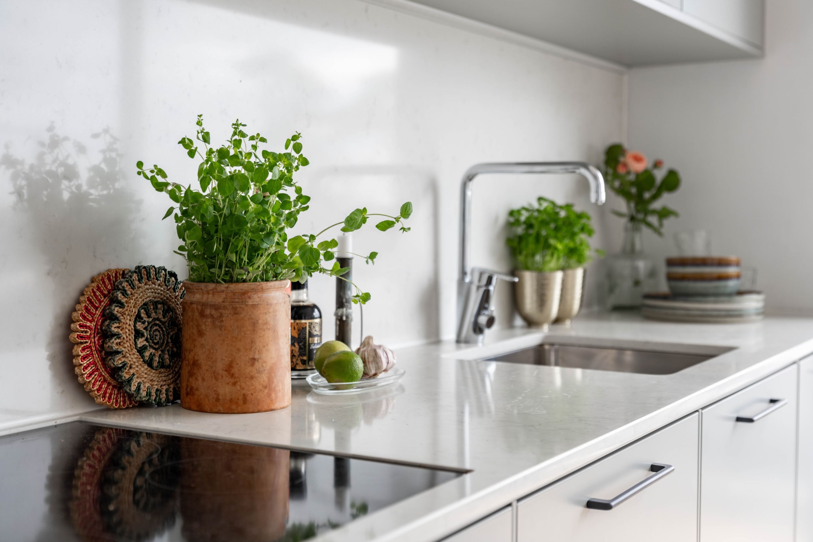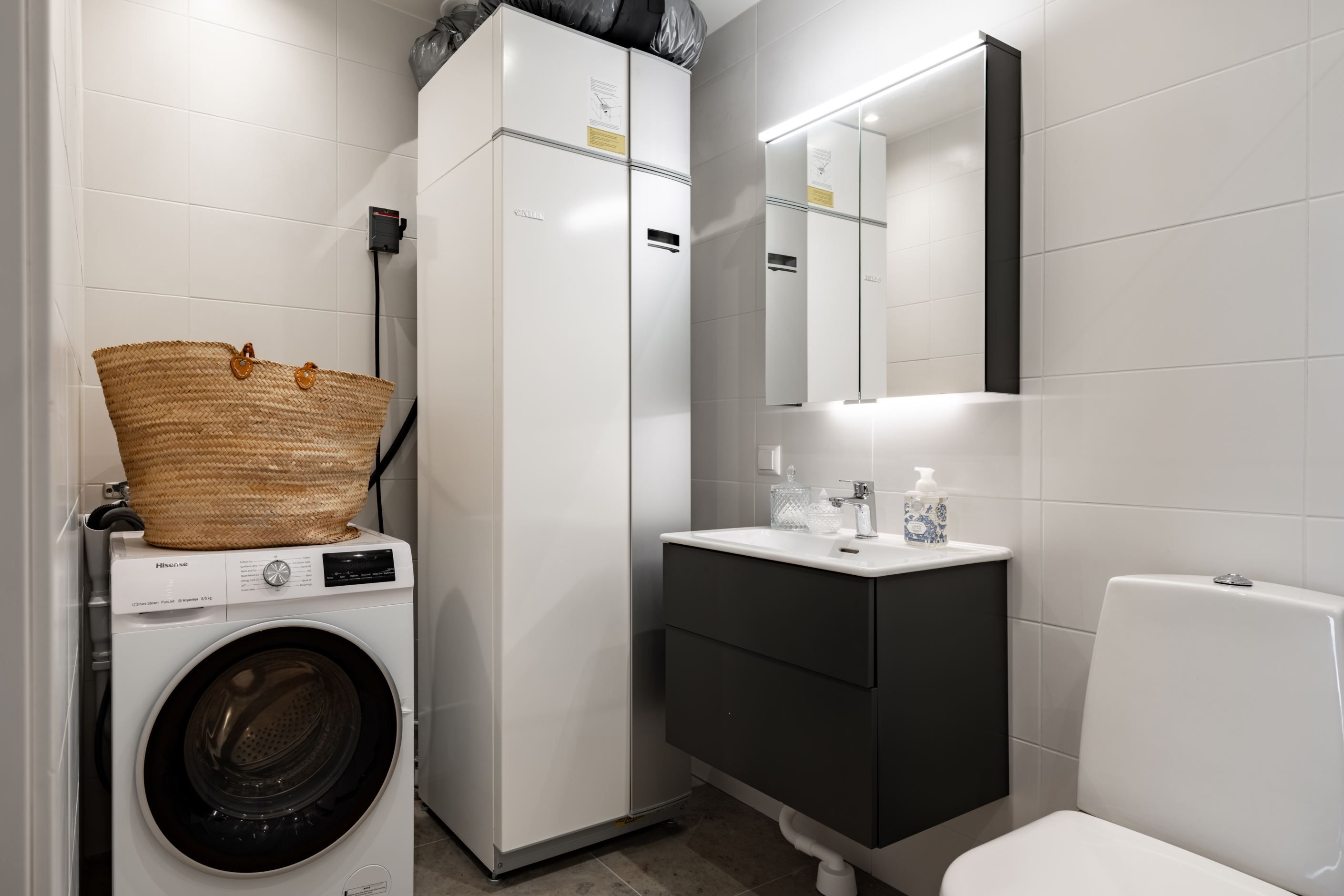Bostaden om 40,5 kvadratmeter är byggd 2020–2021 och präglas av stilrena, hållbara materialval i en ljus och harmonisk färgskala. Redan i hallen möts du av smarta lösningar med förråd och ett helkaklat badrum med tvättmaskin. Sedan öppnar lägenheten upp sig mot havet, bokstavligen. Vardagsrum och kök samsas i öppen planlösning, med fönsterpartier från vägg till vägg och helglasad altandörr som suddar ut gränsen mellan ute och inne.