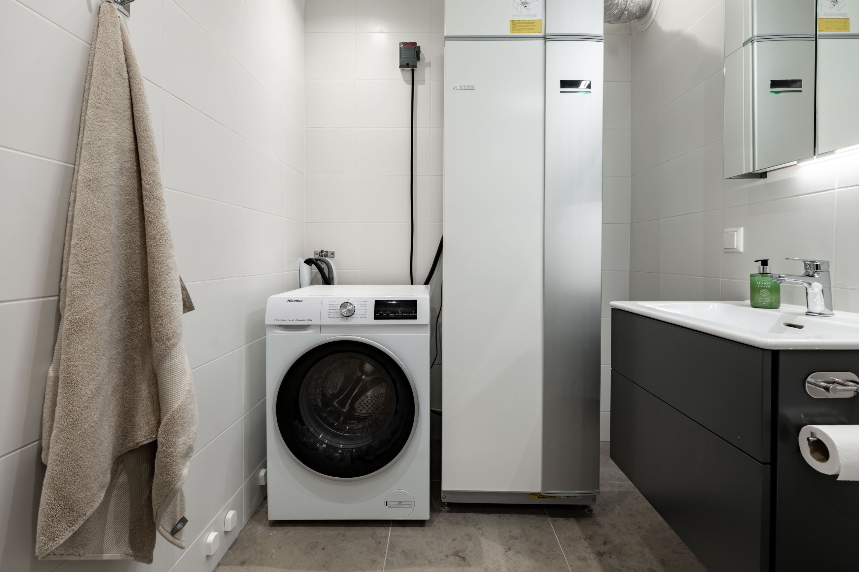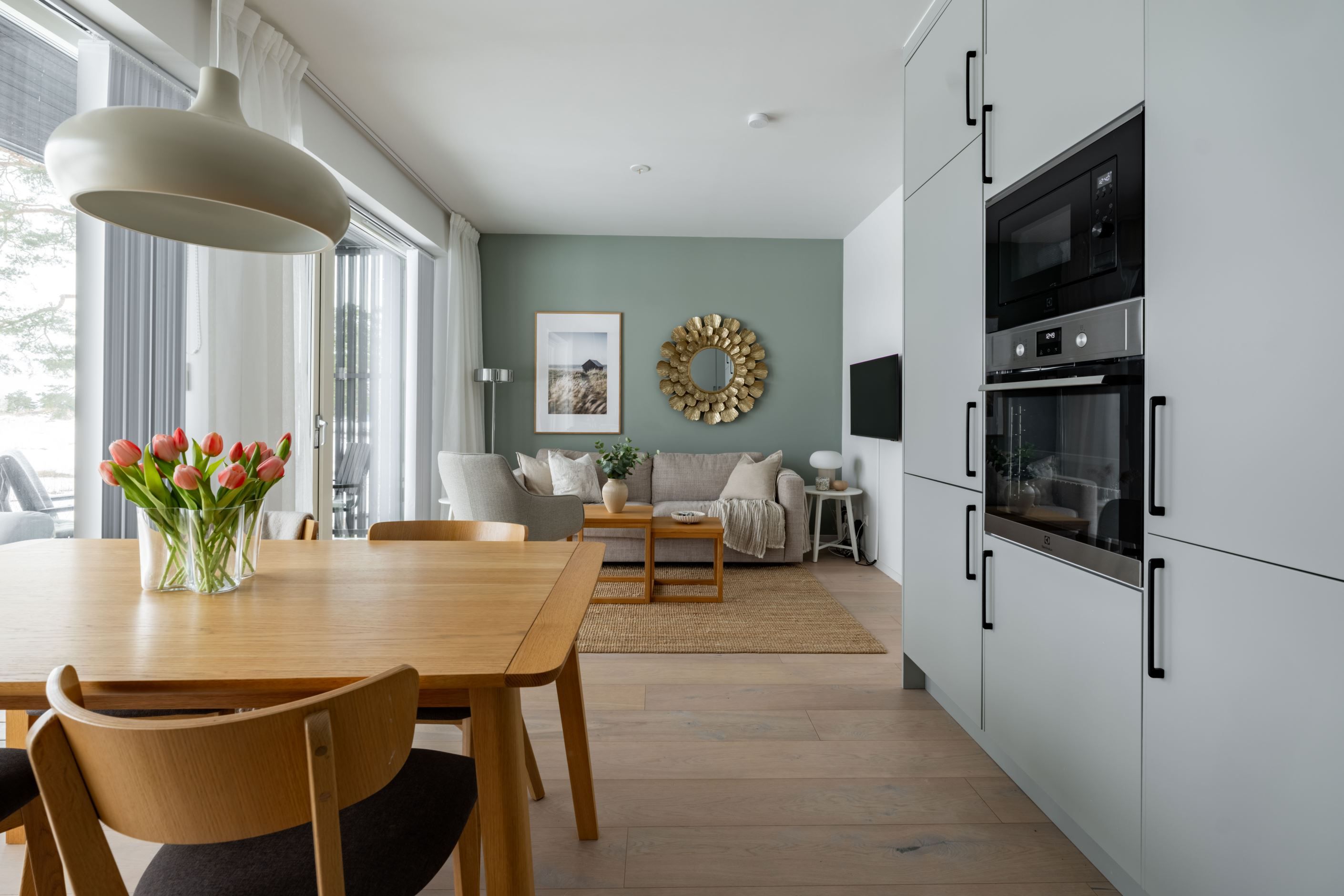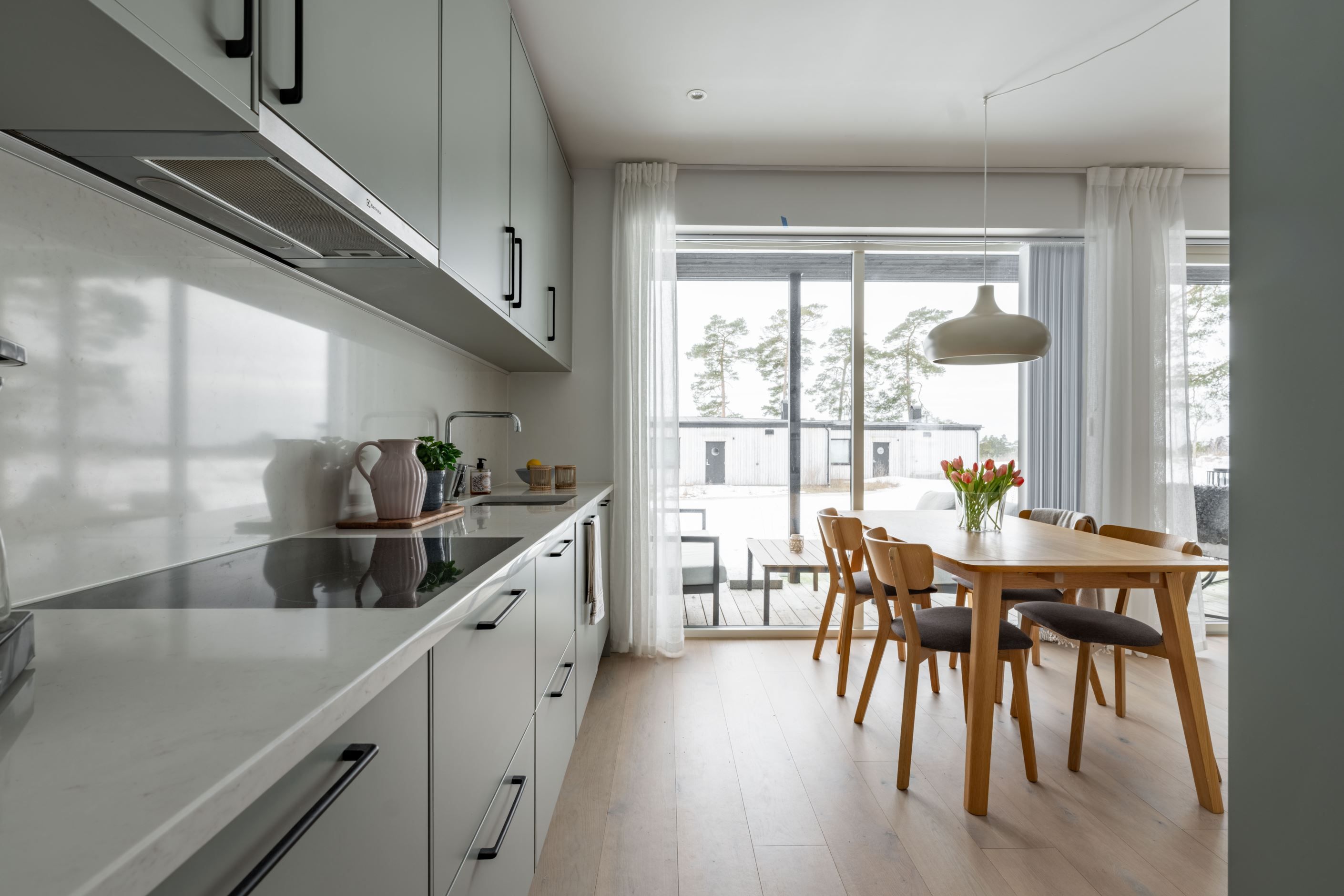Bostaden om 40,5 kvadratmeter är uppförd 2020–2021 och präglas av stilrena, hållbara materialval i en ljus och harmonisk färgskala. Redan i hallen möts du av smart förvaring och ett helkaklat badrum med tvättmaskin. Därefter öppnar bostaden upp sig – mot ljuset, havet och landskapet. Kök och vardagsrum ligger i öppen planlösning med generösa fönsterpartier från vägg till vägg och en helglasad altandörr som suddar ut gränsen mellan inne och ute.