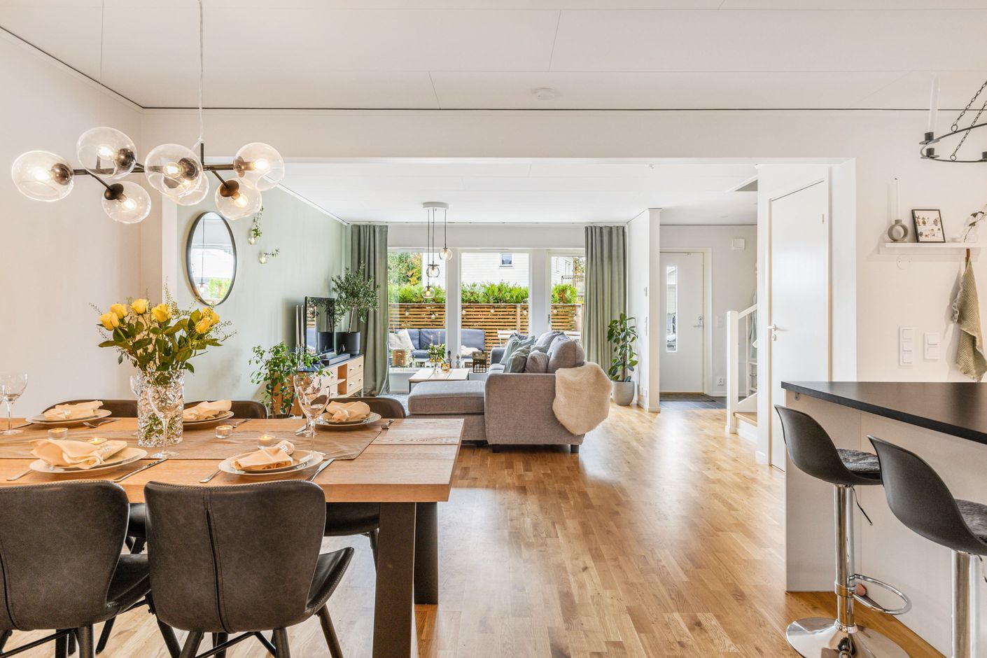 Modernt och välplanerat radhus med ljusa, öppna ytor där kök, matplats och vardagsrum flyter samman till en social helhet. Vardagsrummet har en harmonisk grön ton som ger en stillsam och behaglig karaktär. Den praktiska köksön fungerar som en naturlig samlingspunkt – perfekt för vardagens samtal, snabba frukostar och gemensam matlagning. Från denna del av huset nås uteplatsen i söderläge, en plats för morgonkaffe, middagar och lugna stunder utomhus. Bostaden har dessutom energiklass B, vilket uppfyller kriterierna för grönt bolån.