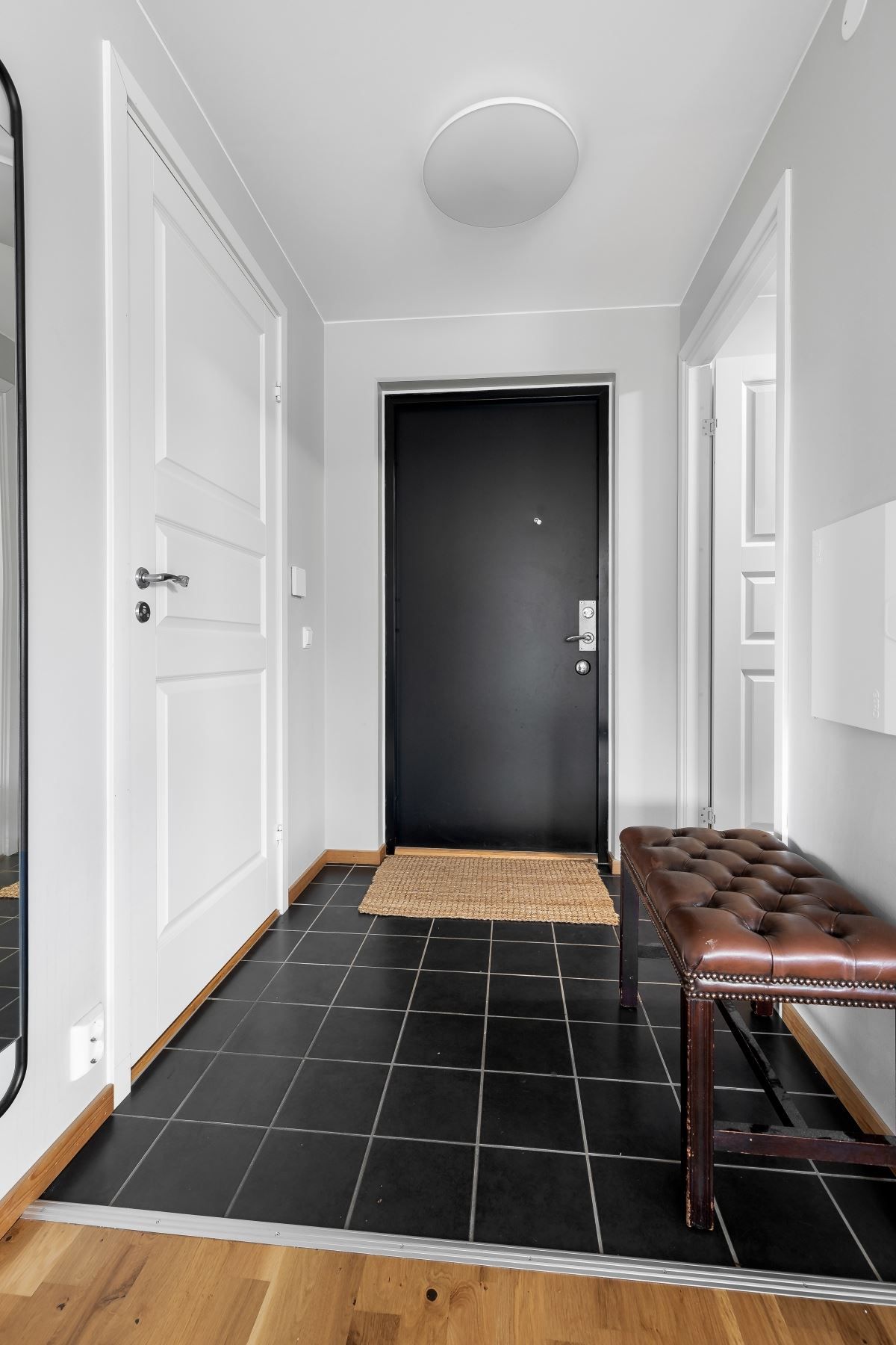Hallen är försedd med ett stilrent, mörkt stengolv och en rymlig klädkammare.
