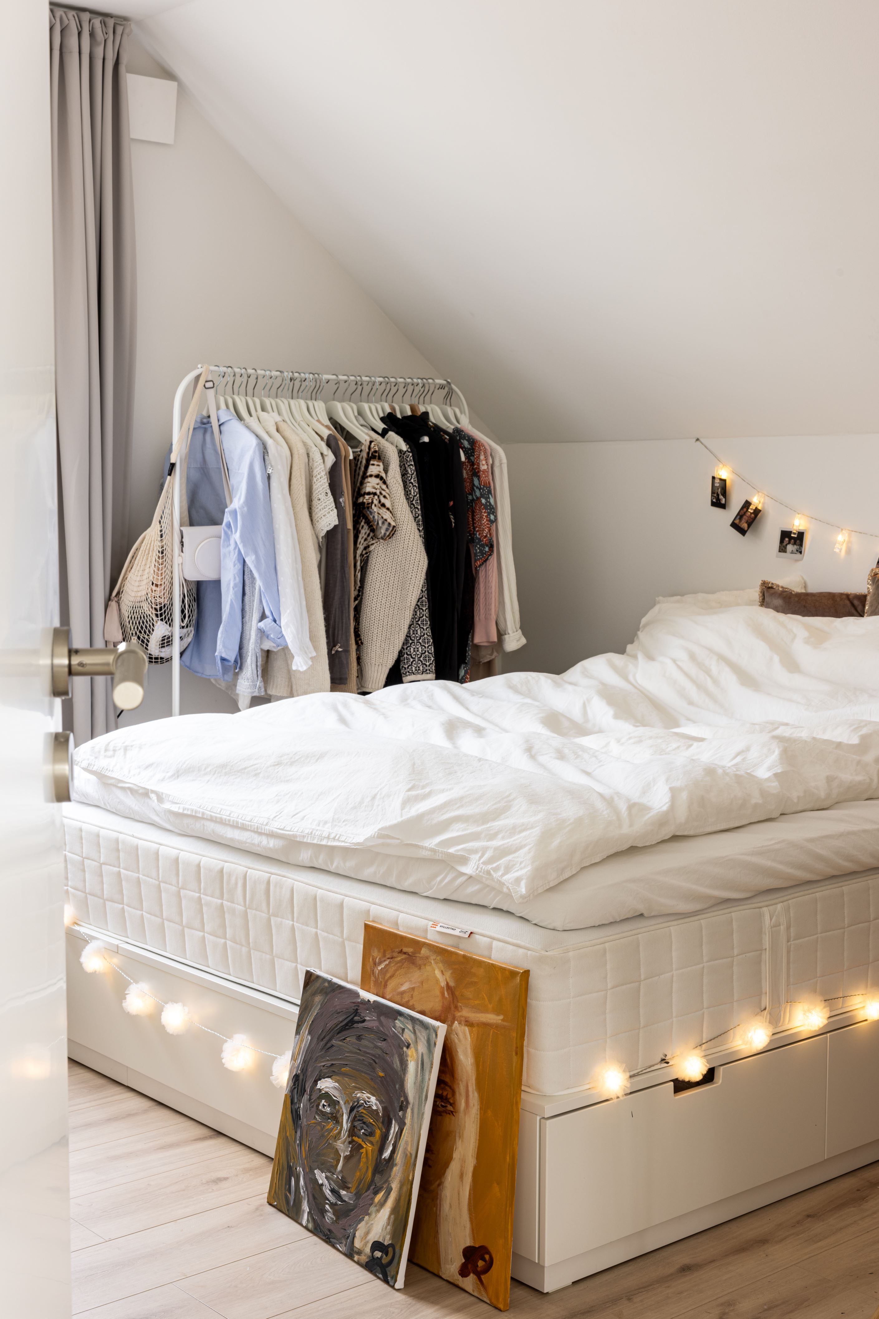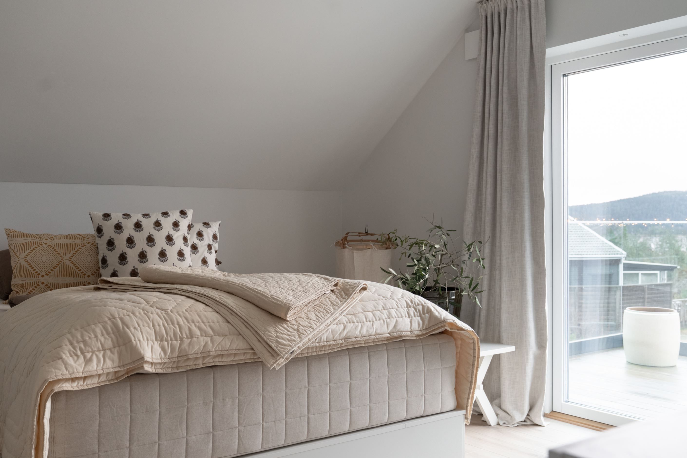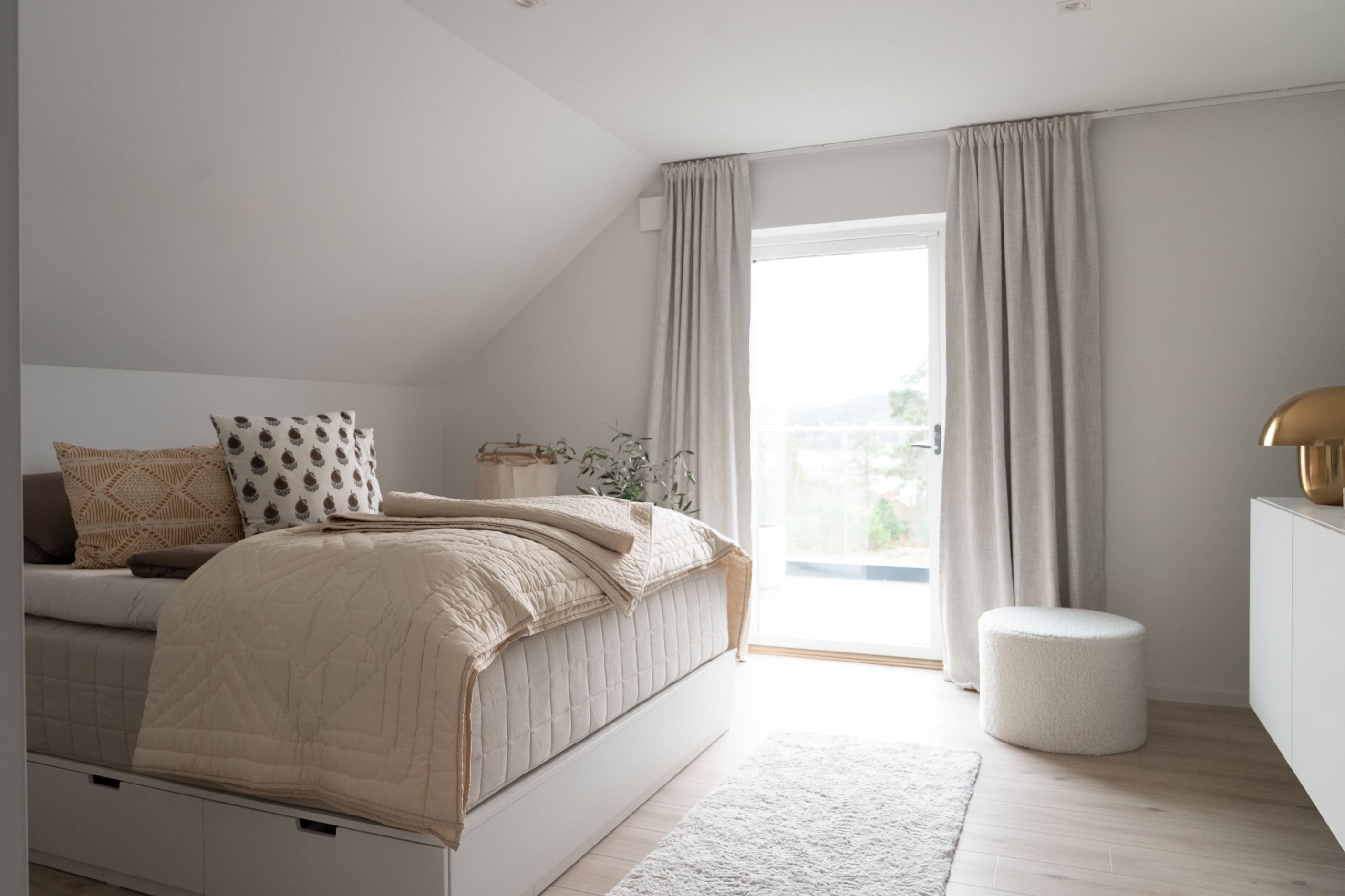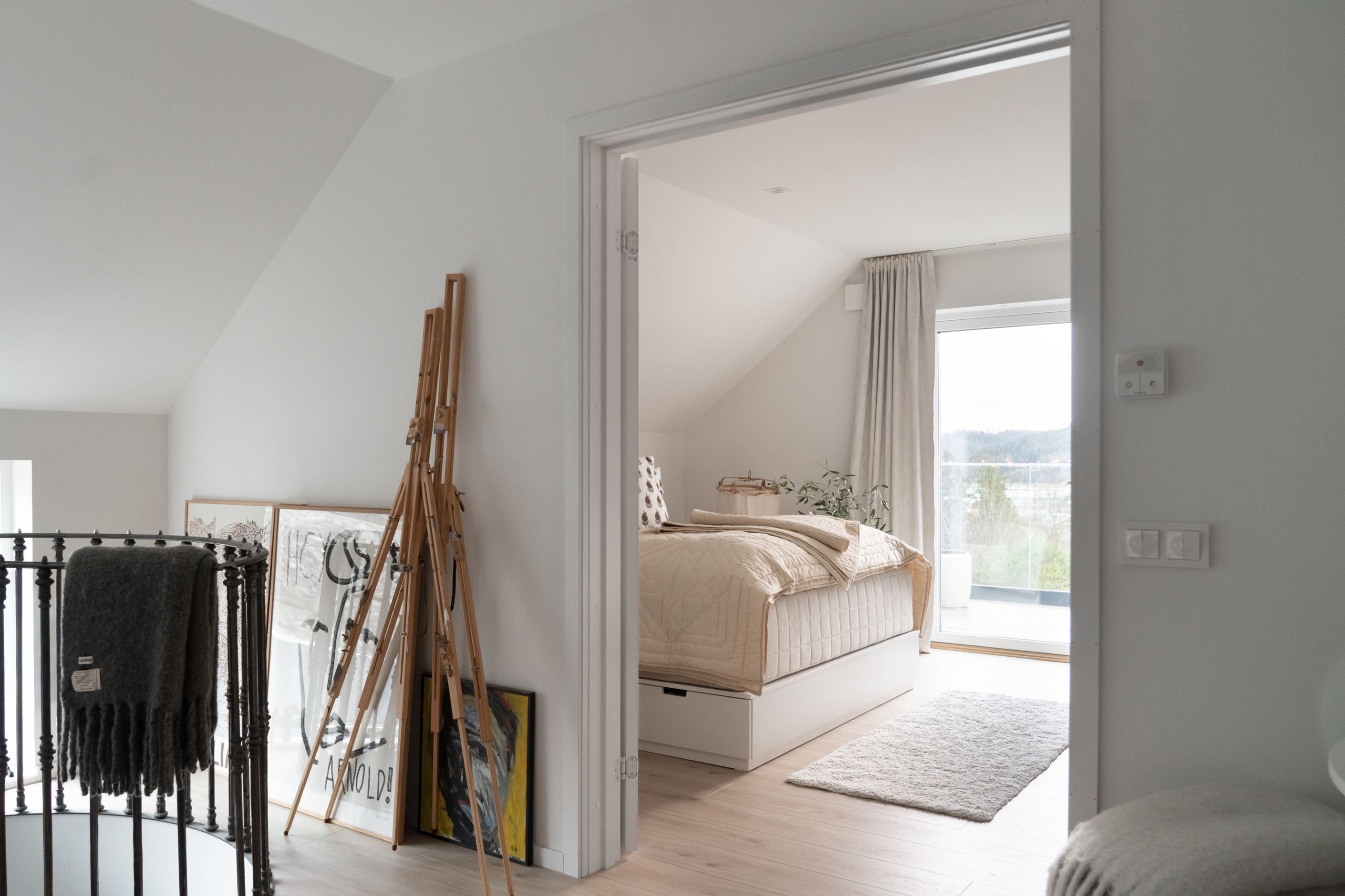 En trappa upp väntar den mer privata delen av huset. Här återfinns tre sovrum, varav ett rymligt master bedroom med en lyxigt tilltagen walk-in closet. Från övervåningen nås även balkongen som ytterligare förstärker känslan av rymd och kontakt med naturen utanför.