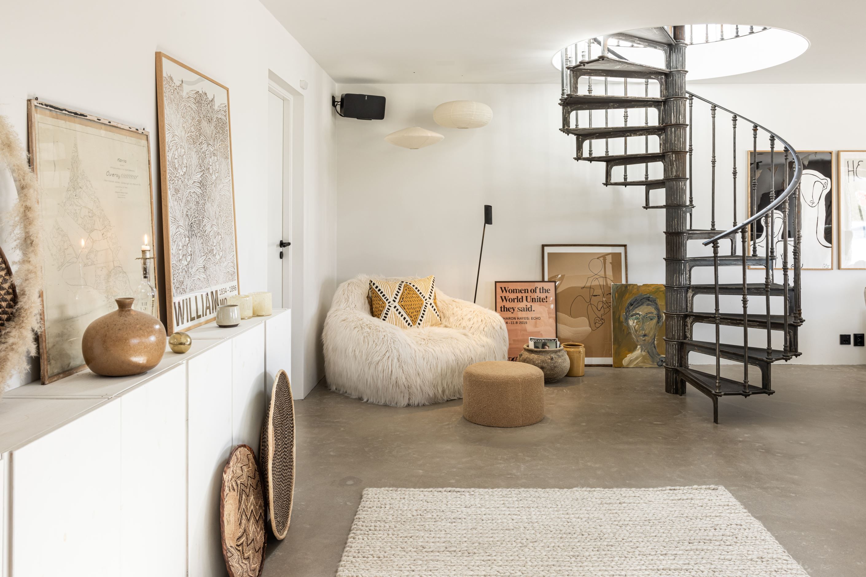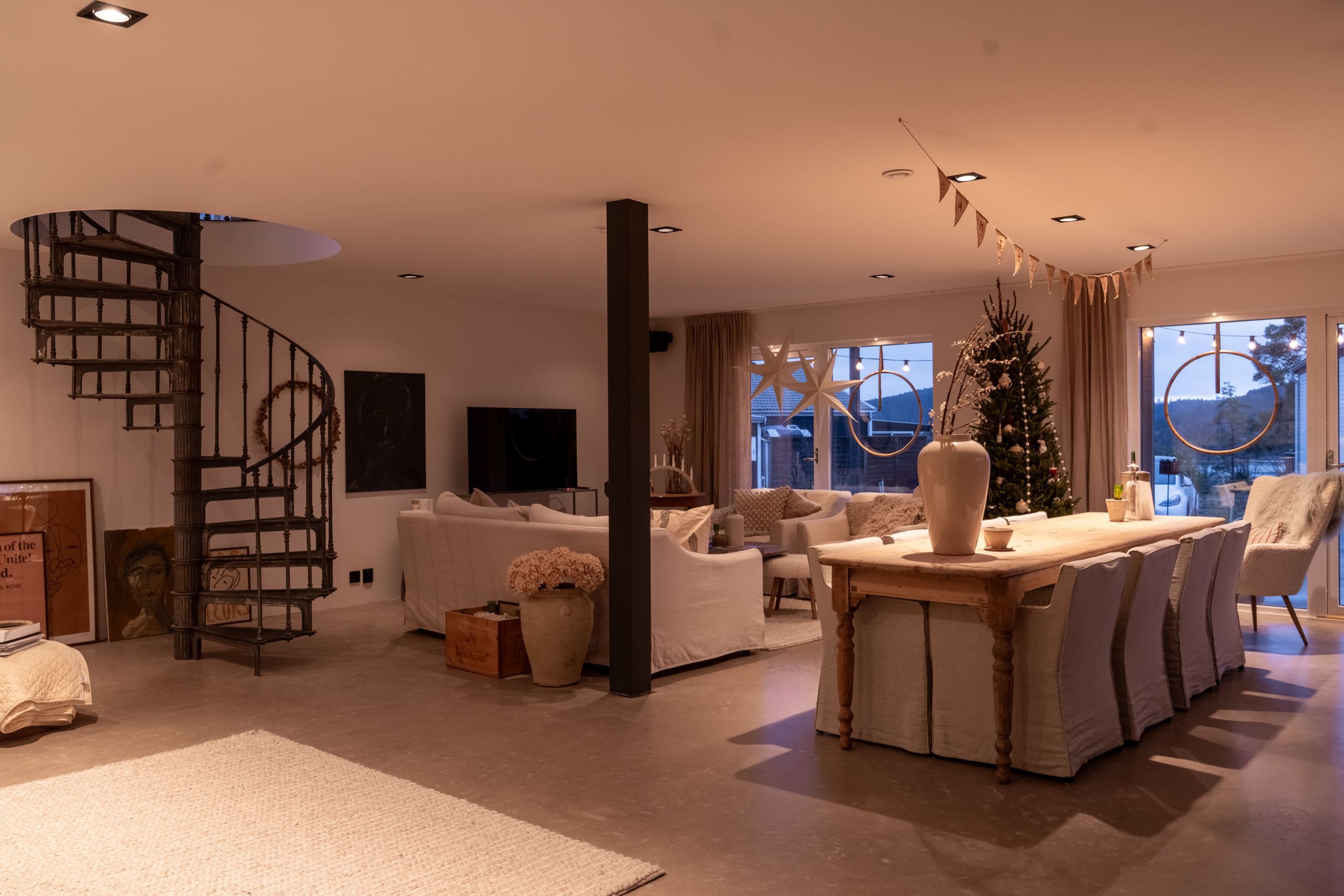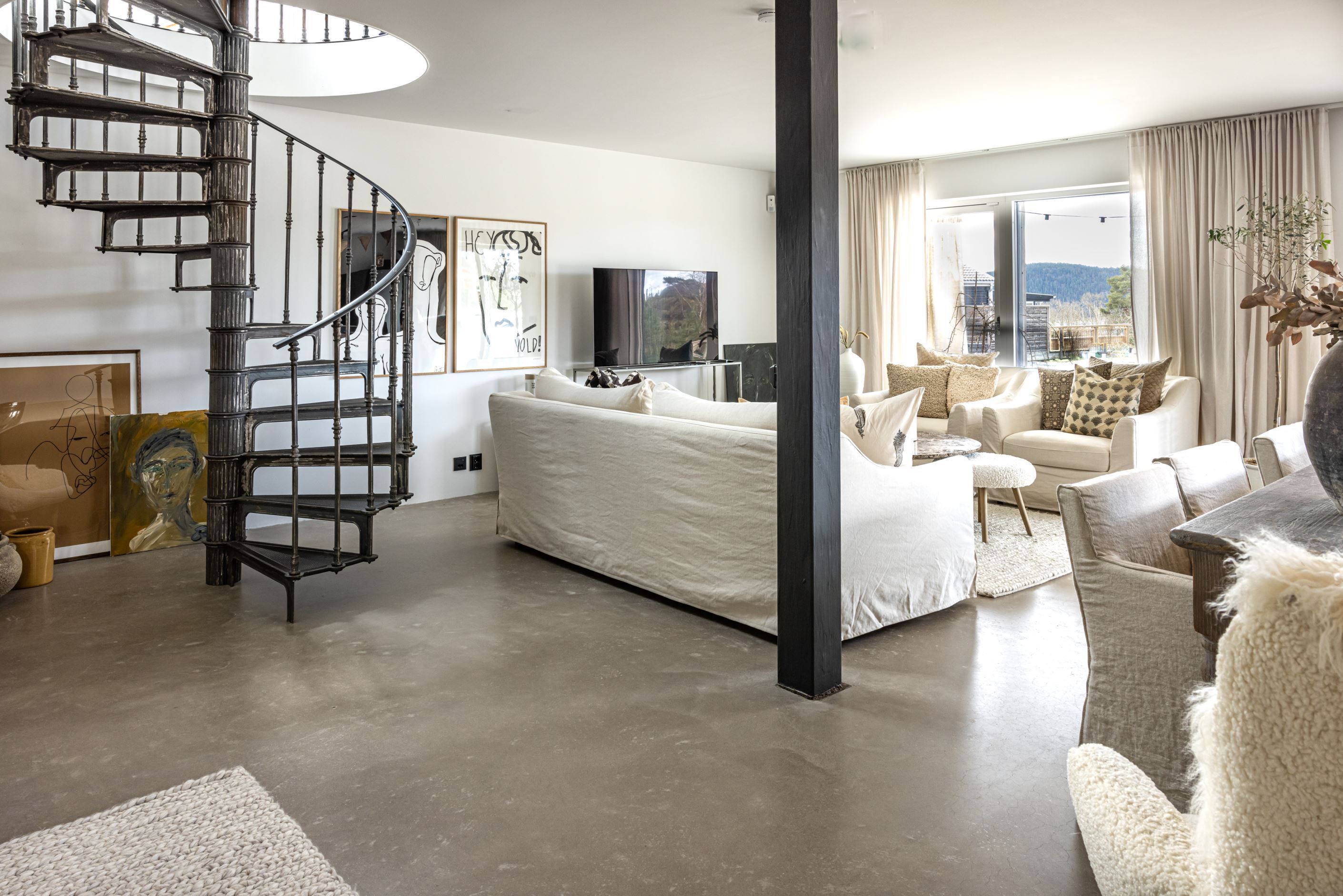 Vardagsrummet binds samman med matplatsen på ett naturligt sätt och bjuder in till både umgänge och avkoppling. Här tar den exklusiva spiraltrappan plats som ett självklart blickfång – specialbeställd från Frankrike och utförd i gedigen metall. Med sitt tidlösa formspråk fungerar den lika mycket som ett konstverk som en elegant förbindelse mellan våningsplanen och förstärker bostadens arkitektoniska uttryck.