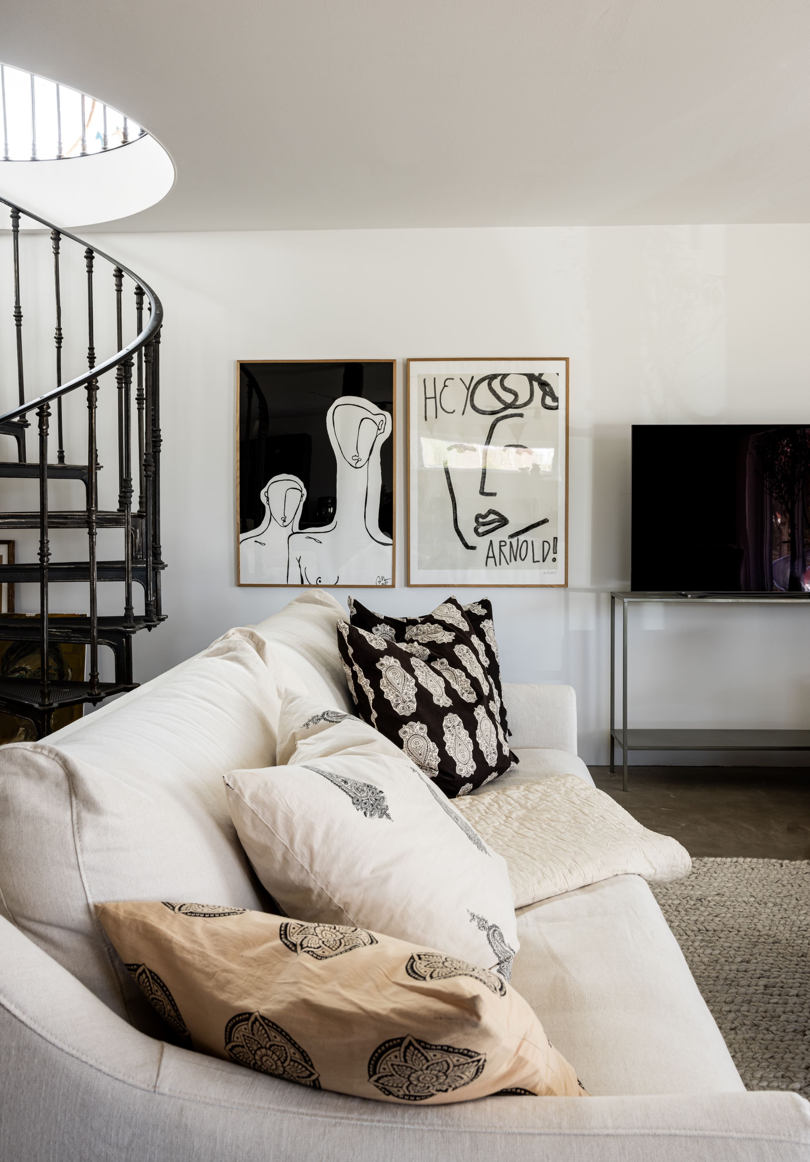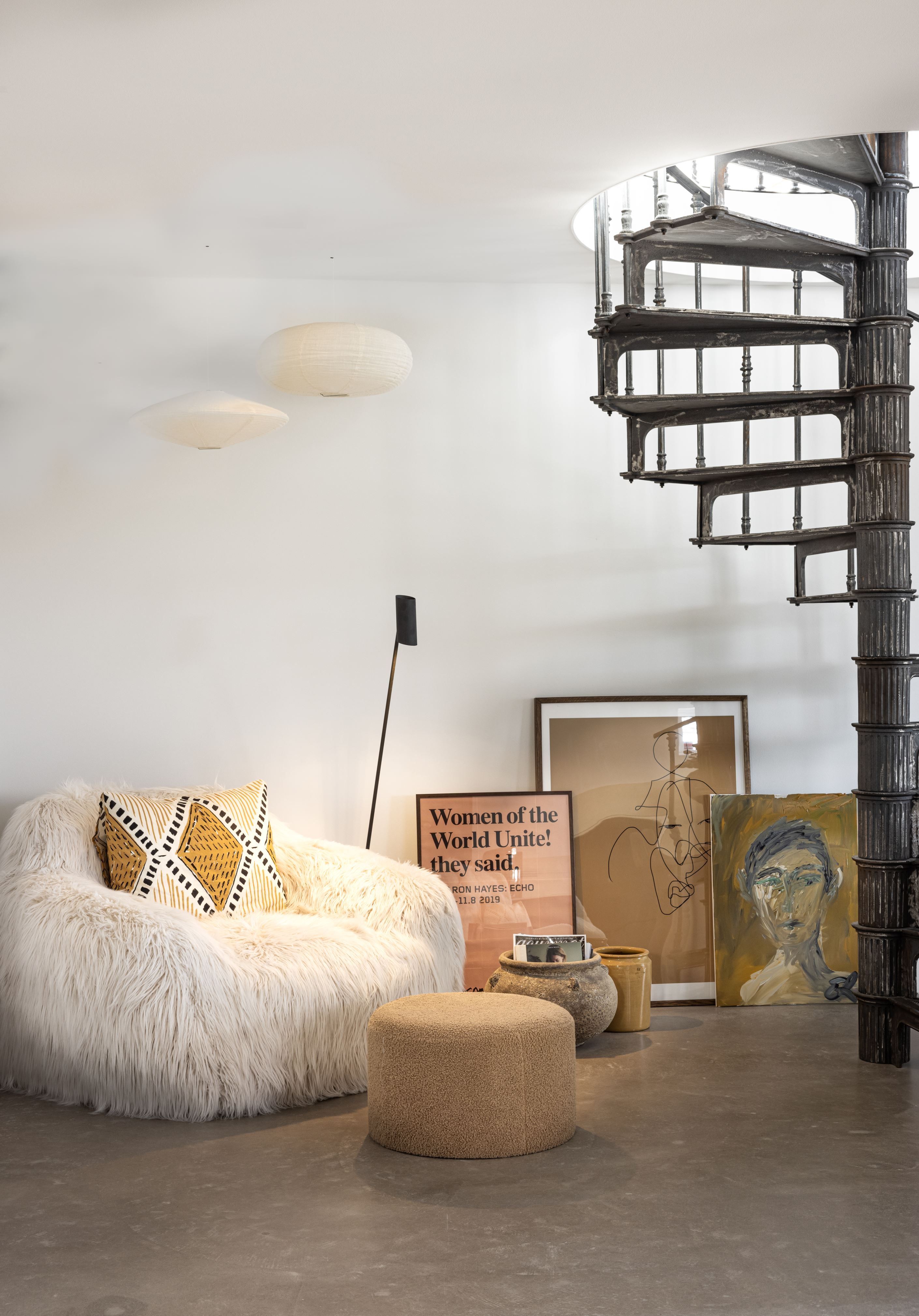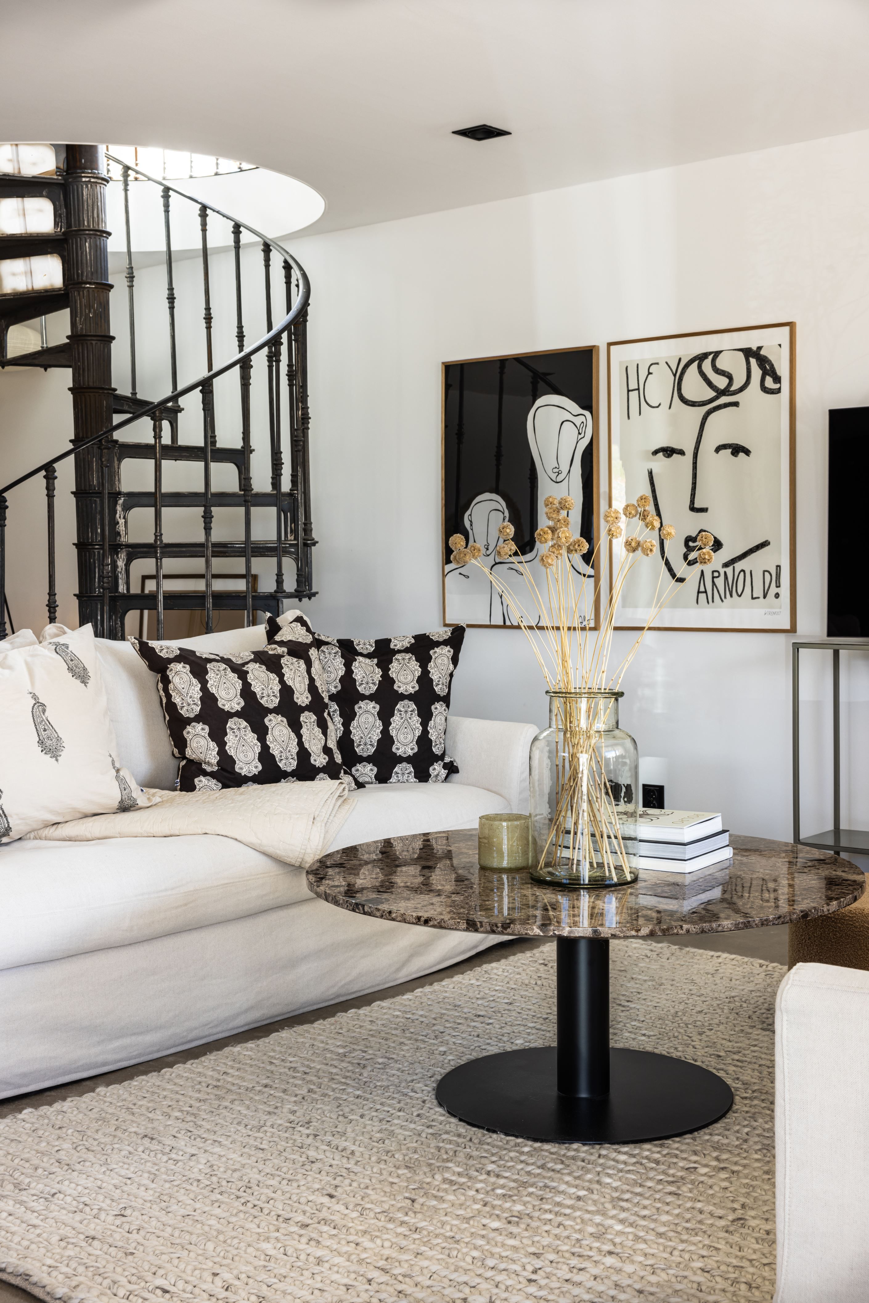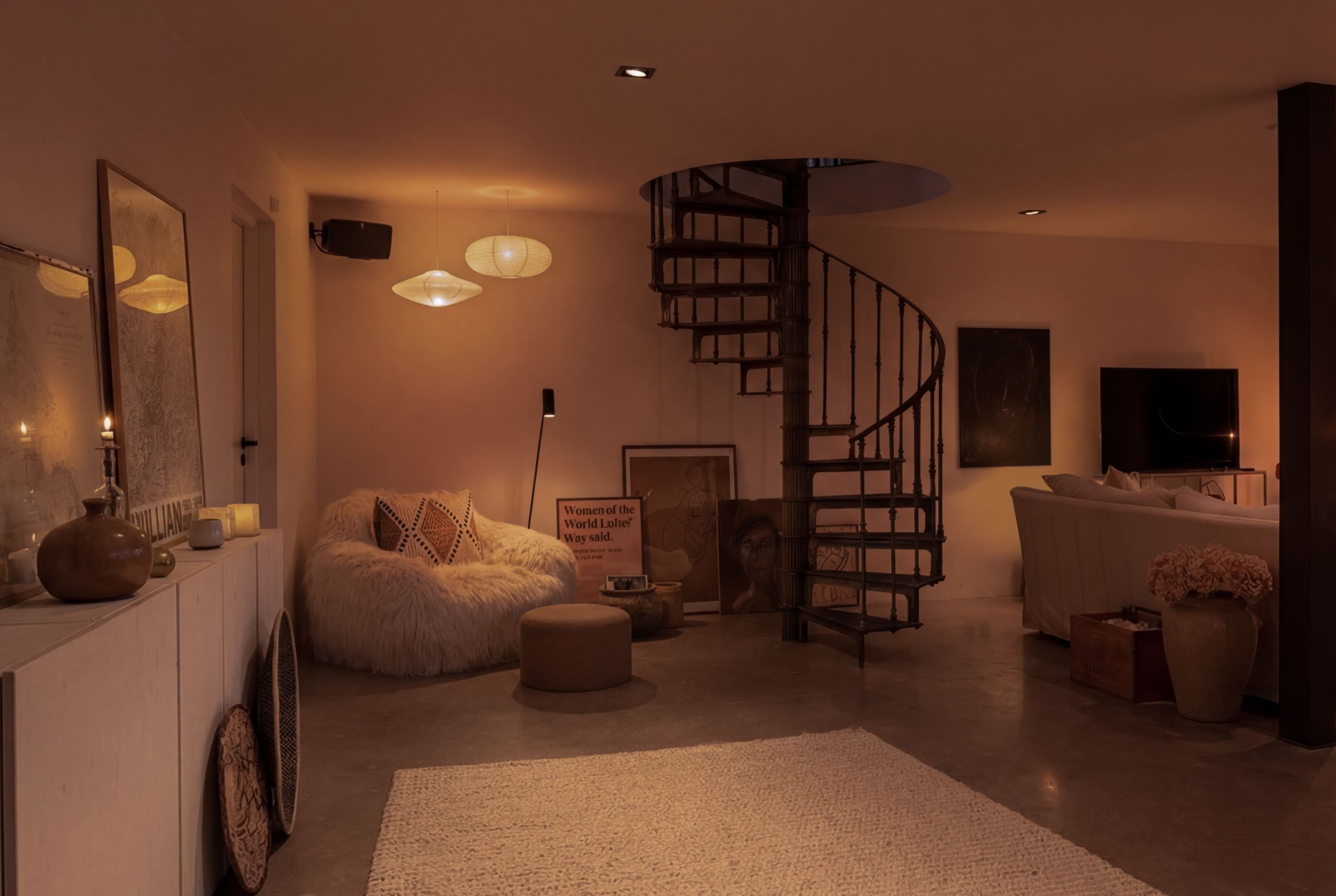 Vardagsrummet binds samman med matplatsen på ett naturligt sätt och bjuder in till både umgänge och avkoppling. Här tar den exklusiva spiraltrappan plats som ett självklart blickfång – specialbeställd från Frankrike och utförd i gedigen metall. Med sitt tidlösa formspråk fungerar den lika mycket som ett konstverk som en elegant förbindelse mellan våningsplanen och förstärker bostadens arkitektoniska uttryck.