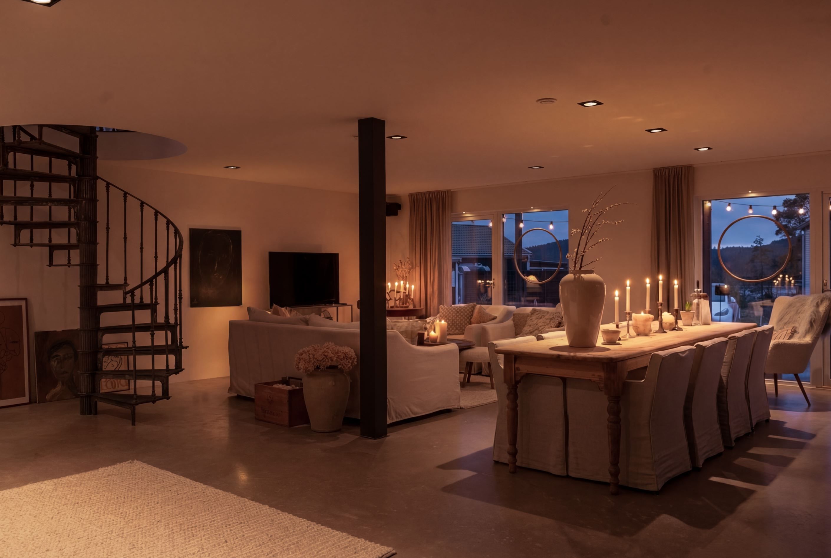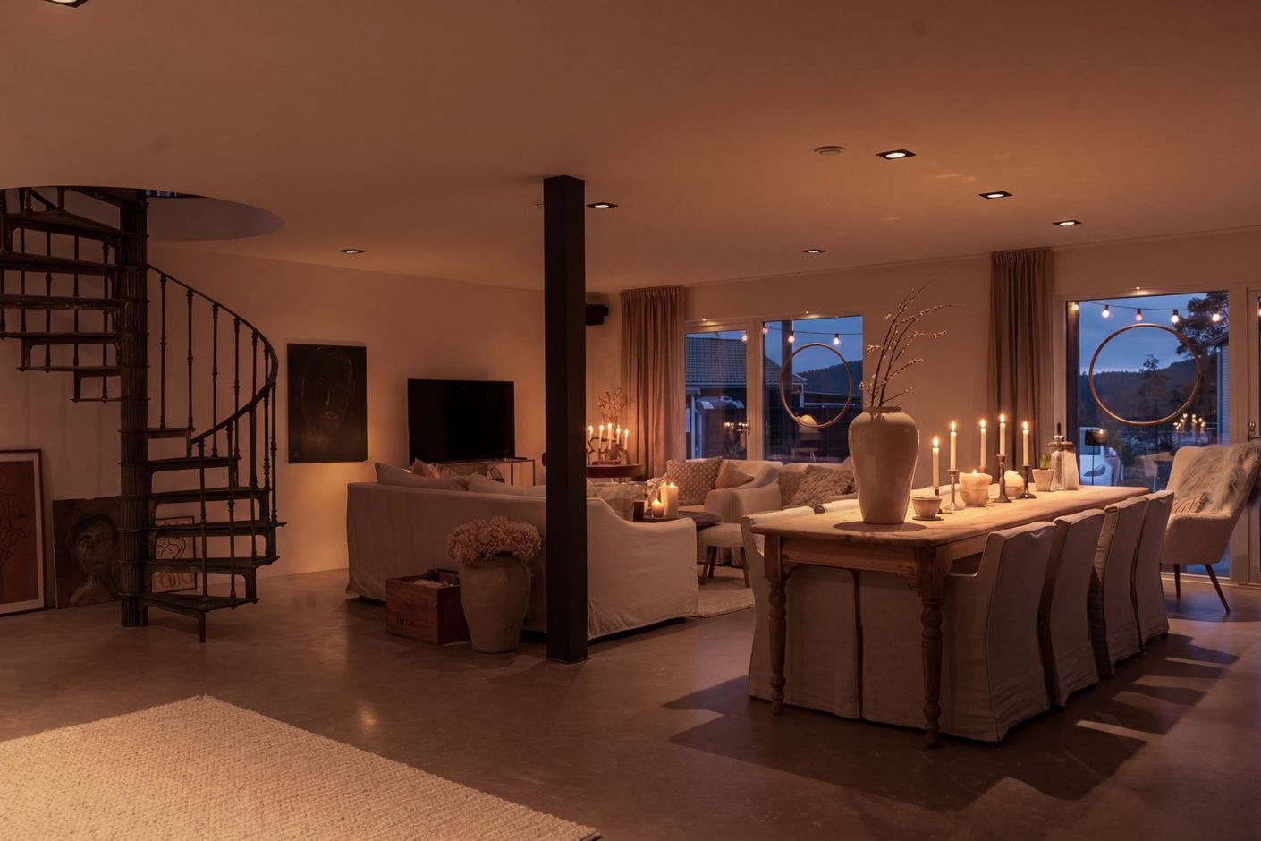 Bostaden är utrustad med Plejd – ett svenskt system för smart styrning av belysning och el. Ljussättningen är genomtänkt med infällda spotlights som förstärker rummens form och skapar en varm och behaglig atmosfär. Via Plejd kan belysningen enkelt styras via app, strömbrytare och scheman, vilket ger hög komfort och flexibilitet i vardagen.