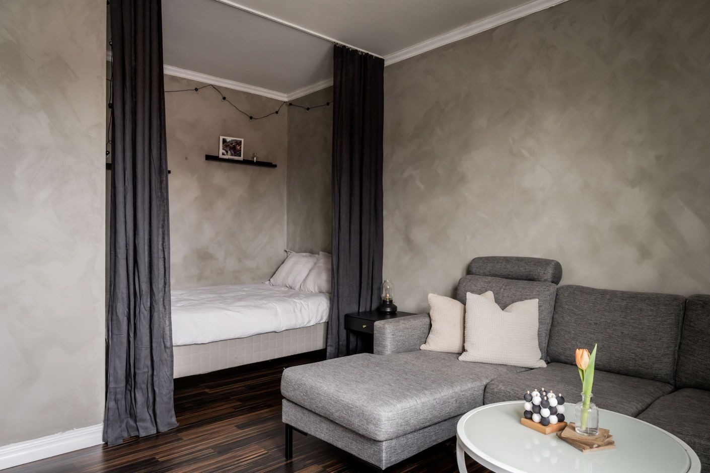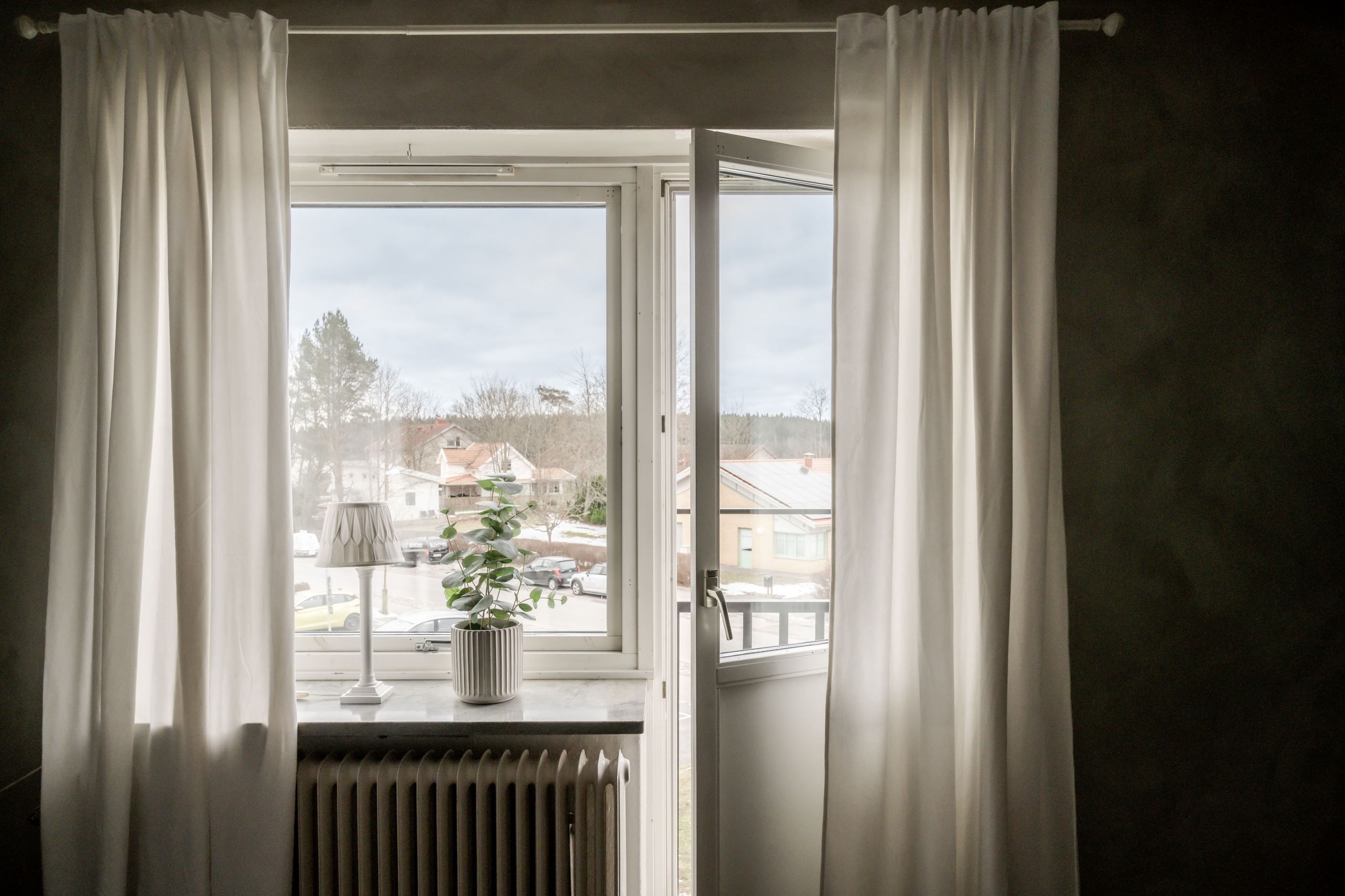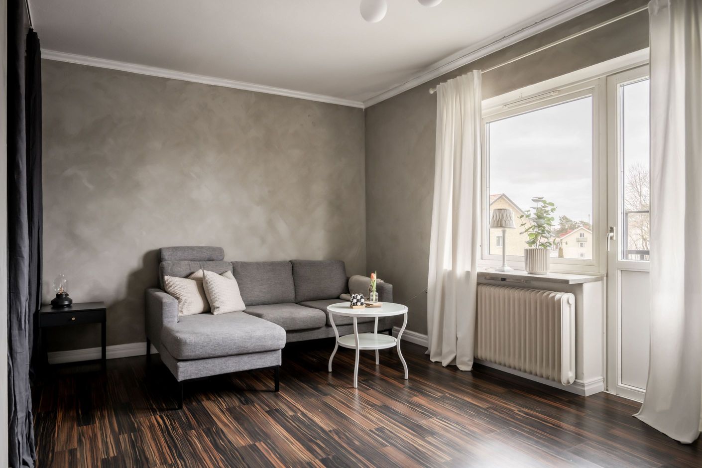 Vardagsrummet är lättmöblerat och rymmer både soffgrupp och tv-möbel, medan sängen har sin naturliga plats i den mysiga alkoven som skapar en tydlig men ombonad sovdel. När solen står som högst är det bara att öppna upp dörren till den franska balkongen i rakt söderläge – här flödar ljuset in större delen av dagen. Utsikten vetter mot kvarteret och den gröna gräsmattan precis utanför, vilket ger ett öppet och trivsamt intryck.