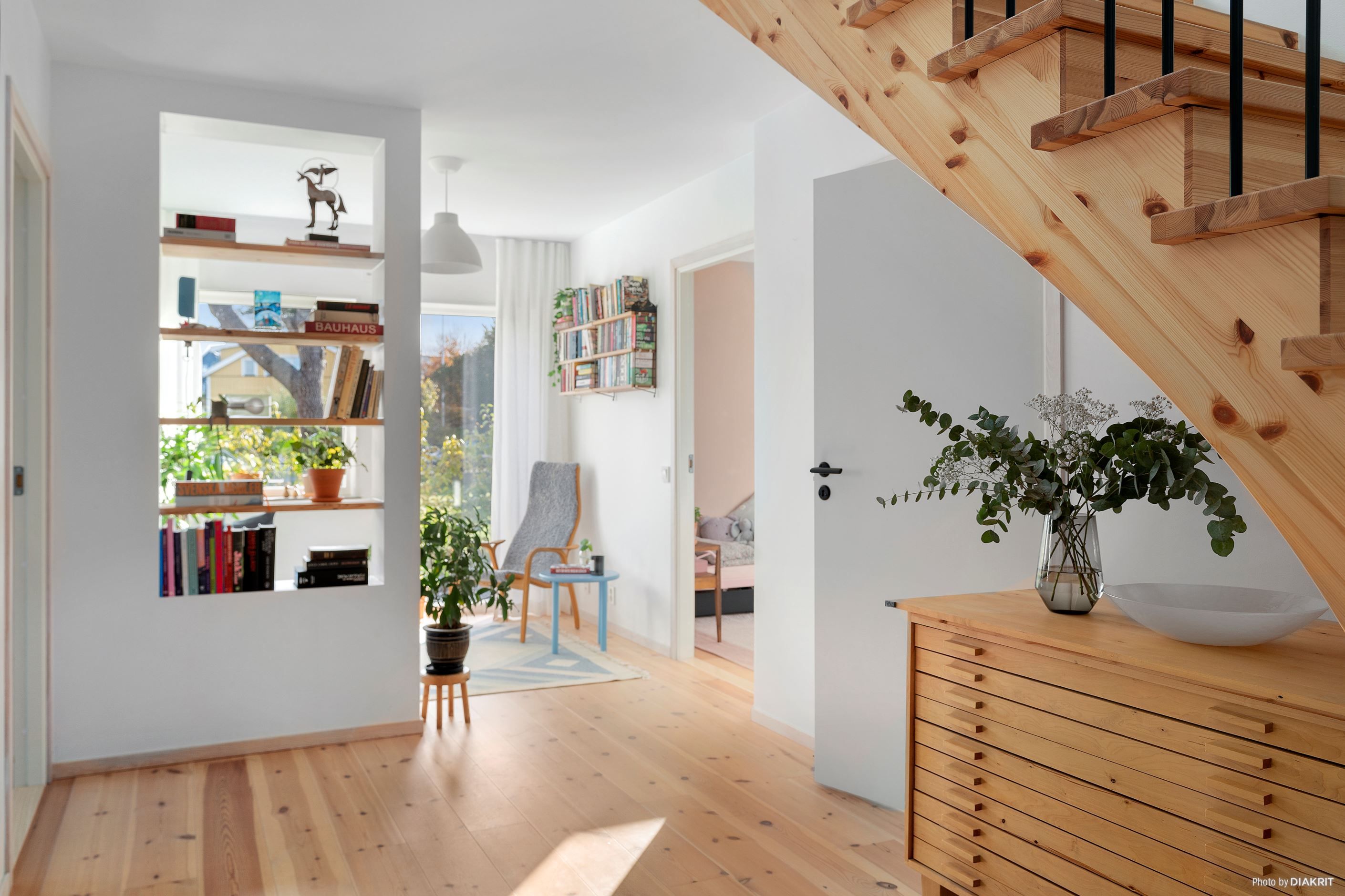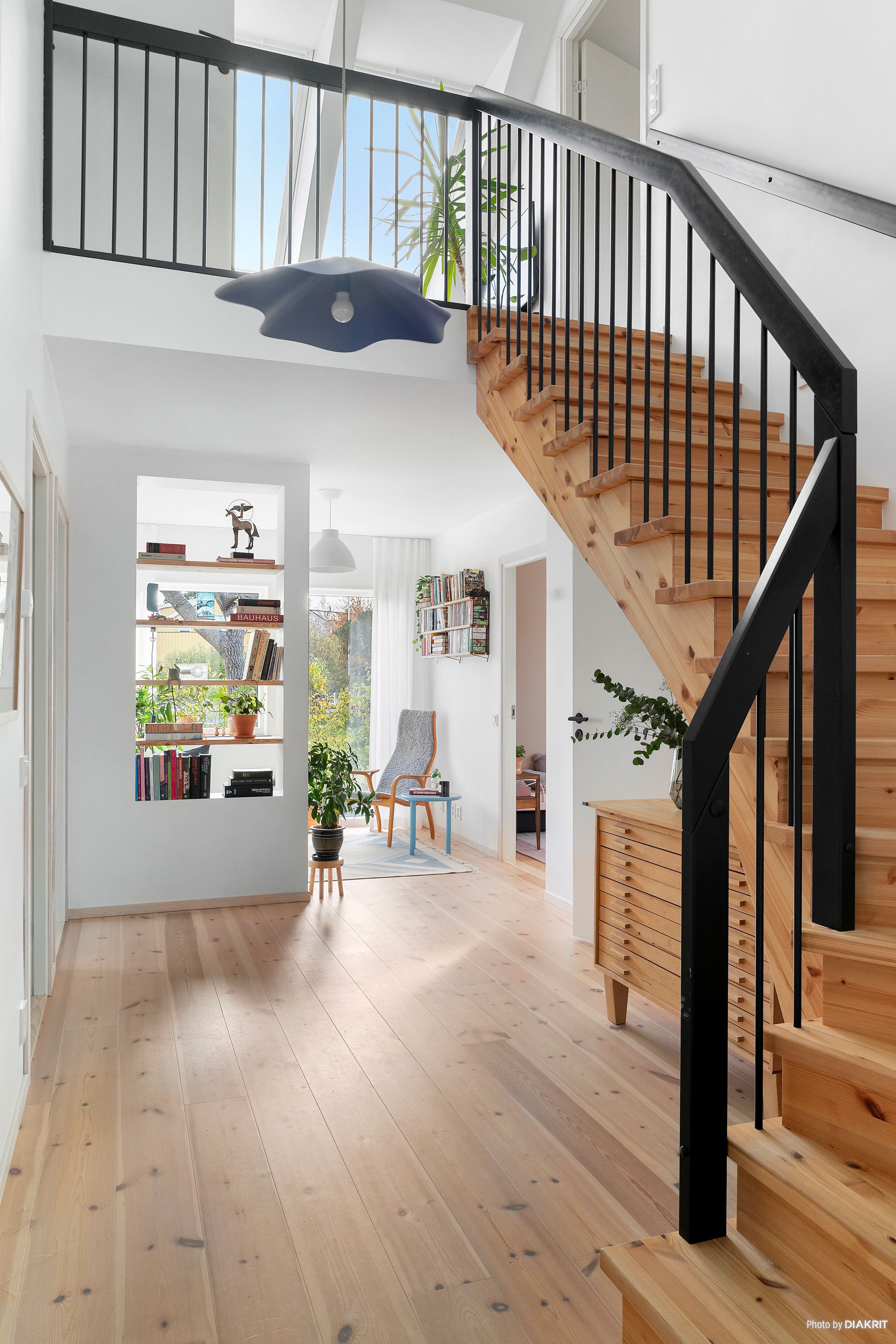 Entréplanet bjuder på en imponerande social yta med ett ljust och luftigt kök som utgör hemmets hjärta. I anslutning ligger vardagsrummet med stora fönsterpartier som släpper in rikligt med ljus och öppnar upp mot uteplatsen – perfekt för umgänge och middagar i kvällssolen.
