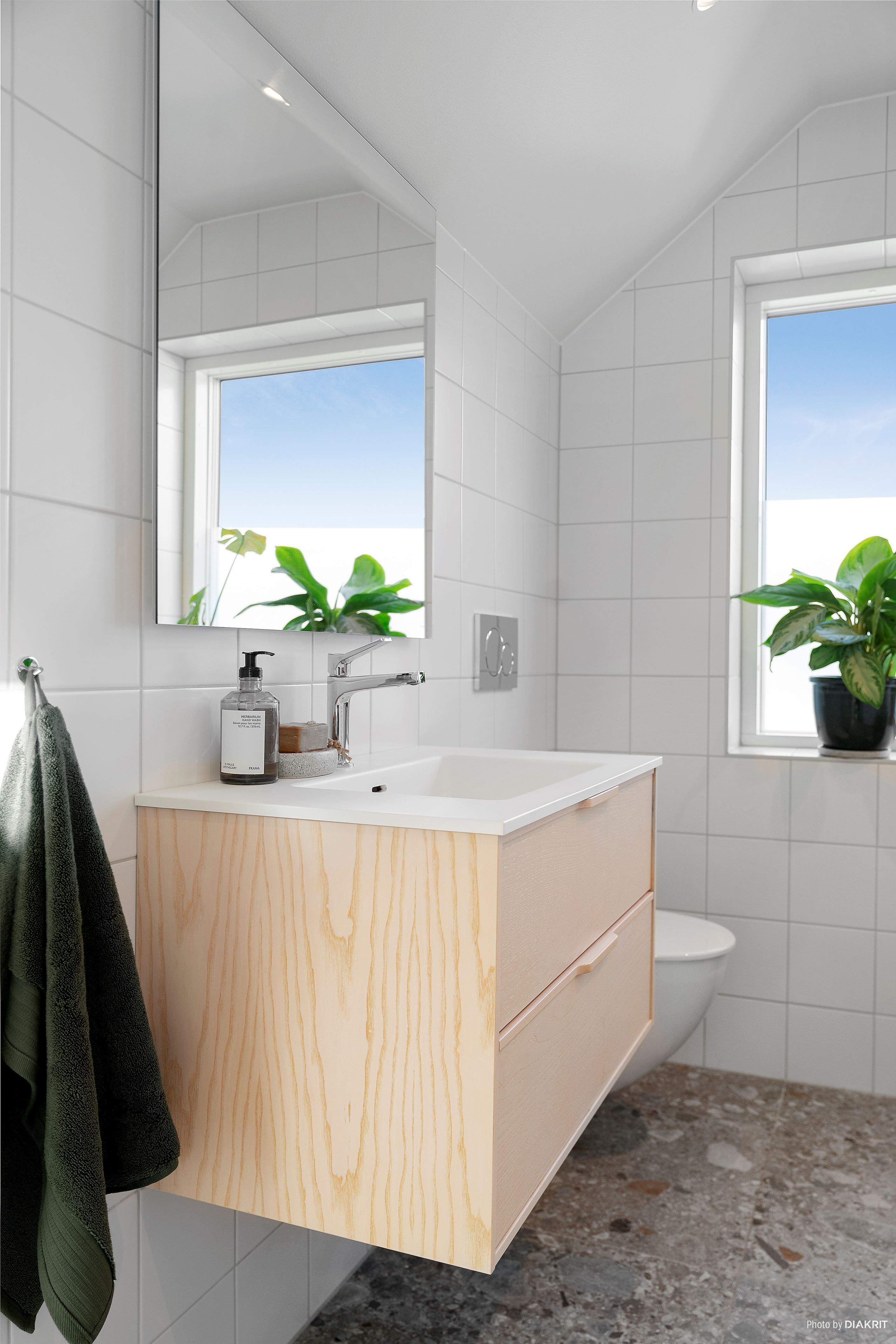 Övre plan erbjuder ett luftigt allrum med takfönster samt ett sovrum och badrum – en perfekt plats för avkoppling eller som extra utrymme för gäster.