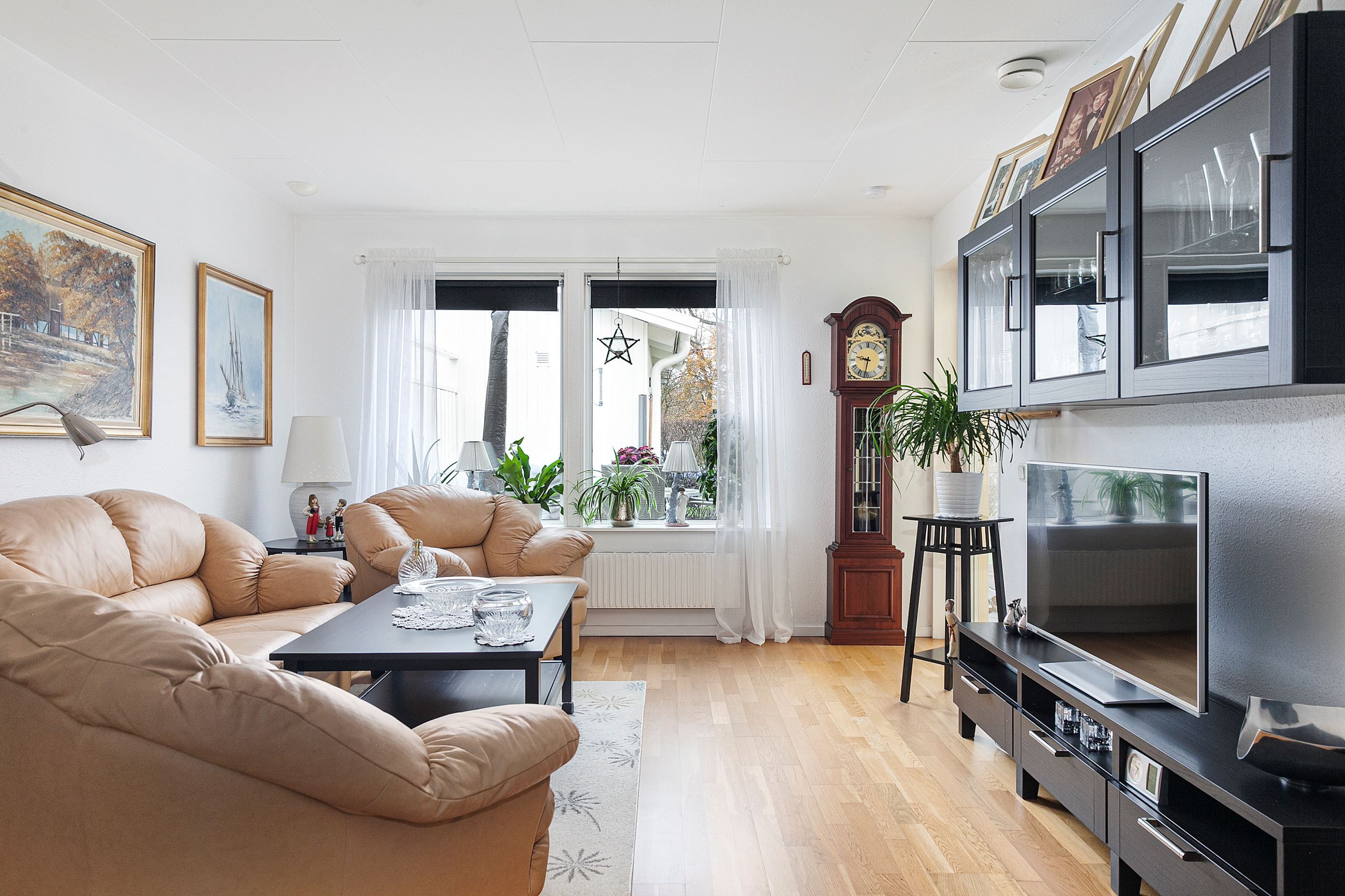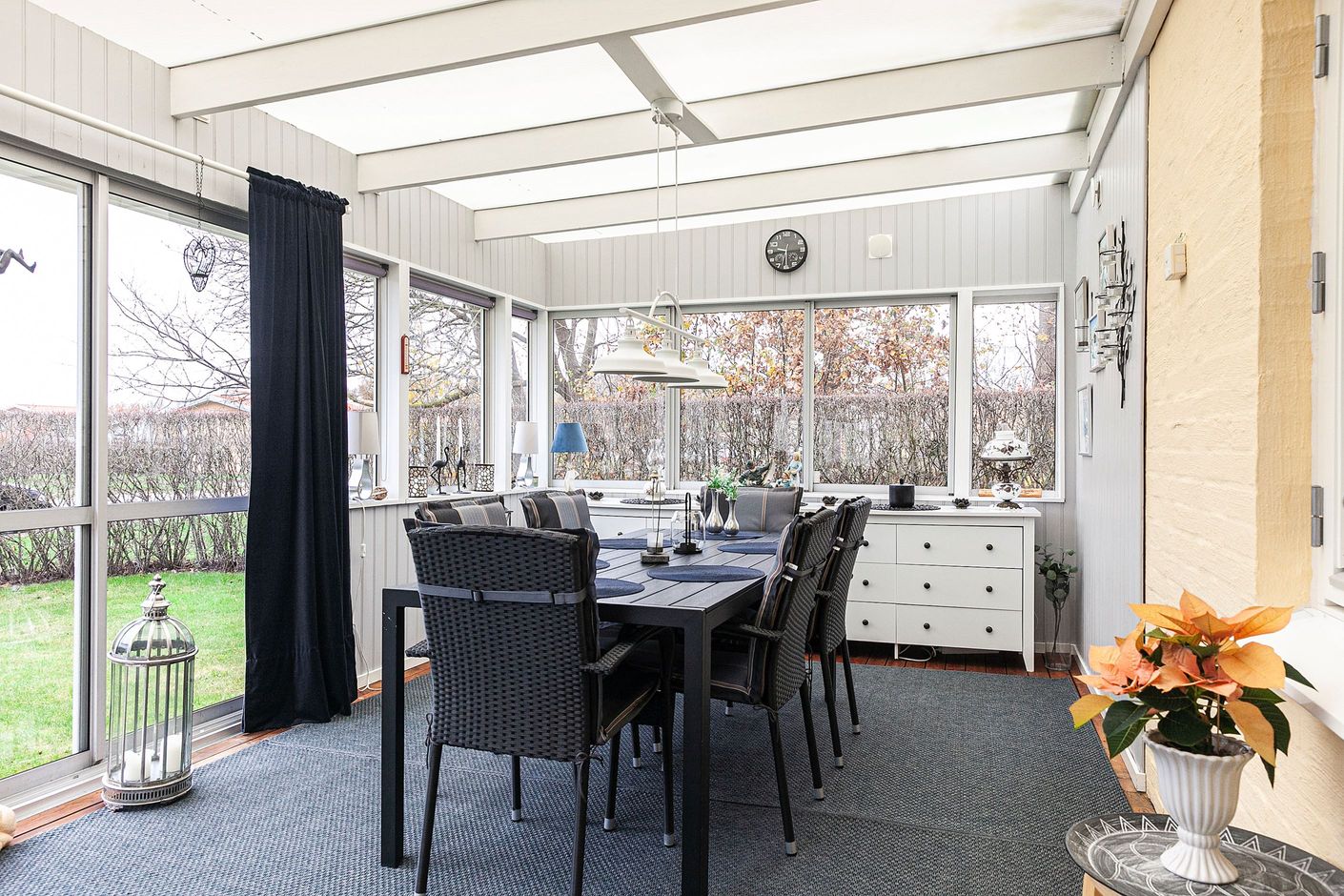 Det rymliga vardagsrummet har ett vackert parkettgolv och nås både från hall och kök. Härifrån finns utgång till det stora inglasade uterummet – en perfekt förlängning av bostaden med gott om plats för både matgrupp och loungemöbler.