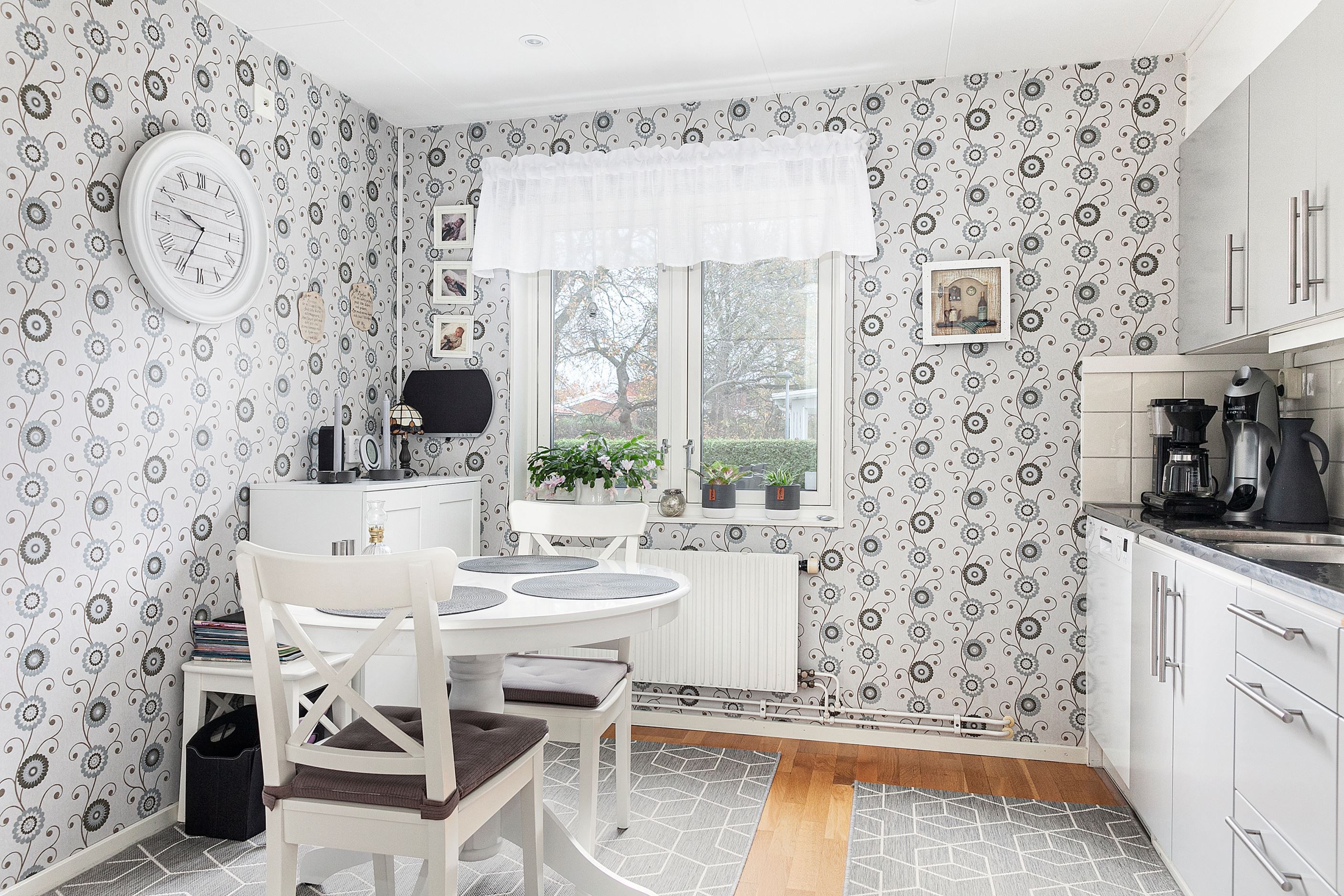 Köket nås från hallen och erbjuder plats för matbord. Inredningen går i ljusa kulörer och kompletteras av stilrena takspottar. Köket är utrustat med nyare spis och fläkt.