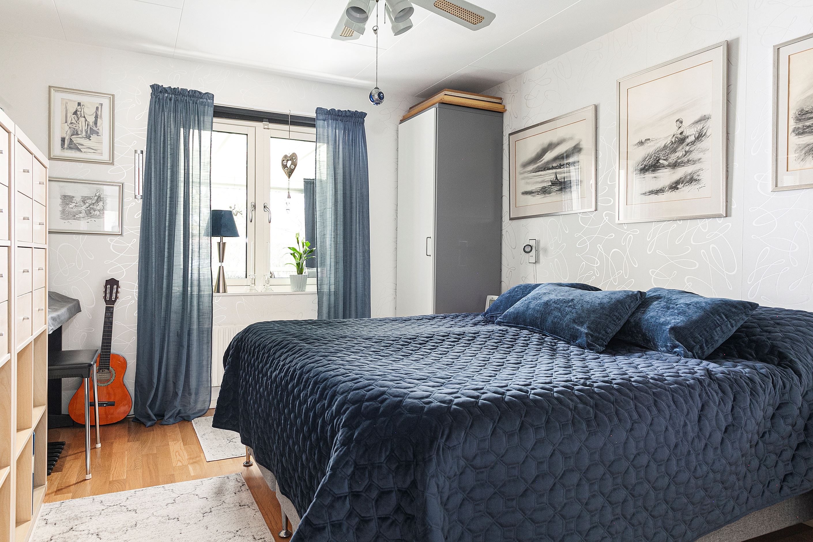 Bostaden erbjuder även ett större sovrum med garderober och plats för dubbelsäng.