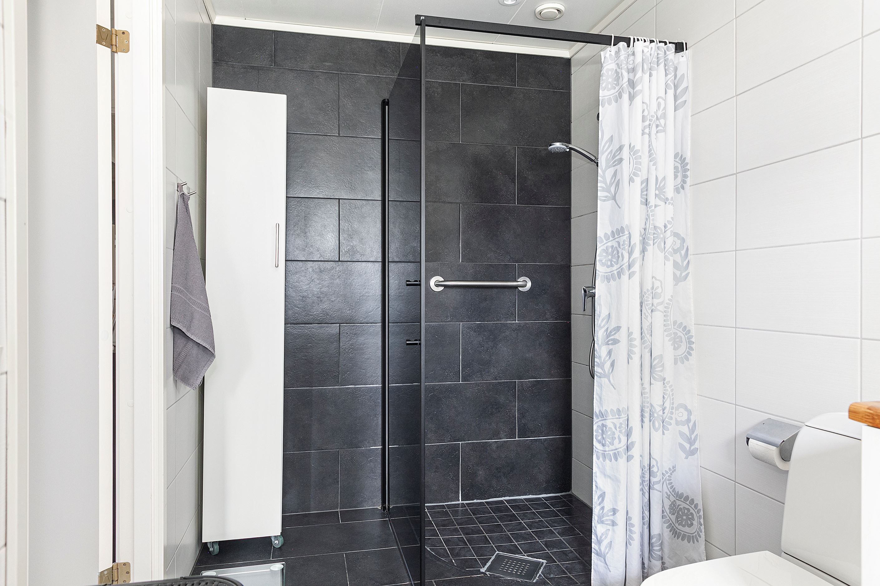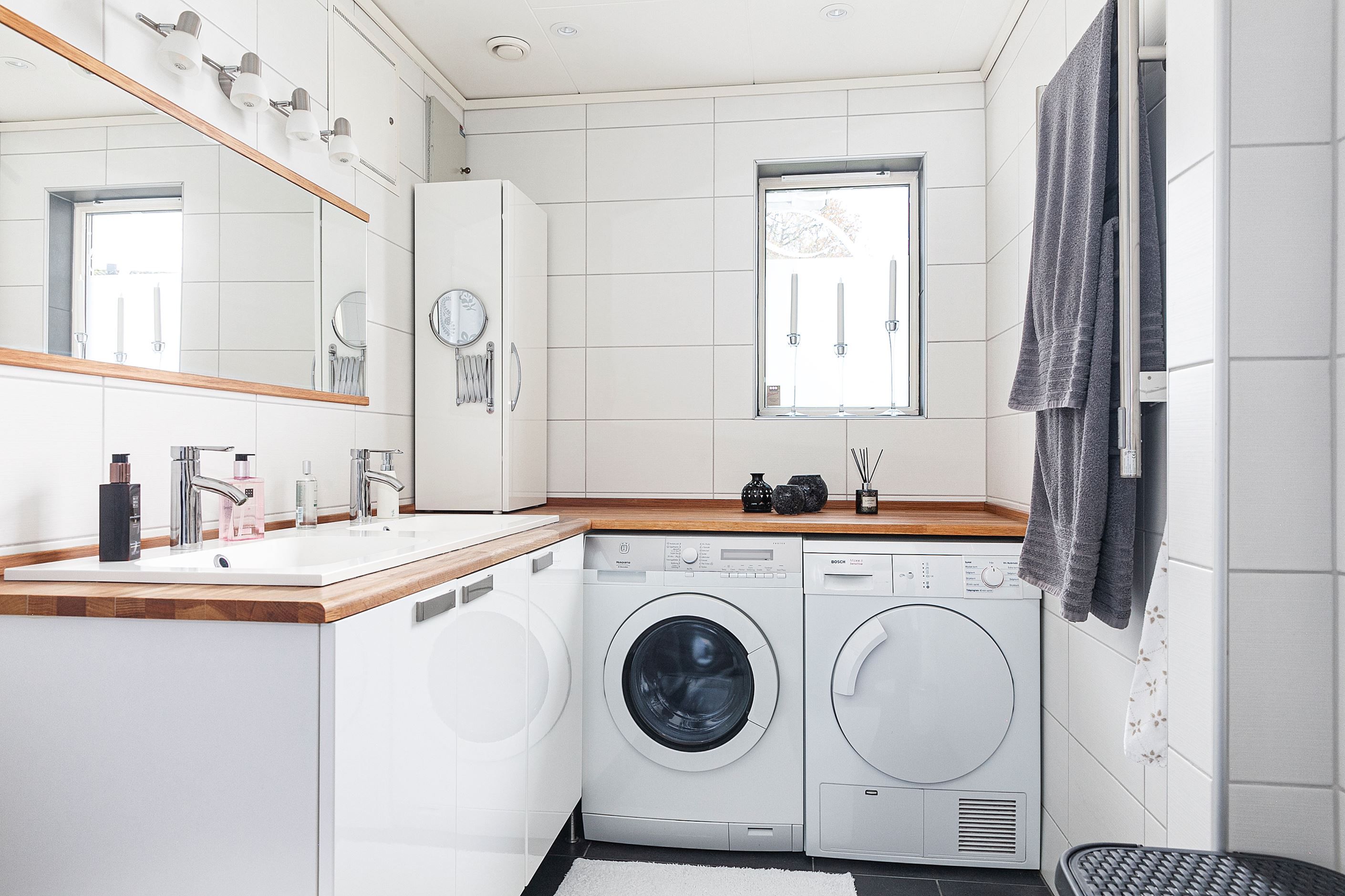 Det fräscha badrummet är smakfullt inrett med kakel och klinker samt utrustat med duschhörna, golvvärme, takspottar, dubbla handfat och handdukstork. Här finns även tvättmaskin och torktumlare samt ett fönster som ger ett härligt ljusinsläpp.
