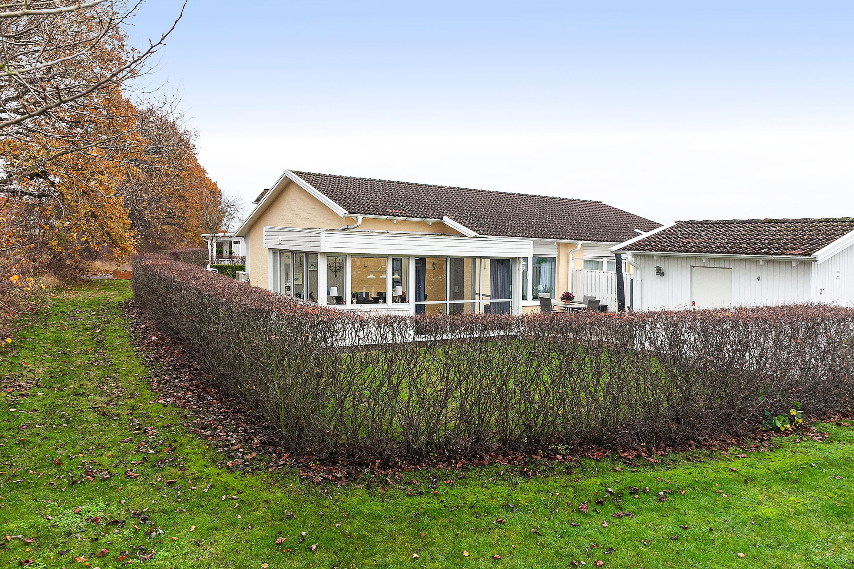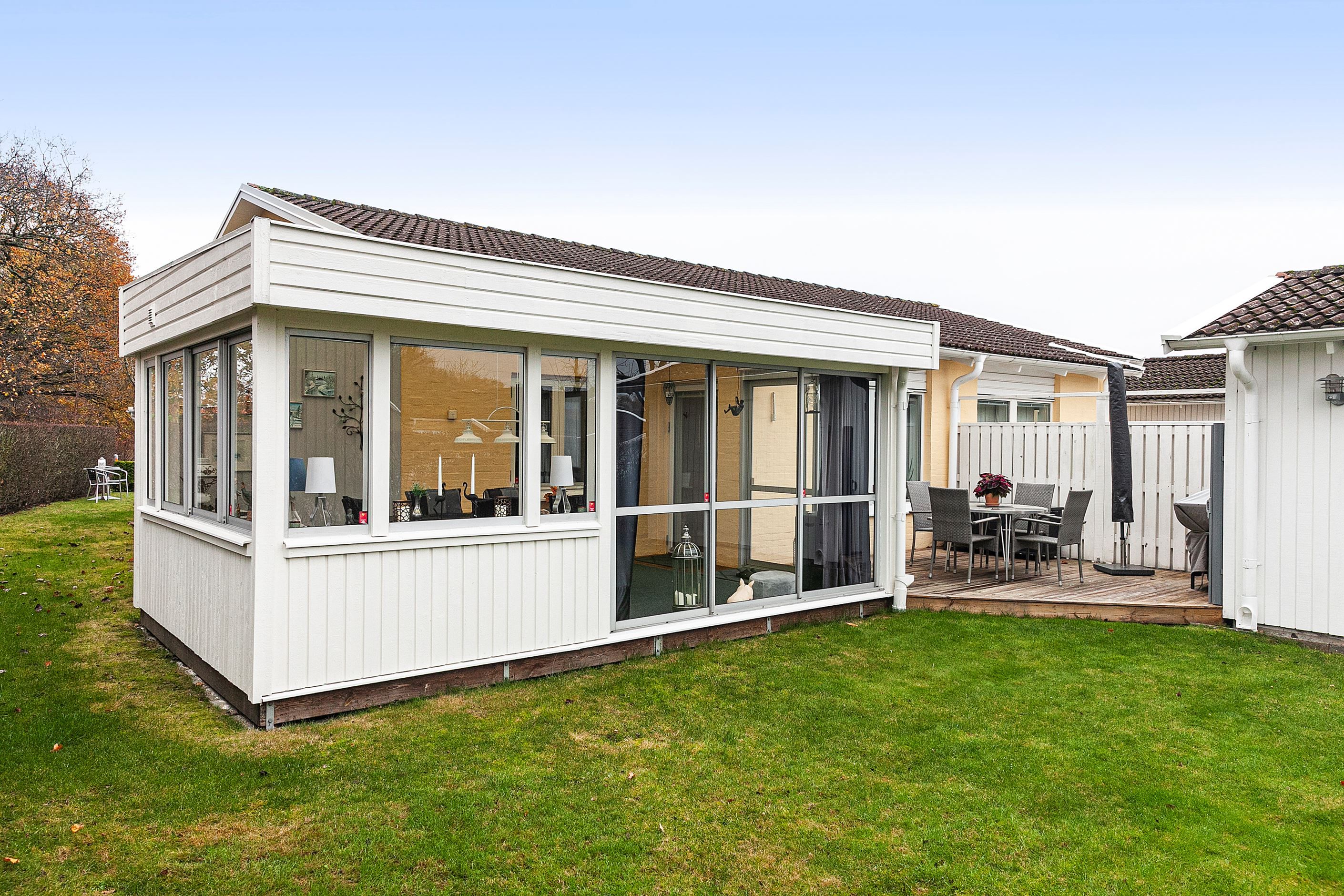 På ett hörnläge finner du detta radhus med ett stort inglasat uterum