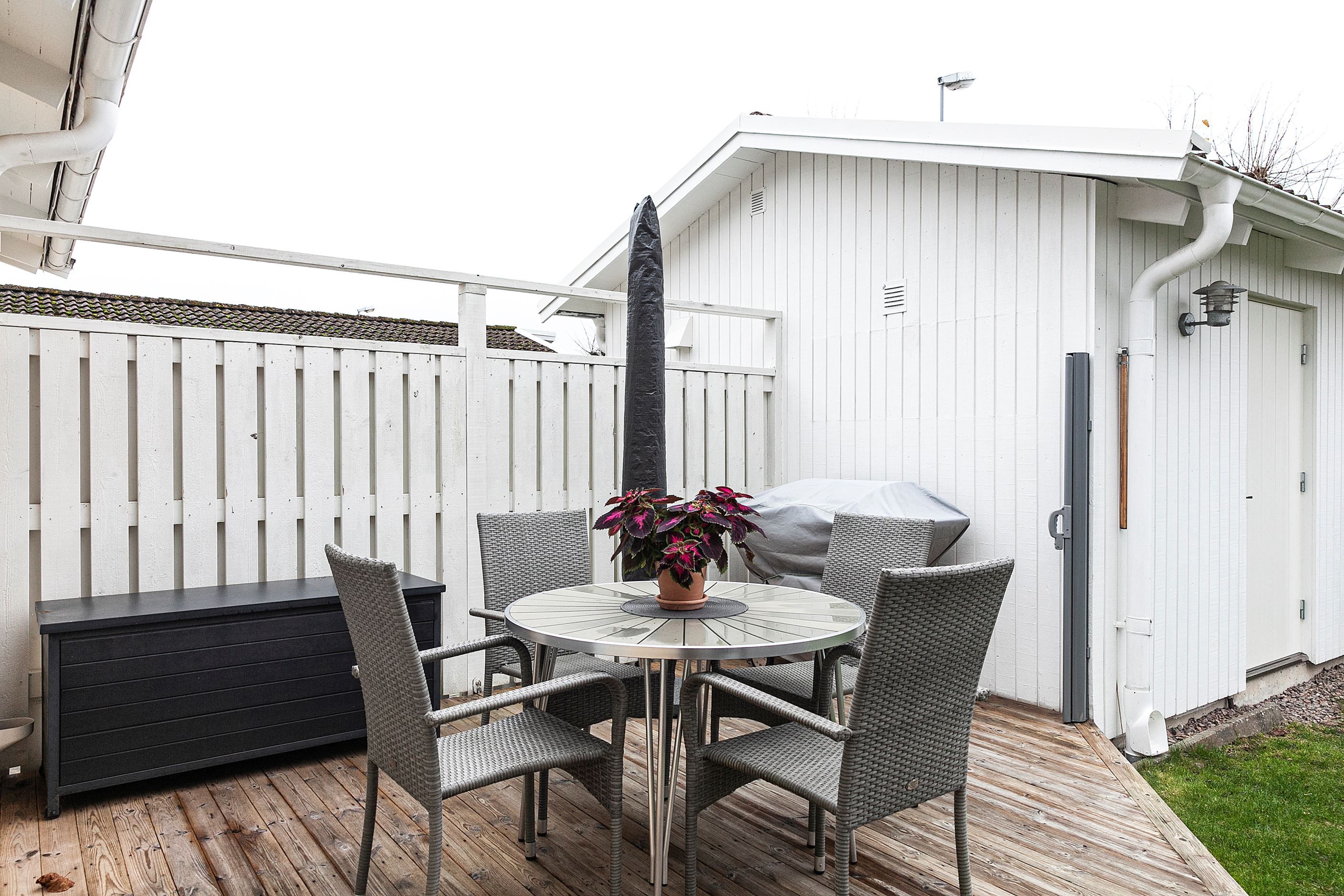 Det generösa uterummet leder vidare ut till den lättskötta hörntomten med en mysig trädäckad uteplats. Här finns även förråd samt vind och insynsskydd som skapar en privat och trivsam utemiljö.