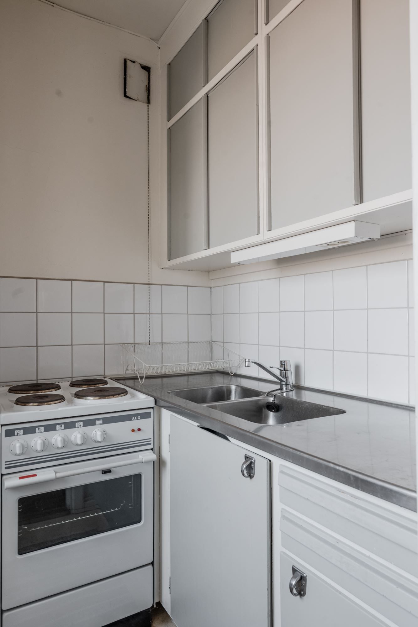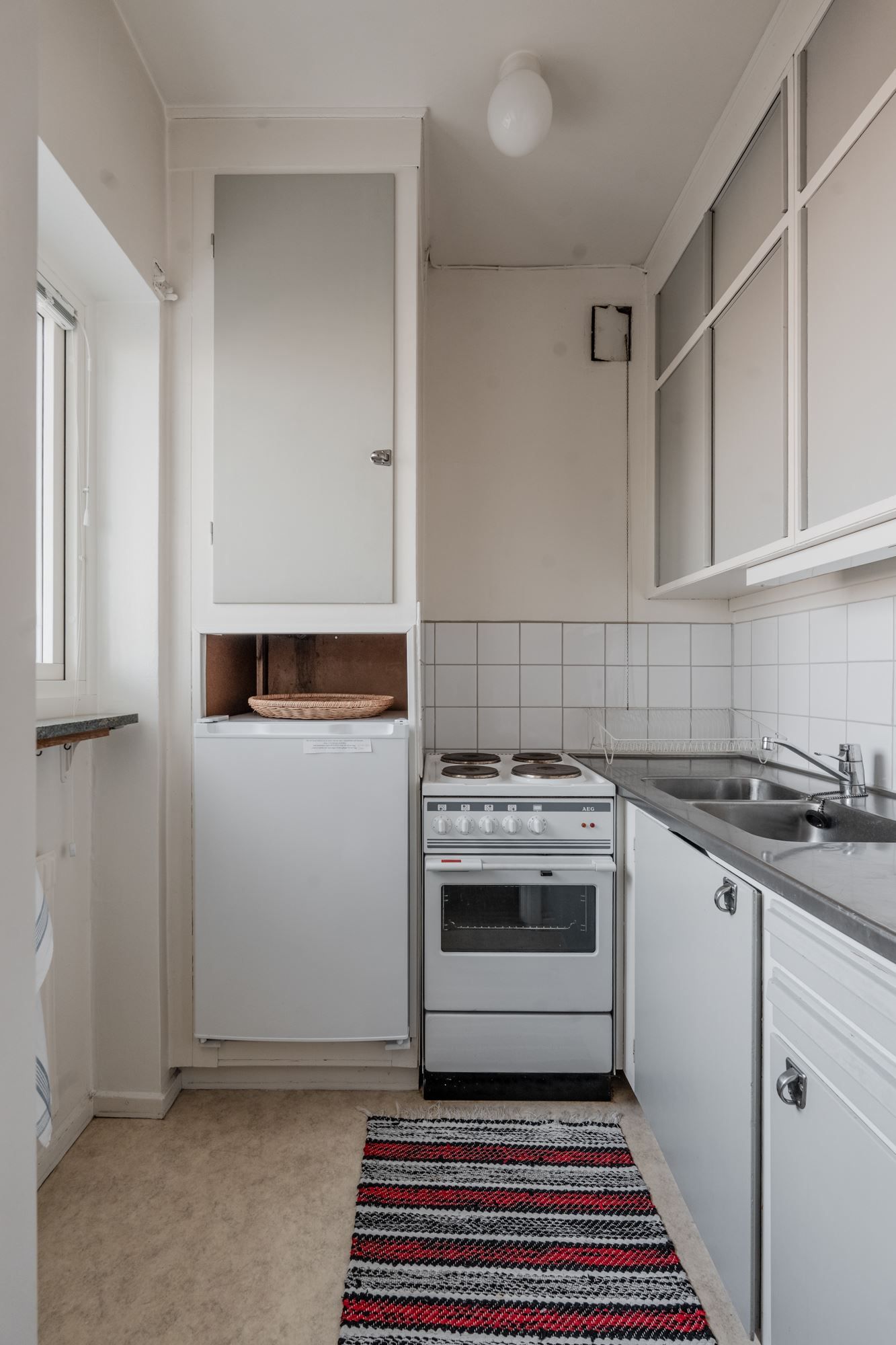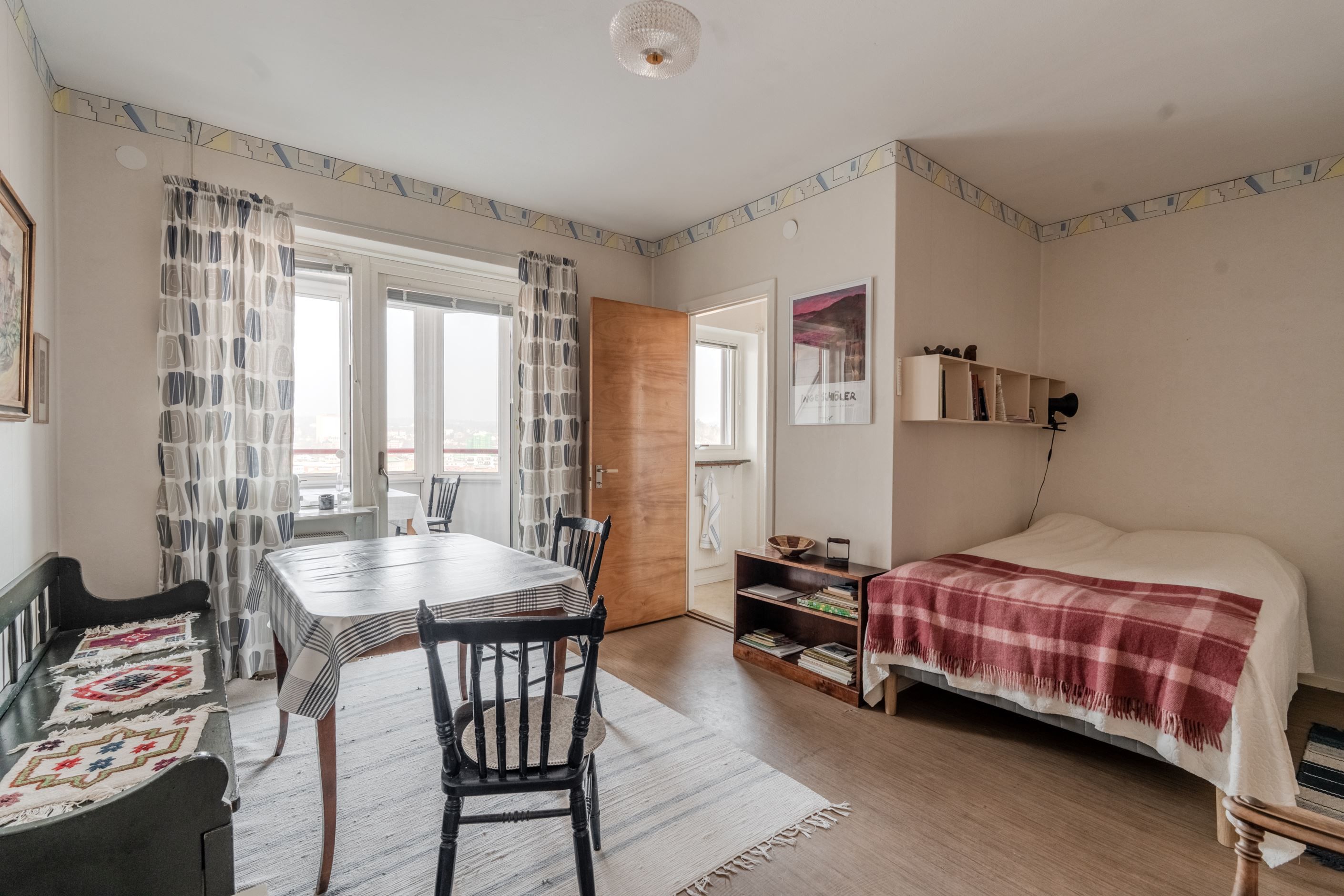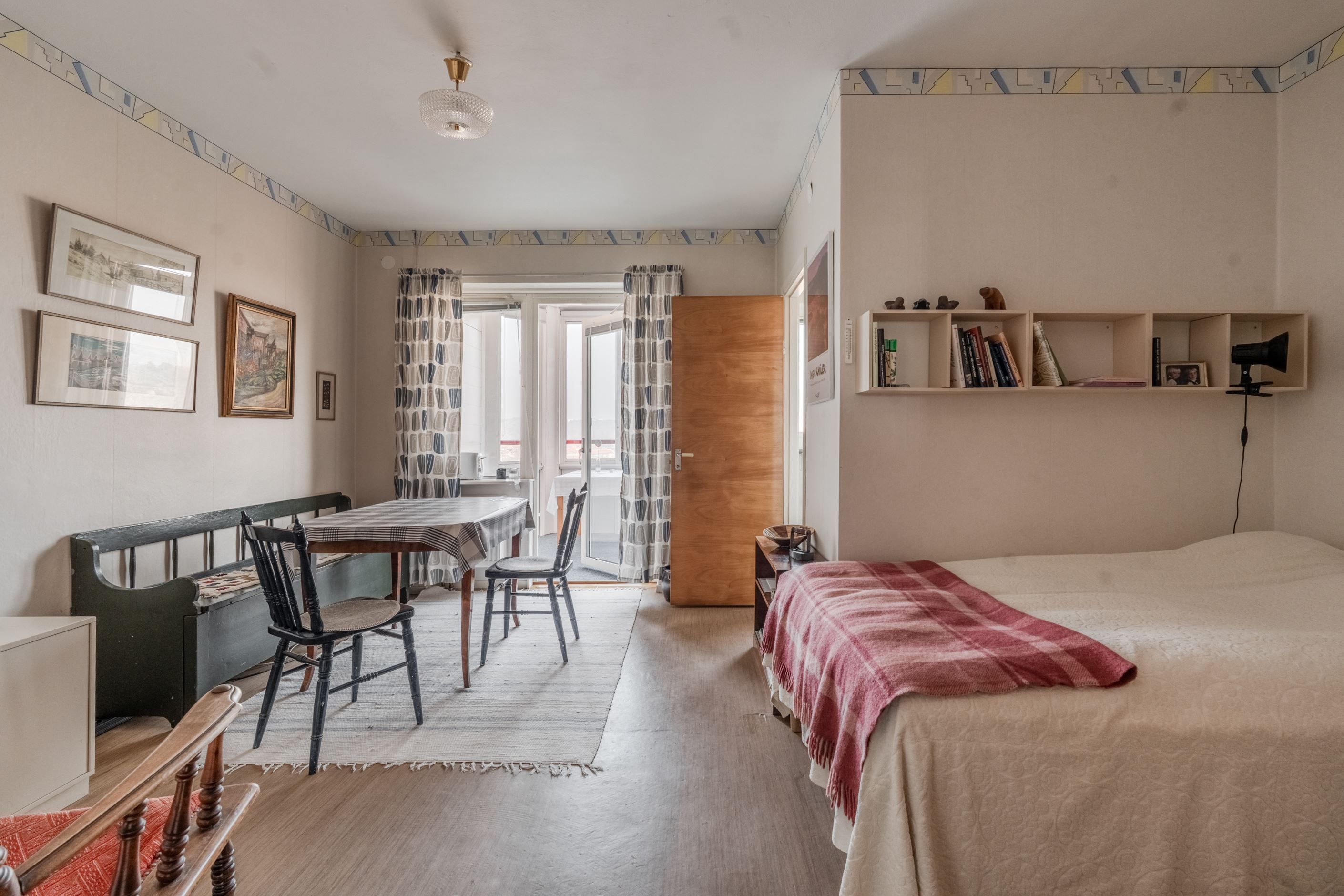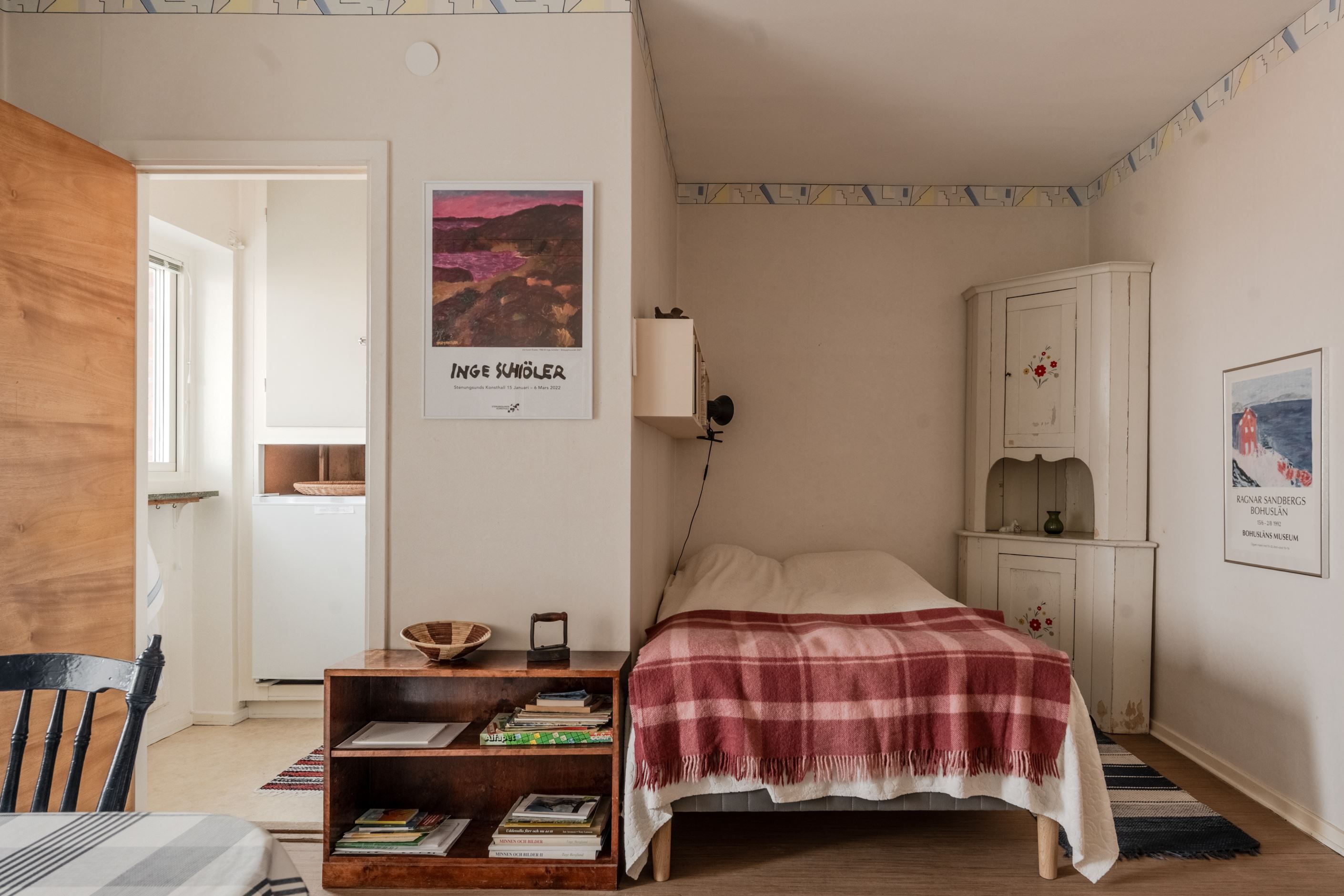 Lägenheten erbjuder ett ljust och öppet allrum med plats för både säng, soffhörna och matplats. Den praktiska kokvrån gör det enkelt att laga vardagsmåltider samtidigt som den är diskret integrerad i bostaden.