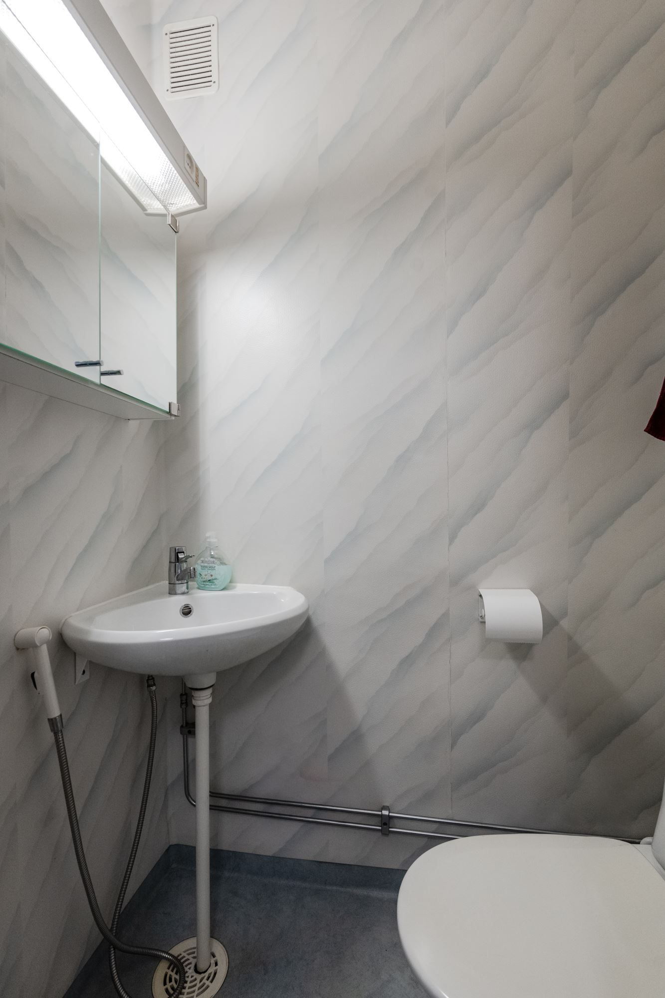 Badrummet är utrustat med handdusch och har en enkel och funktionell utformning. Planlösningen gör bostaden lätt att möblera och passar perfekt för studenten, förstagångsköparen eller som en smidig övernattningslägenhet.