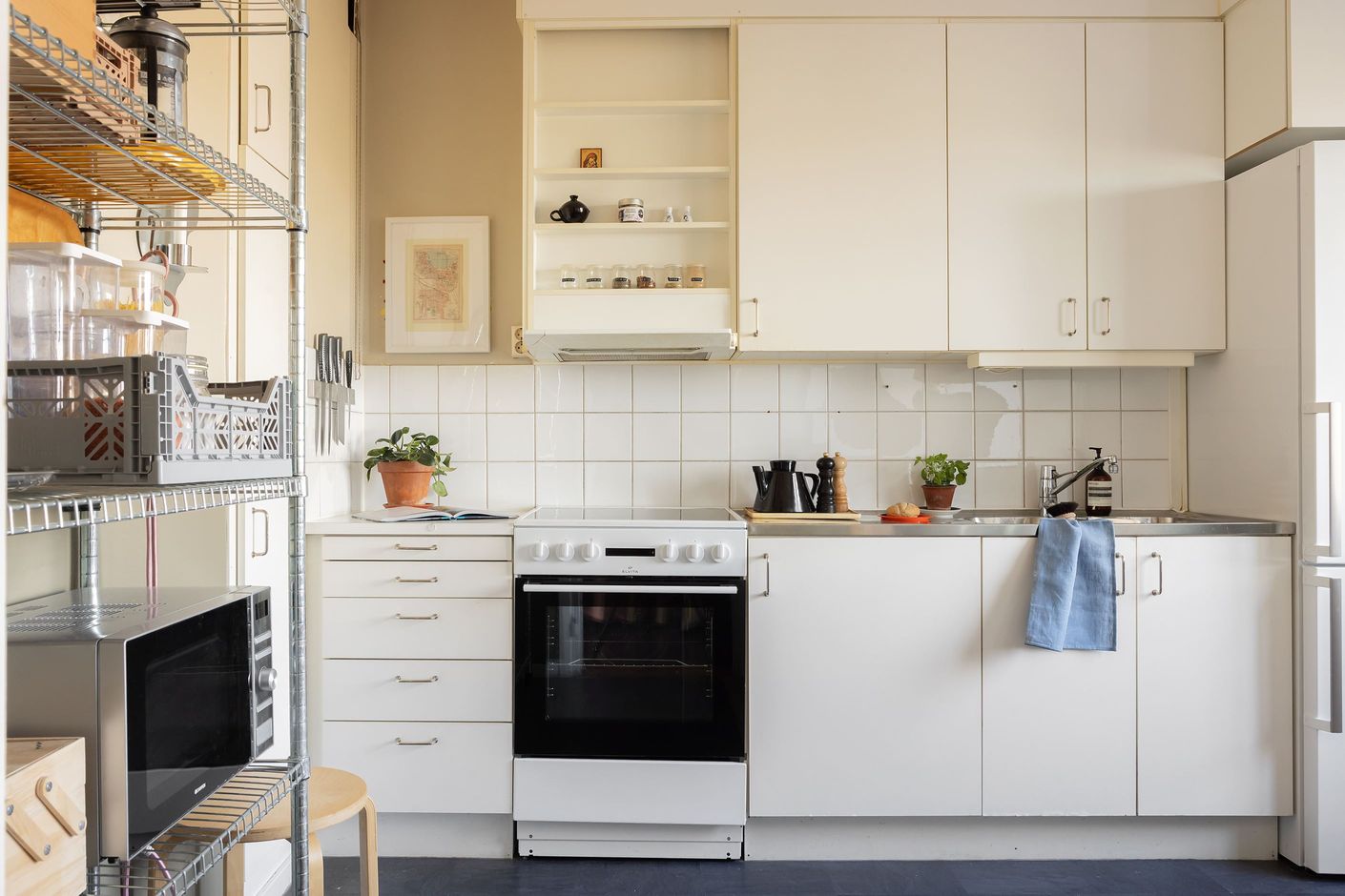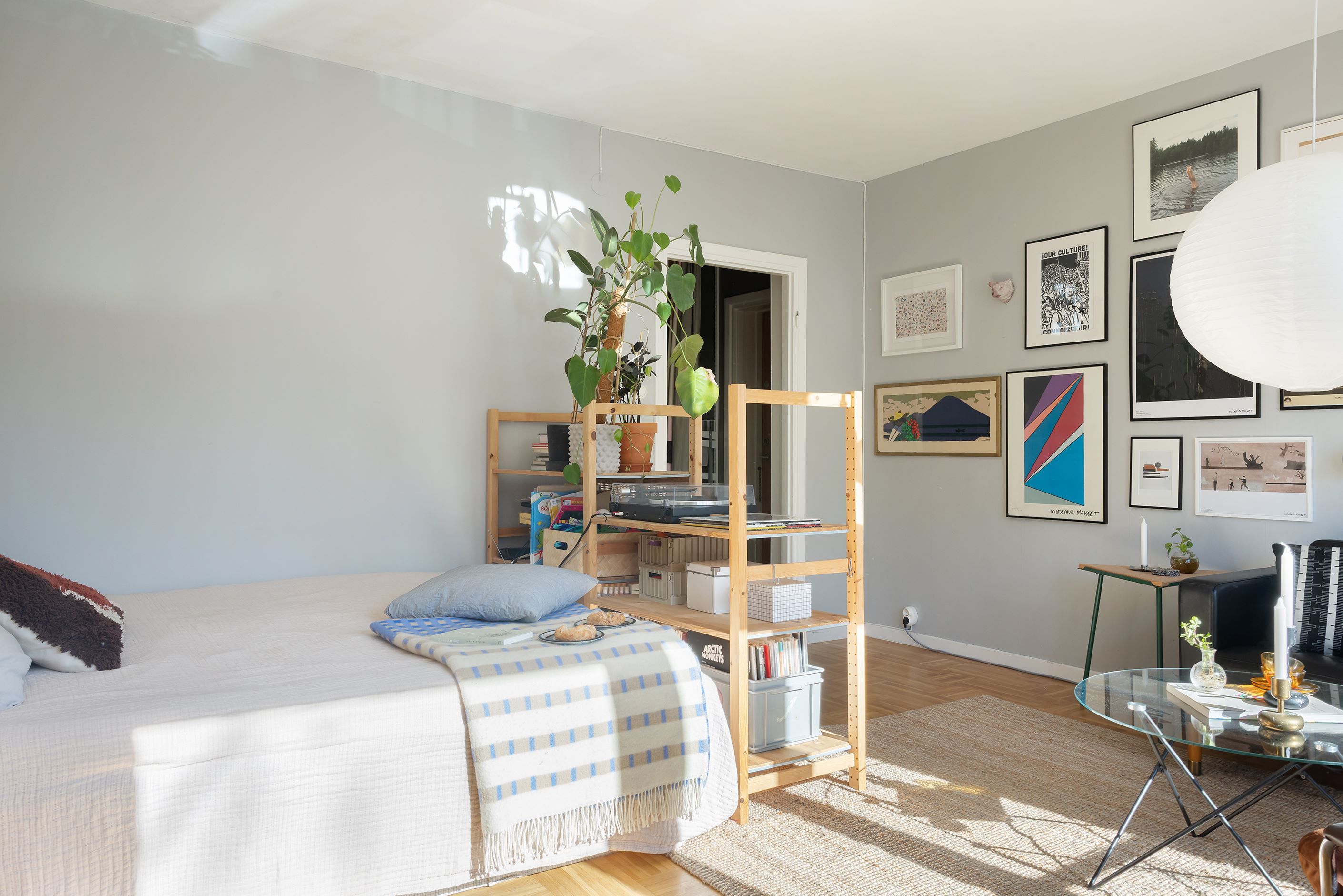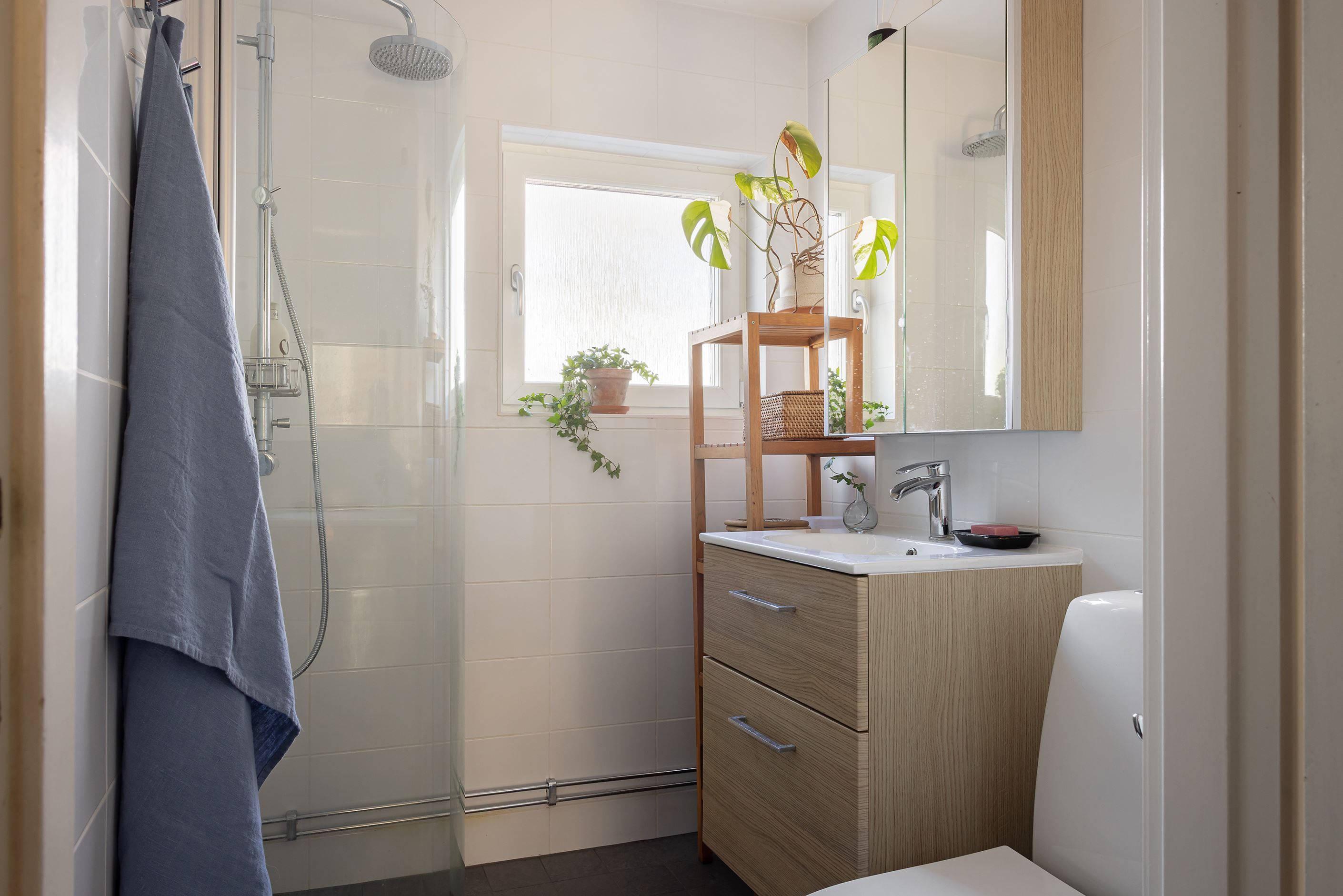 Vardagsrummet är luftigt och lättmöblerat med ett stort fönsterparti samt en fransk balkong i soligt söderläge som släpper in rikligt med ljus. Här finns gott om plats för soffgrupp, tv-möbel, säng och annat möblemang efter behov. Badrummet är helkaklat och stilrent inrett med dusch, kommod och spegelskåp ovanför handfatet.