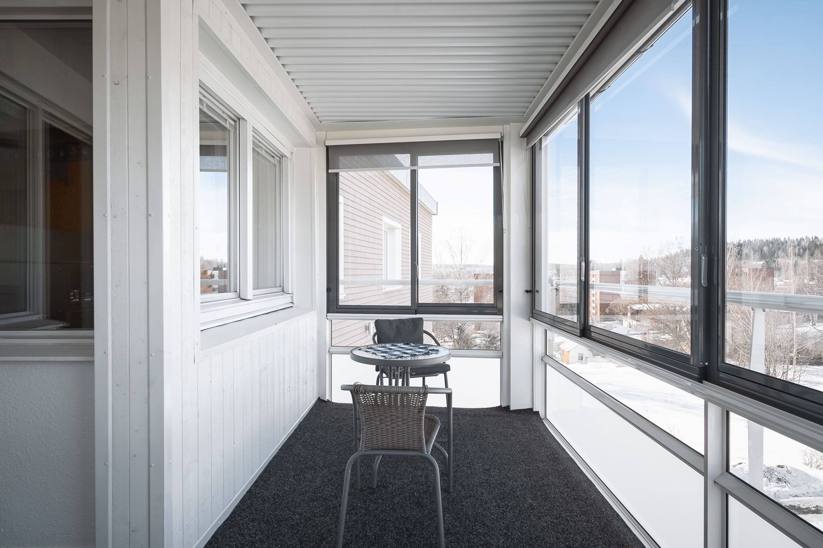 Denna rymliga 2a på högsta våningen erbjuder en oslagbar utsikt åt tre väderstreck från den enorma inglasade balkongen. Du kommer att kunna njuta av denna balkong oavsett årstid.