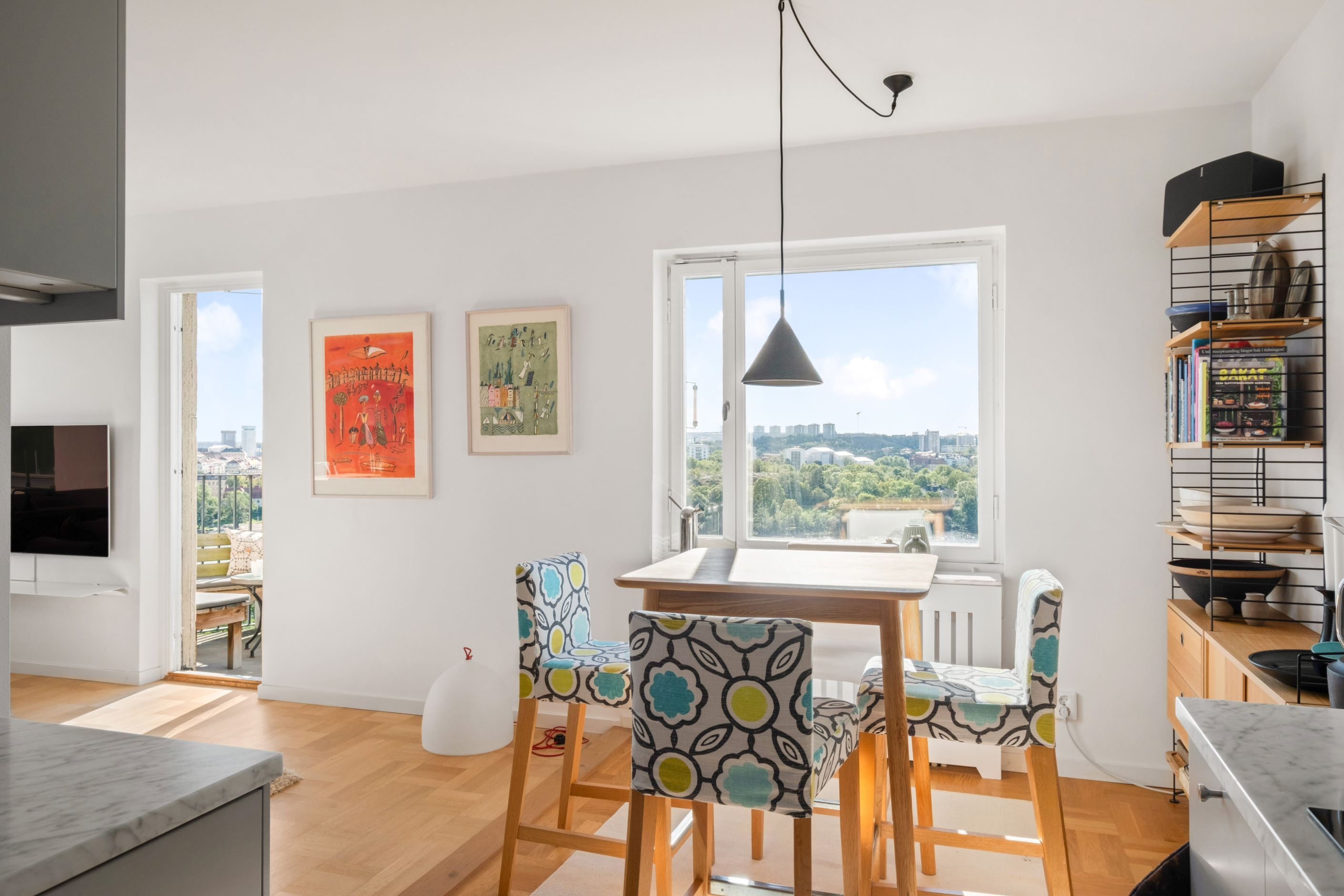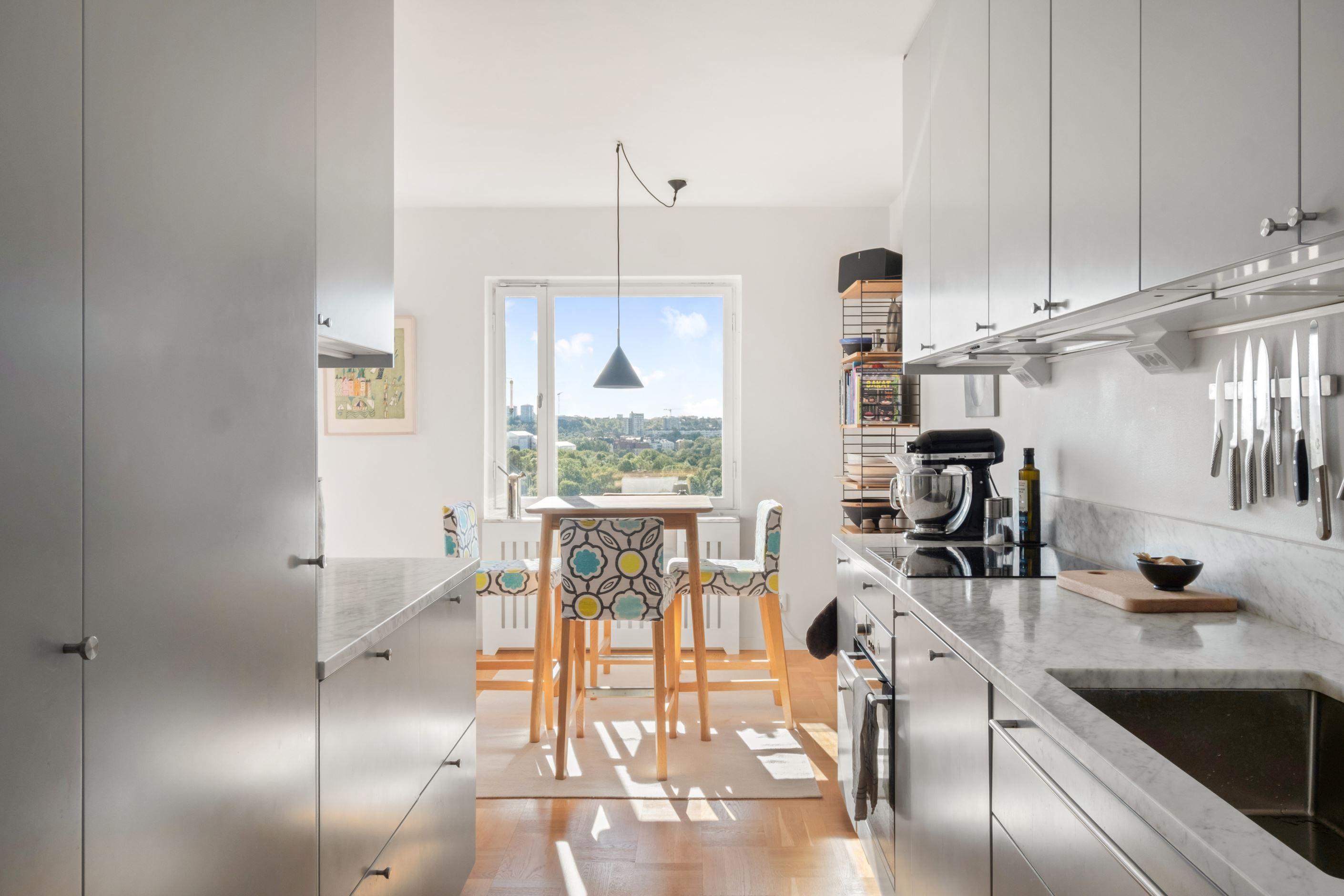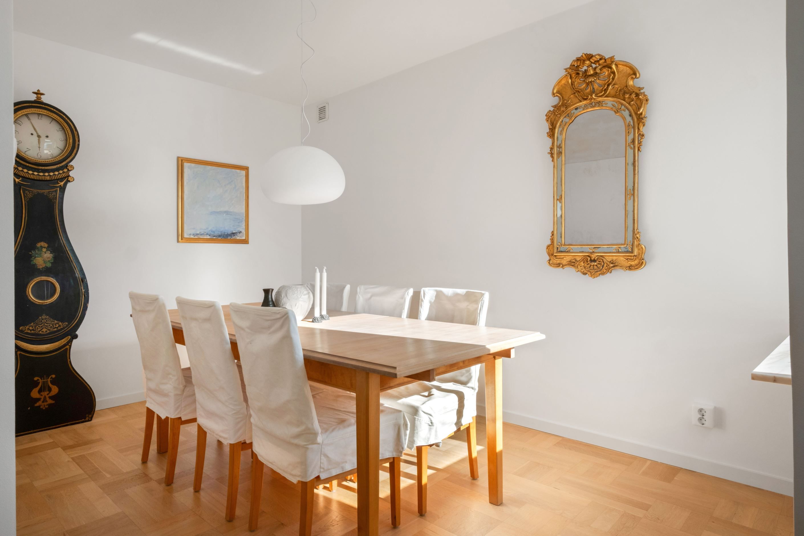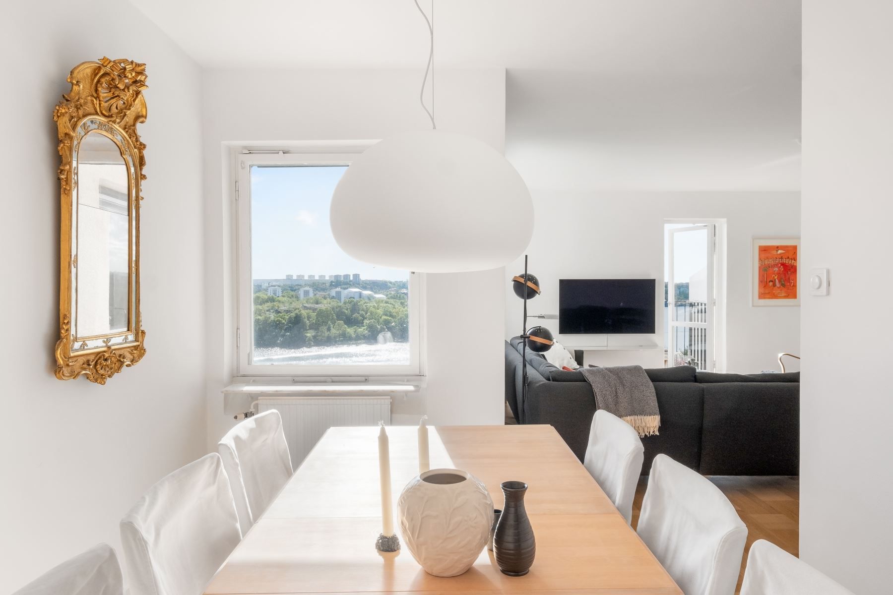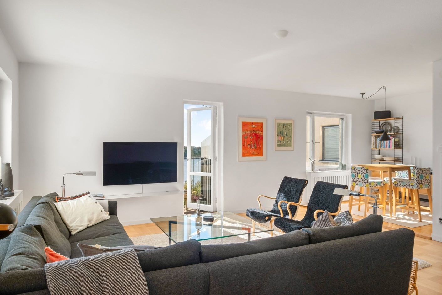 Planlösningen är väl genomtänkt med ett stilfullt renoverat kök som öppnar upp mot det generösa vardagsrummet. Härifrån når du även den soliga balkongen där du kan njuta av solen från förmiddag till kväll, samtidigt som du blickar ut över glittrande vatten. Intill vardagsrummet finns ett rum som idag används som matrum, men som enkelt kan återställas till ett sovrum enligt originalplan. Därtill finns två rymliga och lättmöblerade sovrum, ett stilrent badrum med tvättmaskin och torkskåp samt en praktisk gästtoalett. De stora fönsterpartierna förstärker känslan av rymd, ljus och närhet till vattnet.