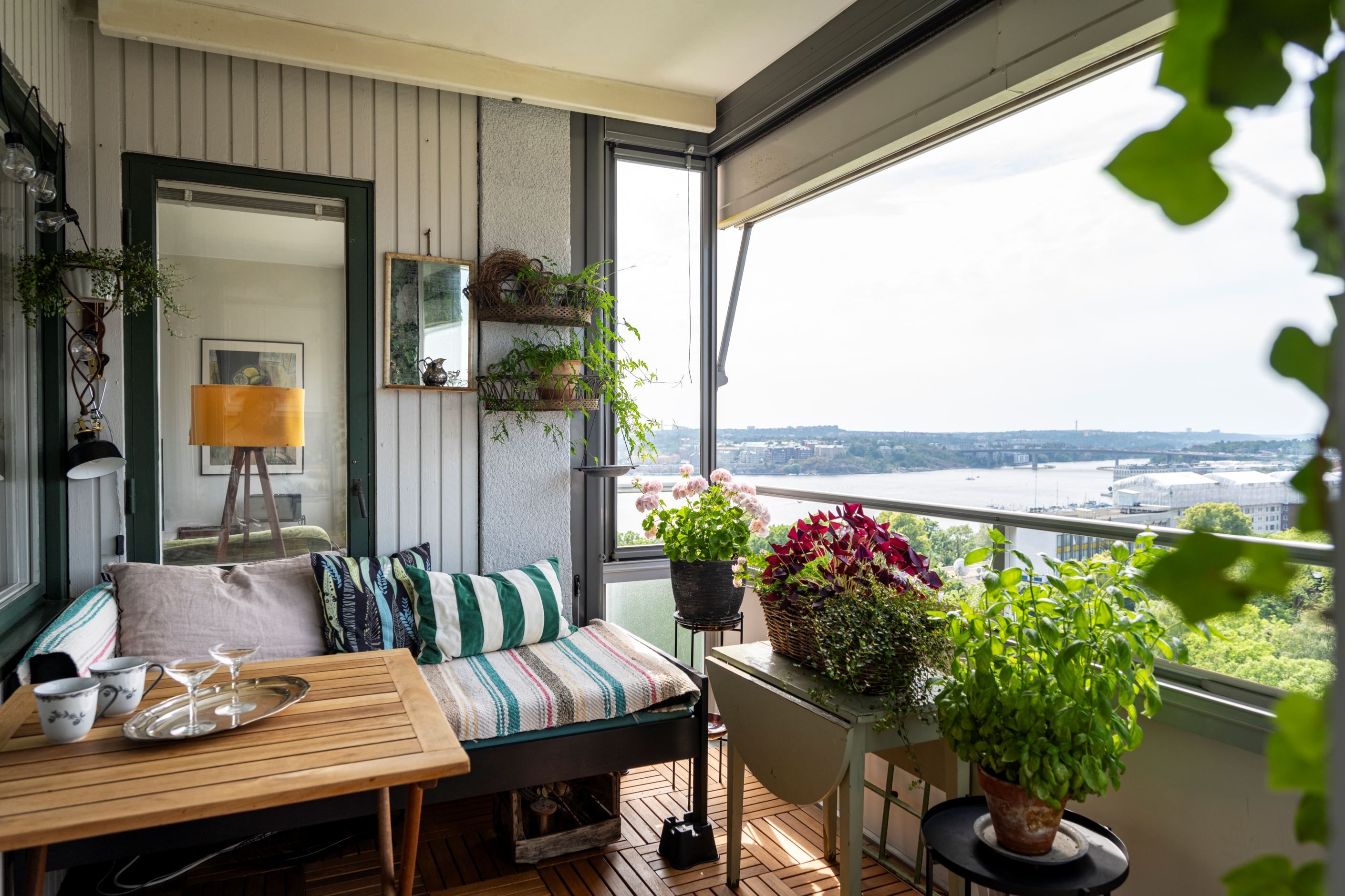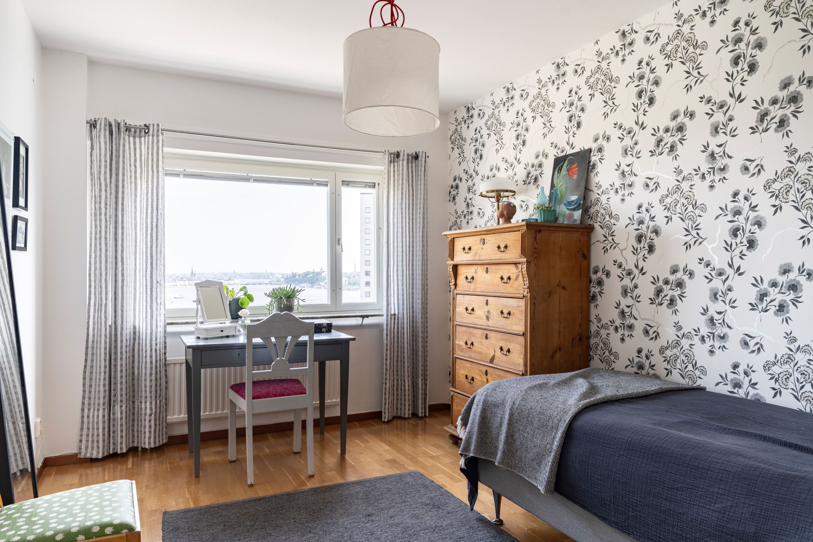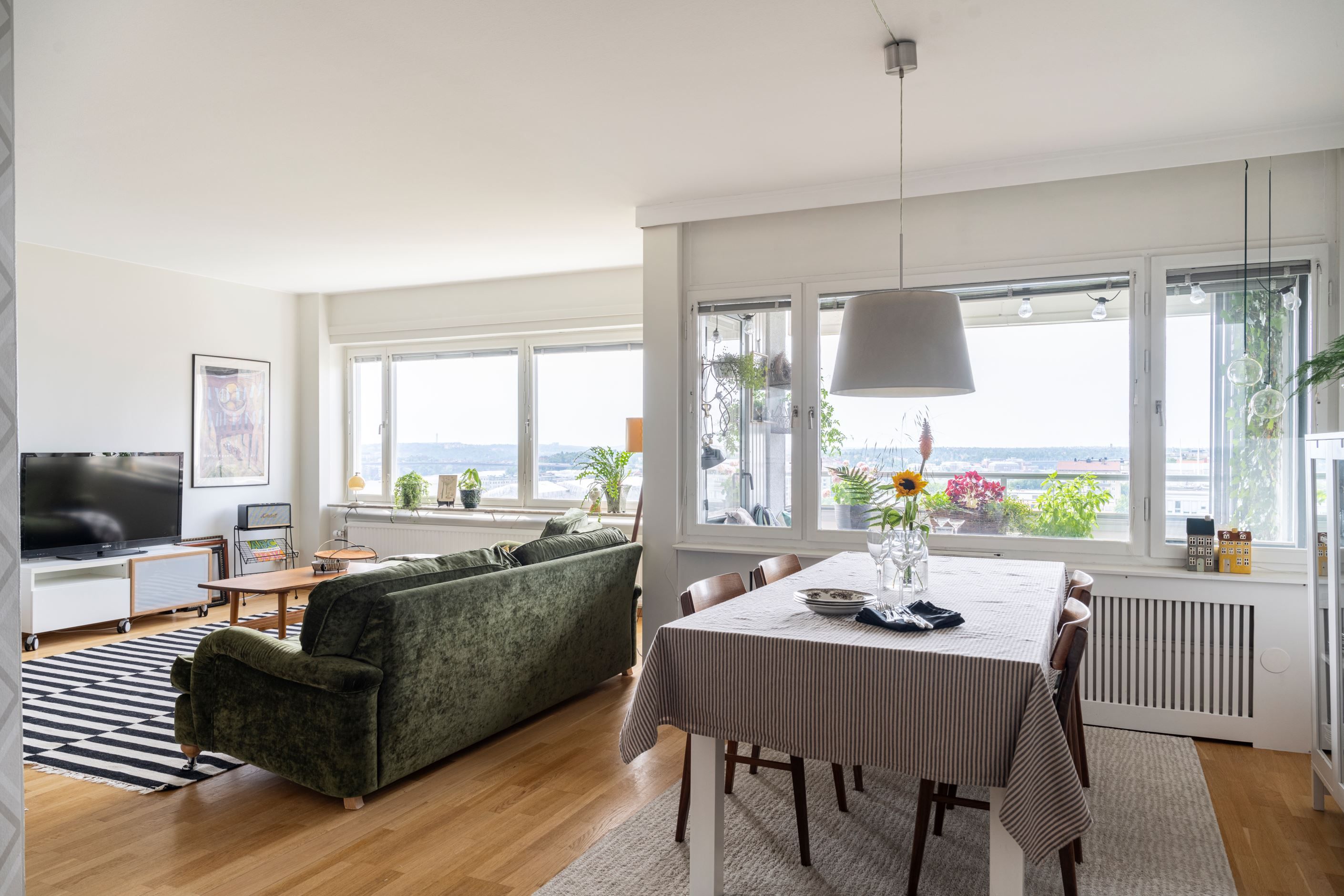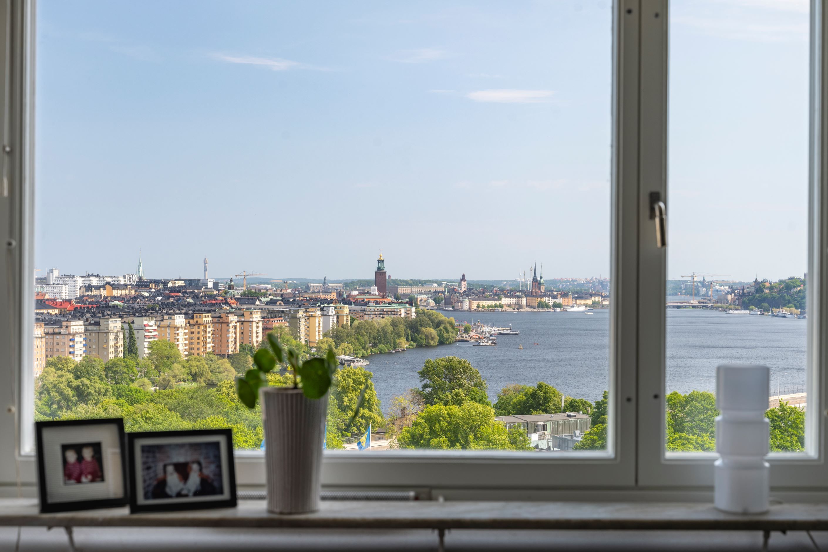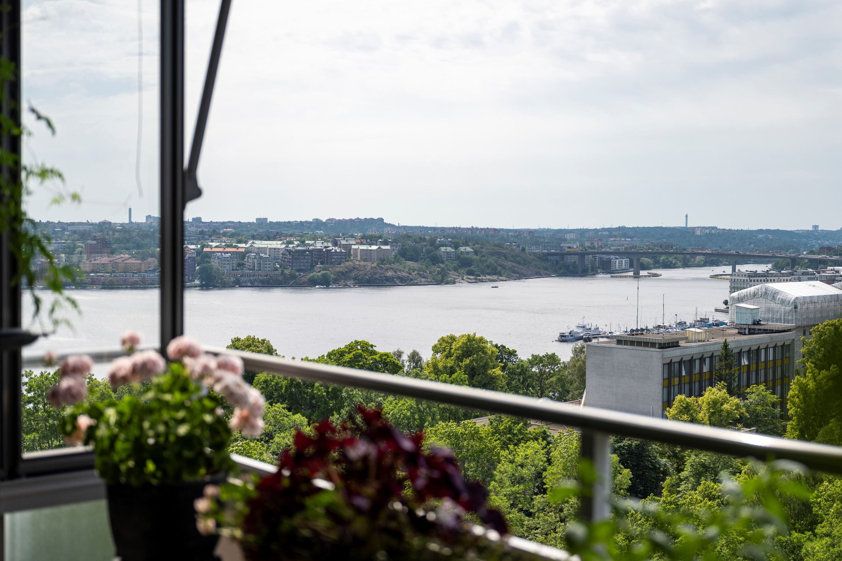 Med högt läge i huset och en vidsträckt utsikt över Stockholm, Mälarens glittrande vatten samt lummig grönska ligger denna underbara 5:a. Lägenheten har en mycket väldisponerad planlösning som är ändrad ifrån originalutförandet så att den fantastiska utsikten verkligen hamnar i fokus och förvaringsmöjligheterna blir extra generösa. På lägenhetens ena sida ligger köket som har plats för matbord, lägenhetens balkong och vardagsrum samt matplats med öppen planlösning invid varandra. På den andra sidan av lägenheten ligger samtliga sovrum och i anslutning till dem ligger även badrum och gästtoalett. Bostadens balkongen är rymlig och har en inglasning som med lätthet kan öppnas upp under sommarhalvåret. Under vinterhalvåret så fungerar det utmärkt att sätta in infravärme så att balkongen kan nyttjas även då. Här finns även generöst med förvaring i en rymlig klädkammare och två stora förråd inne i bostaden.