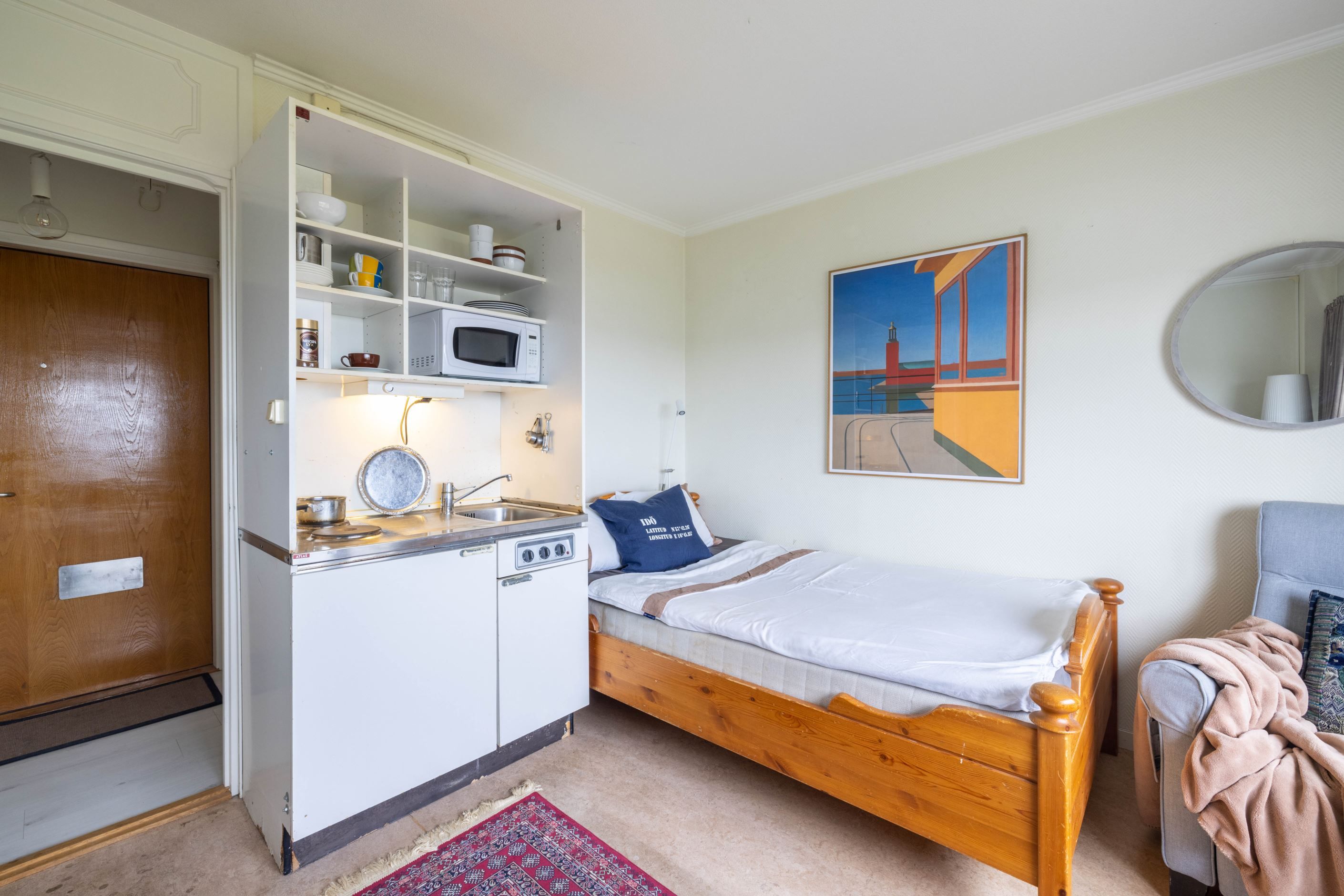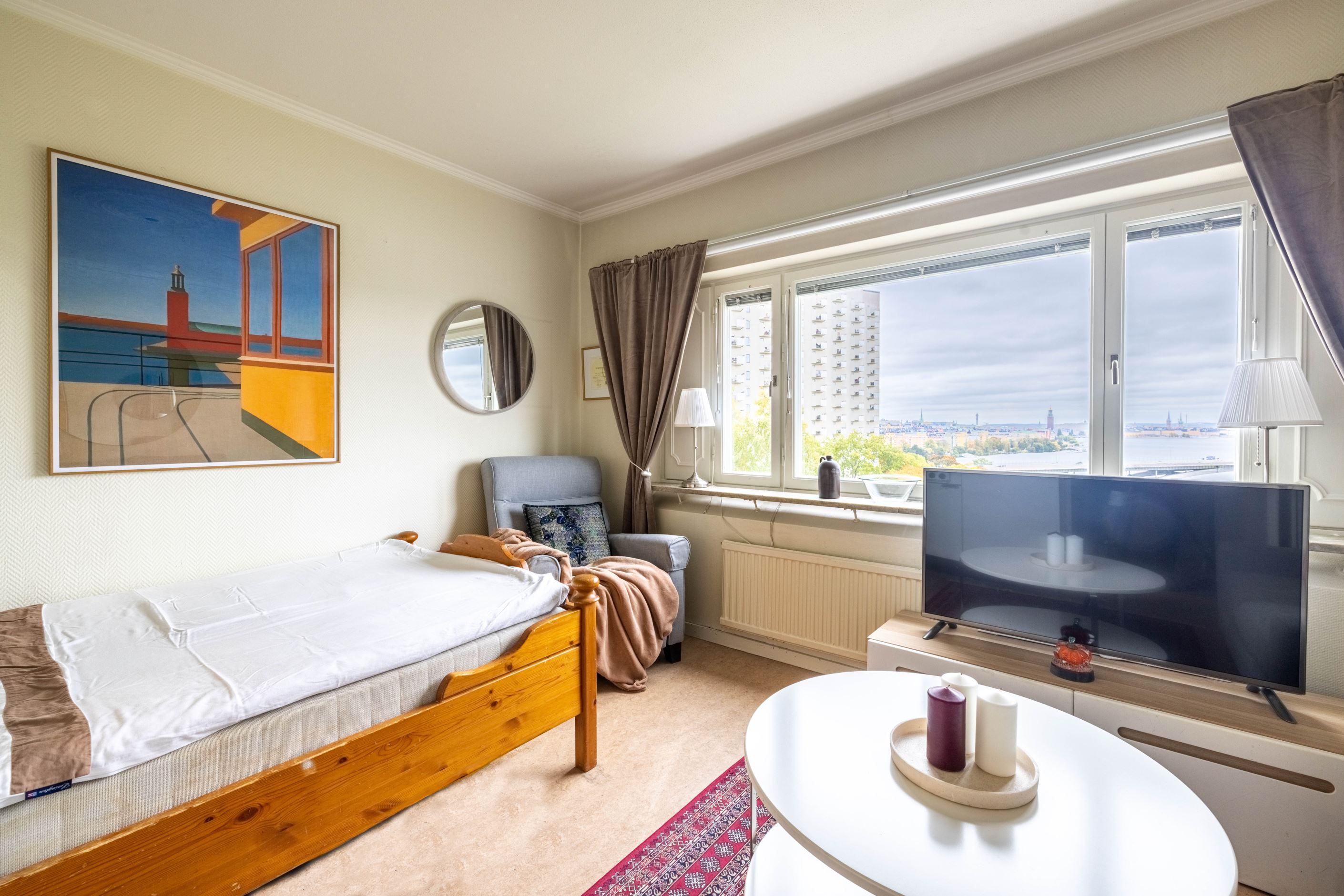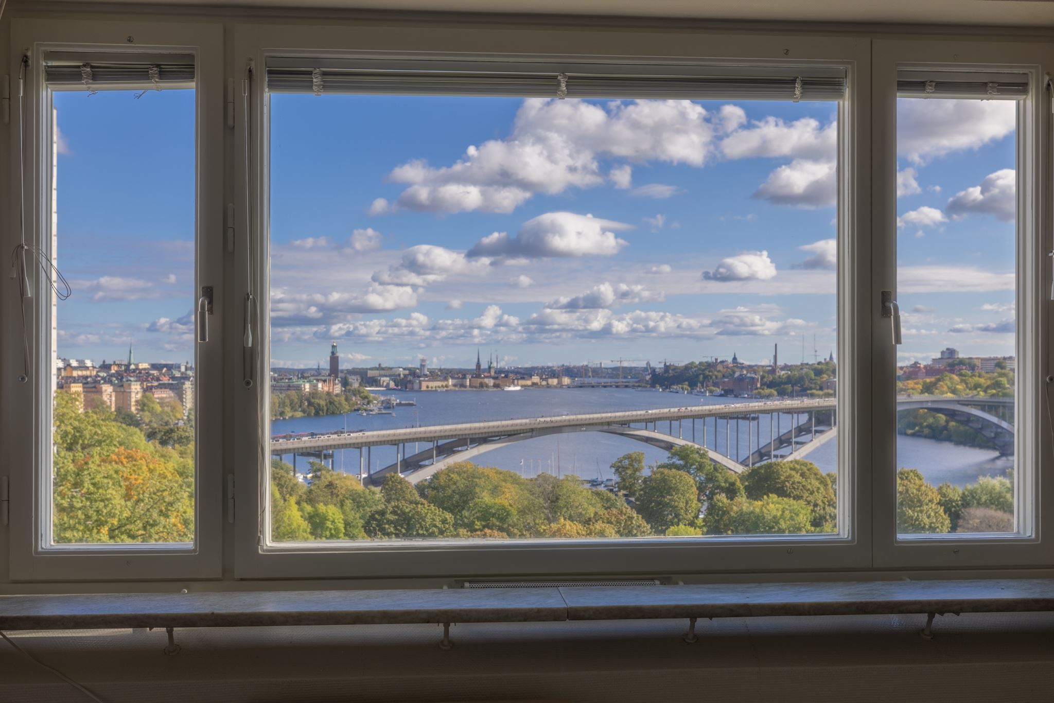 Med en magnifik panoramavy över Stockholm med glittrande vatten, lummig grönska och takåsar ligger denna trivsamma 1:a. Planlösningen är optimal och varje kvadratmeter nyttjas till max. I rummet finns en praktisk trinett och det finns även plats för säng, soffa, bord och tv. Badrummet är snyggt renoverat med smakfulla materialval. Lägenheten har ett fantastiskt läge helt utan insyn och med fri utsikt. Det generösa fönsterpartiet ger inte bara en panoramavy utan även ett härligt ljusinsläpp.