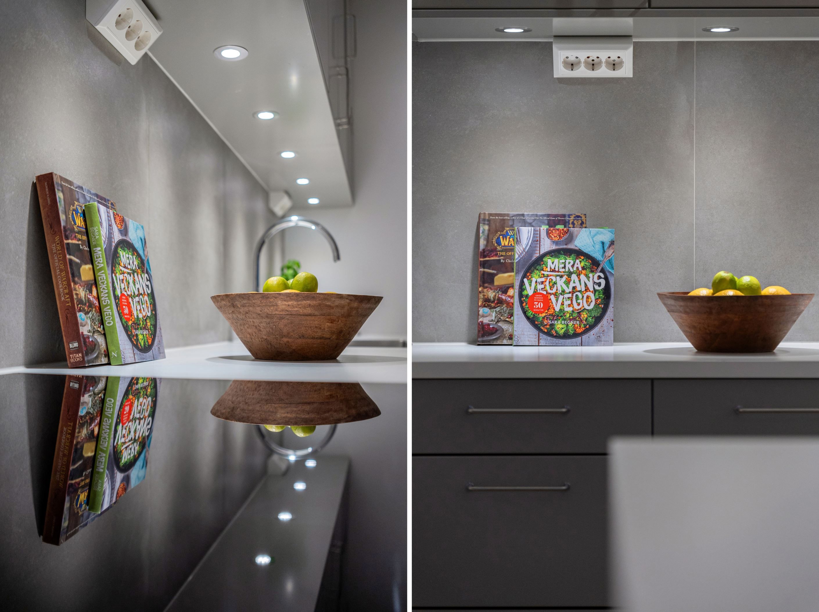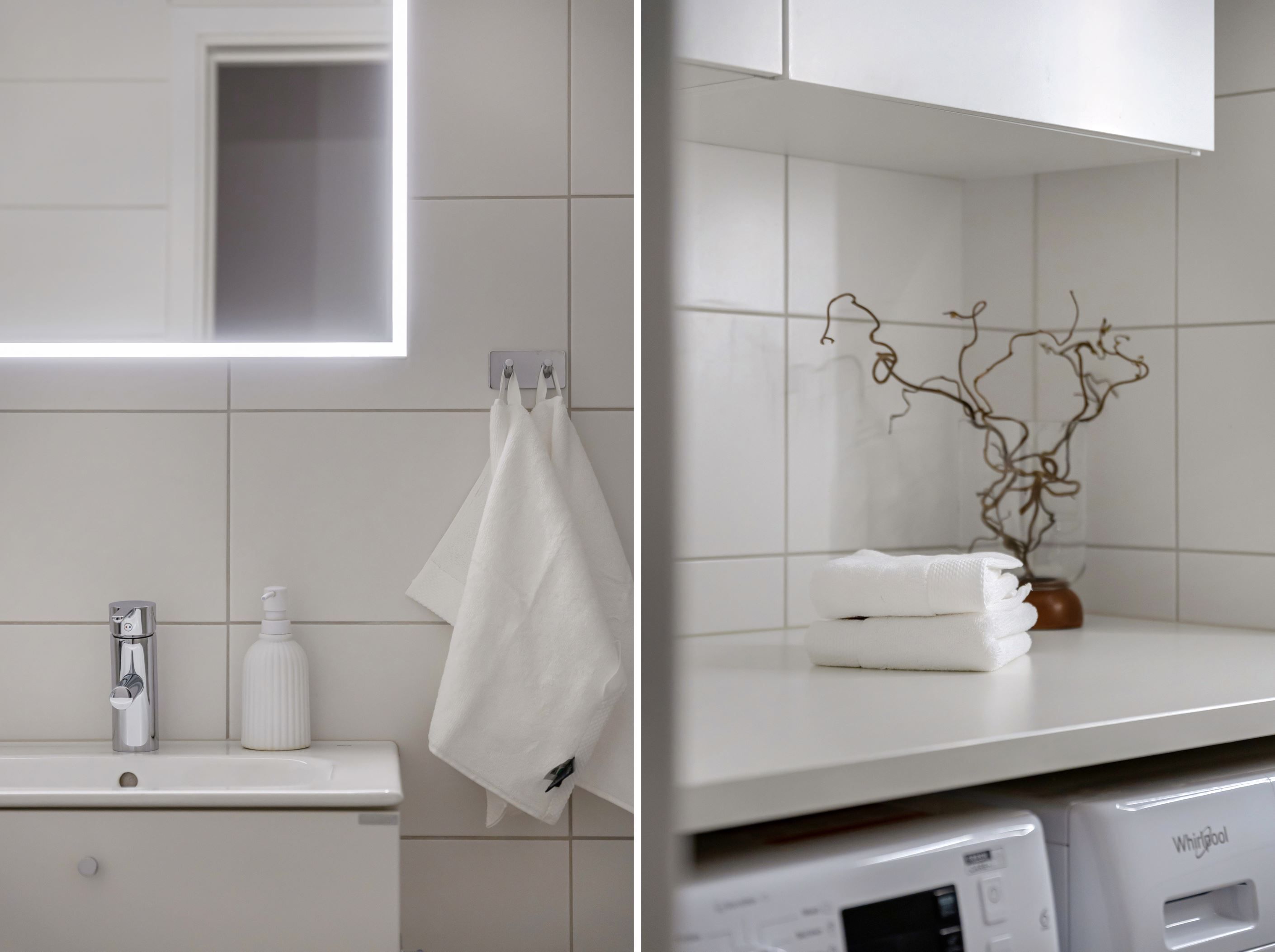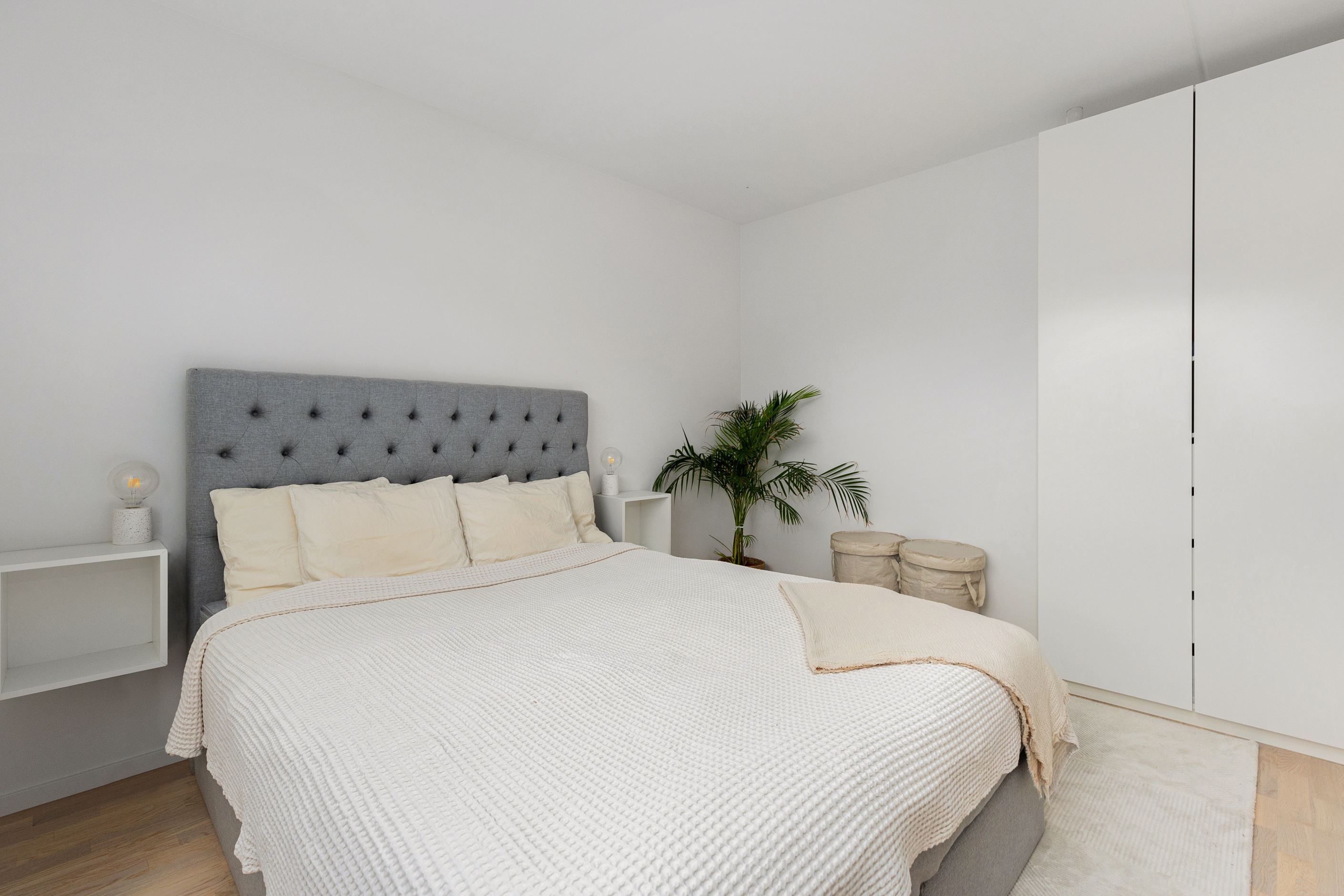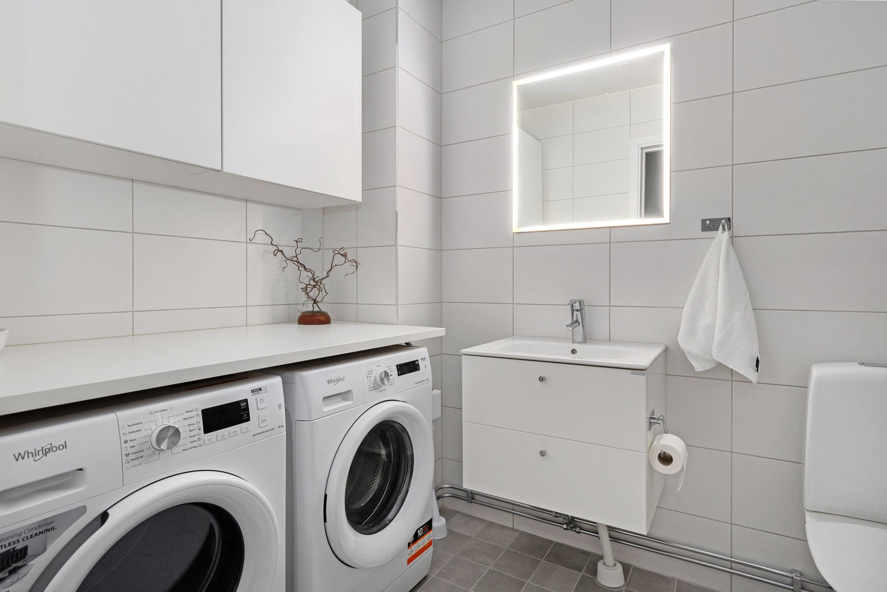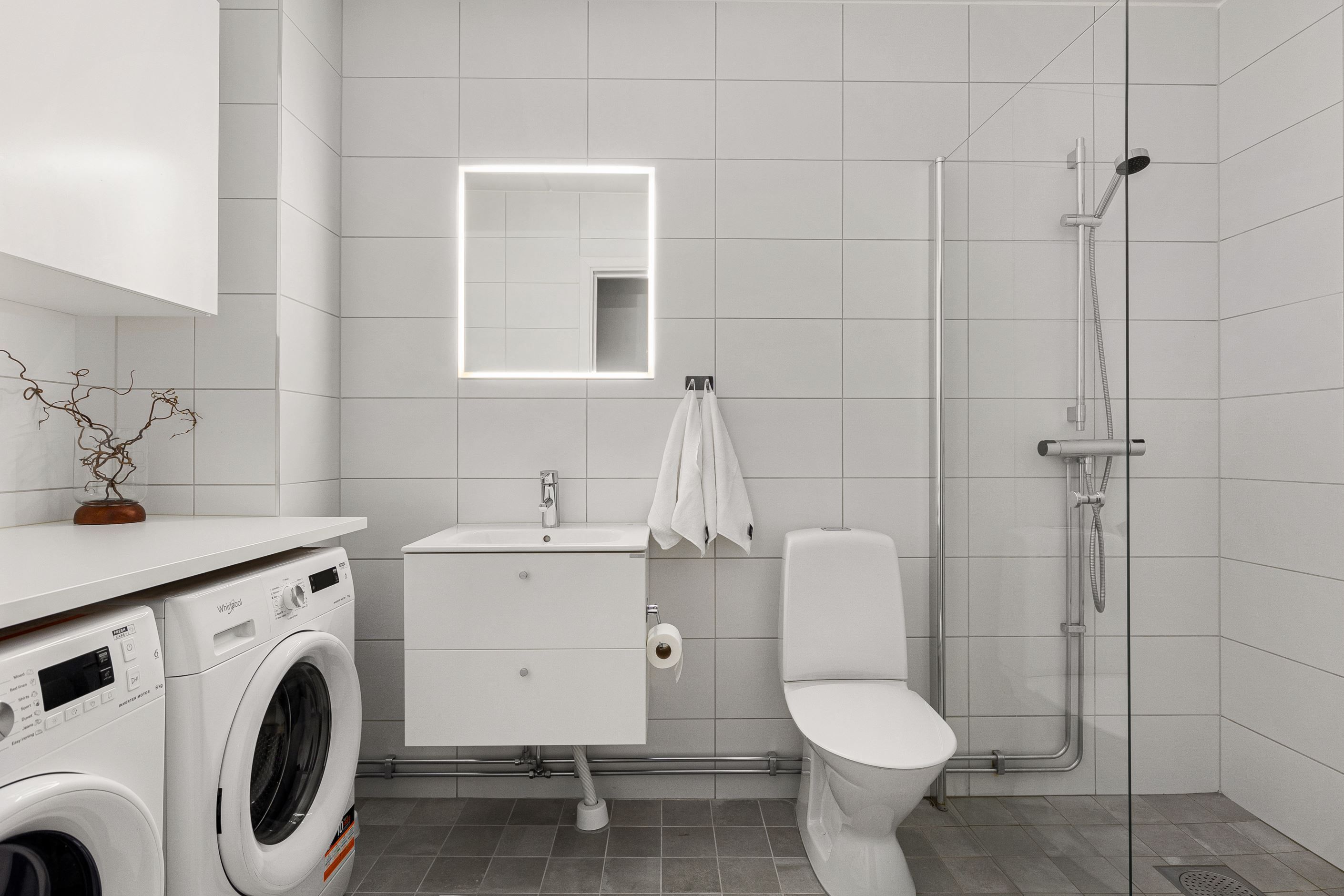 Invändigt möts du av ett stilrent kök från Ballingslöv med varmgrå luckor, köksö och rostfria vitvaror. Badrummet är smakfullt utformat med grå klinker, vita kakelplattor från Höganäs samt tvättmaskin och torktumlare från Whirlpool med praktisk arbetsbänk och förvaring ovan. Genomgående ljus ekparkett och vitmålade väggar skapar en ren och harmonisk känsla i hela hemmet. Här finns dessutom gott om förvaring med både förråd i lägenheten och flertalet garderober.