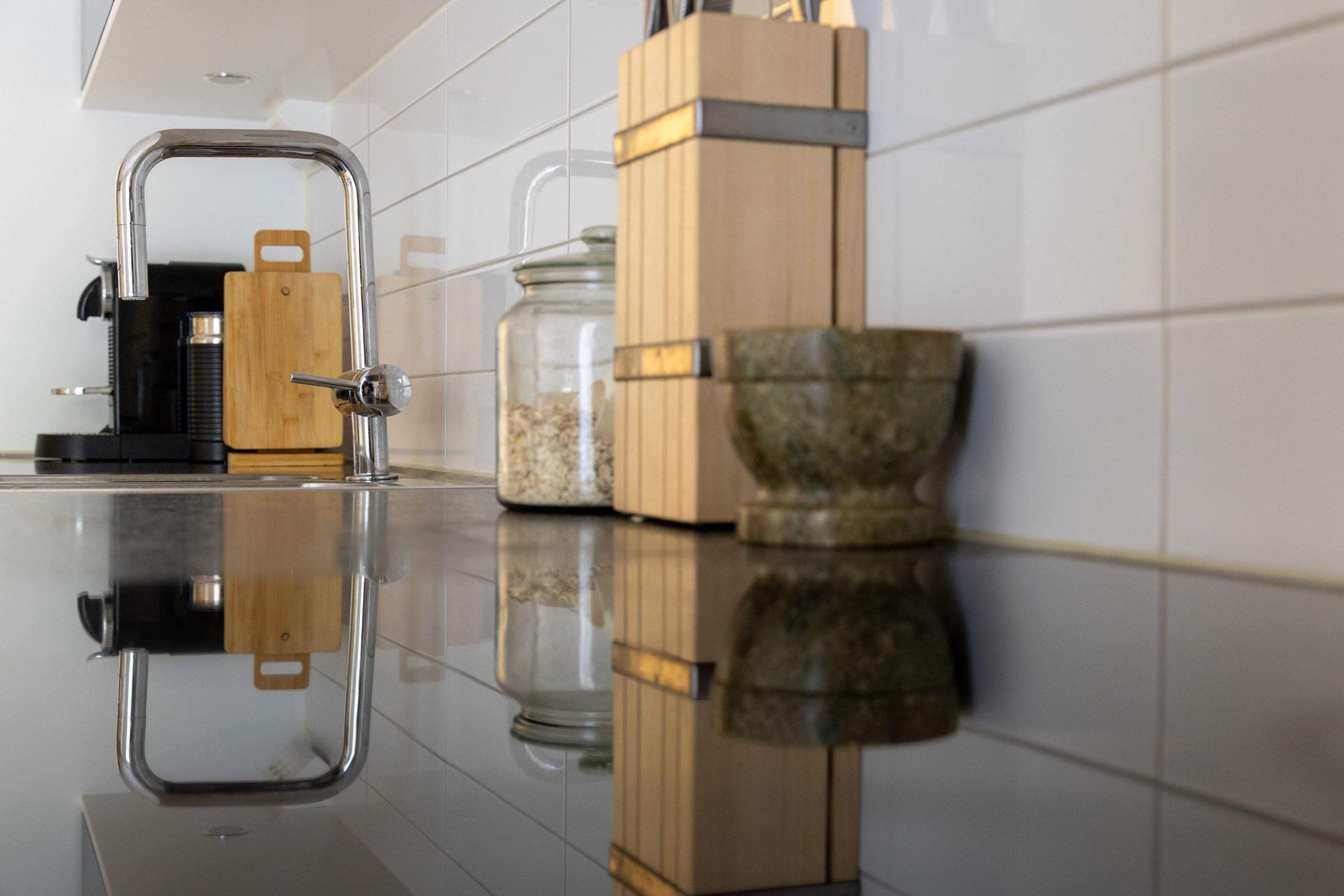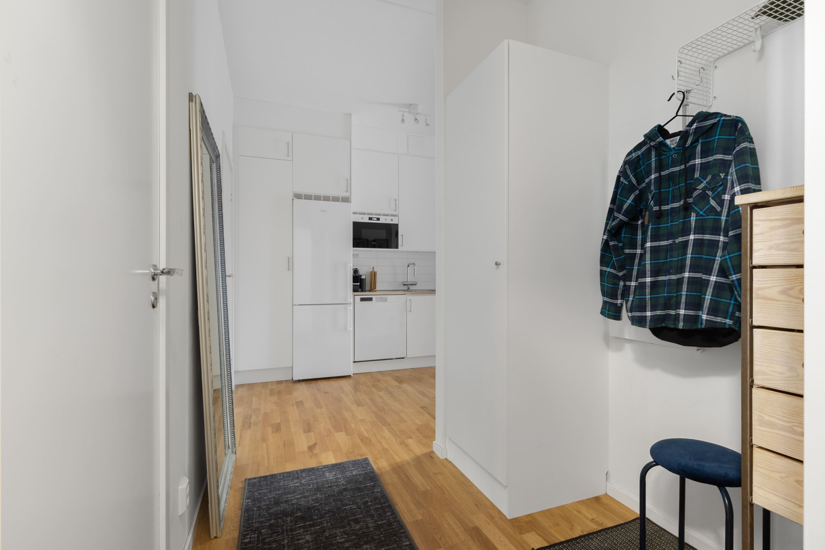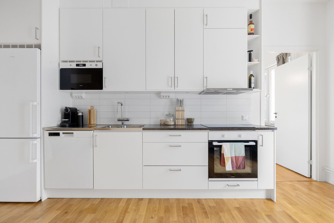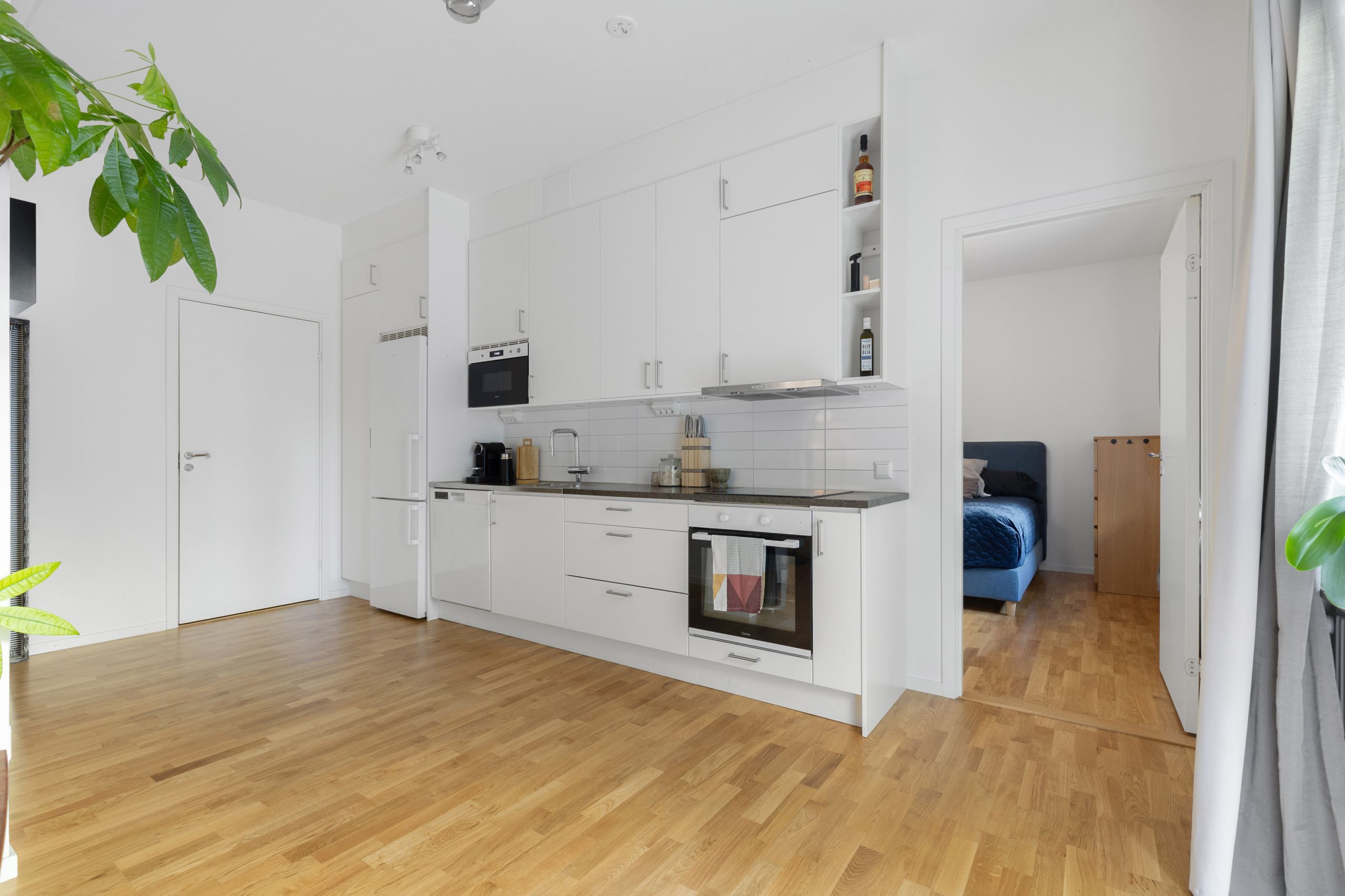 Det smakfulla köket är fullt utrustat med moderna vitvaror, generösa arbetsytor och gott om förvaring perfekt för både vardagsmatlagning och middagar med vänner. Köket ligger i öppen anslutning till vardagsrummet, vilket ger en naturlig samlingspunkt i hemmet.