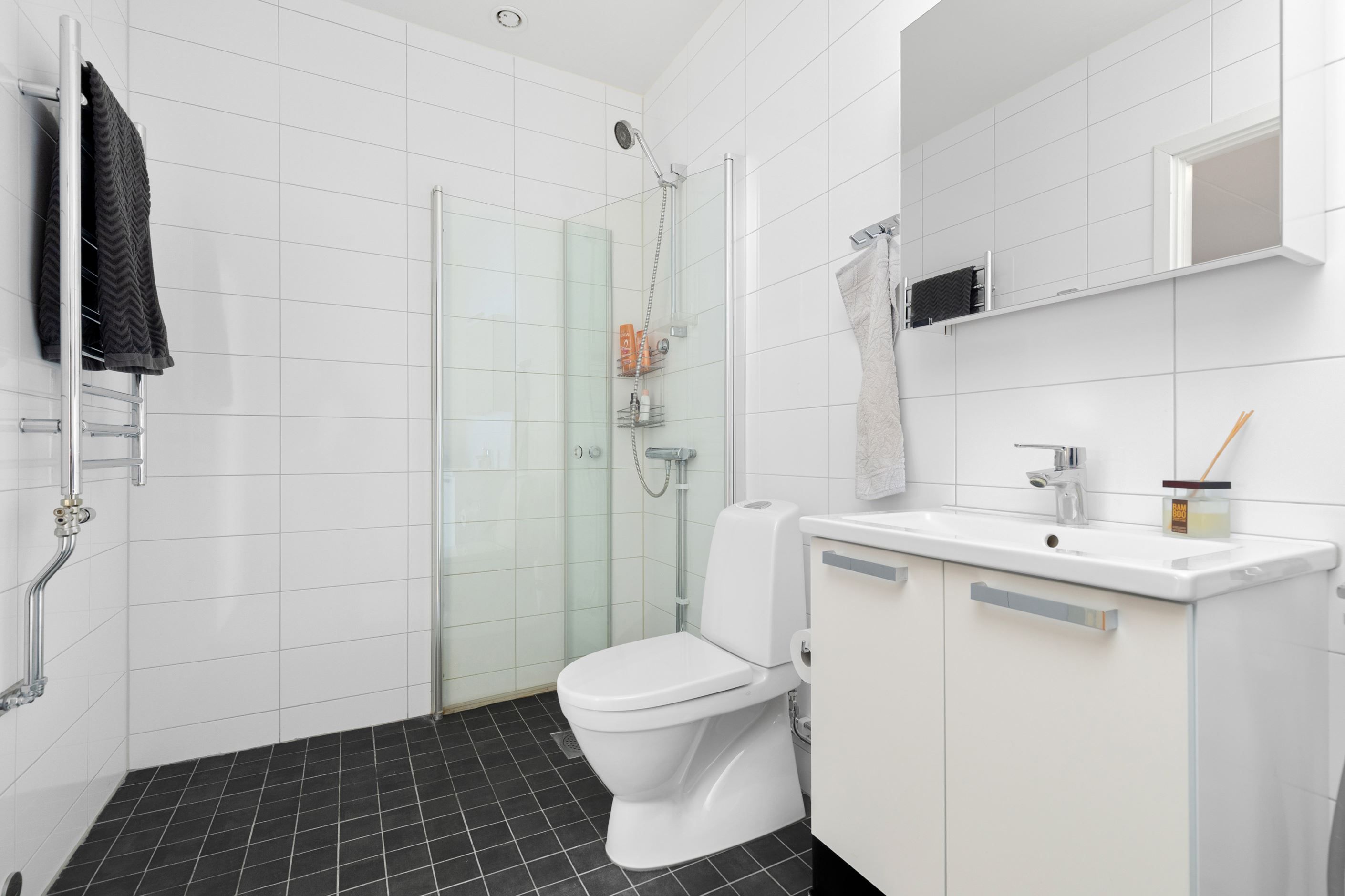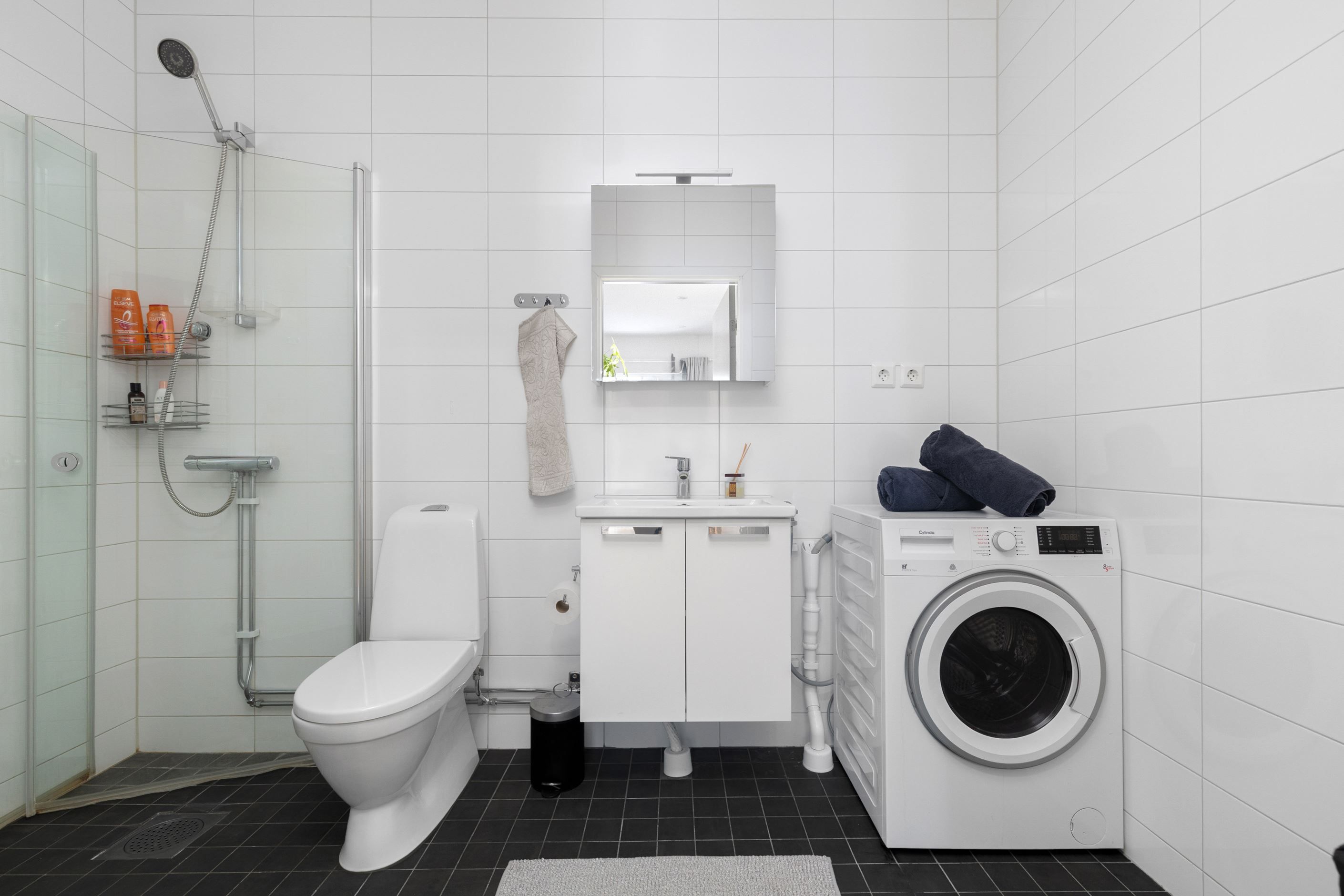 Det helkaklade badrummet är modernt och fräscht, utrustat med full maskinell utrustning.