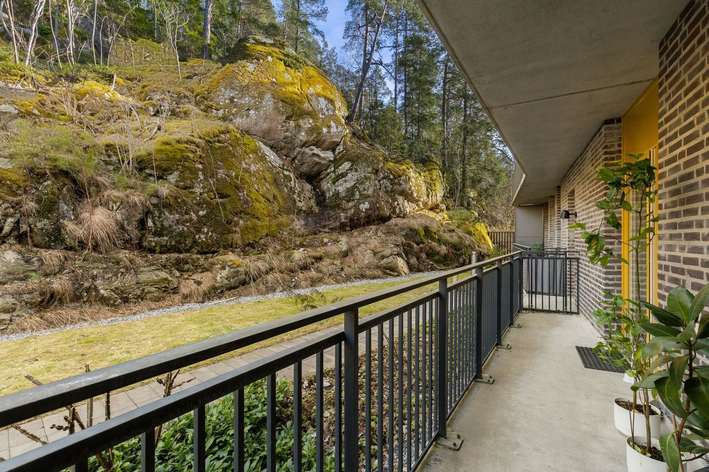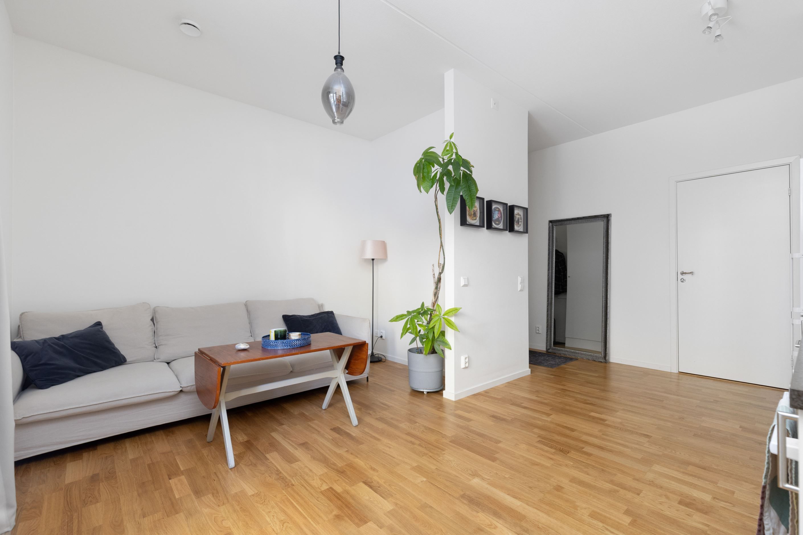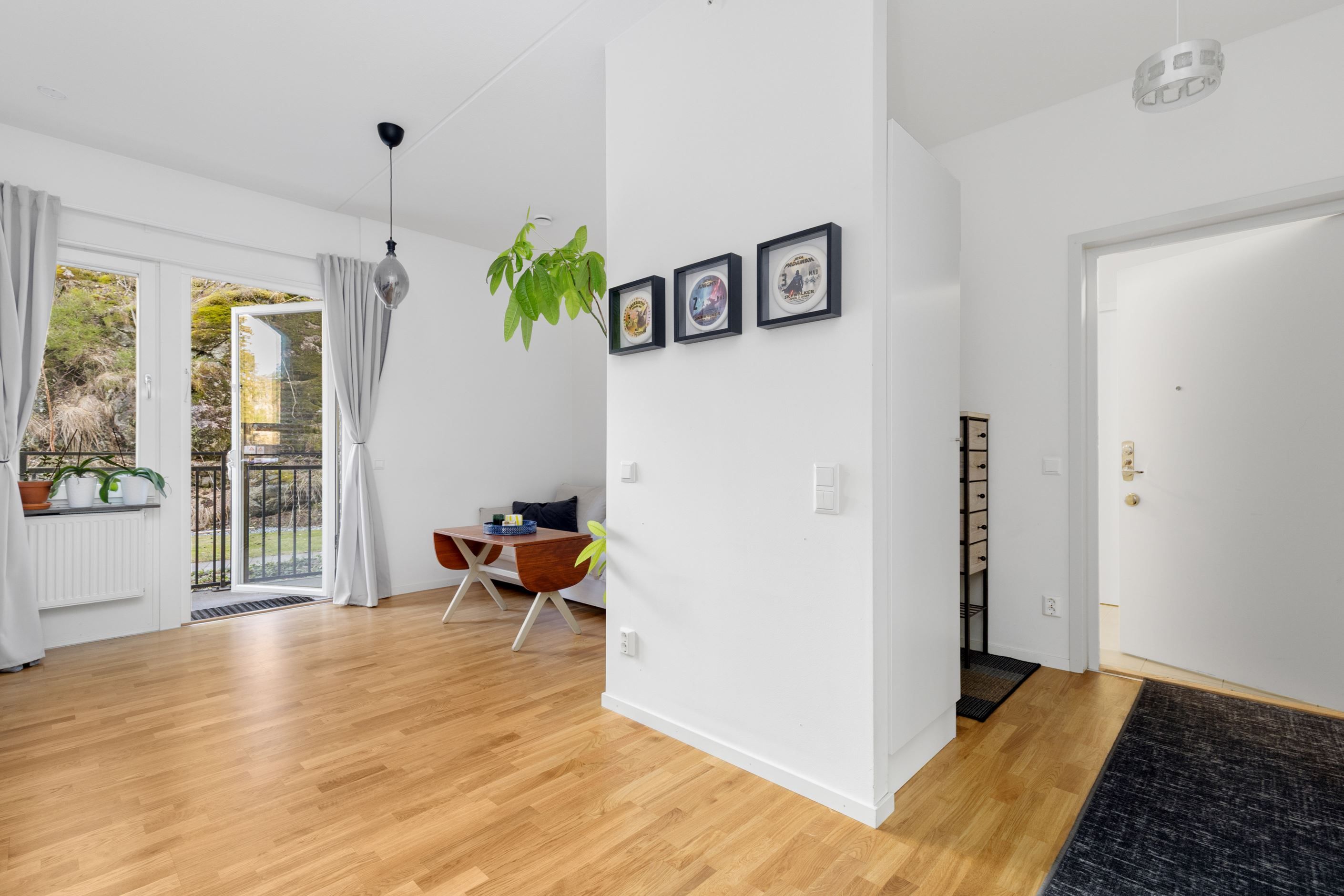 Vardagsrummet är ljust och lättmöblerat med plats för både soffgrupp och matplats. Härifrån nås bostadens stora plus, den egna uteplatsen i markplan, som förlänger bostaden under årets varmare månader och erbjuder en härlig plats för avkoppling.