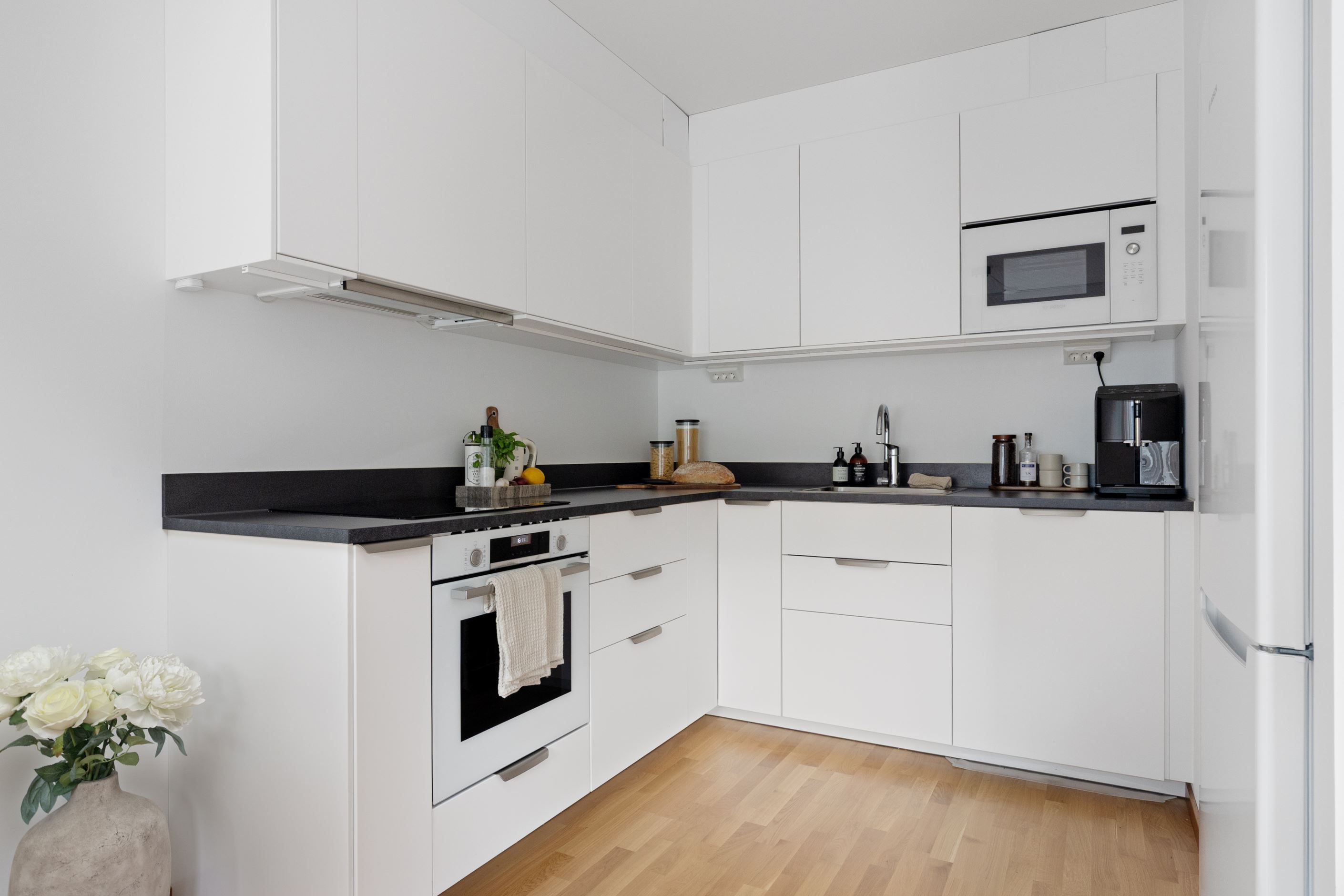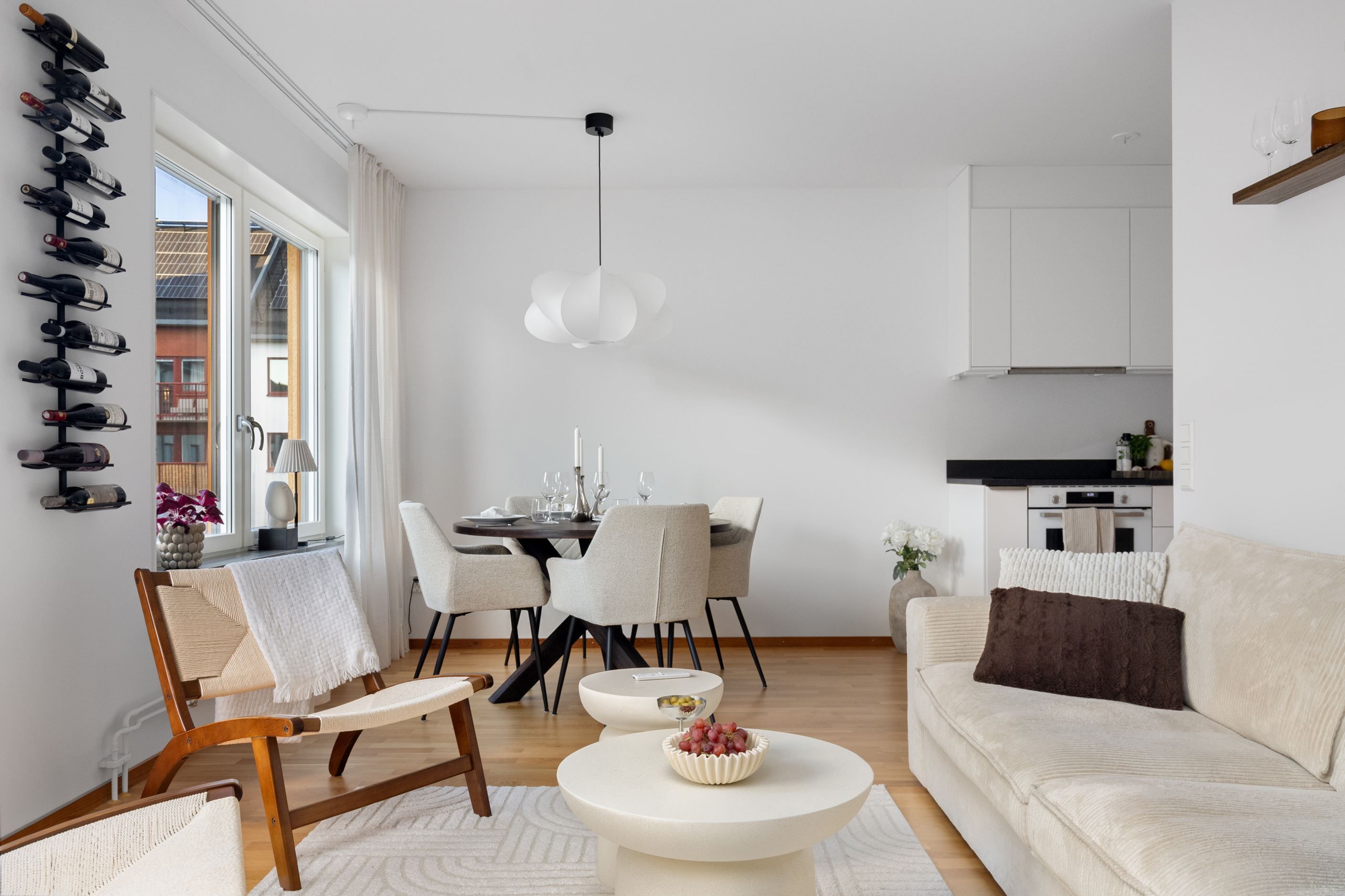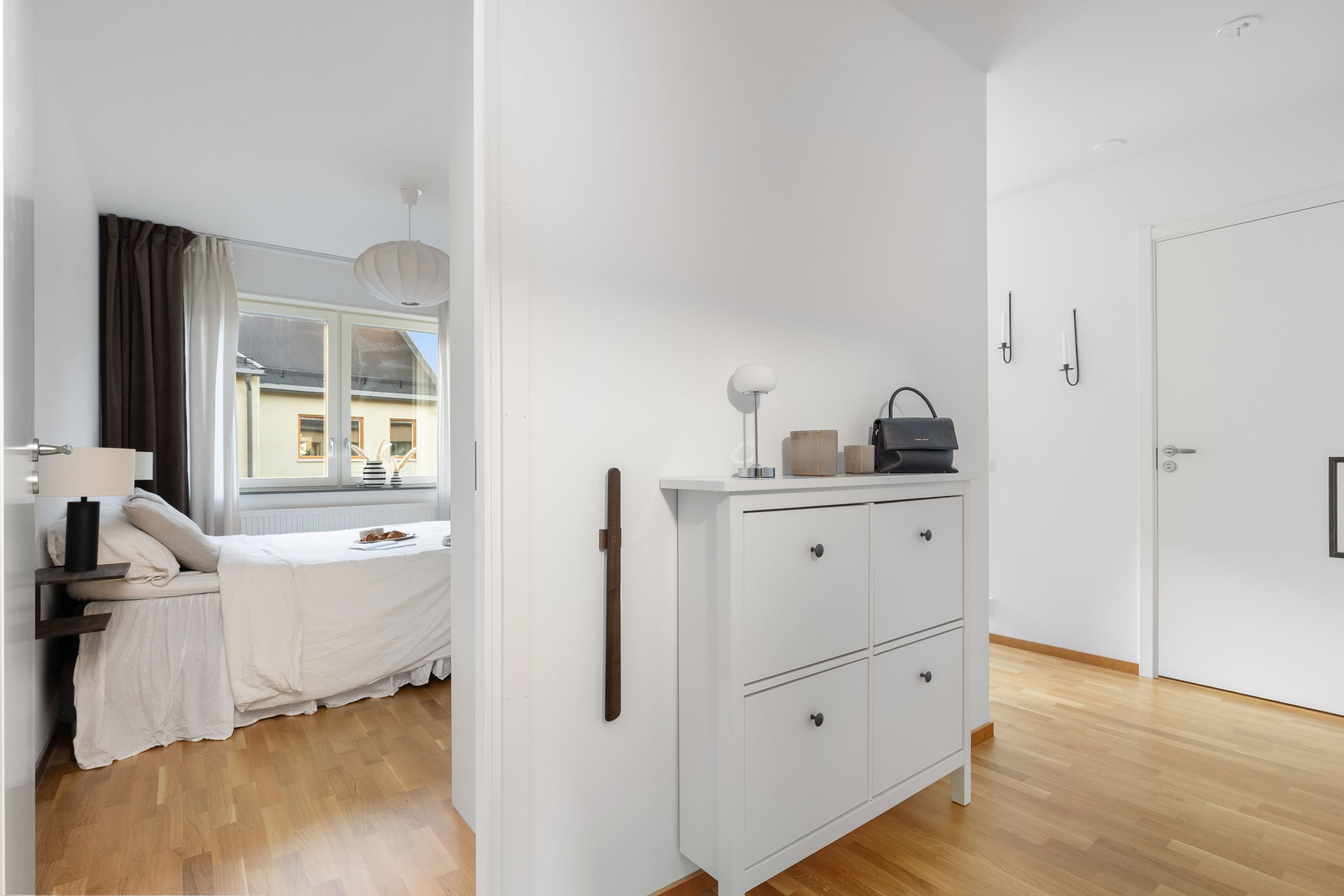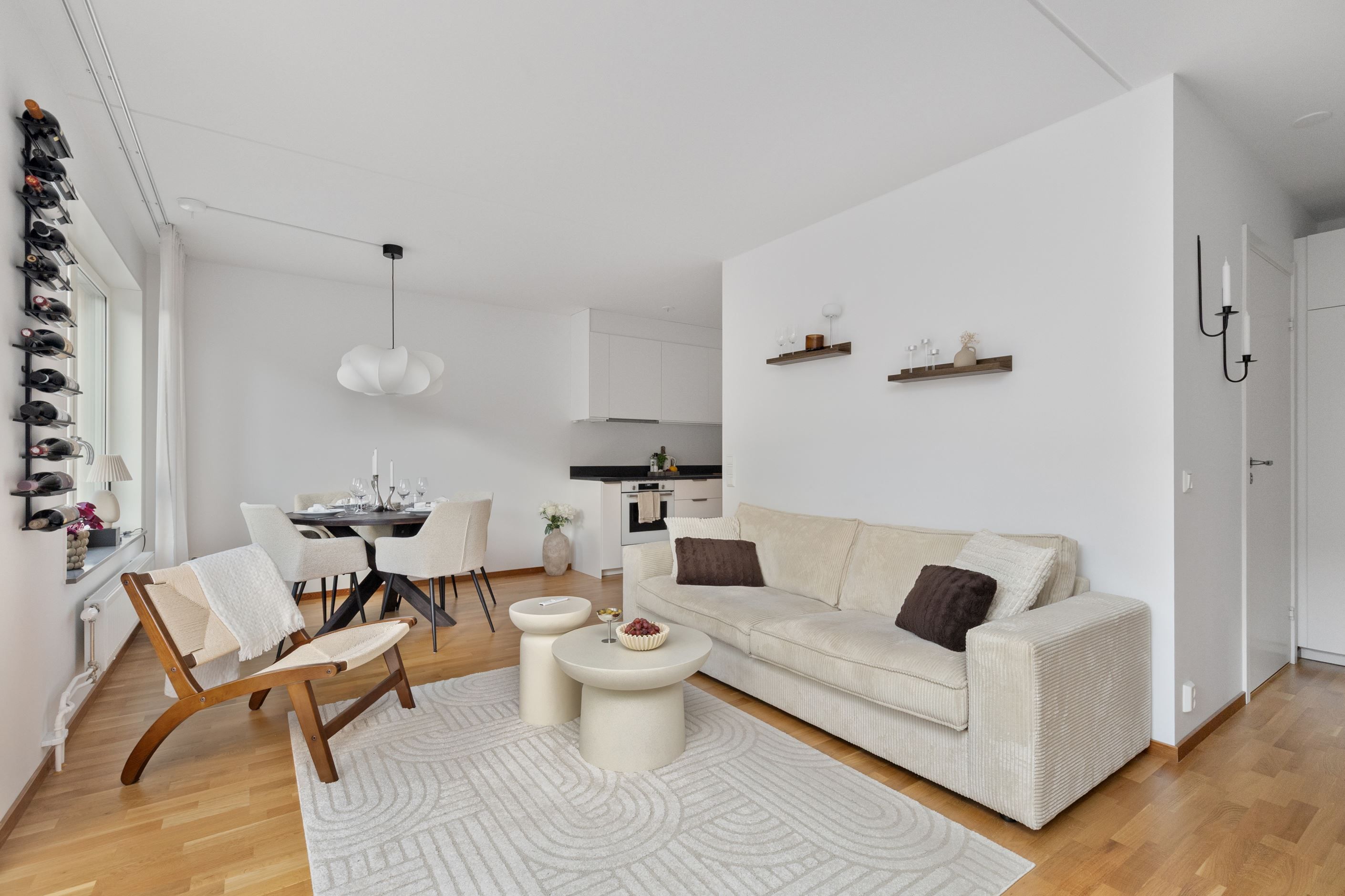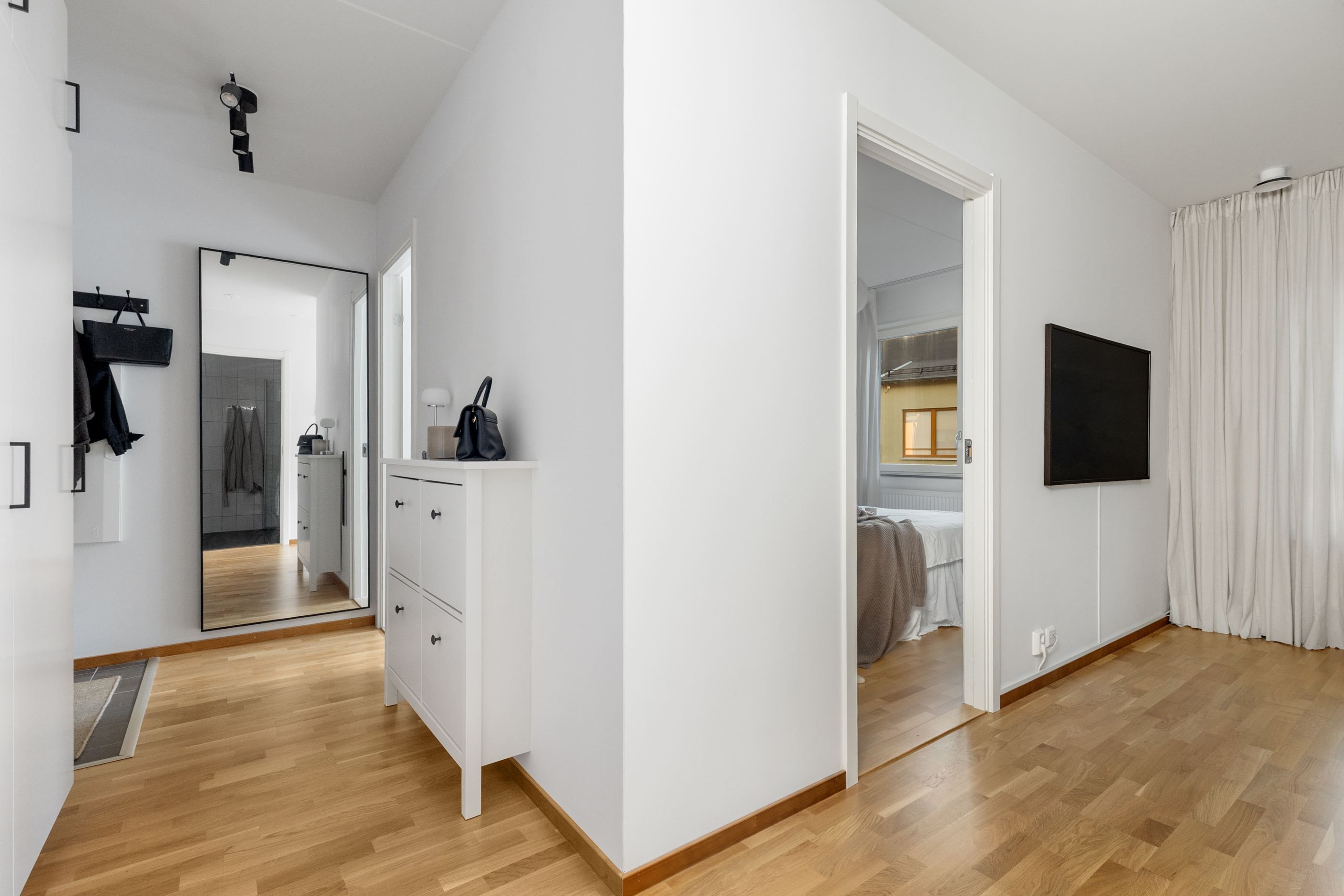 Här möts du av en inbjudande hall med klinkergolv och stilren ekparkett som sträcker sig genom hela bostaden. Gott om förvaring i garderober och städskåp. Köket är stilrent, med vita luckor, mörk bänkskiva och integrerade vitvaror. Här finns gott om arbetsytor och plats för matbord. Köket är öppet mot vardagsrummet som rymmer både stor soffgrupp med mera – en social yta med ett härligt ljusinsläpp från stora fönsterpartier. Sovrummet är rymligt med plats för dubbelsäng, och här finns en praktisk garderob. Det helkaklade badrummet är utrustat med duschhörna, tvättmaskin och tvättskåp – allt i modern och tidlös design med vitt kakel och mörk klinker.