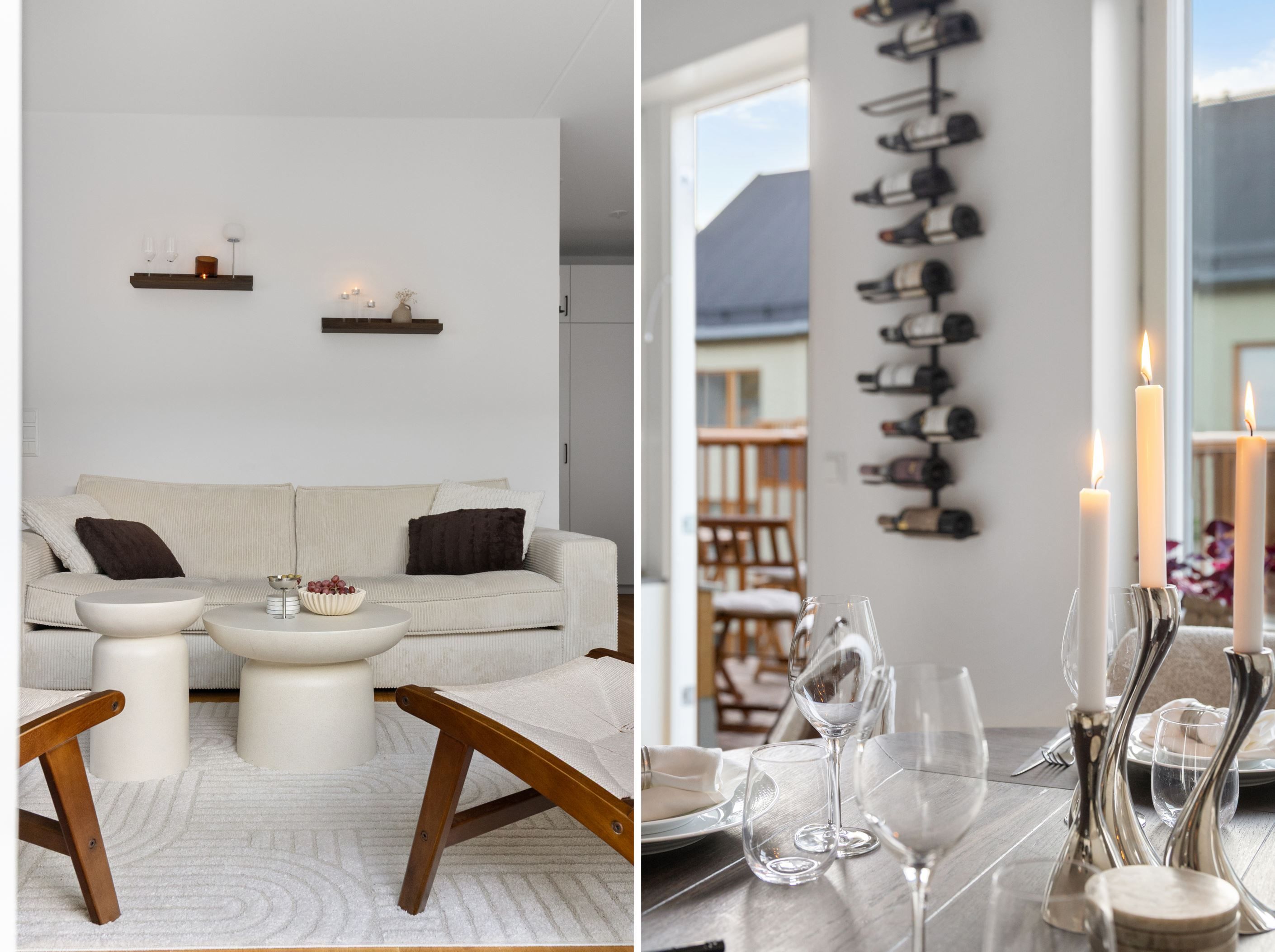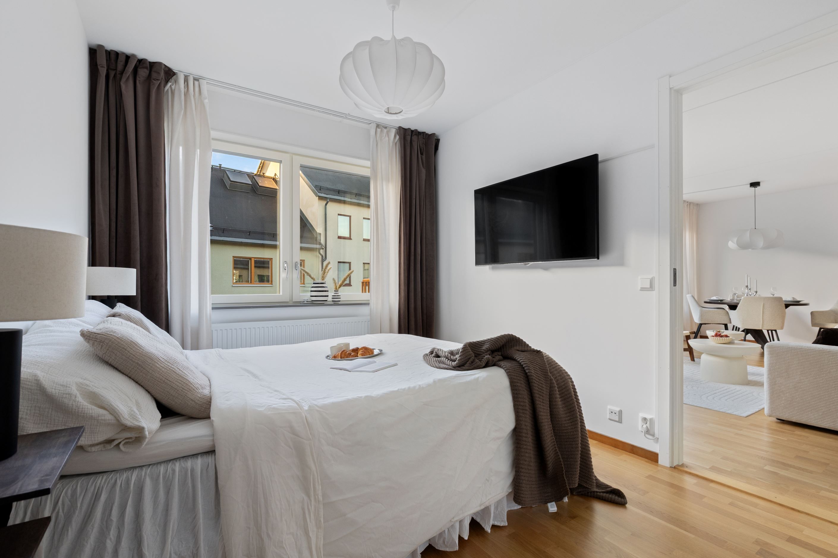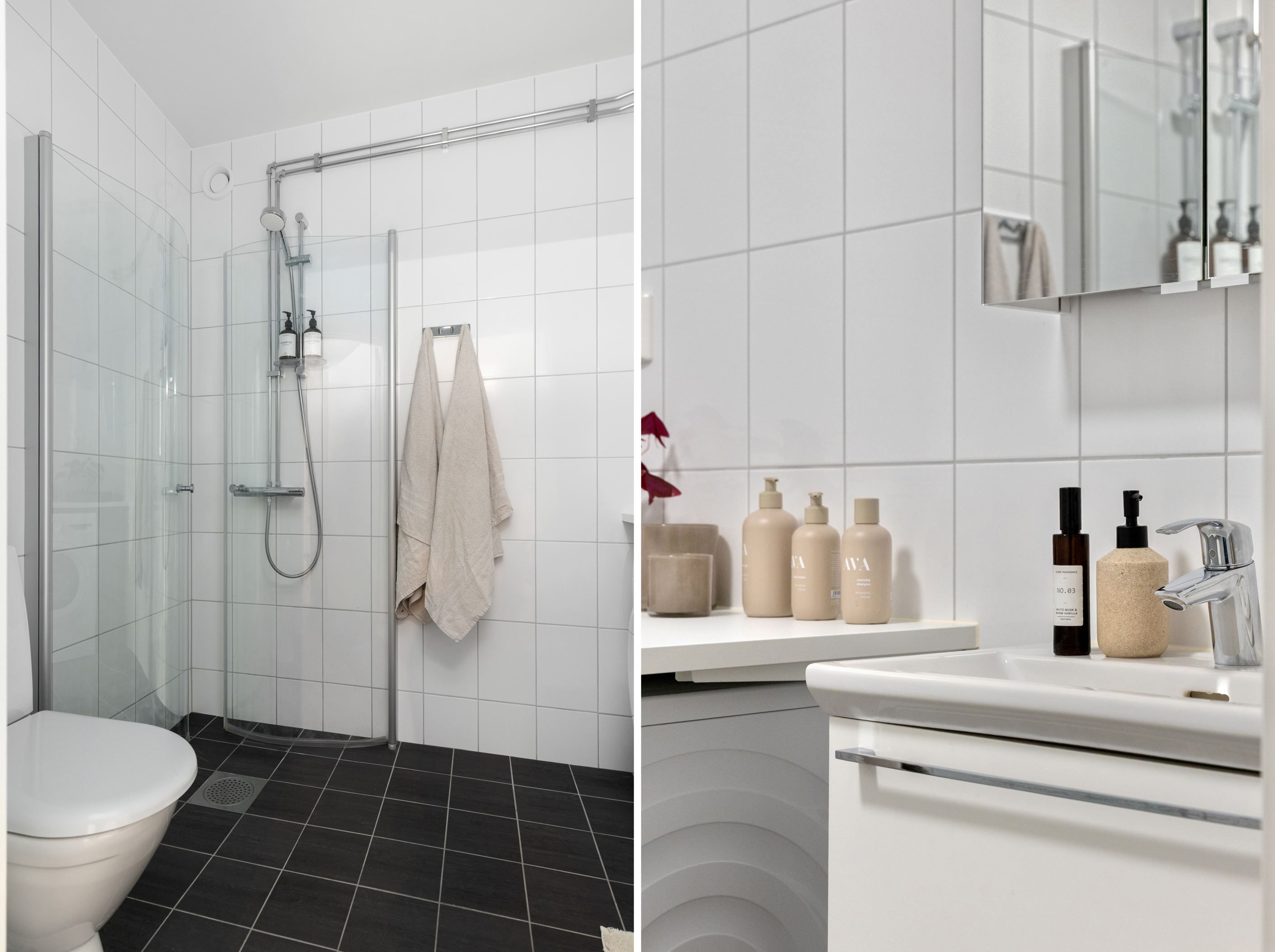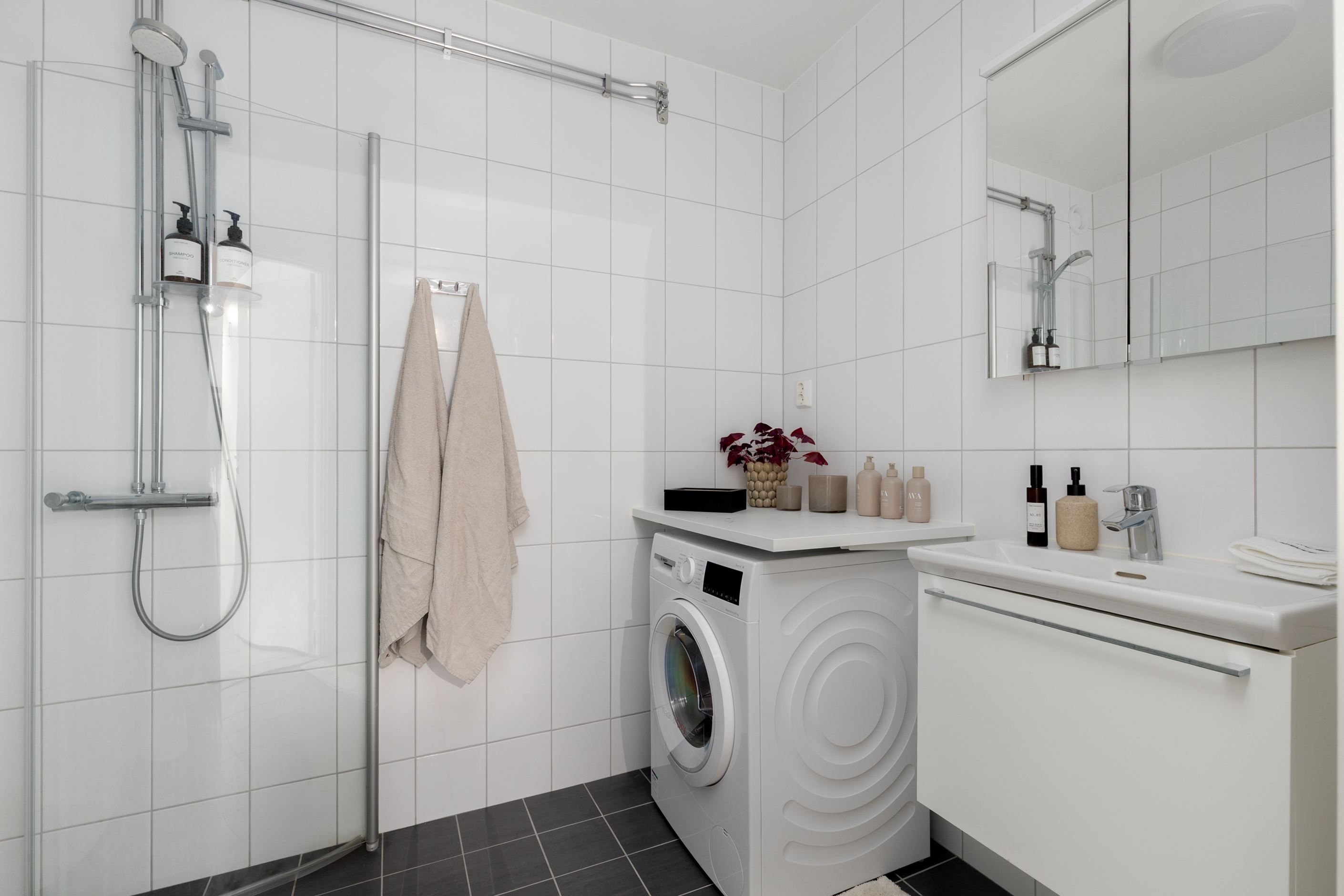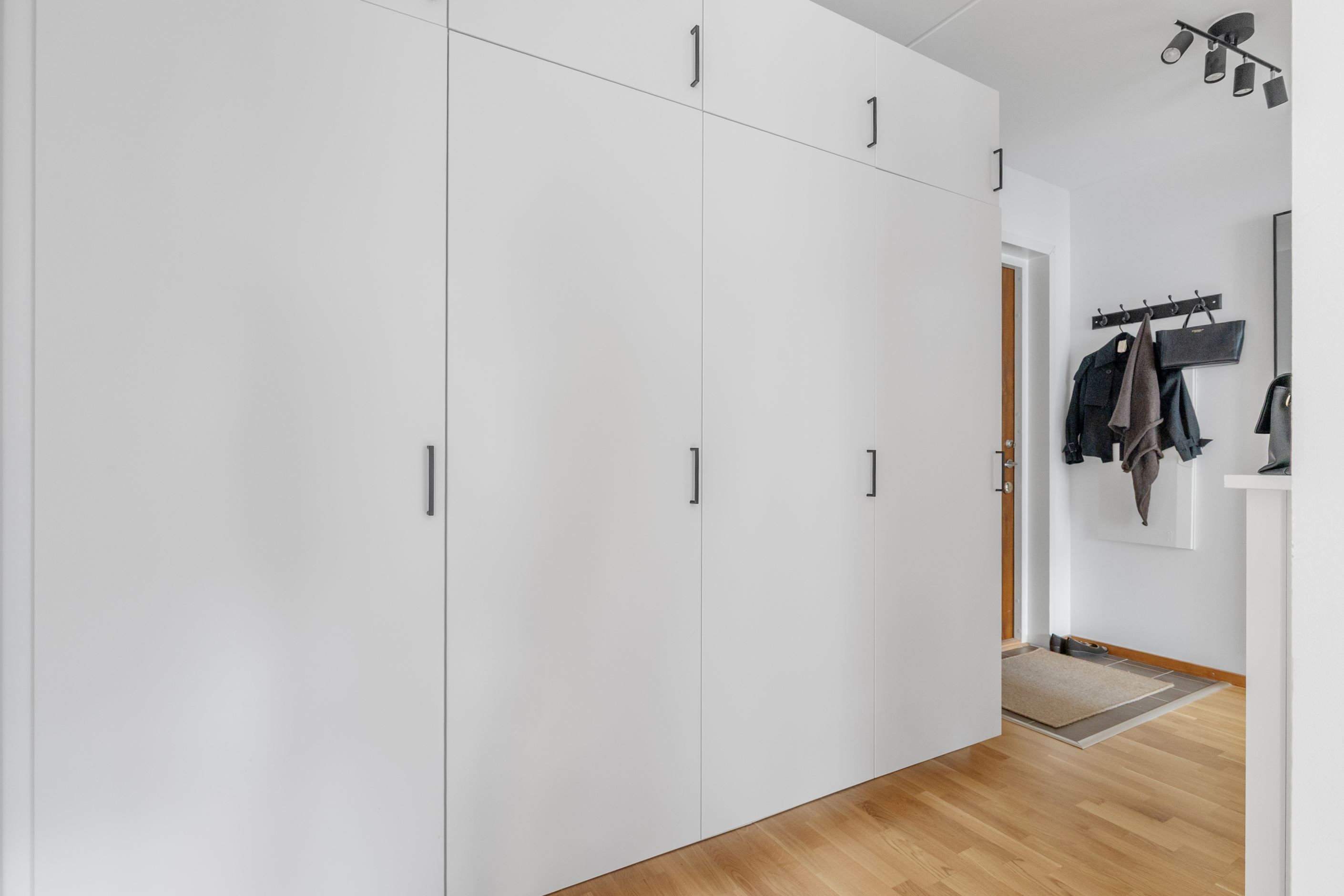 Här möts du av en inbjudande hall med klinkergolv och stilren ekparkett som sträcker sig genom hela bostaden. Gott om förvaring i garderober och städskåp. Köket är stilrent, med vita luckor, mörk bänkskiva och integrerade vitvaror. Här finns gott om arbetsytor och plats för matbord. Köket är öppet mot vardagsrummet som rymmer både stor soffgrupp med mera – en social yta med ett härligt ljusinsläpp från stora fönsterpartier. Sovrummet är rymligt med plats för dubbelsäng, och här finns en praktisk garderob. Det helkaklade badrummet är utrustat med duschhörna, tvättmaskin och tvättskåp – allt i modern och tidlös design med vitt kakel och mörk klinker.