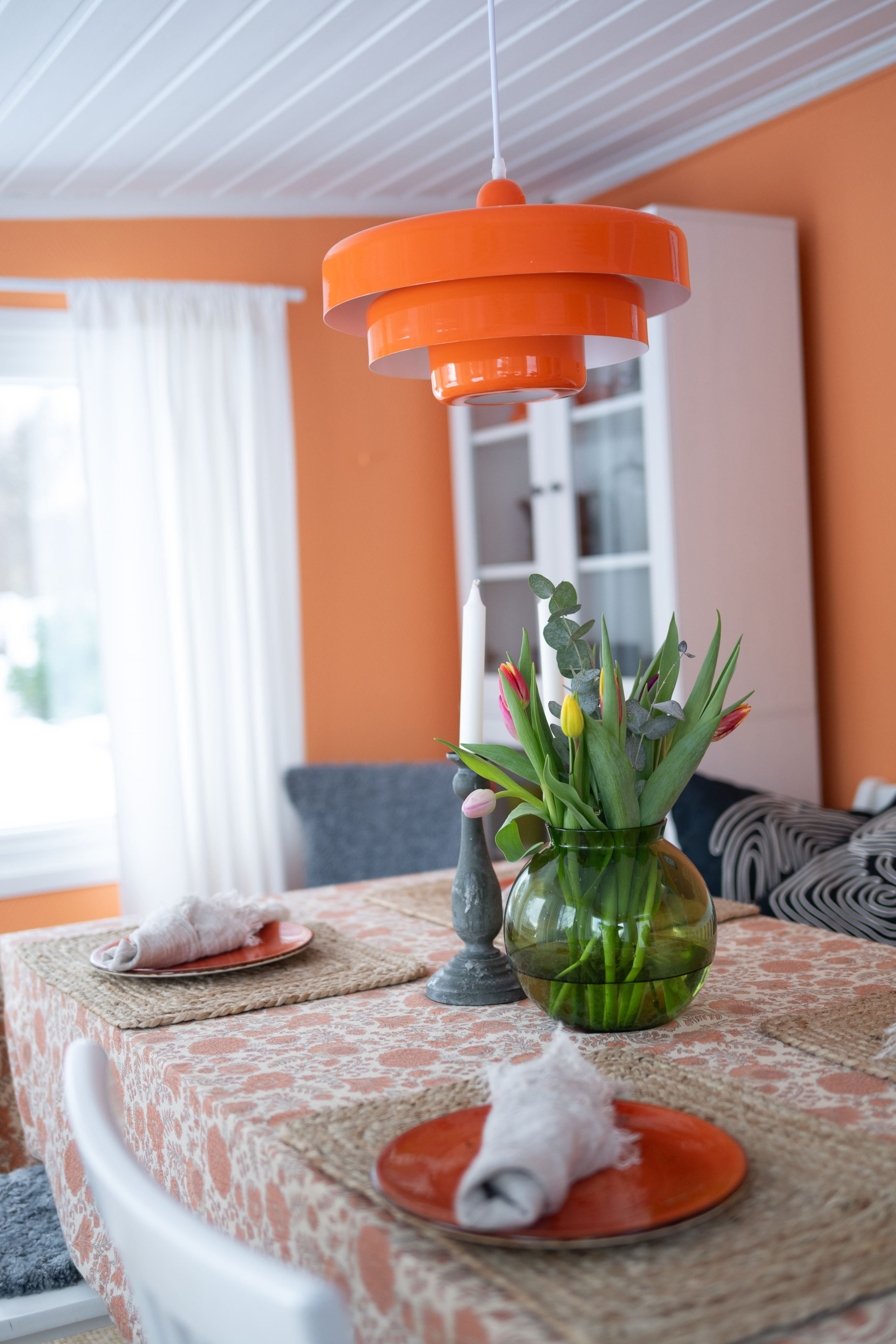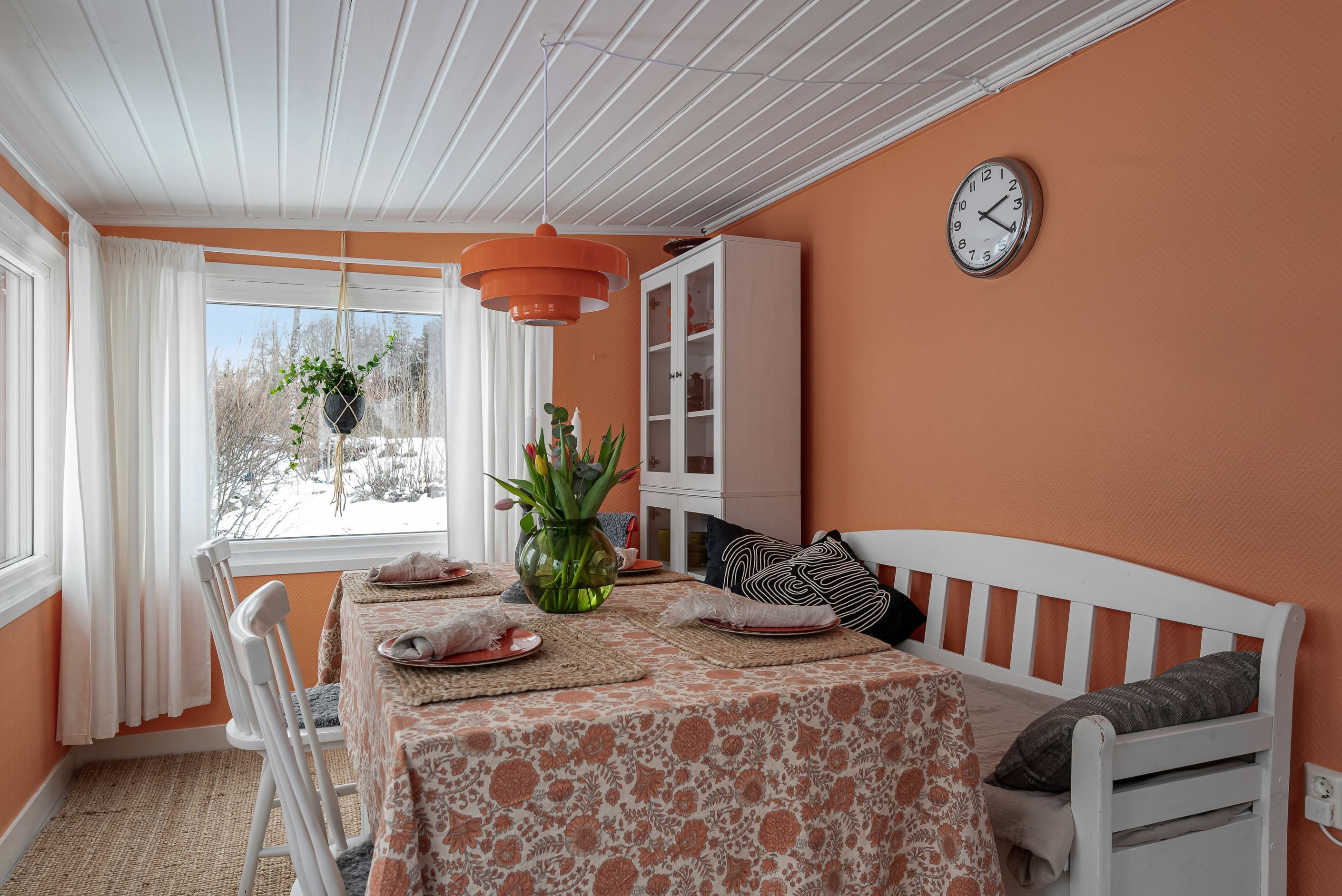 Entre till hall med laminatgolv och målade väggar. Här finns både plats för att hänga av sig ytterkläder och en matplats för 4 personer.