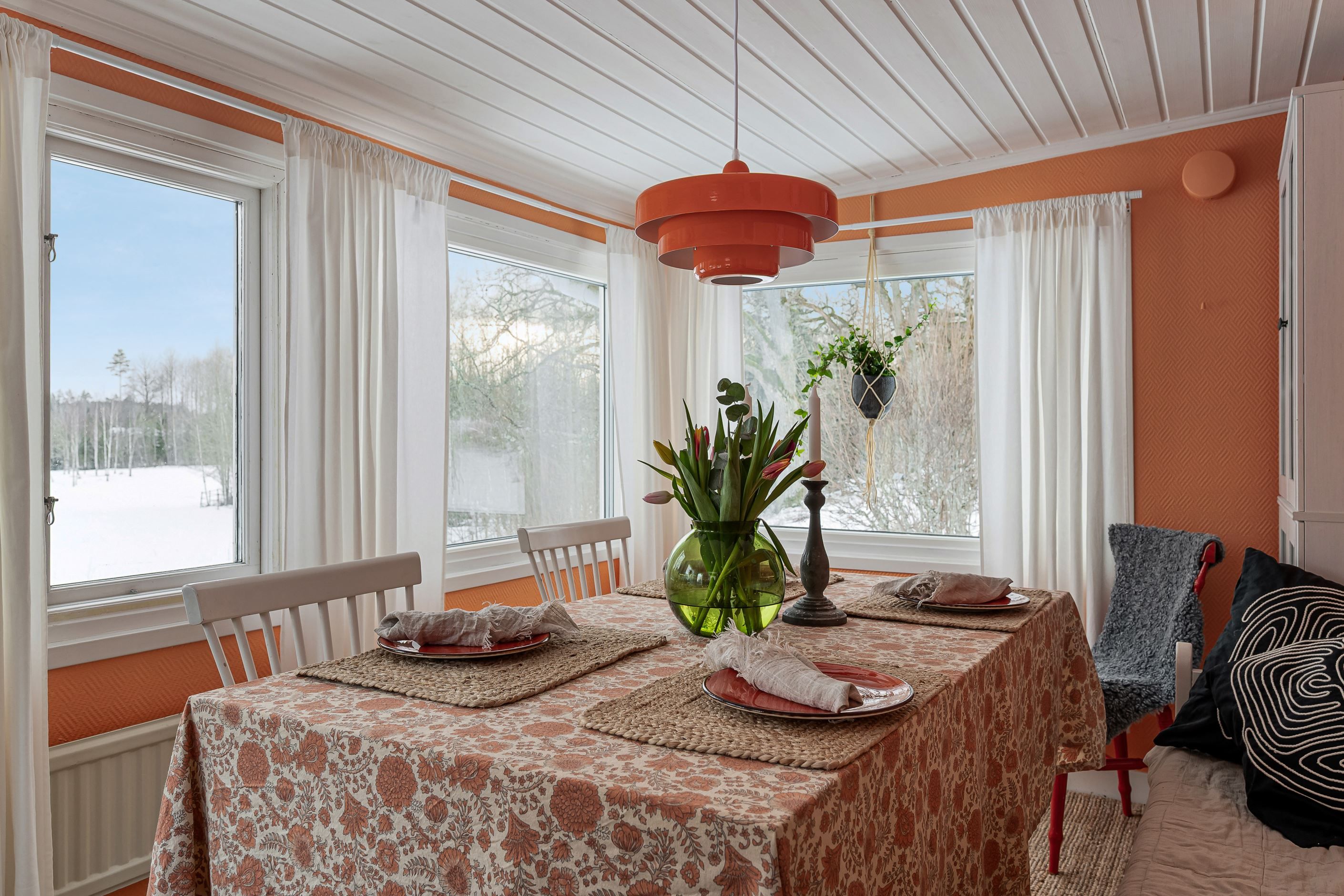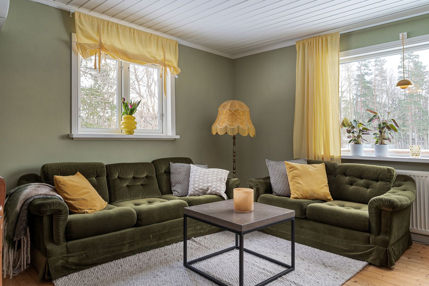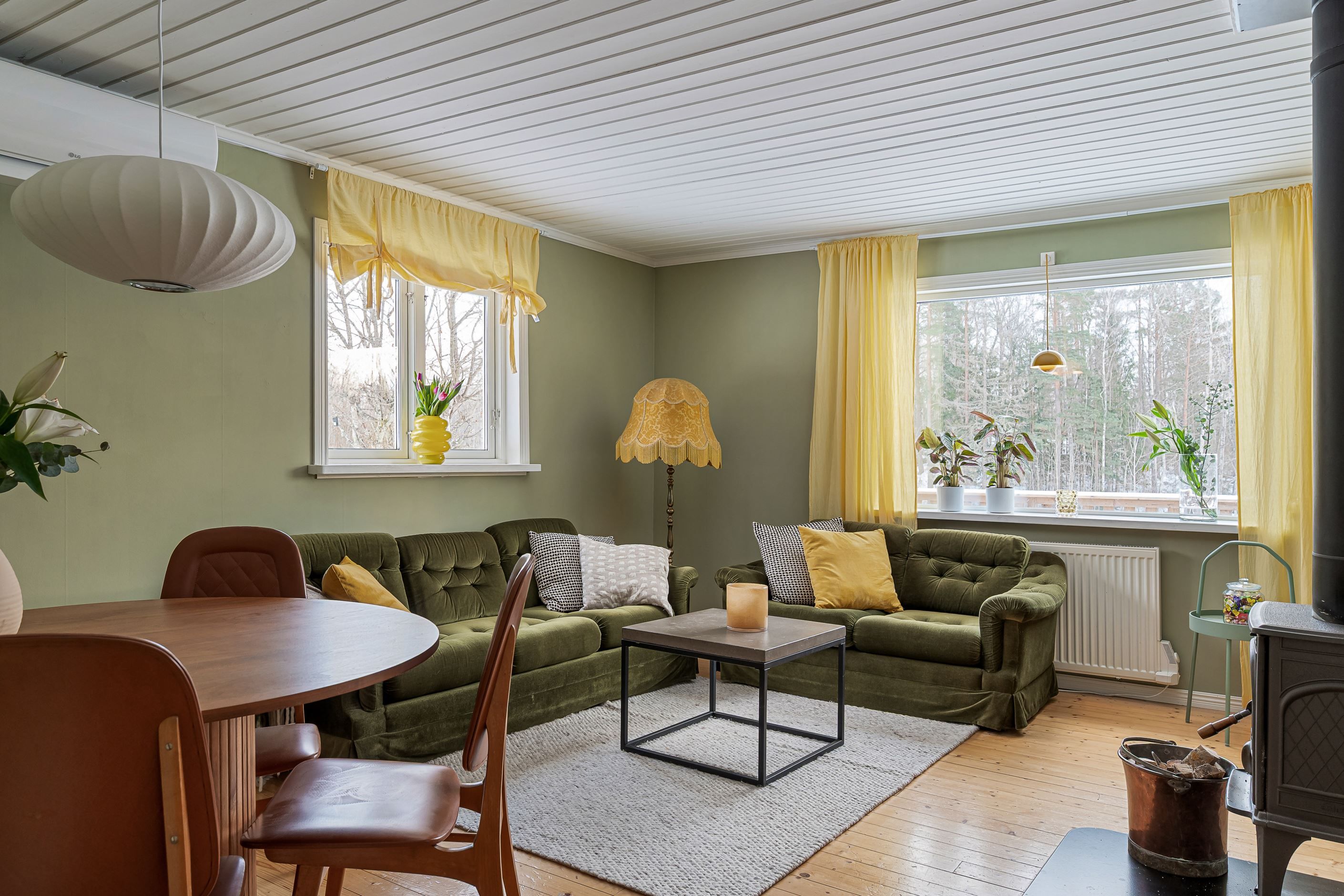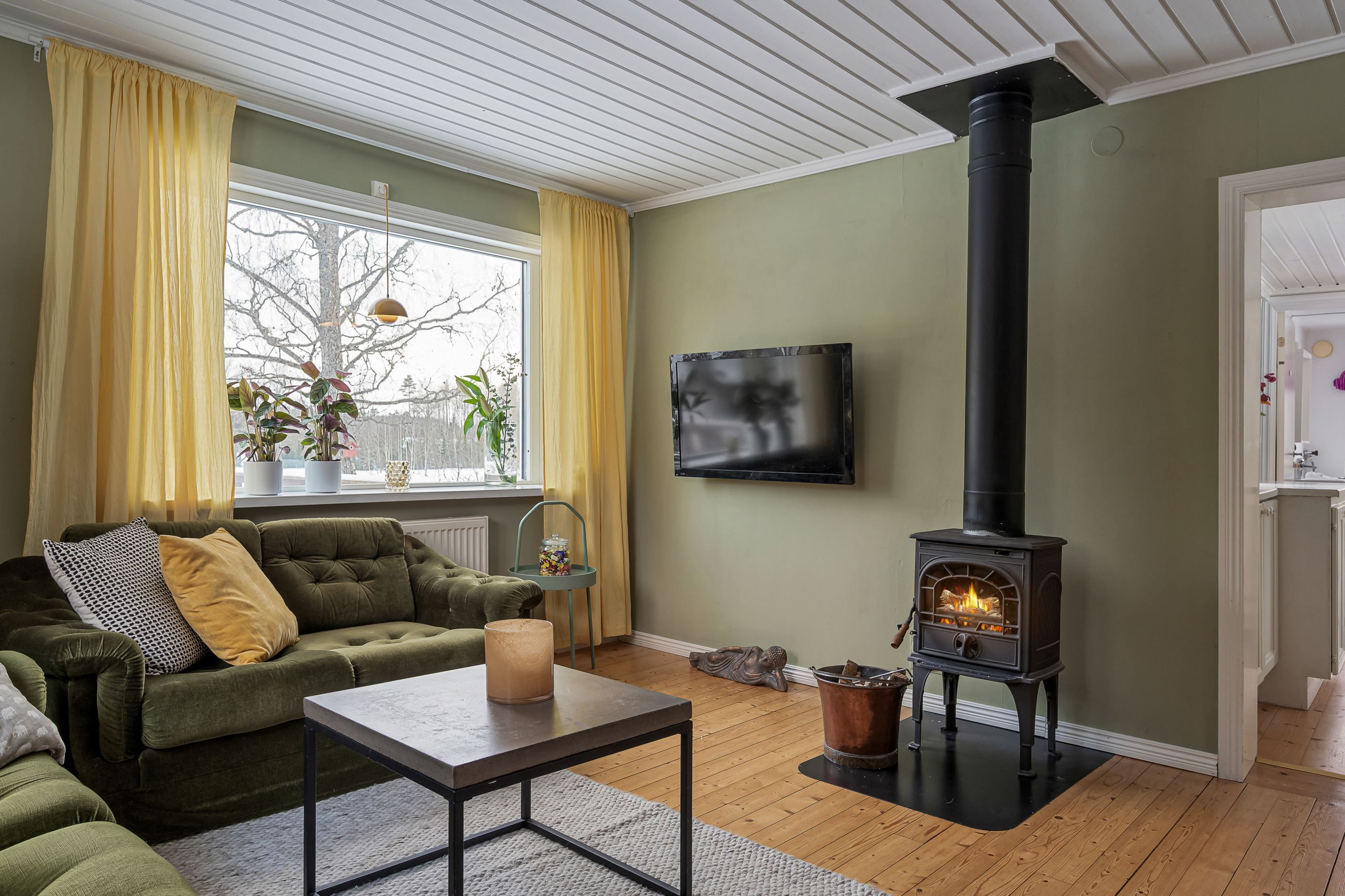 Vardagsrum med trägolv och fönster åt två håll vilket ger fint ljusinsläpp. Här finns såväl husets luft/luftvärmepump som husets kamin. Utanför vardagsrumsfönstret finns en stor härlig altan med fin utsikt över ängarna.