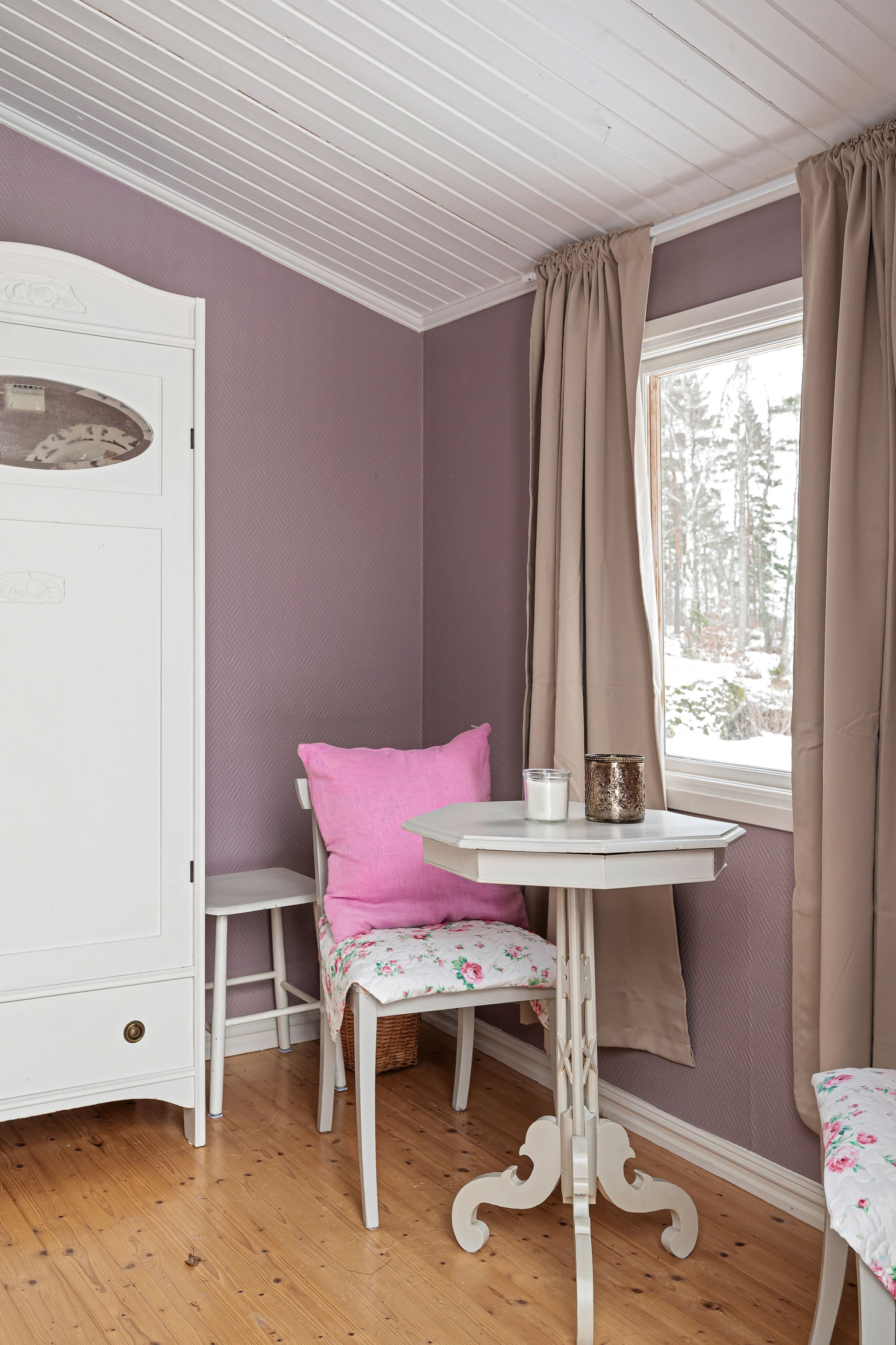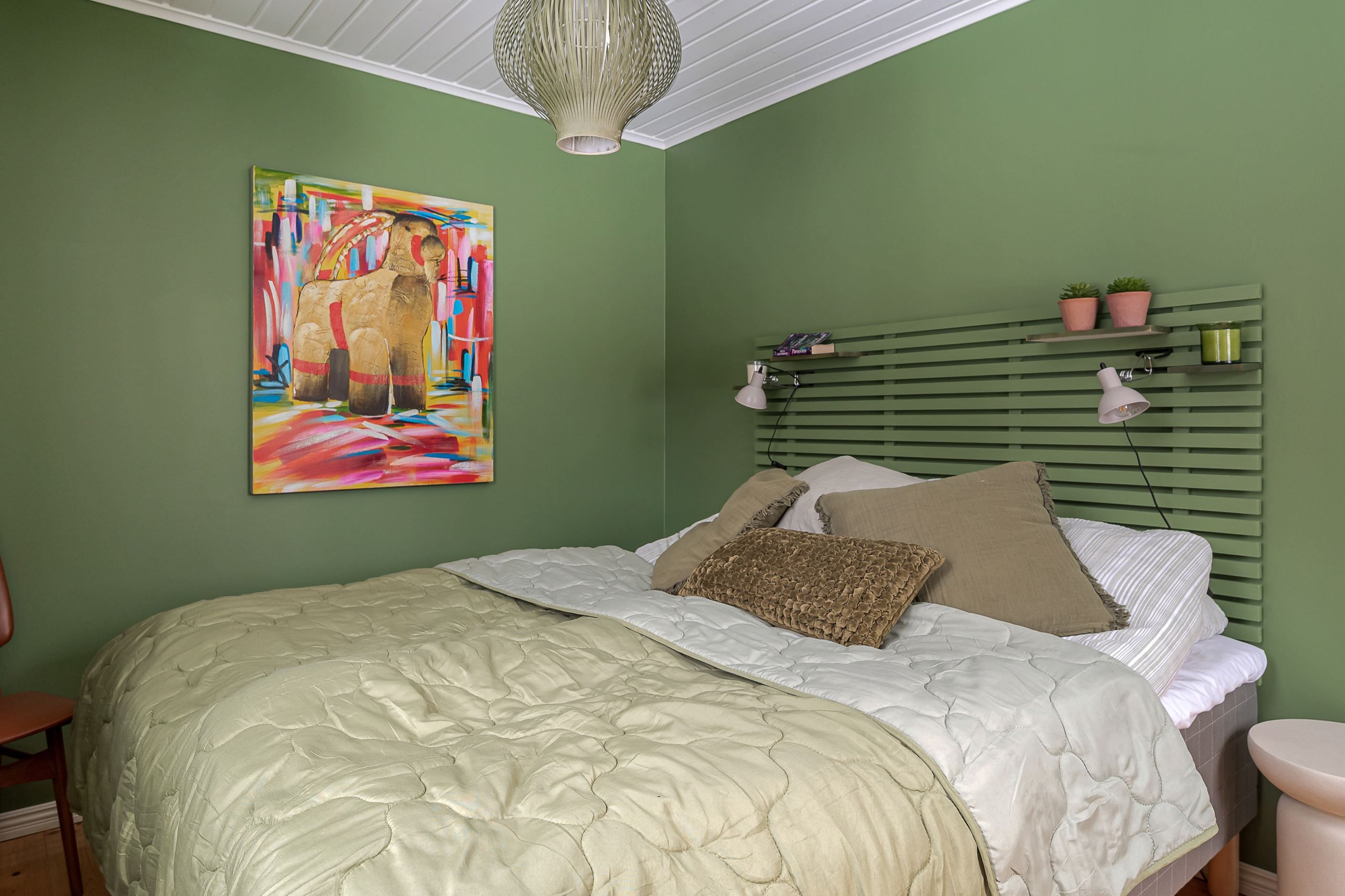 Sovrum med trägolv och målade väggar i mild grön färg. Utgång till en av husets altaner med perfekt möjlighet att bli serverad frukostkaffet rakt ut från köksfönstret.