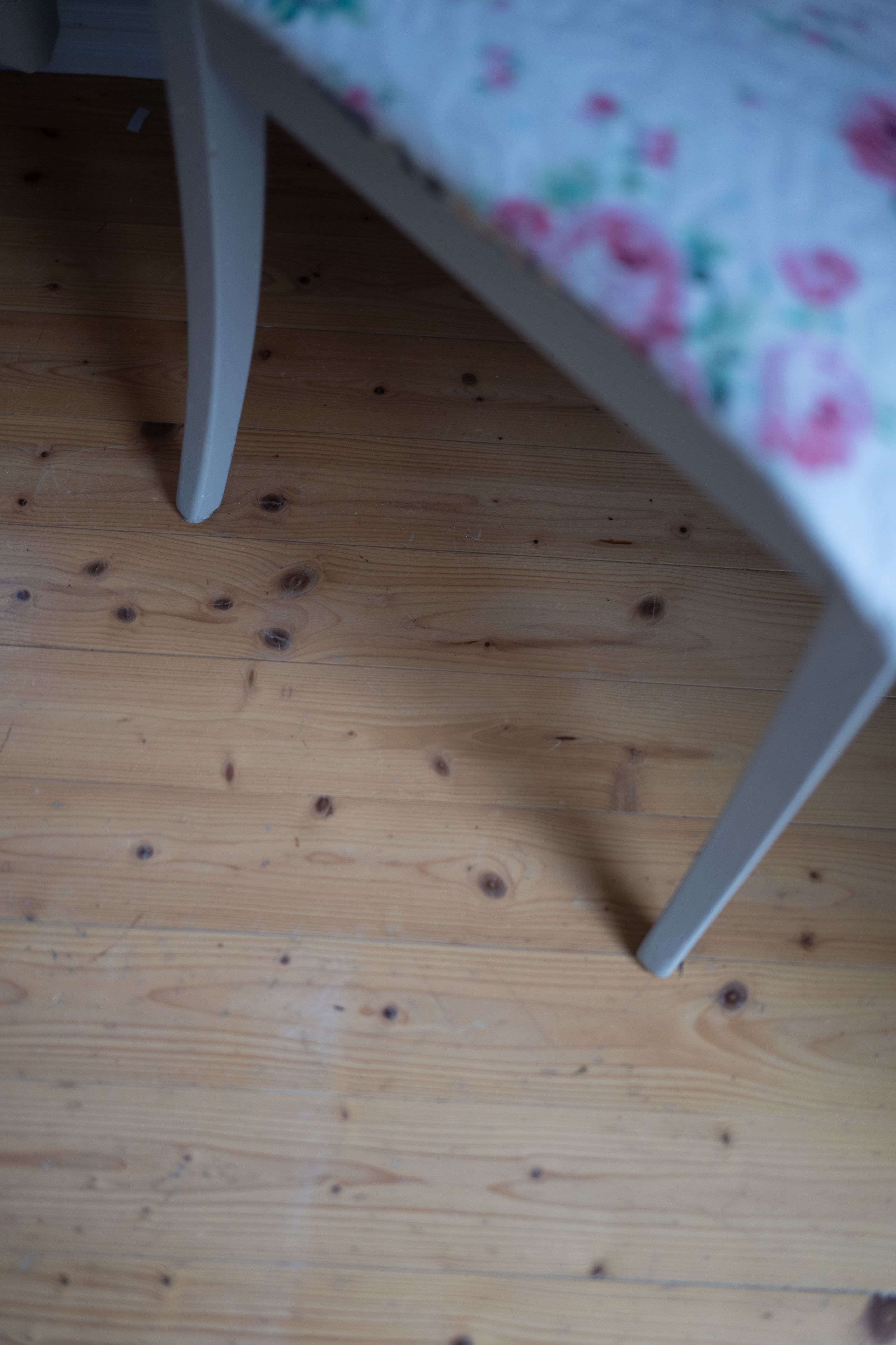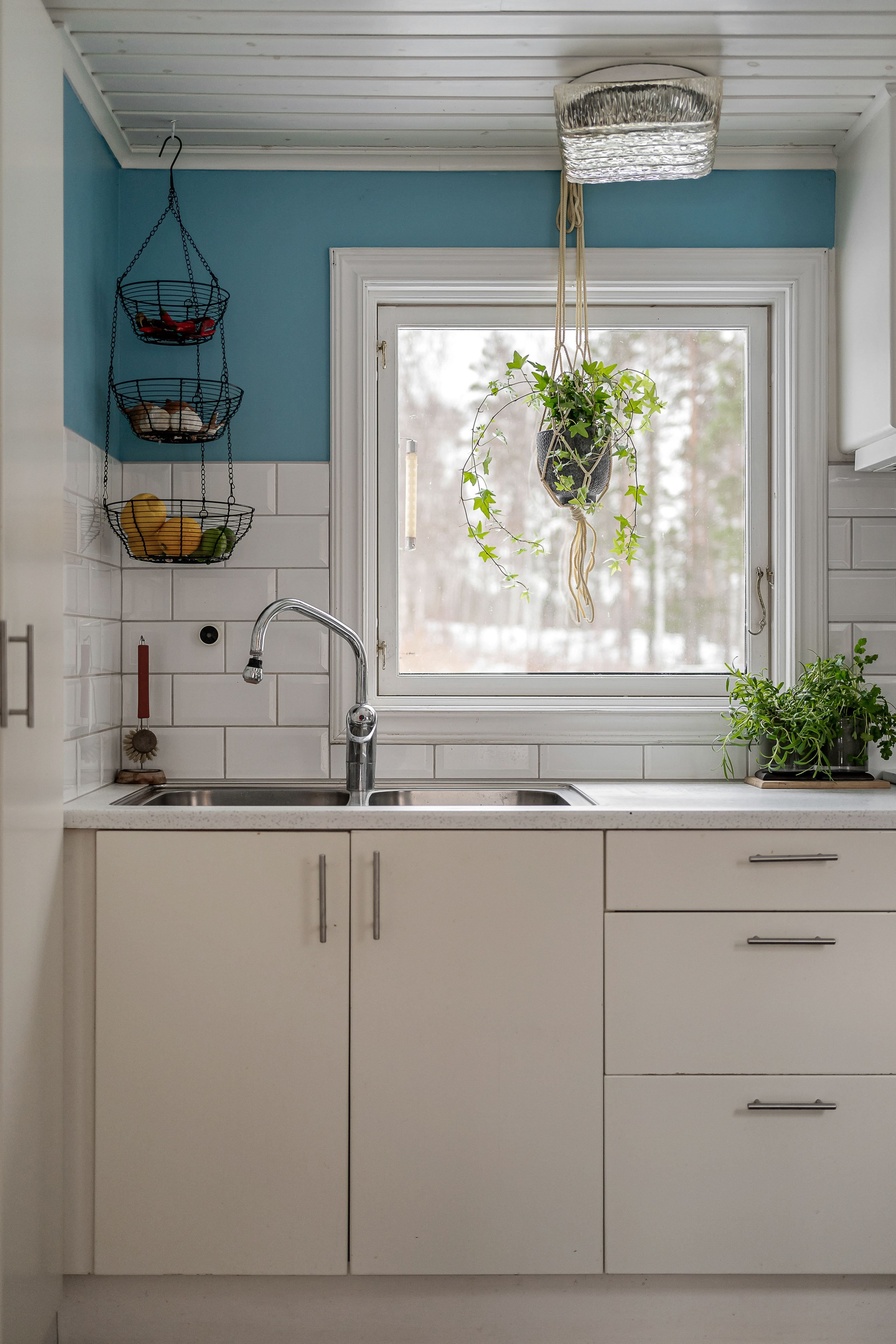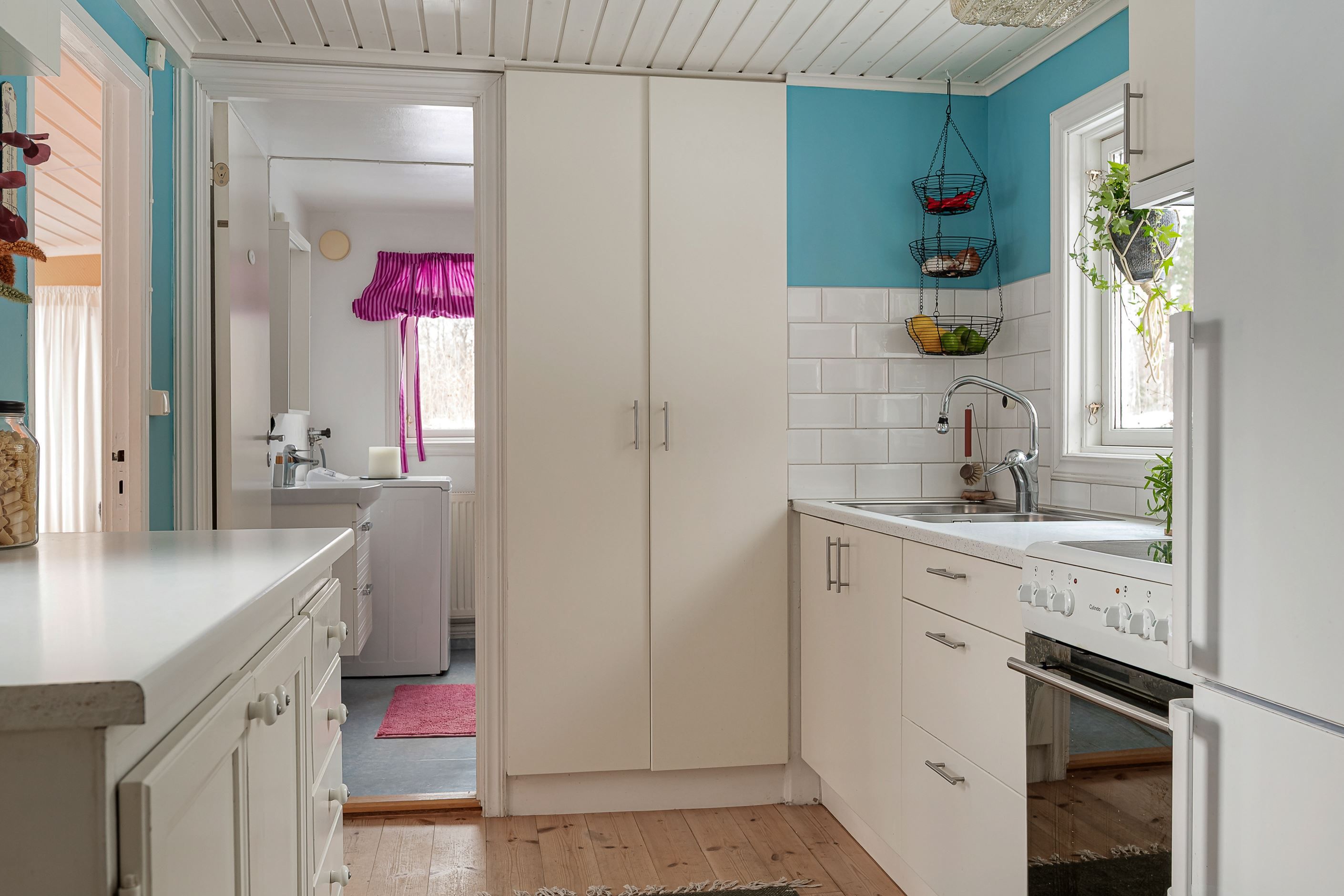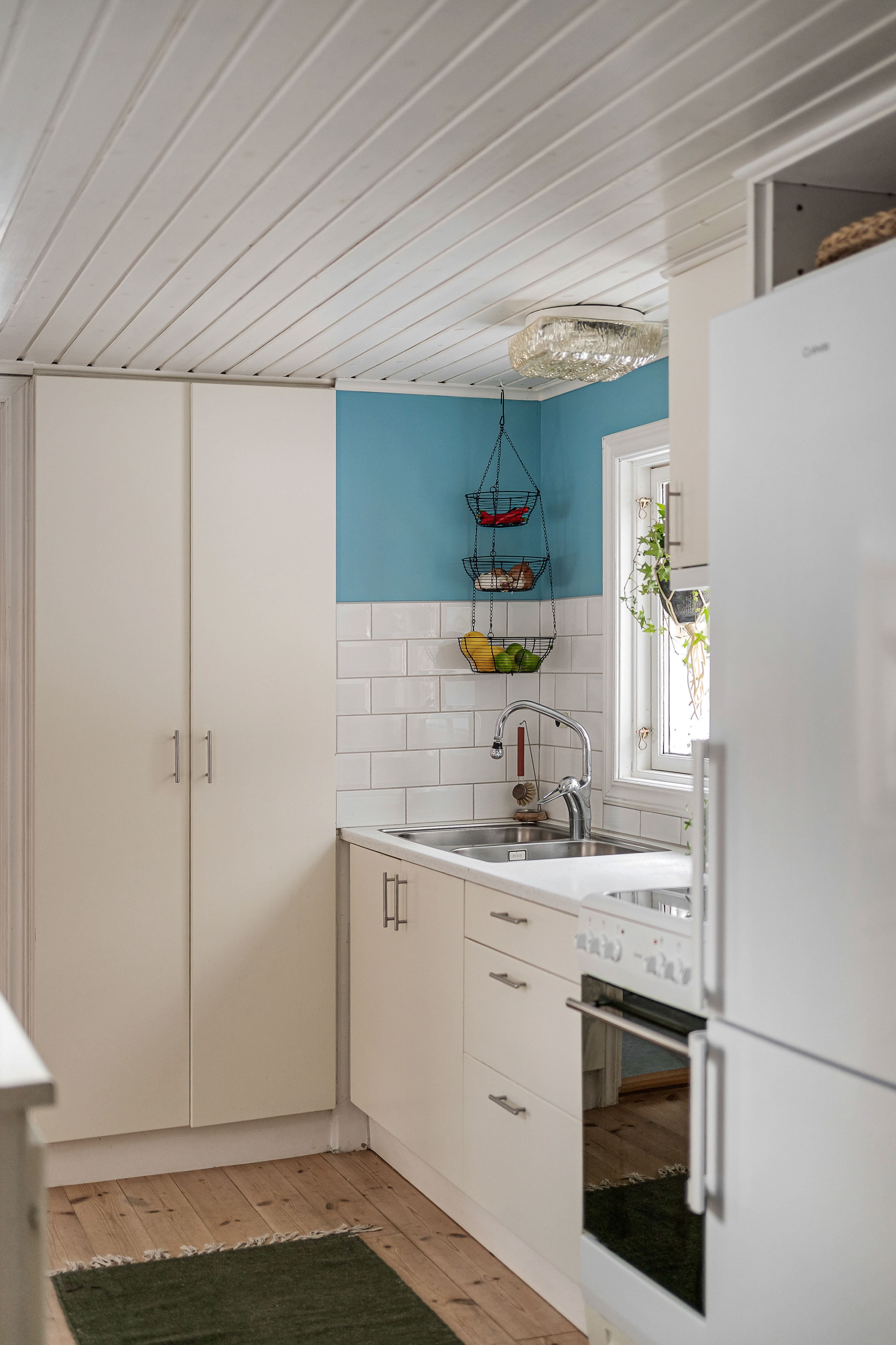 Arbetskök med trägolv, kombinerad kyl/frys och spis 45 cm.