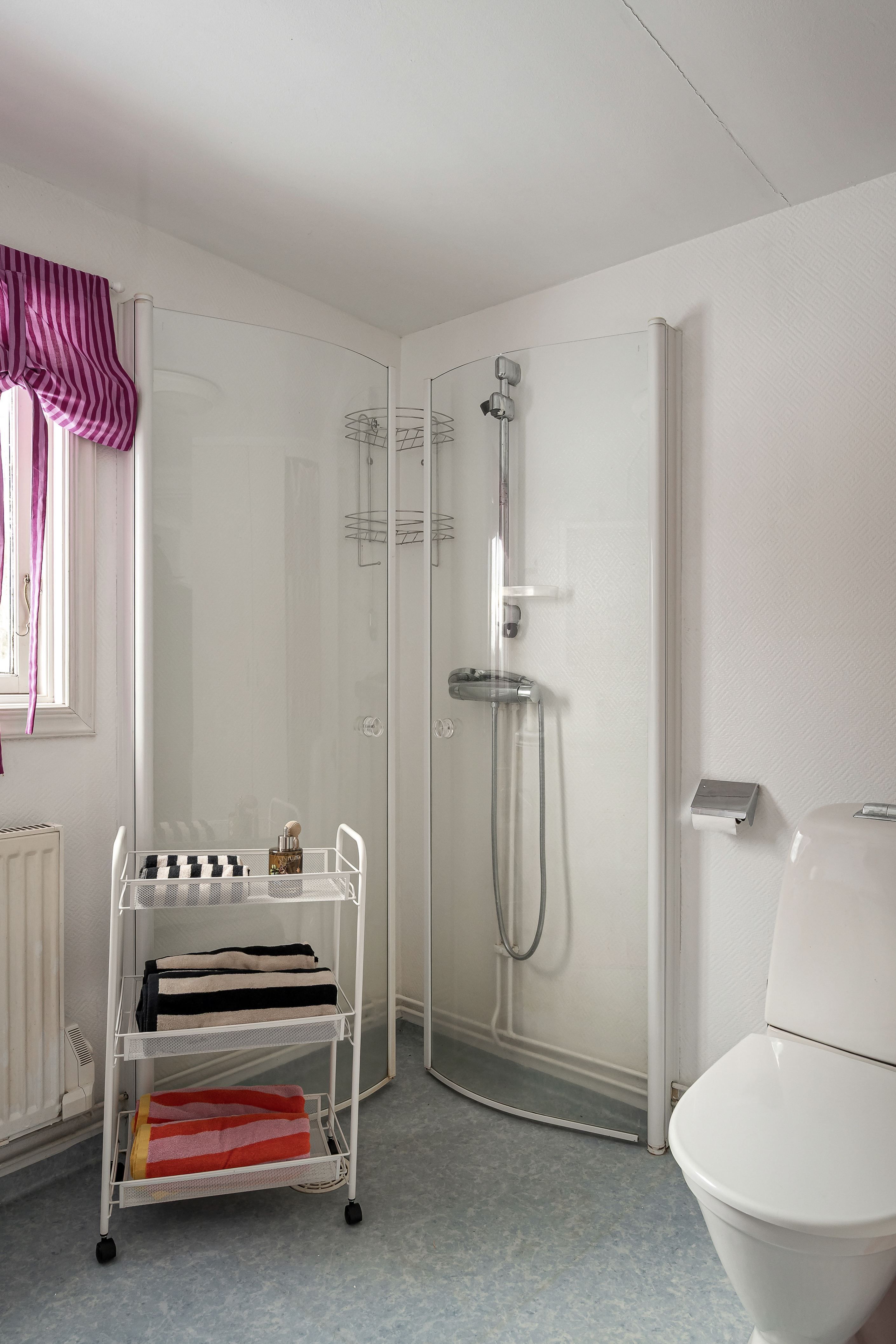 Duschrum med plastmatta och målad väv. Här finns en duschhörna med glasväggar, handfat med kommod, wc och tvättmaskin (45 cm).
