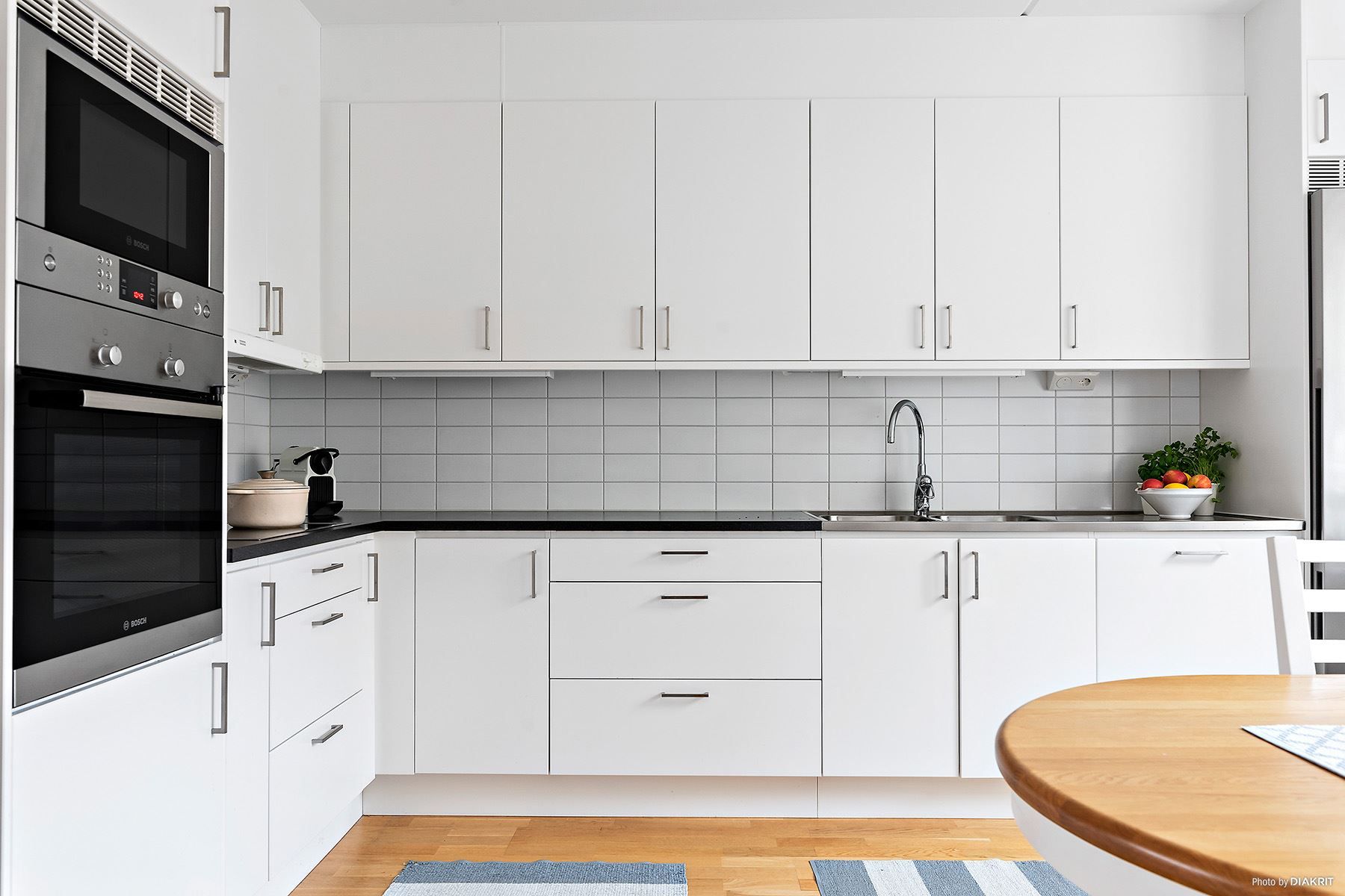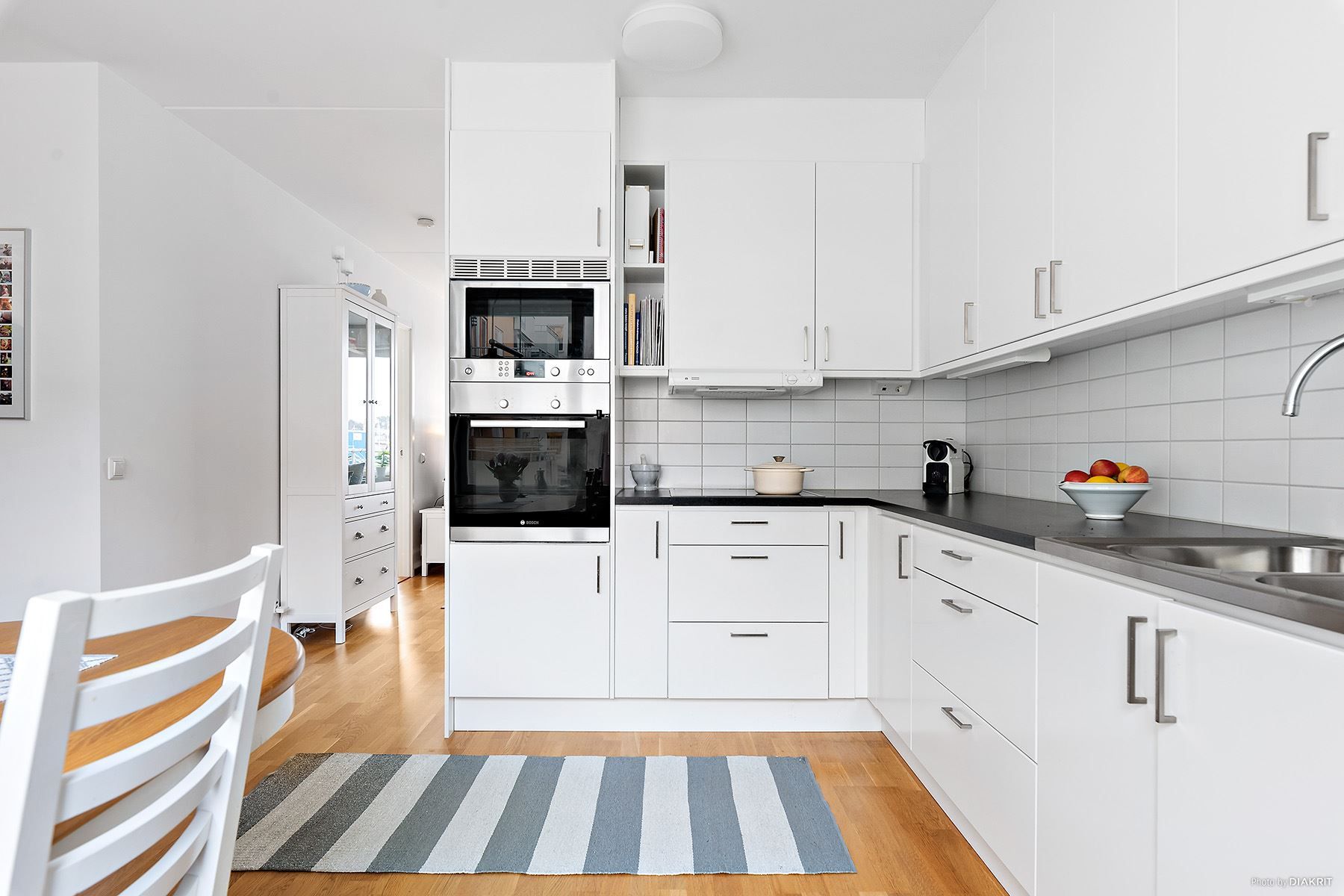 Ljusa väggar och ekparkett genomgående i hela lägenheten erbjuder denna bostad.